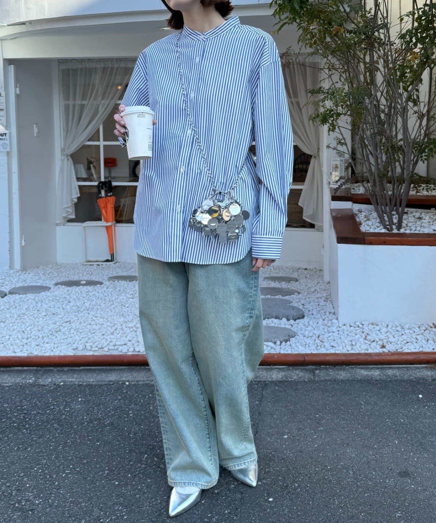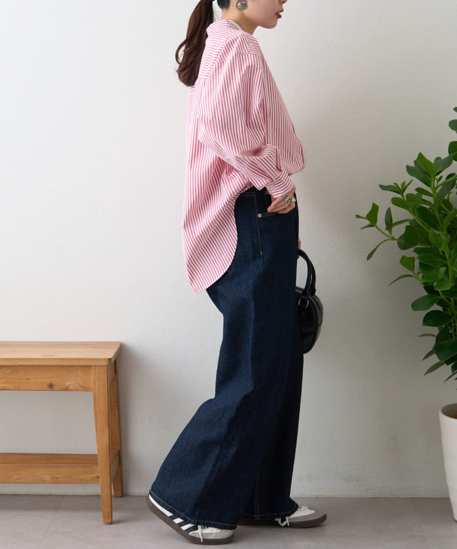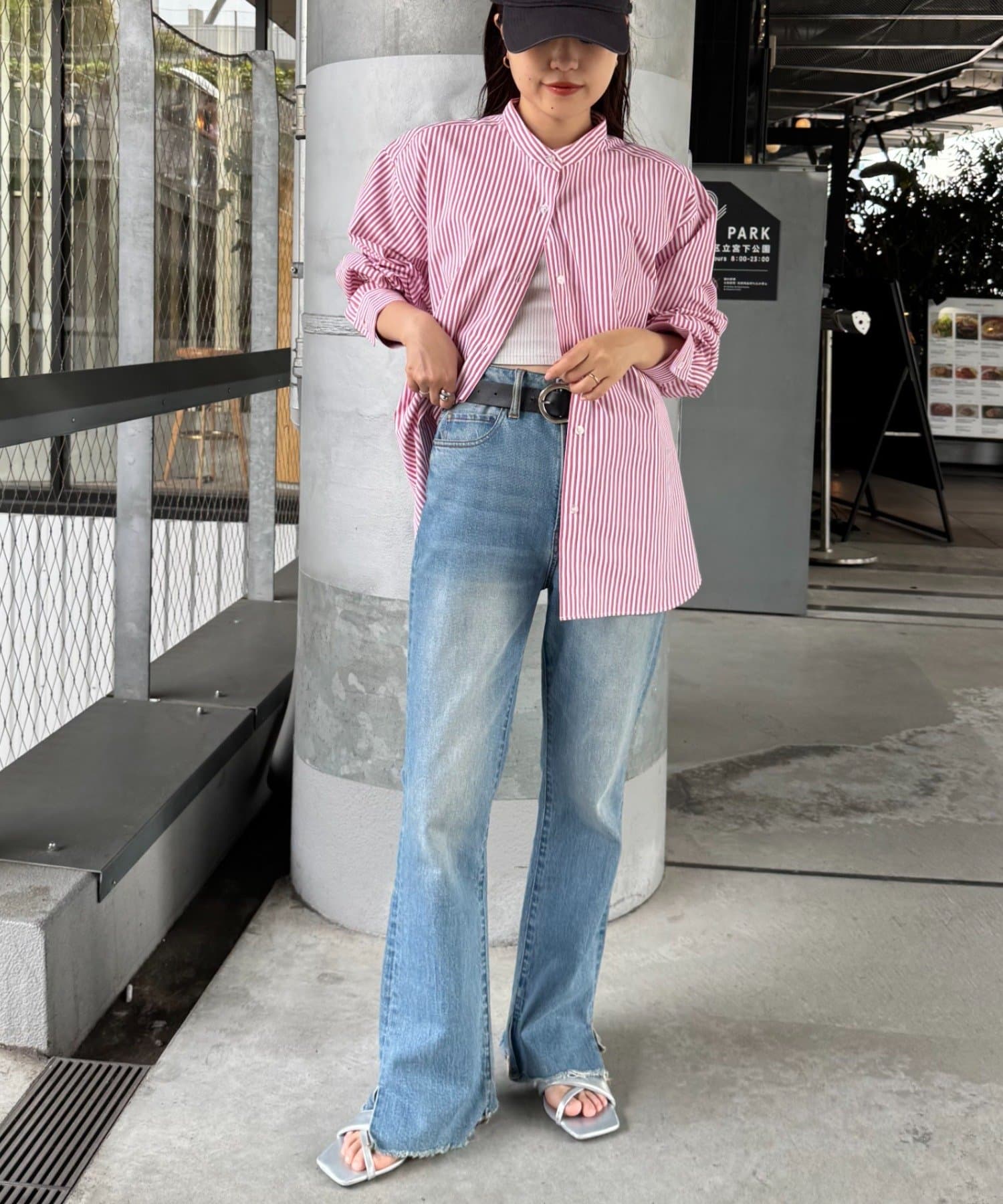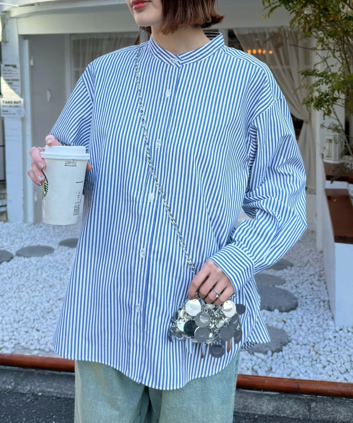 購入場所:パルクローゼット赤のストライプシャツが欲しくて、しかもスタンドカラーに惹かれてオンラインで購入。