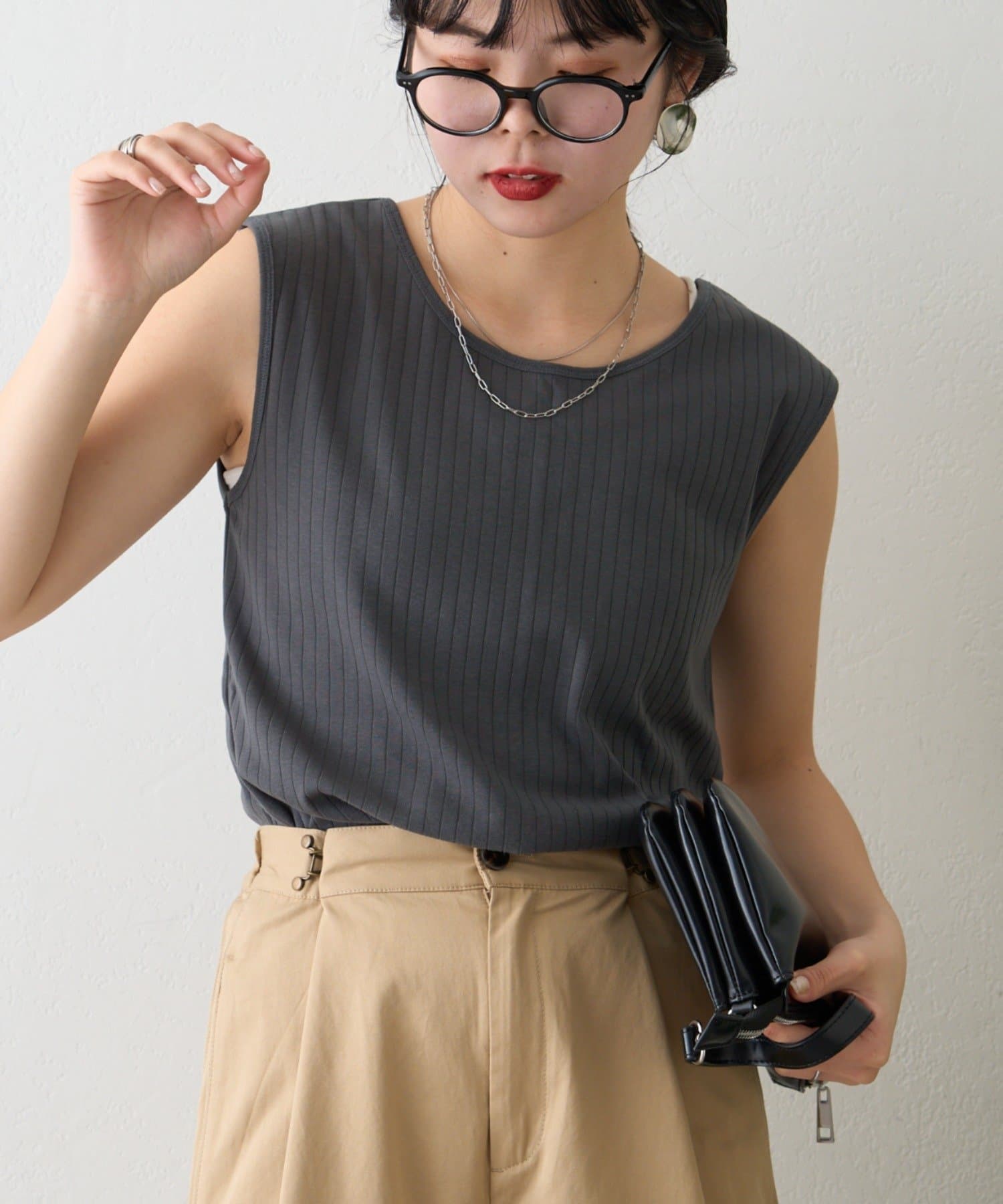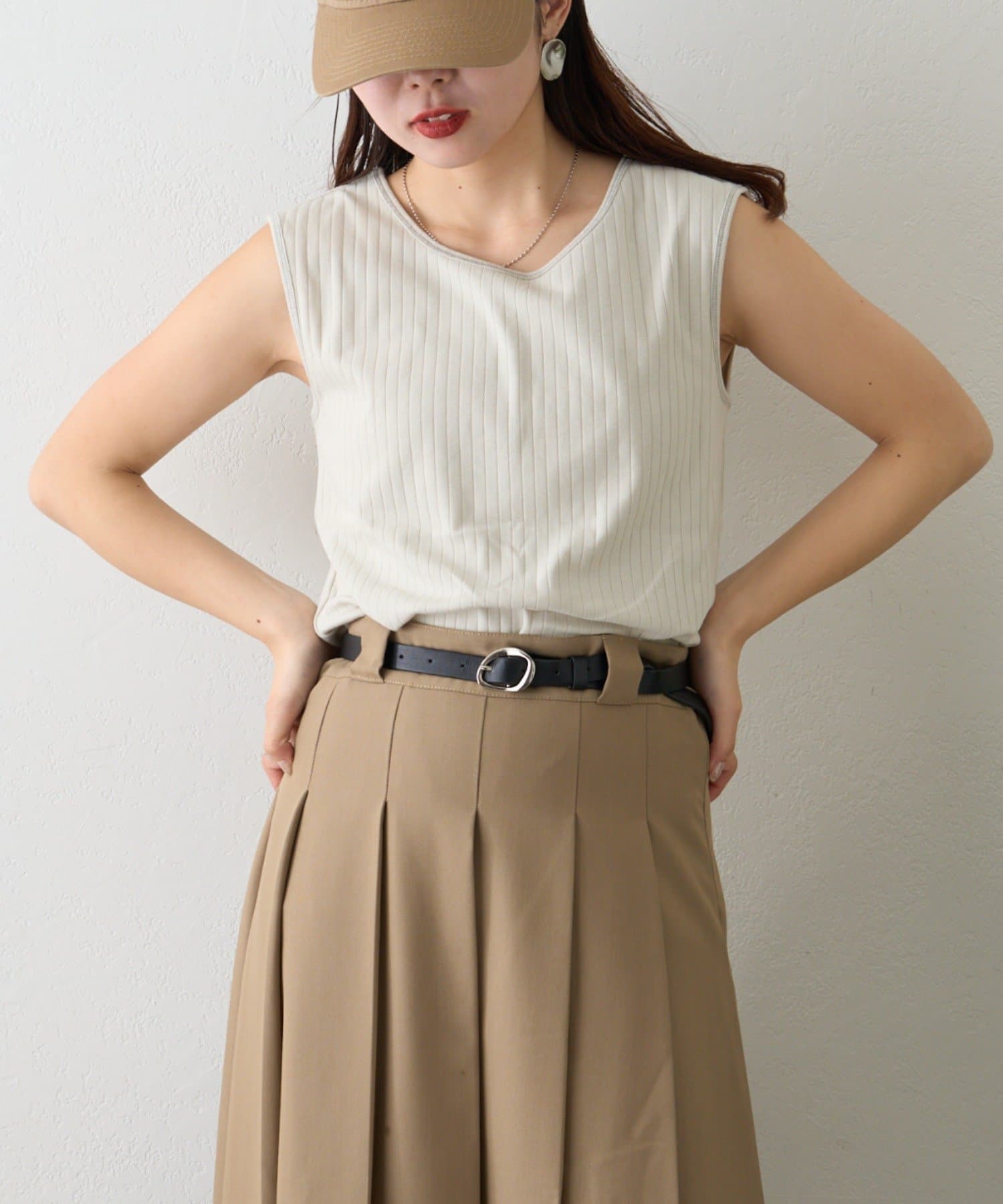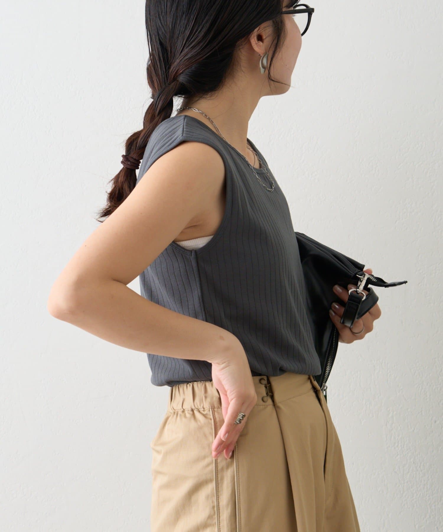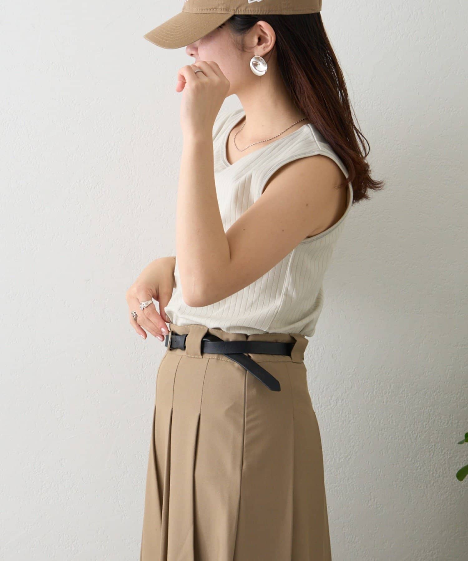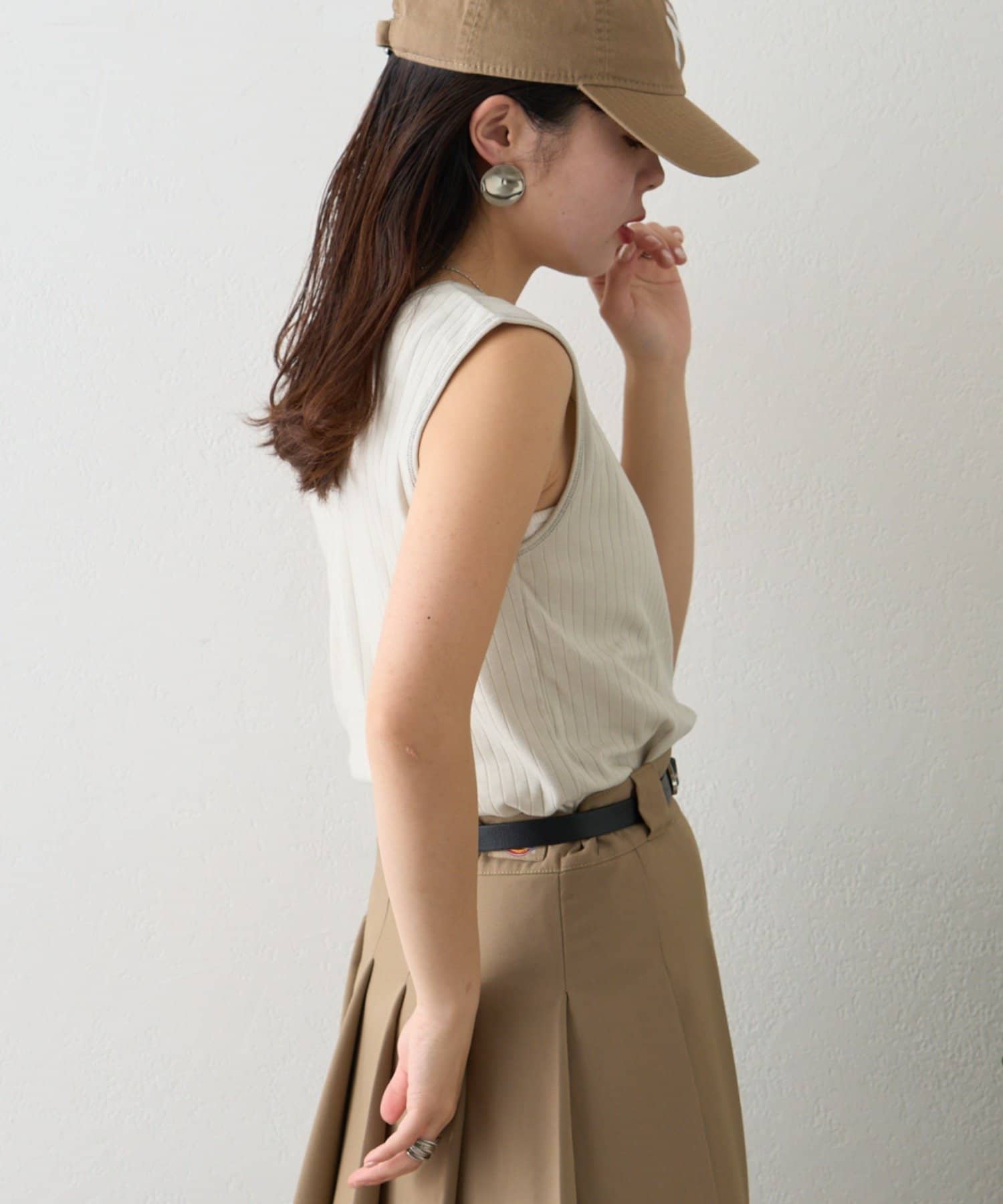 リブ素材で体に程よくフィットし、縦のラインを強調してくれるのですっきり見えシルエットに。