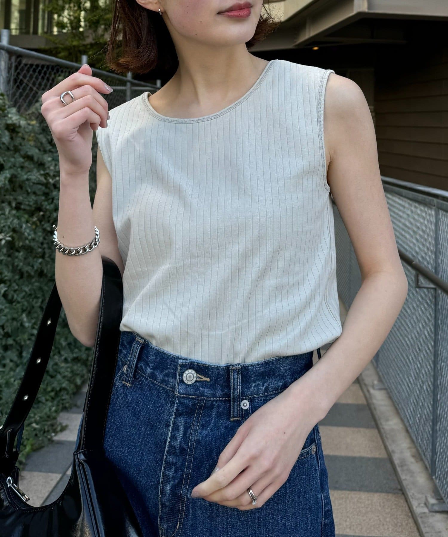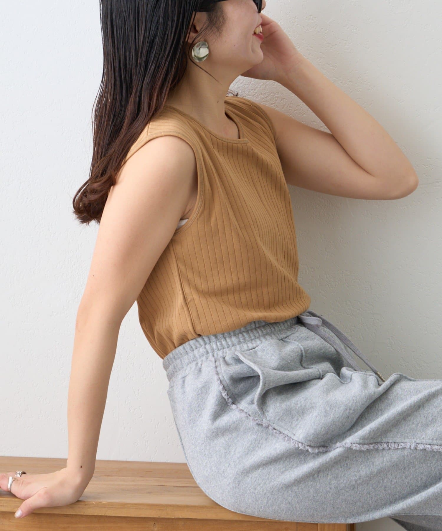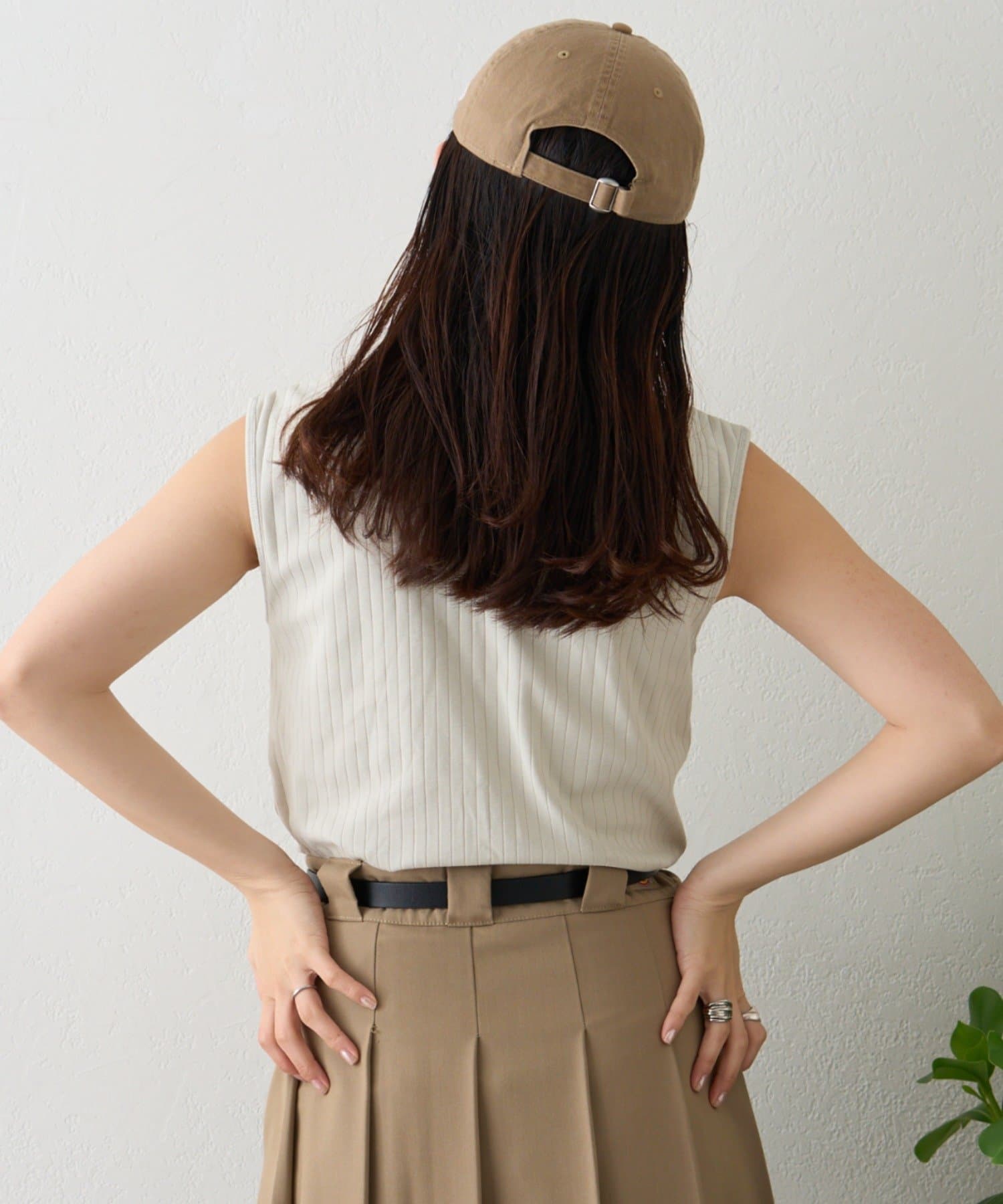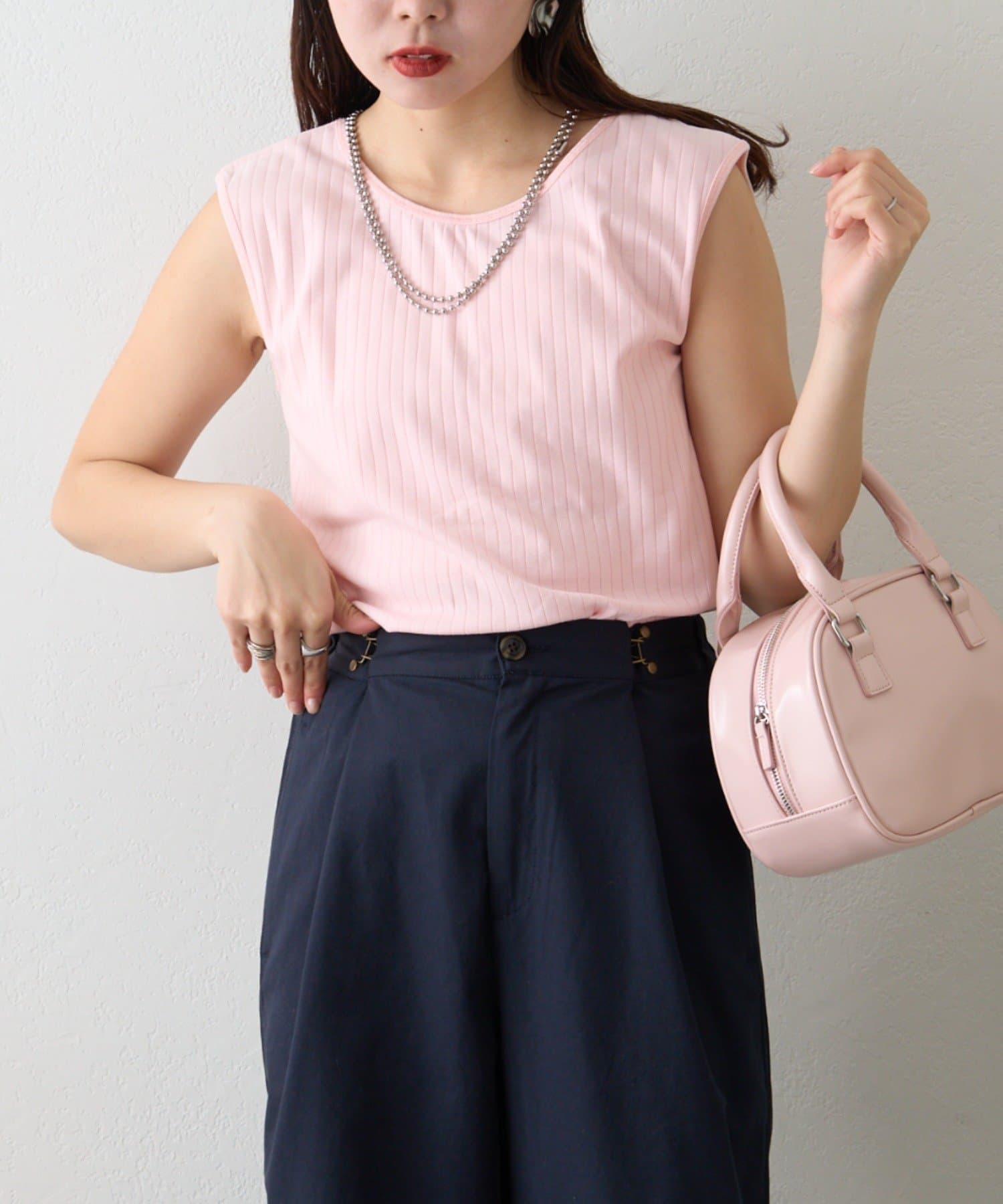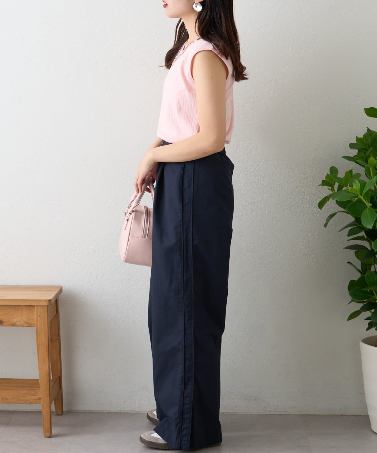 リブ素材で体に程よくフィットし、縦のラインを強調してくれるのですっきり見えシルエットに。