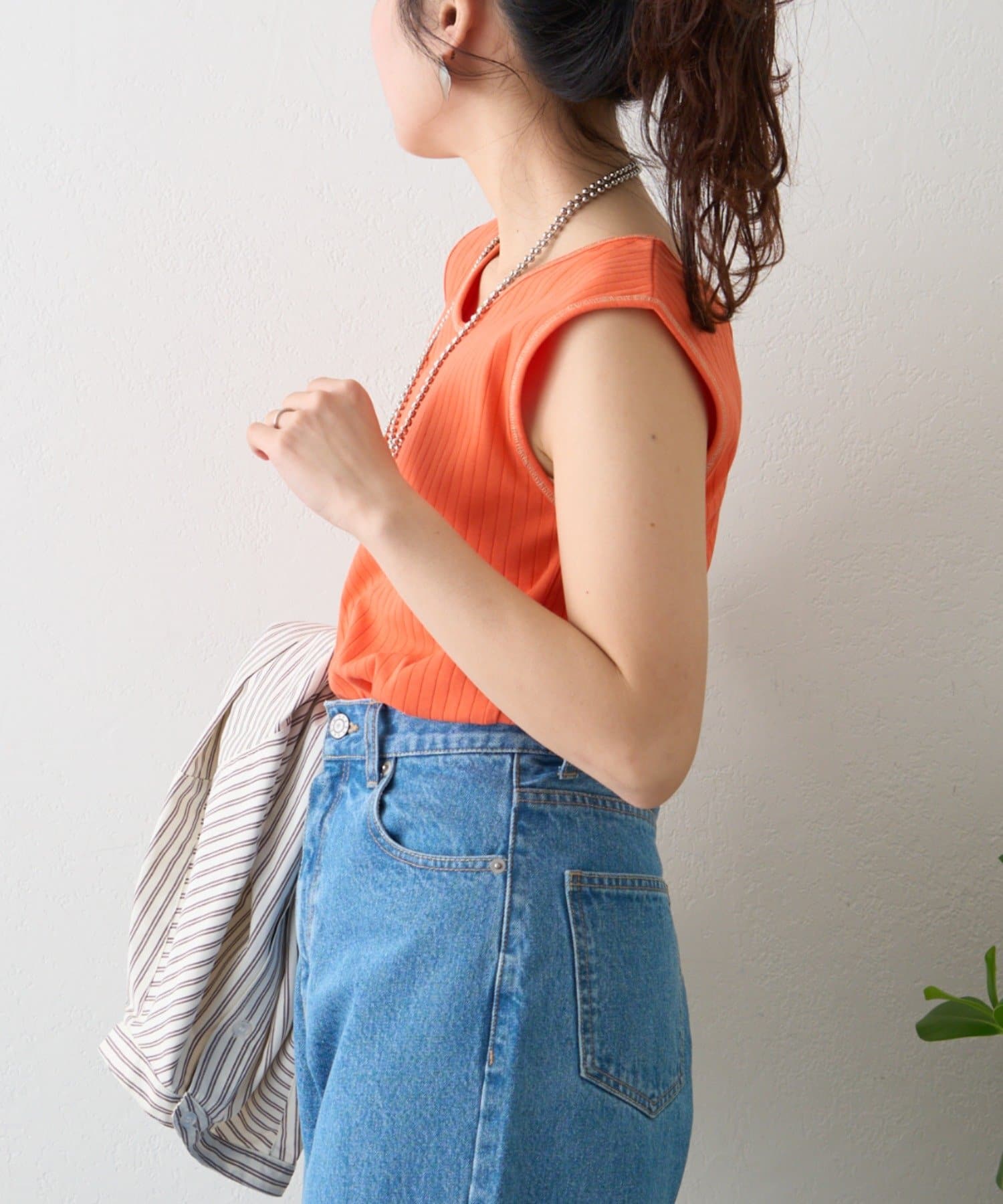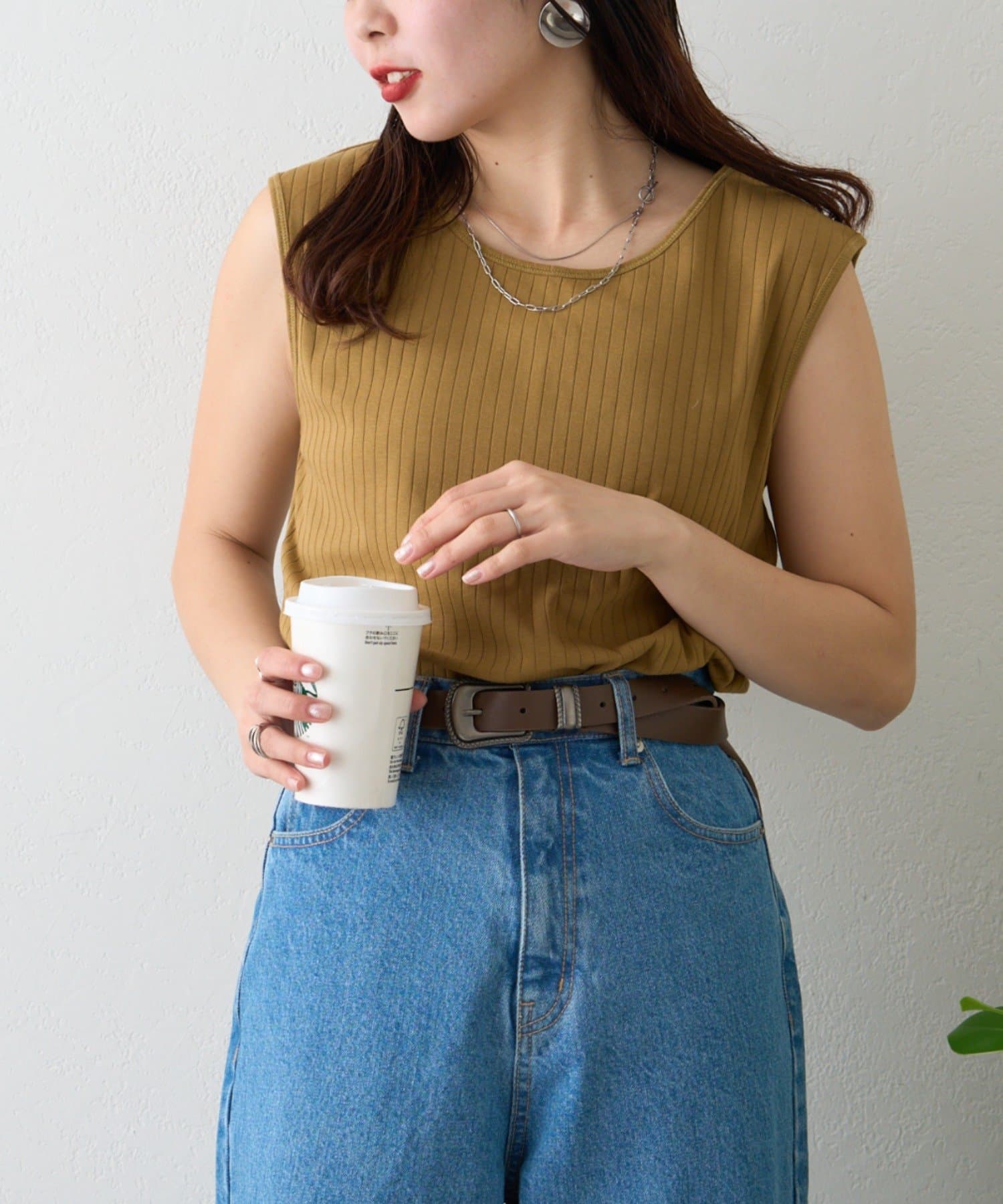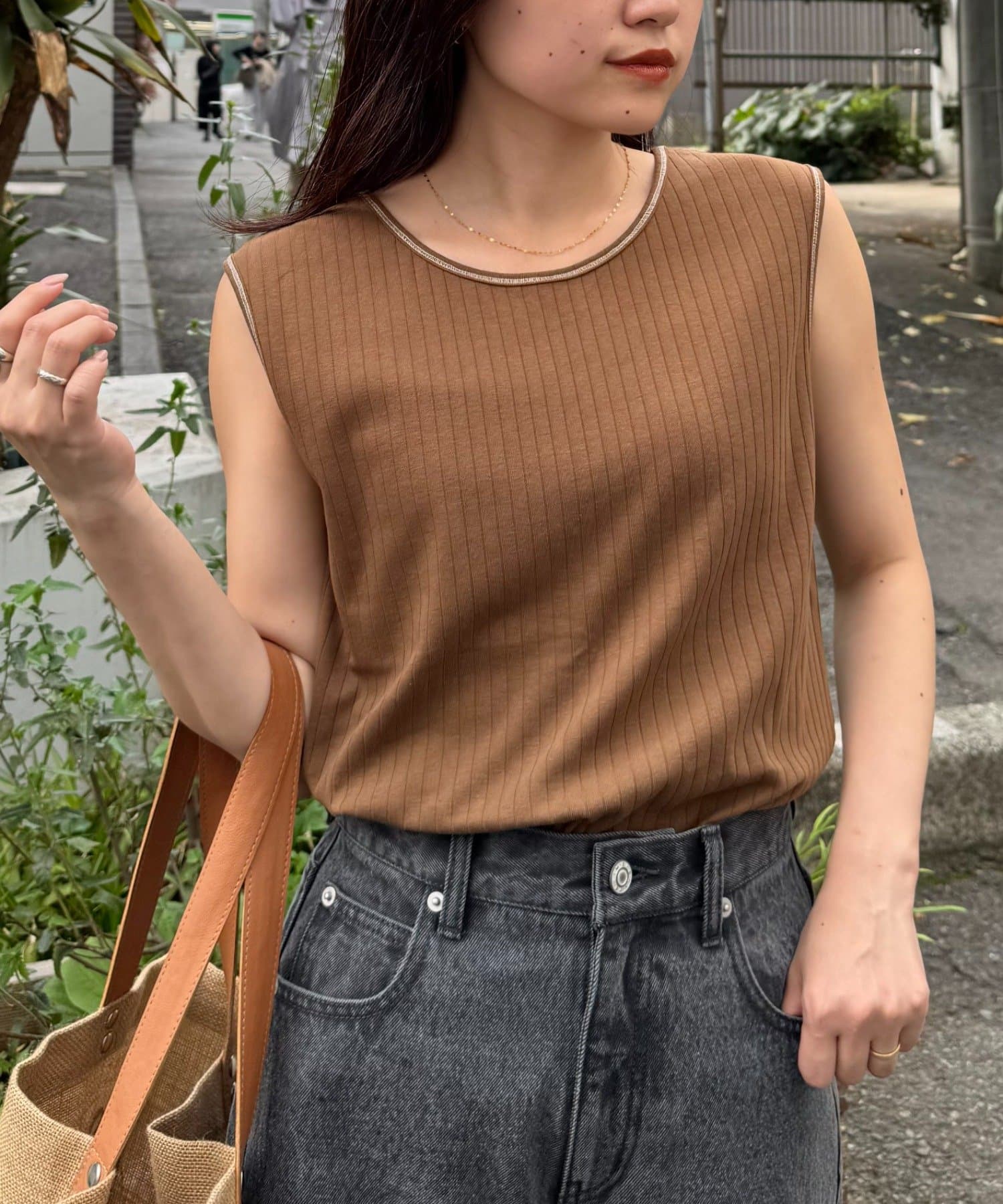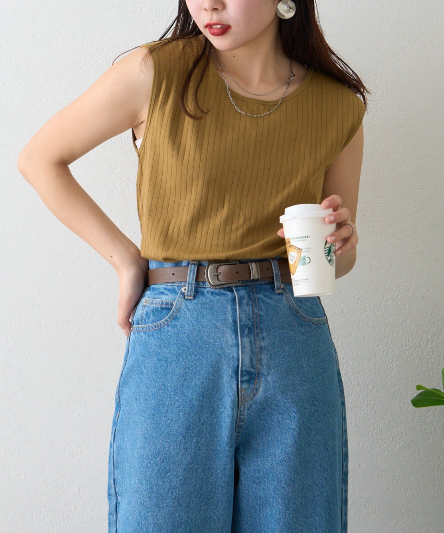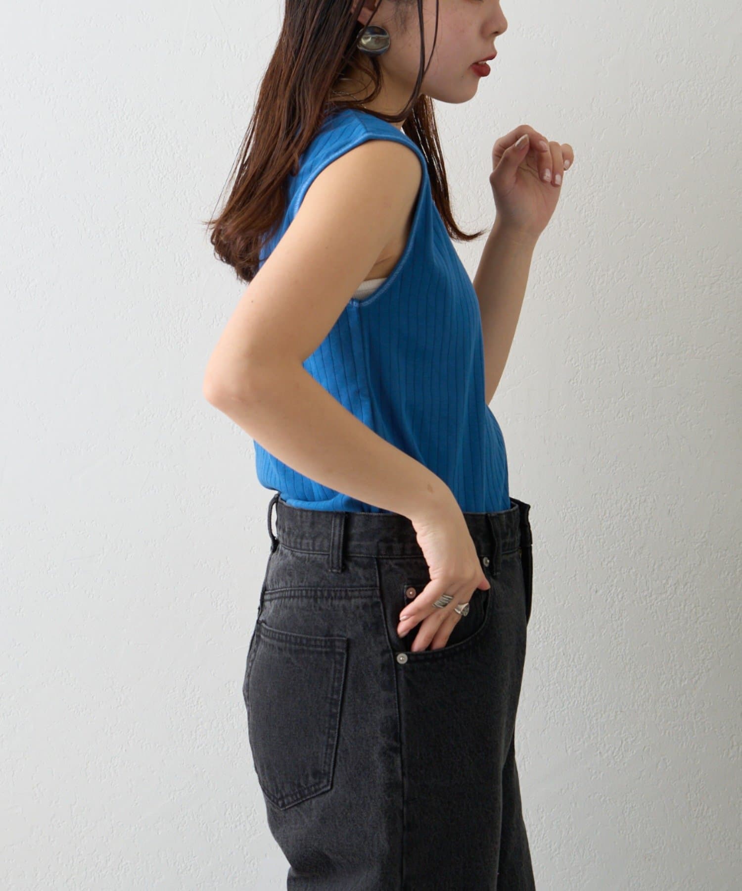 リブ素材で体に程よくフィットし、縦のラインを強調してくれるのですっきり見えシルエットに。