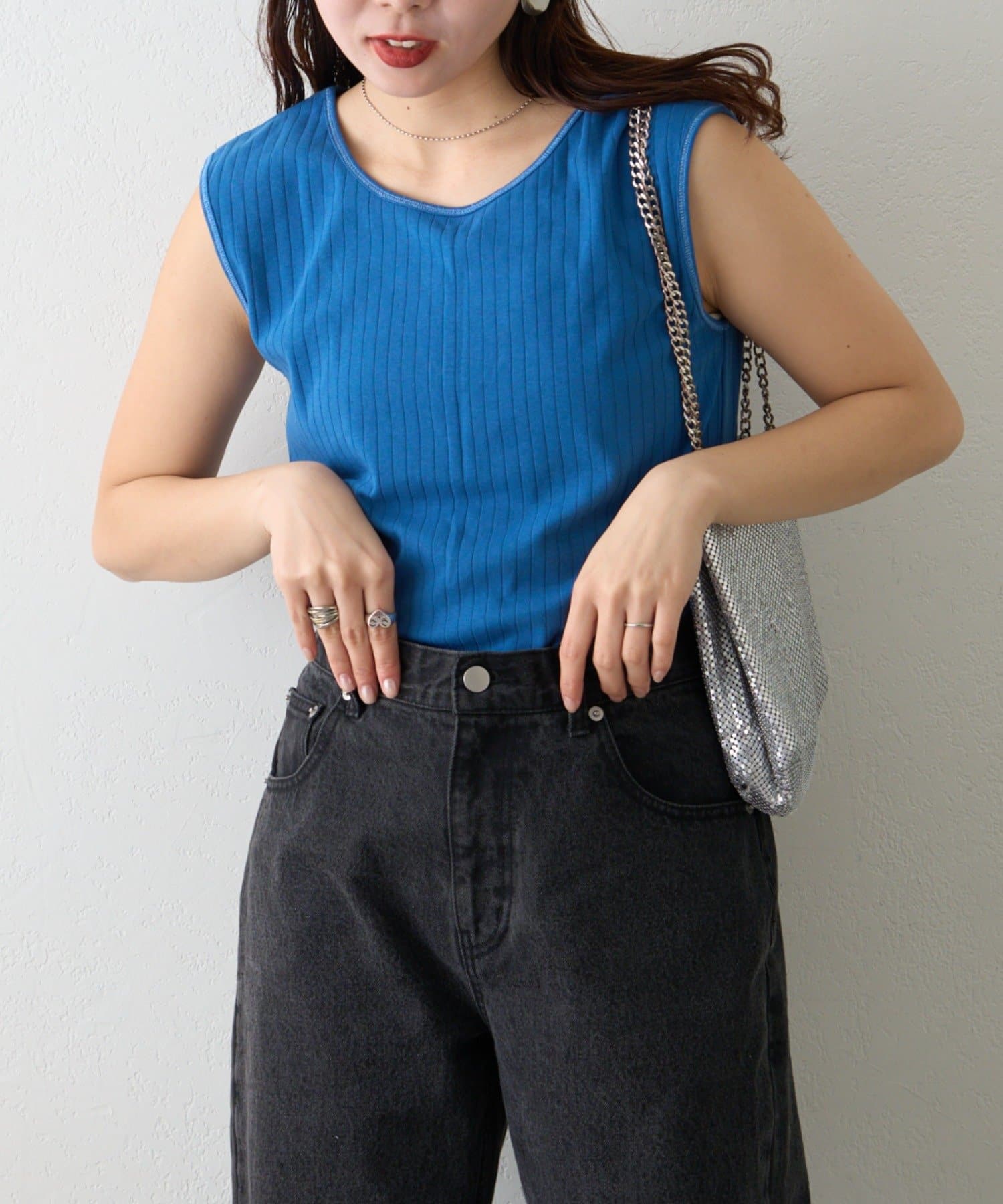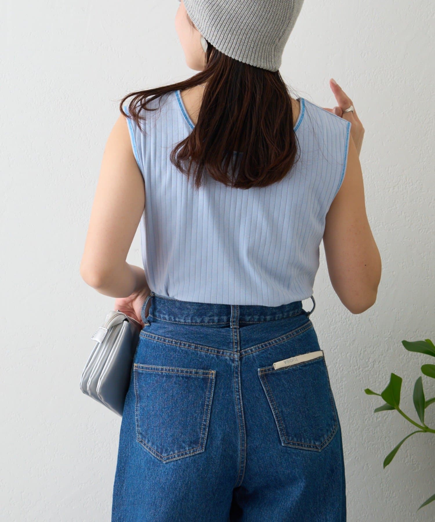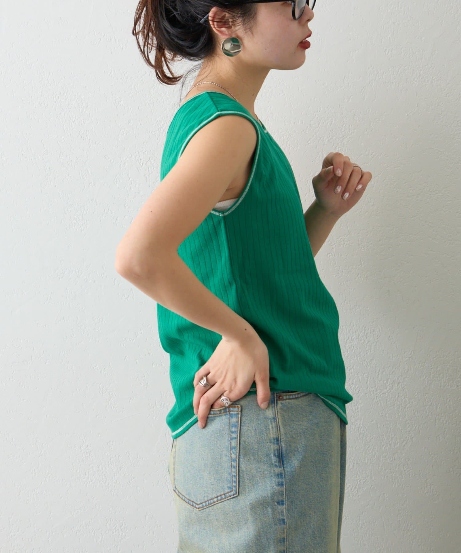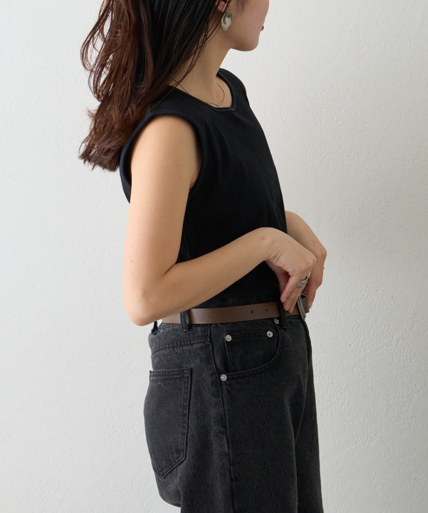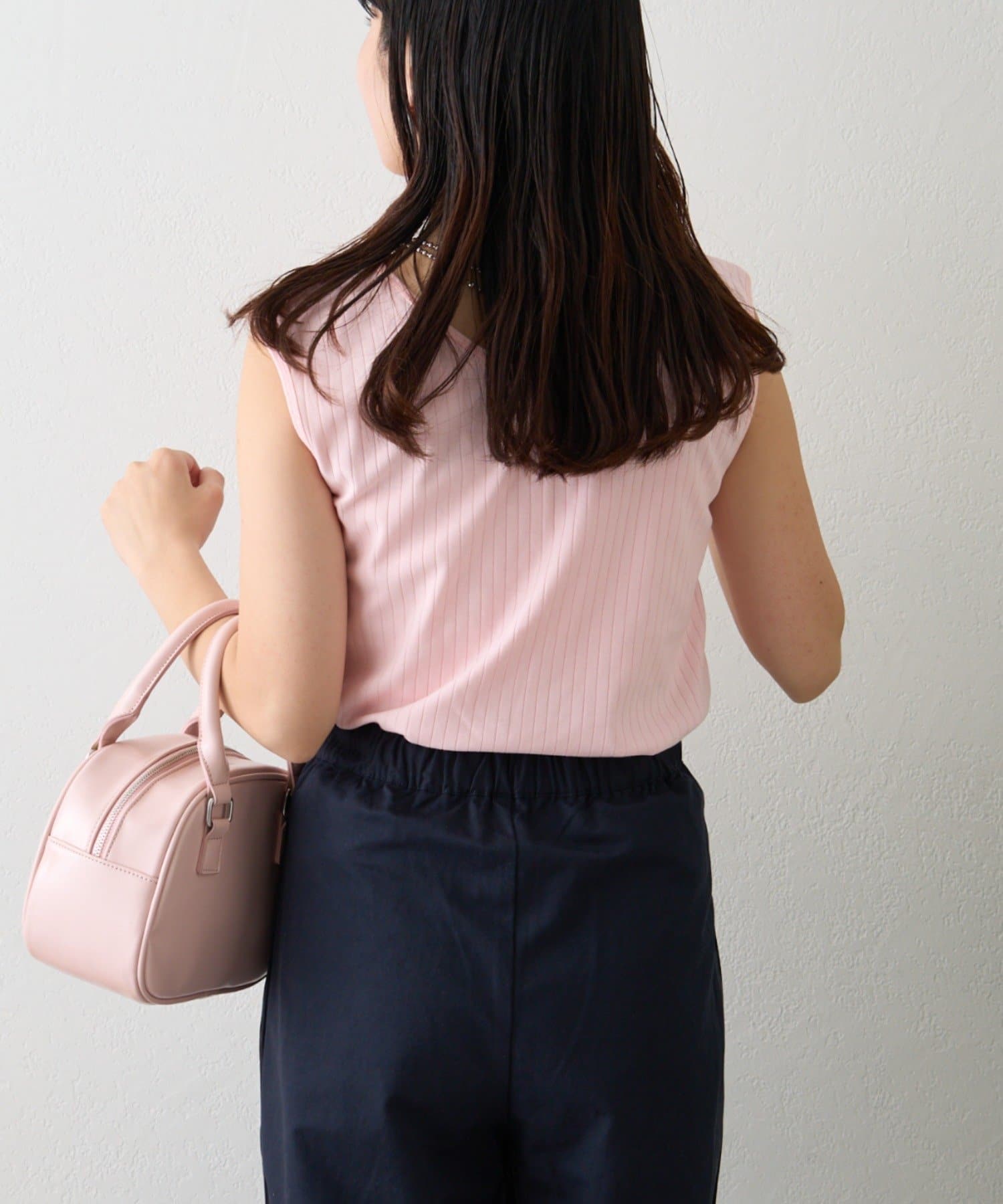 リブ素材で体に程よくフィットし、縦のラインを強調してくれるのですっきり見えシルエットに。