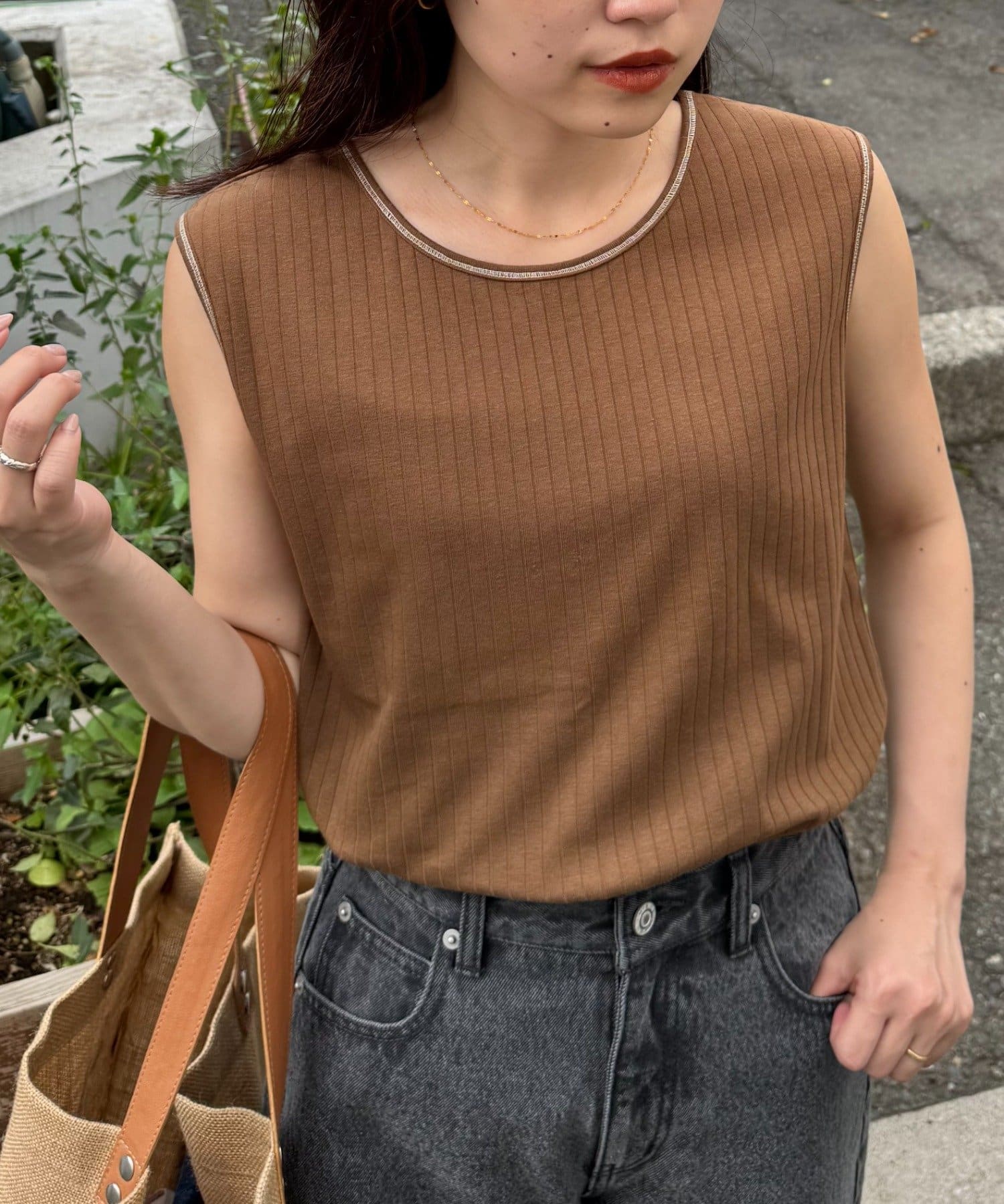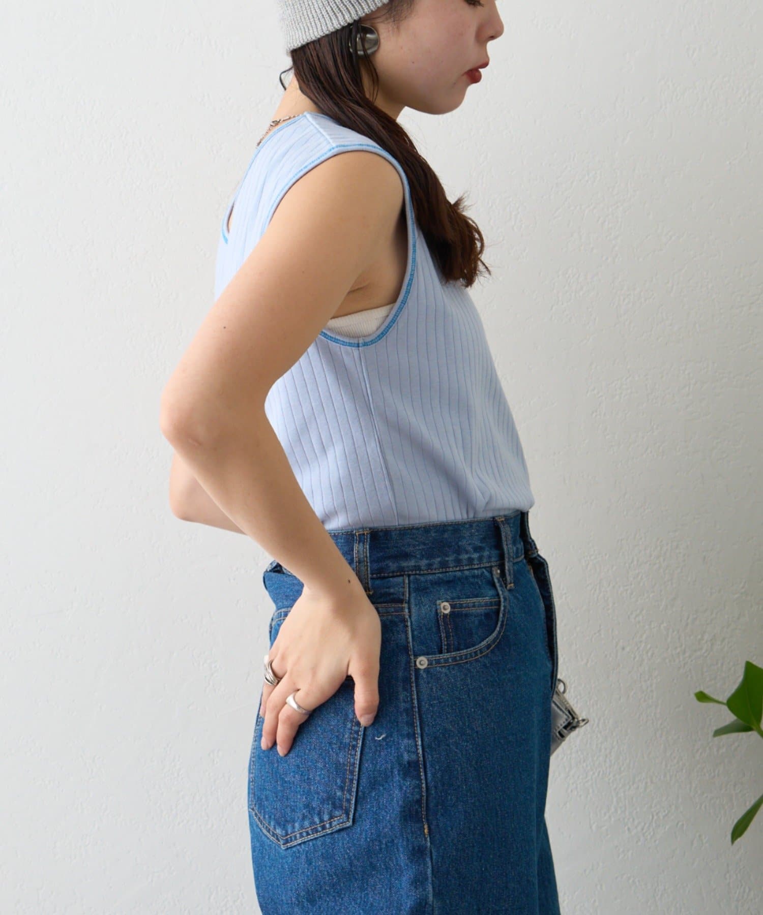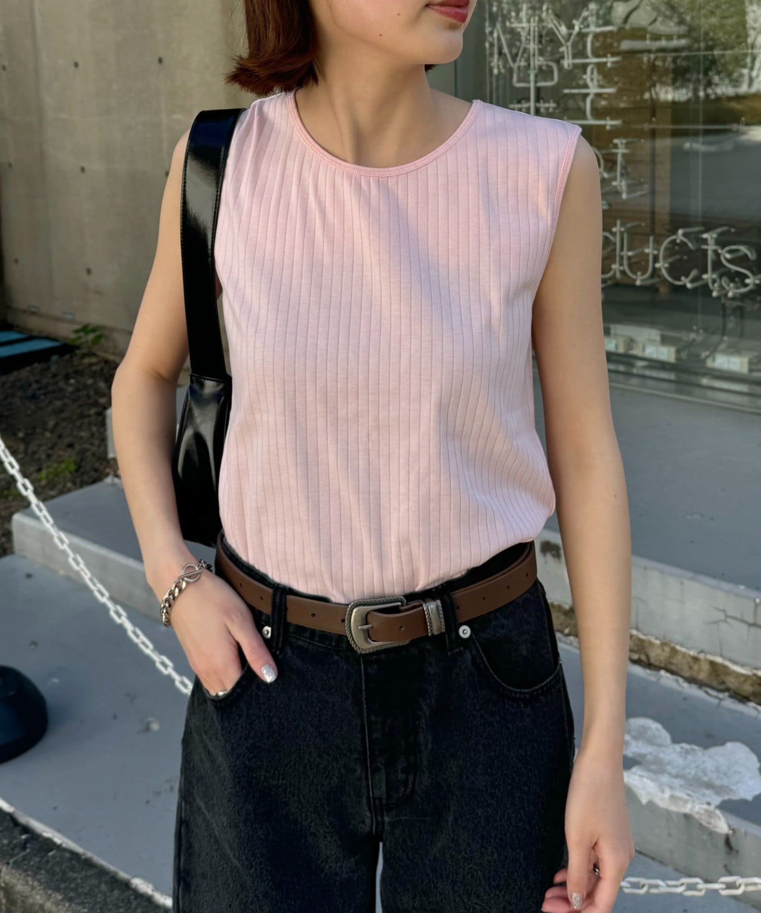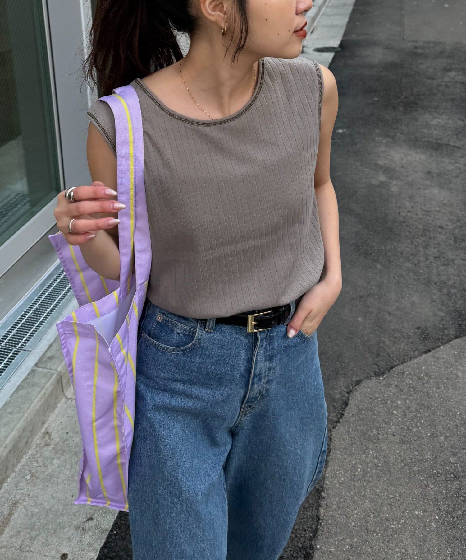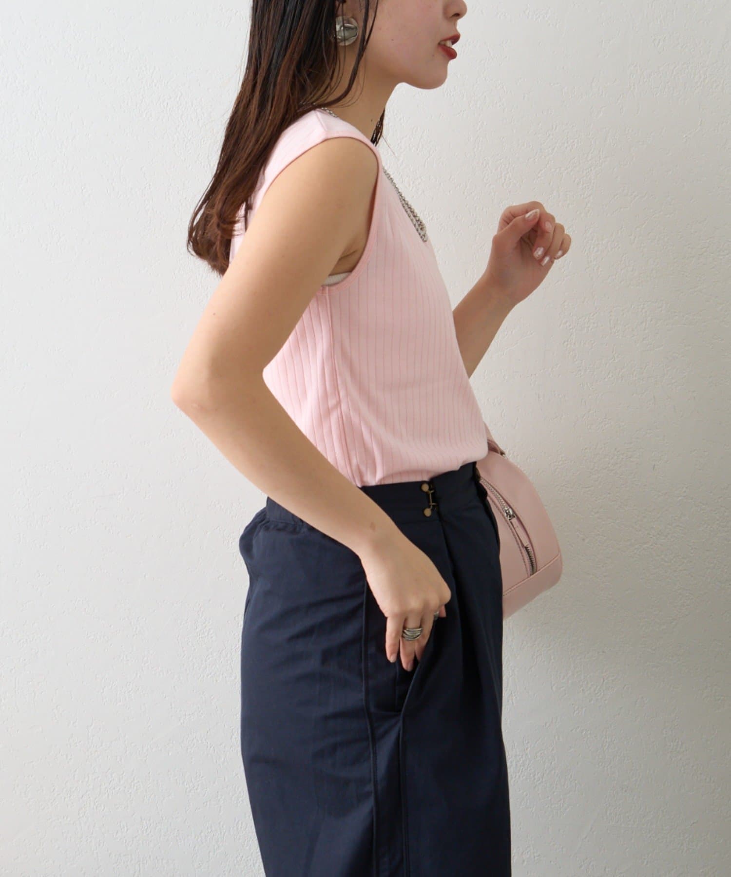 リブ素材で体に程よくフィットし、縦のラインを強調してくれるのですっきり見えシルエットに。