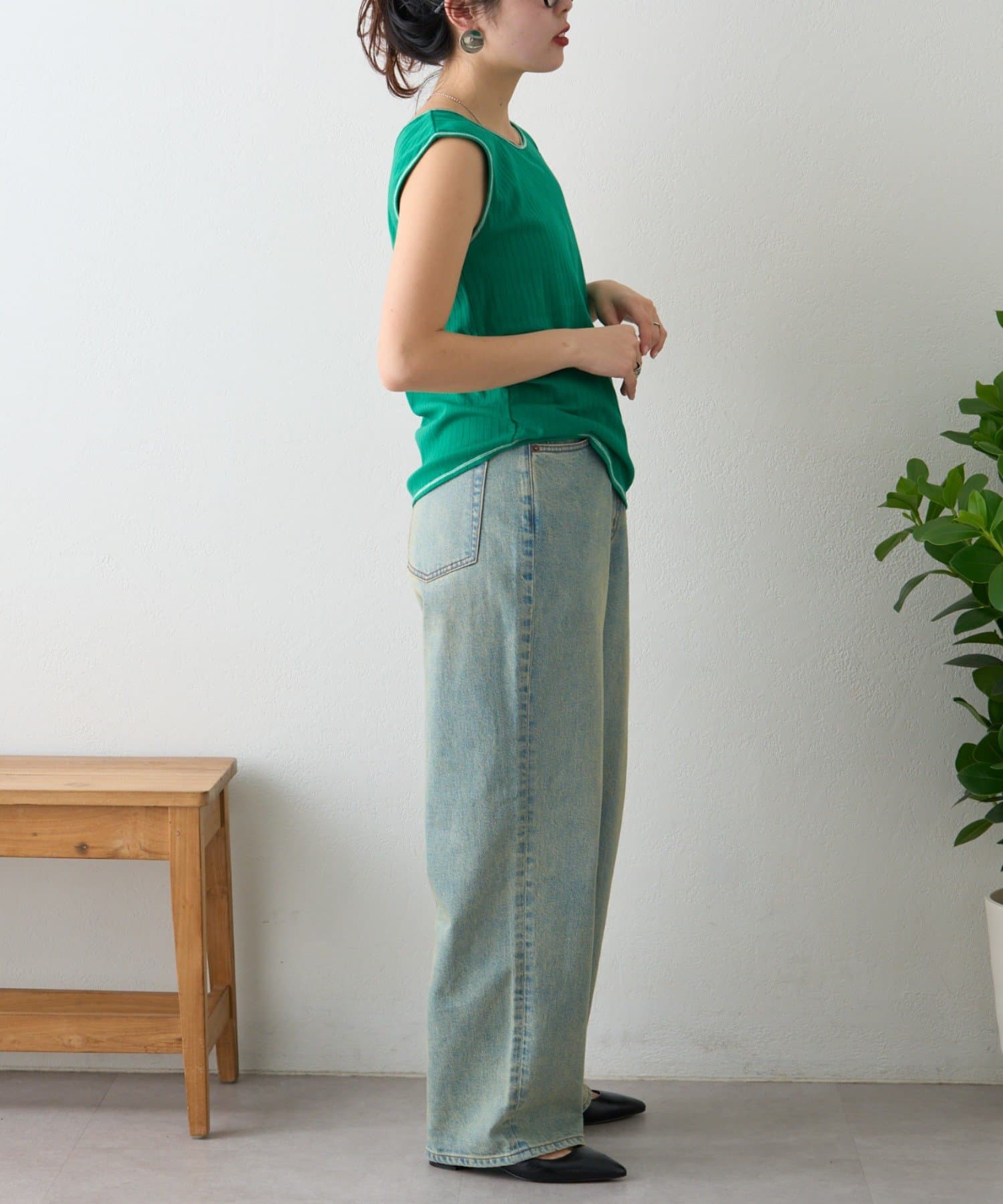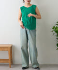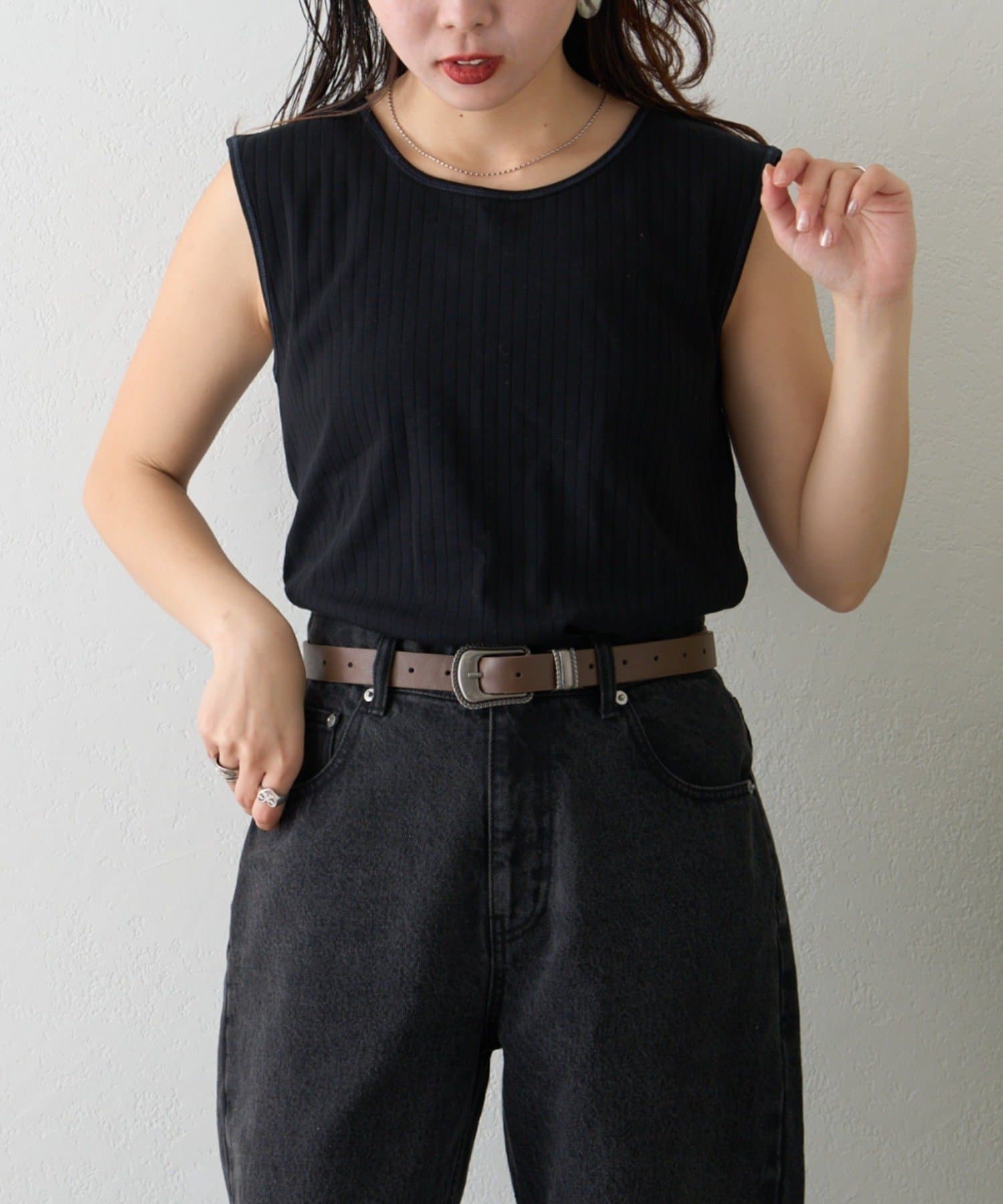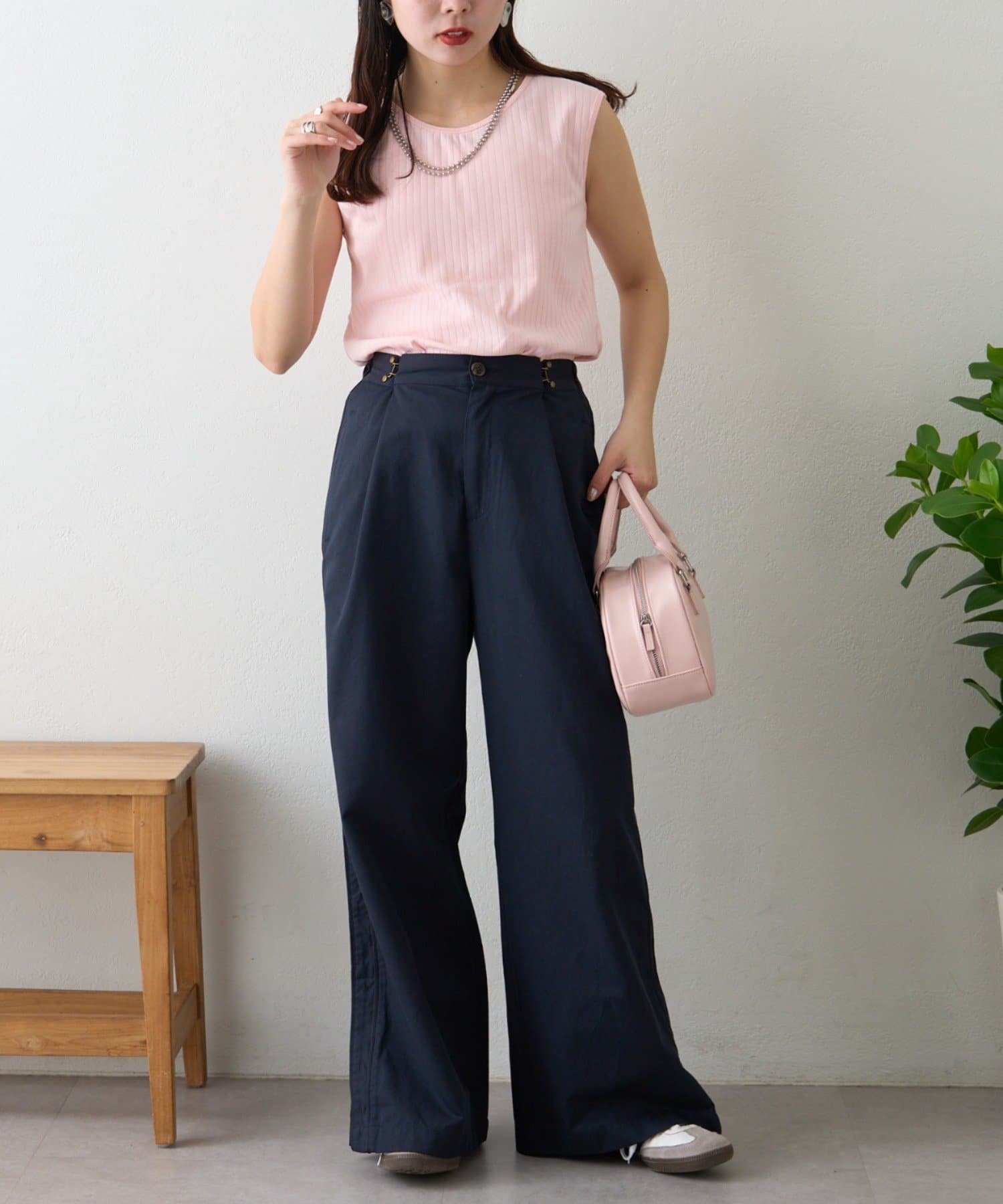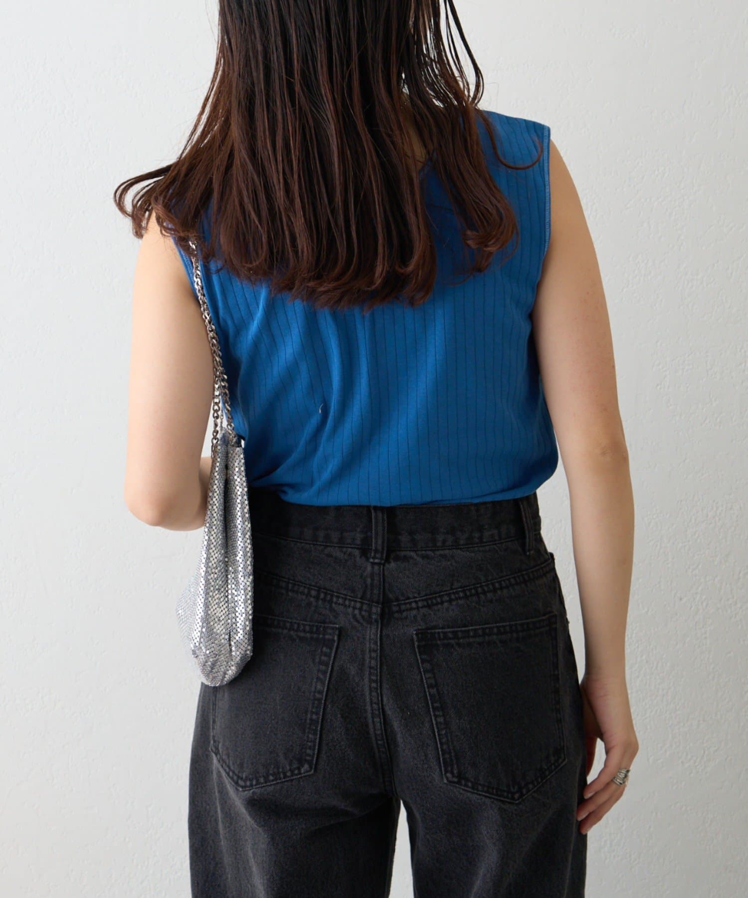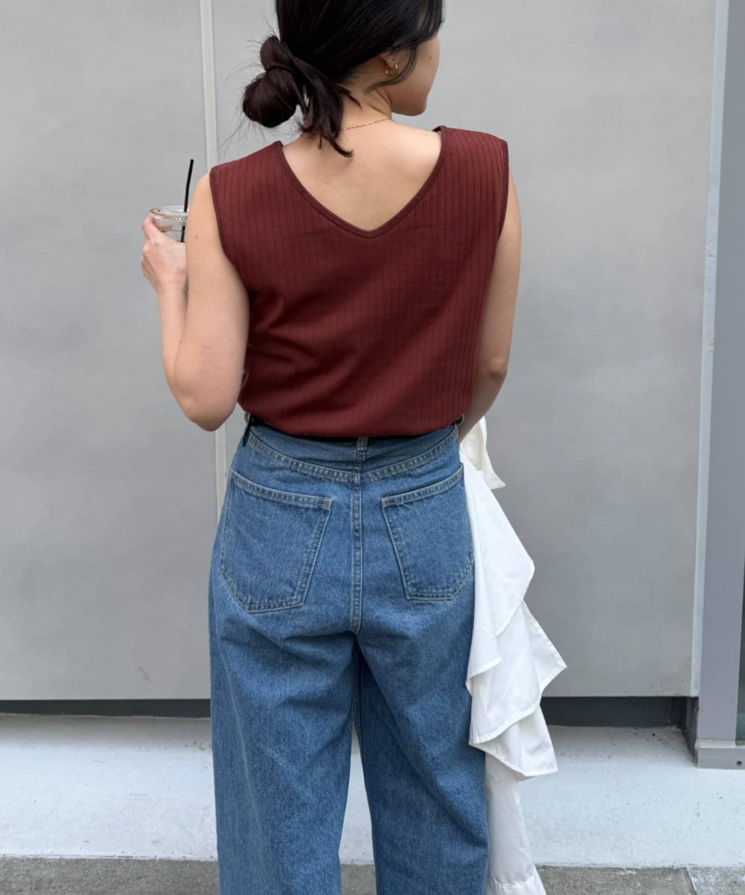 リブ素材で体に程よくフィットし、縦のラインを強調してくれるのですっきり見えシルエットに。