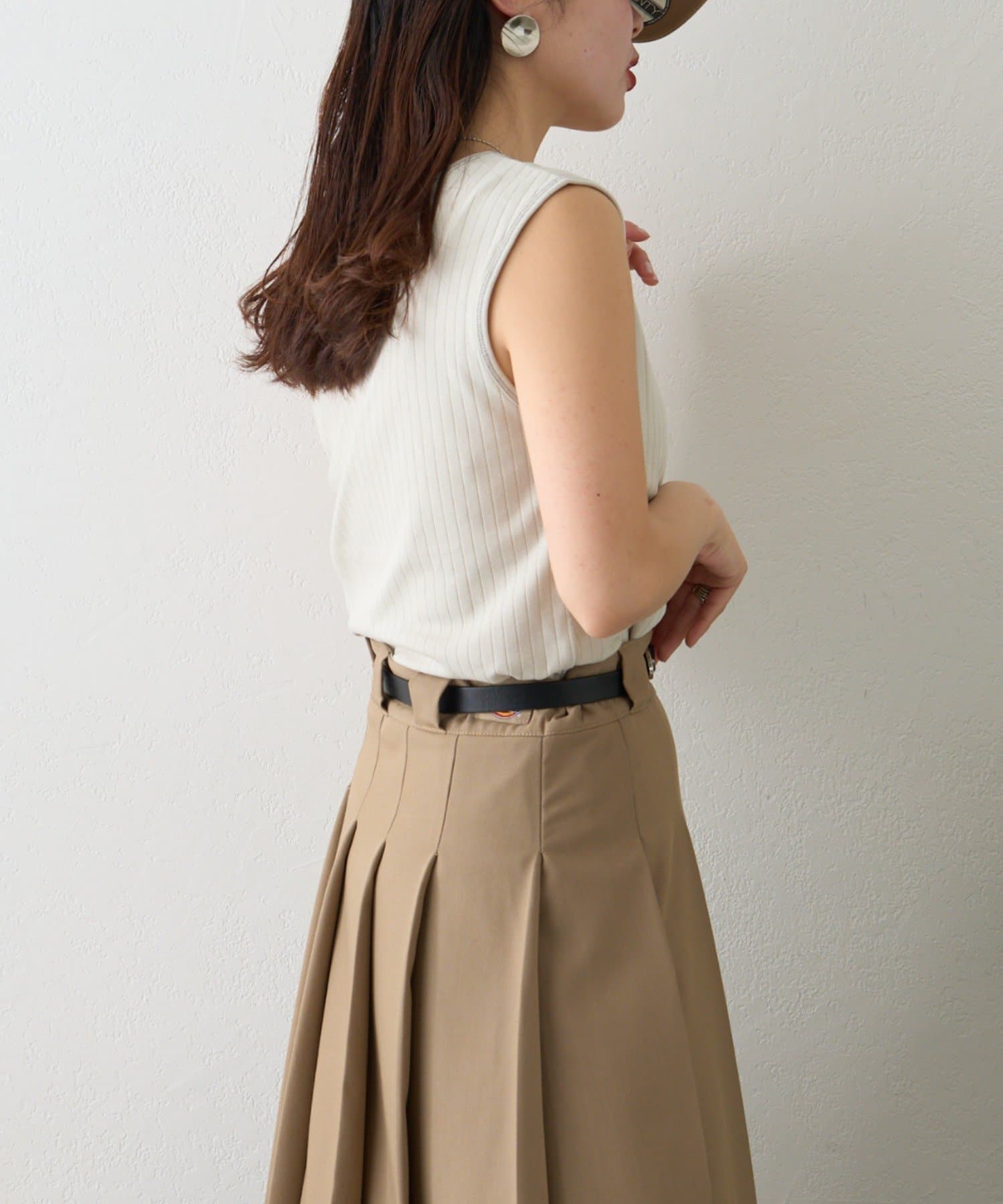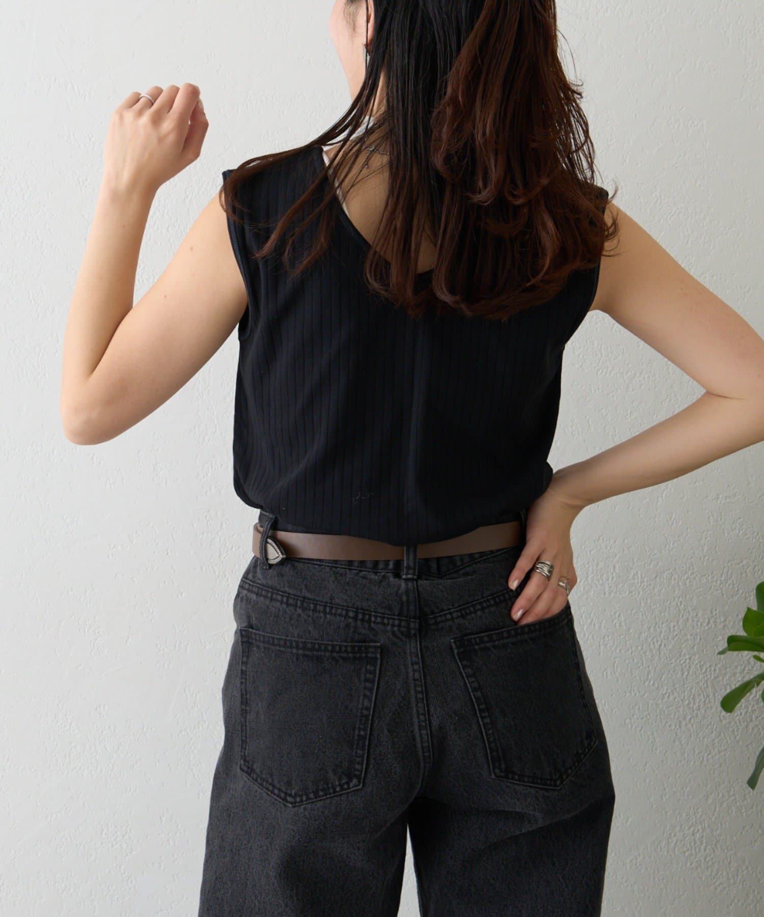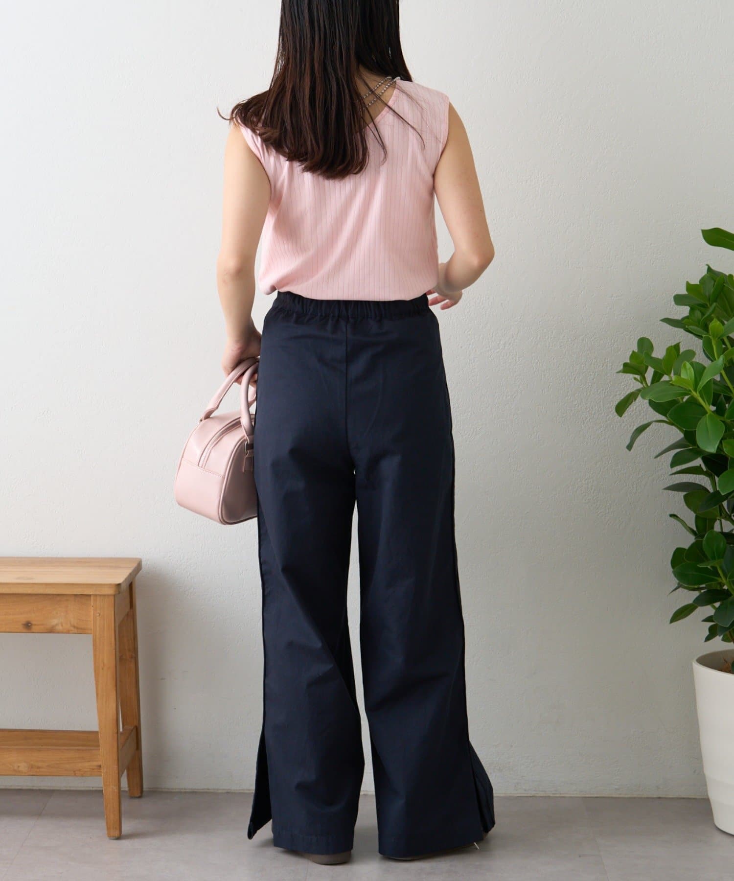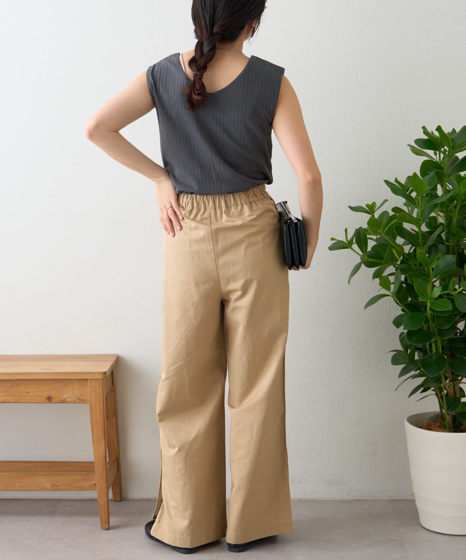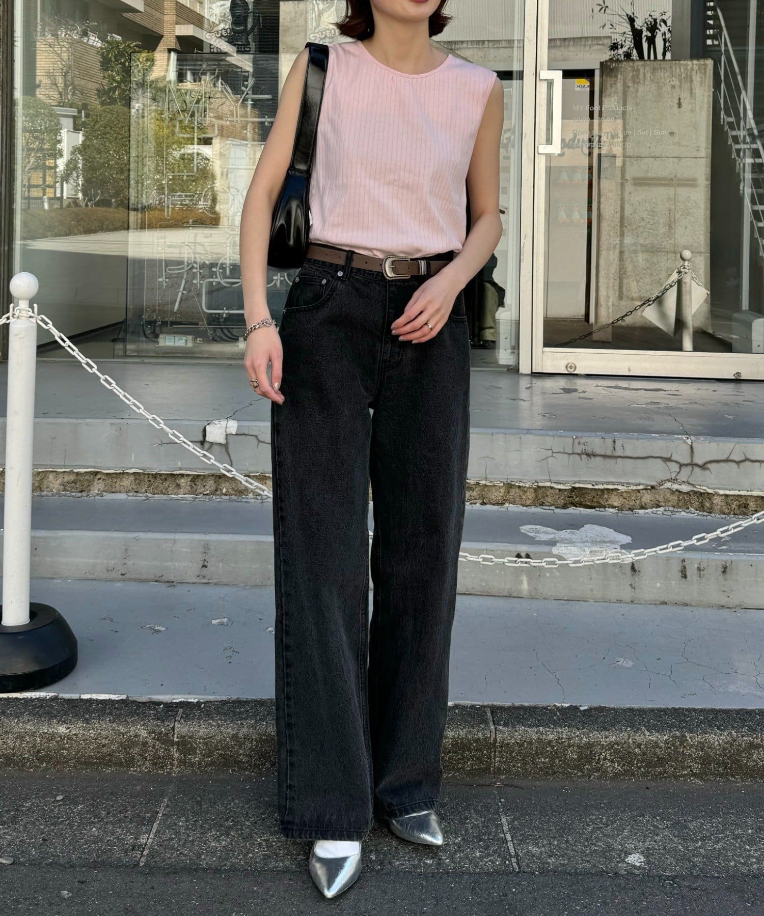 リブ素材で体に程よくフィットし、縦のラインを強調してくれるのですっきり見えシルエットに。