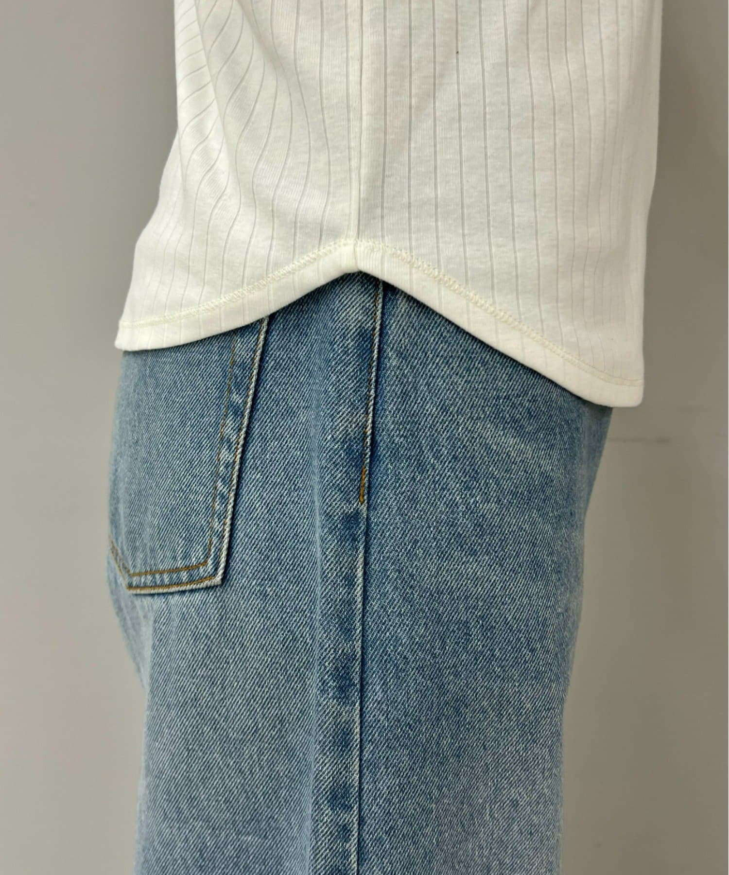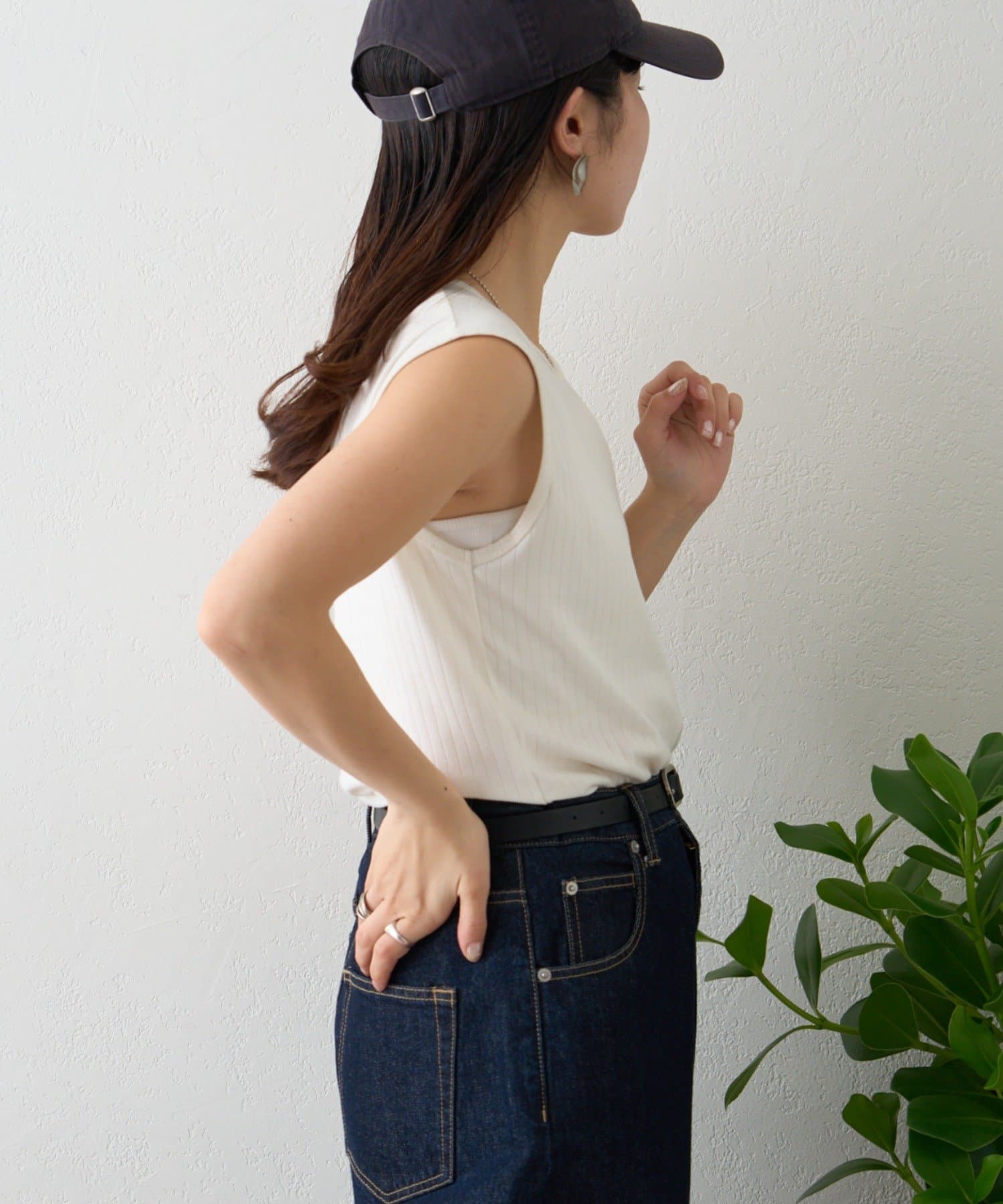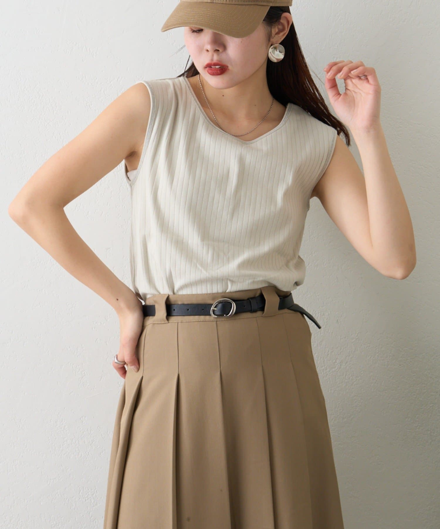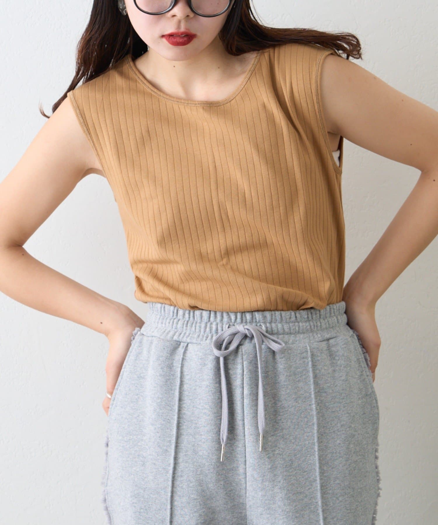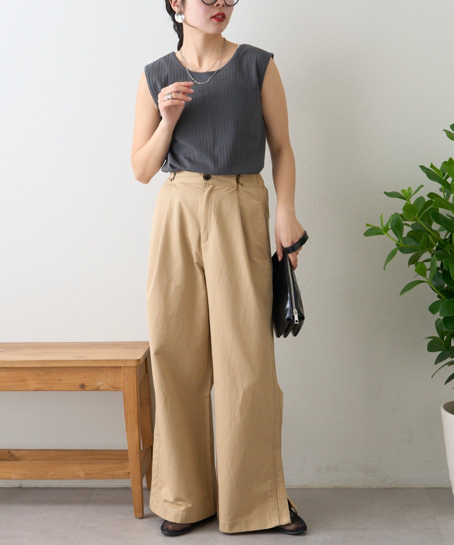 リブ素材で体に程よくフィットし、縦のラインを強調してくれるのですっきり見えシルエットに。