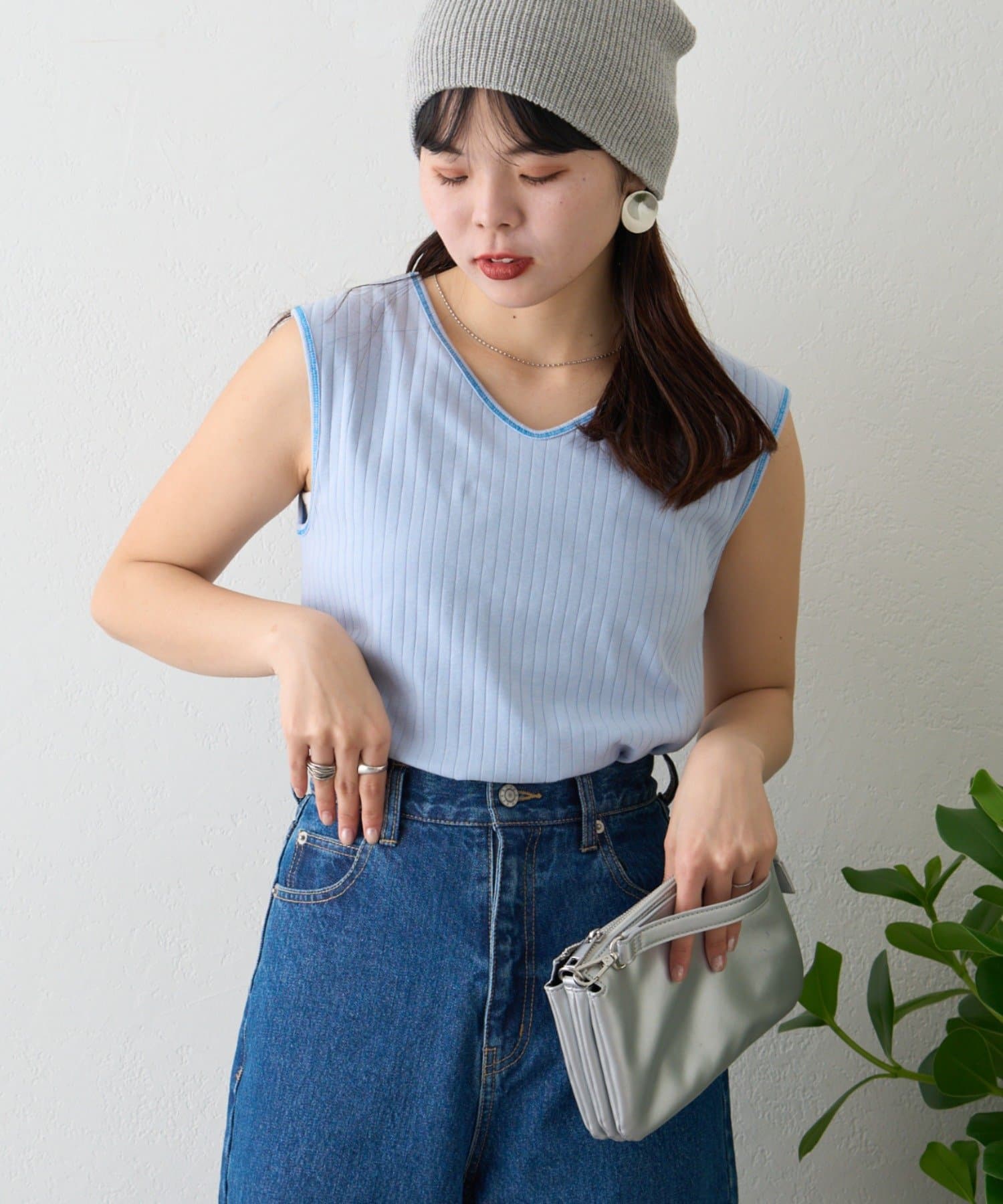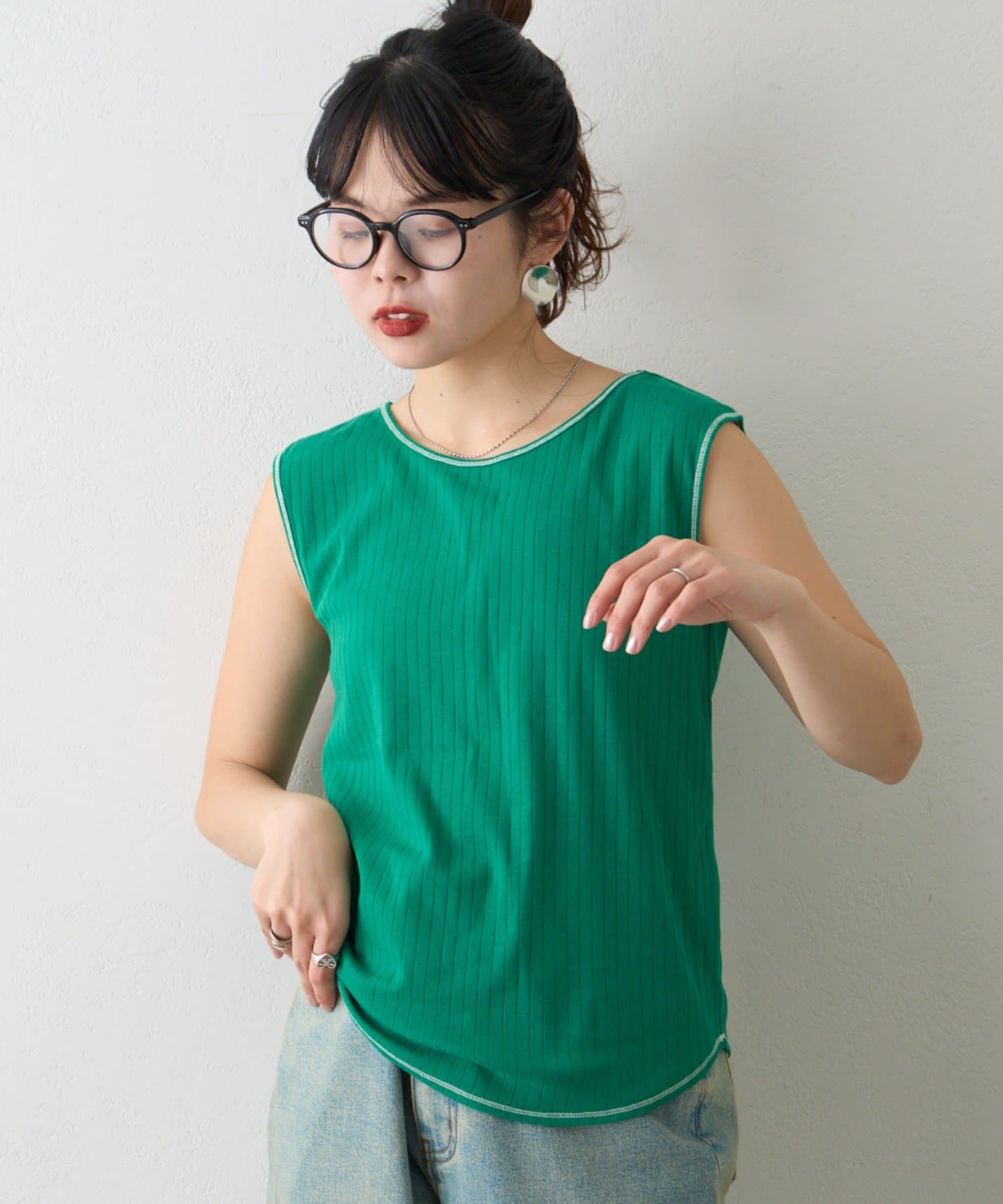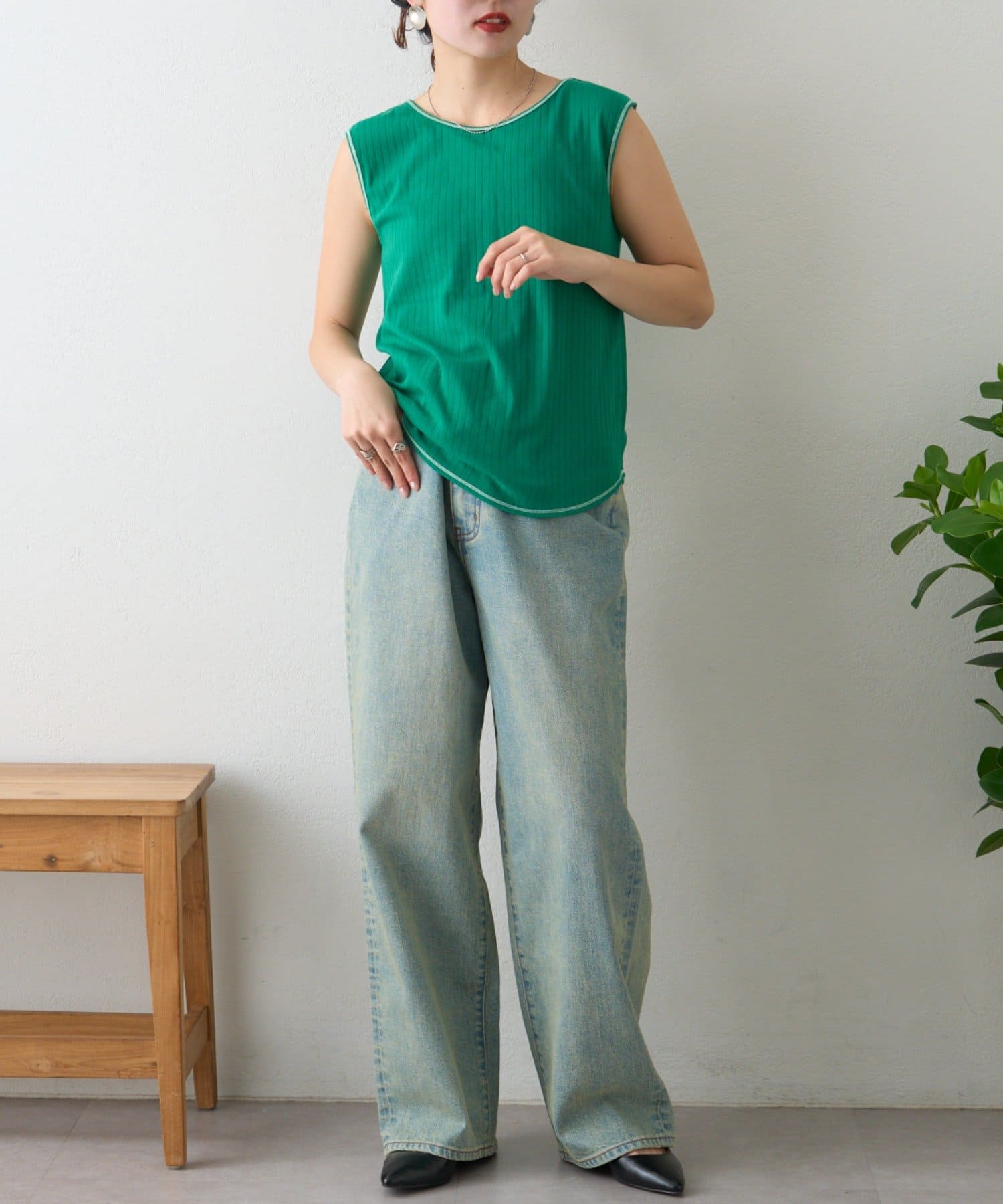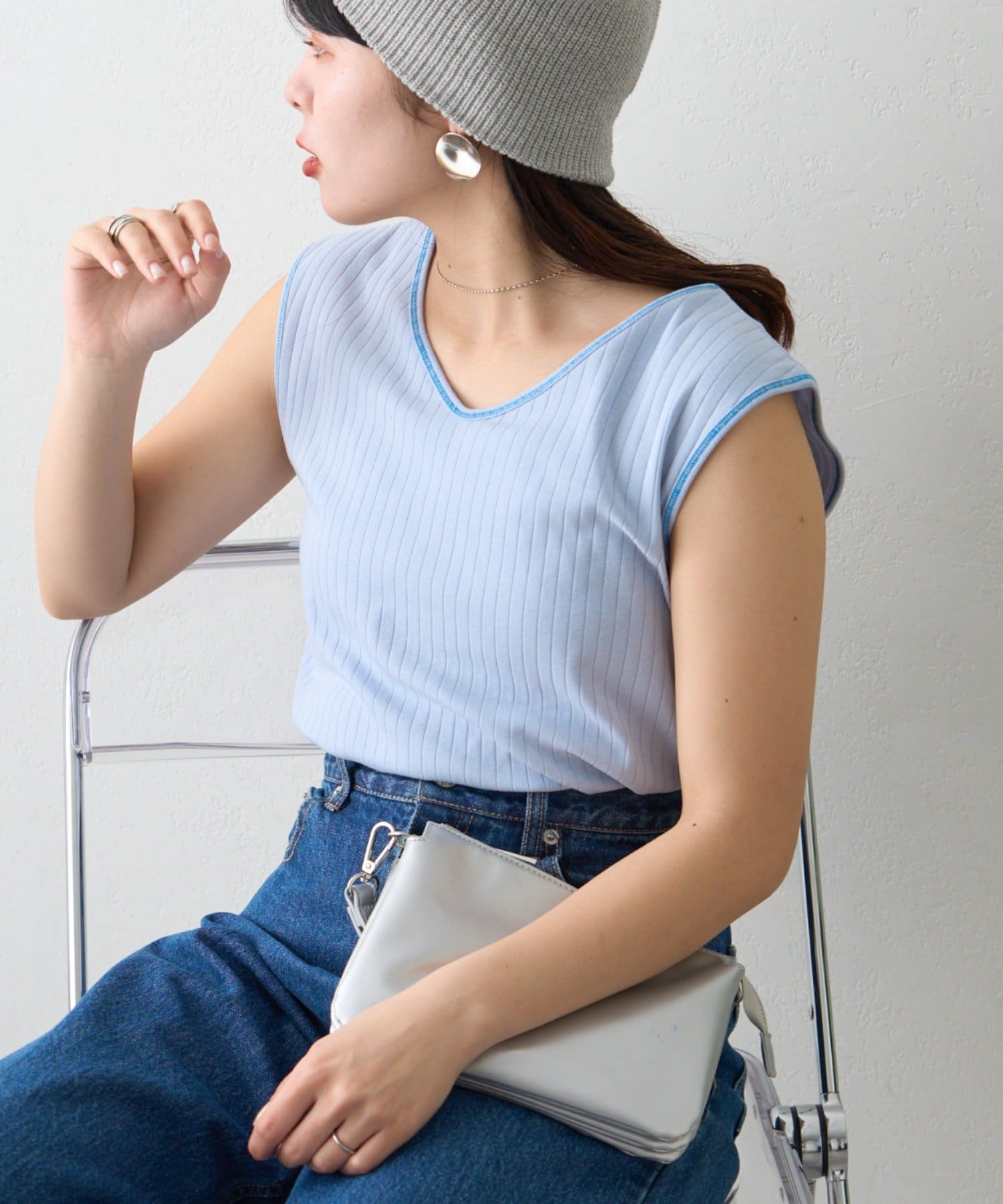 シンプルになりがちなインナーも、配色ステッチがあることでコーデのポイントになってくれます。
