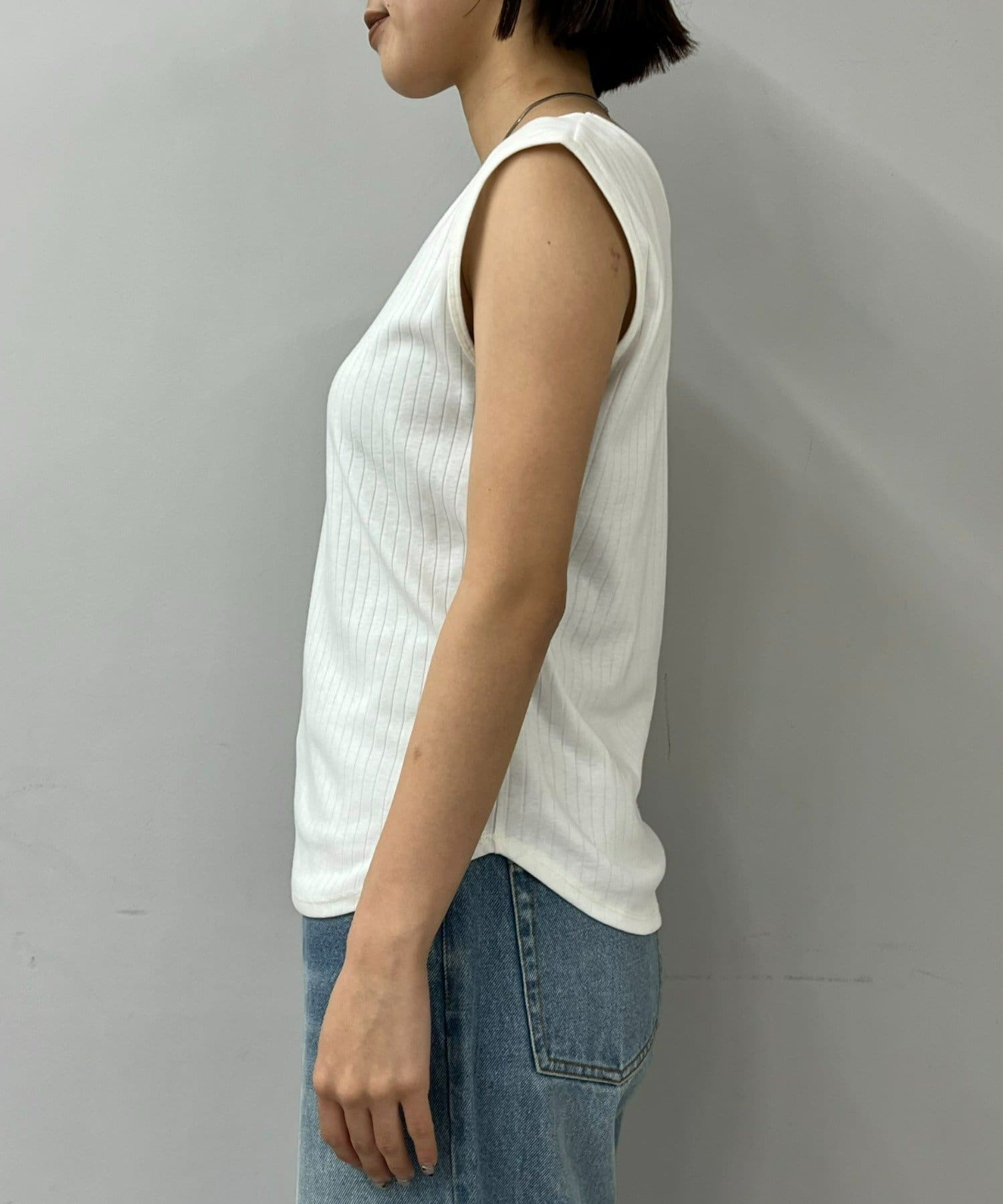 購入場所:パルクローゼット骨格ナチュラル、身長169cm肩幅広めの自分には、肩と二の腕ががっつりですぎるので、モデルさんの写真のように一枚できるのは難しいですが、シャツのインナーとして、薄めでサラッとしていていい感じです。白は黒い下着を着ると少し透けます。