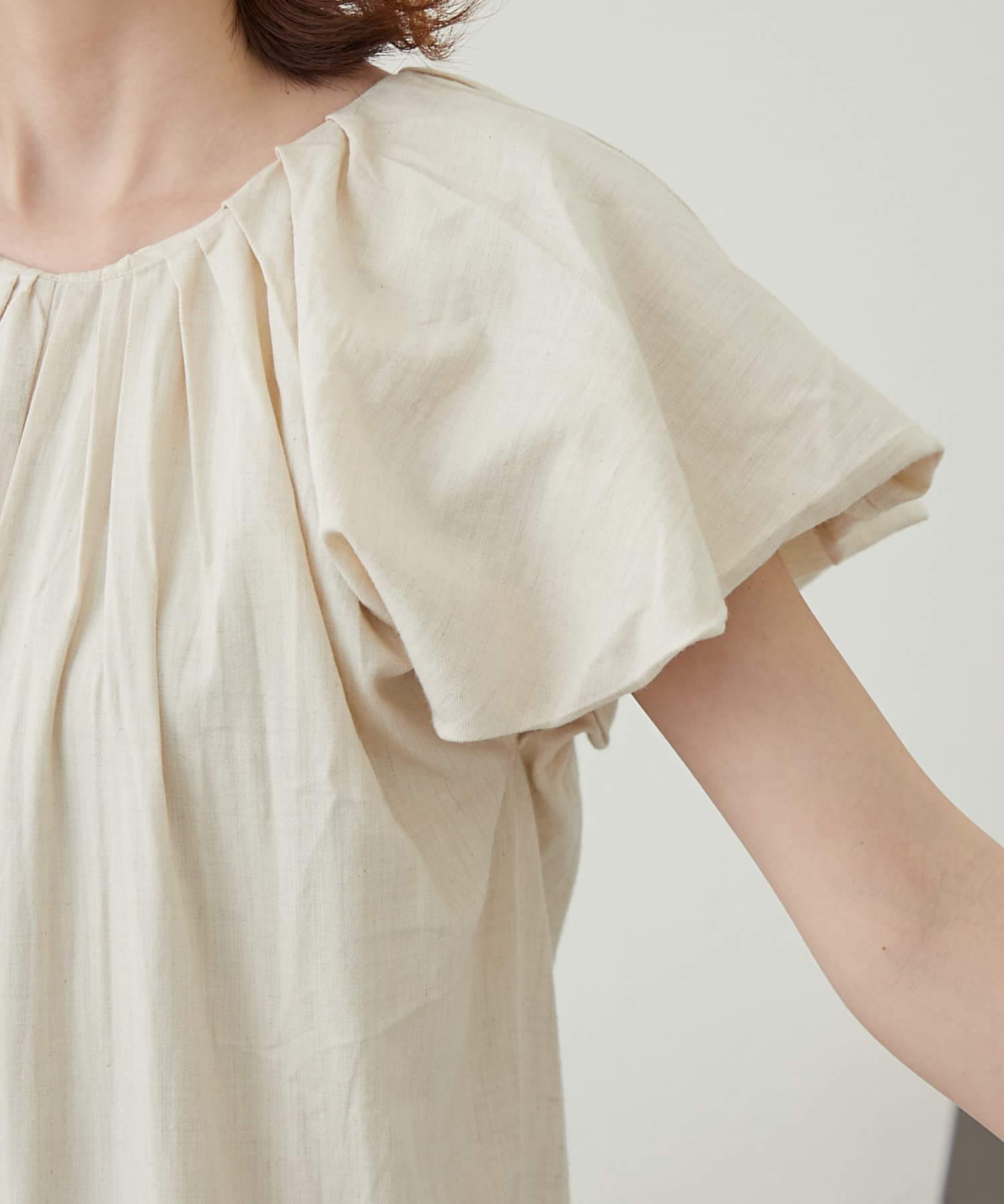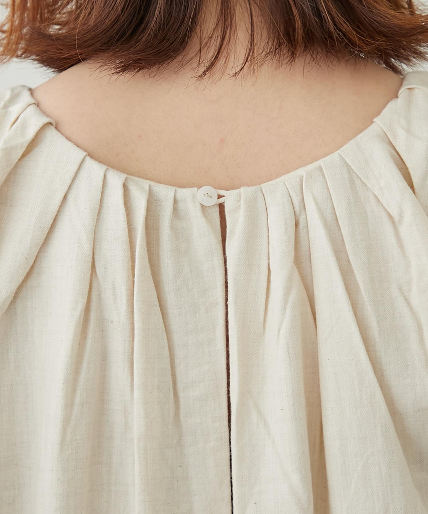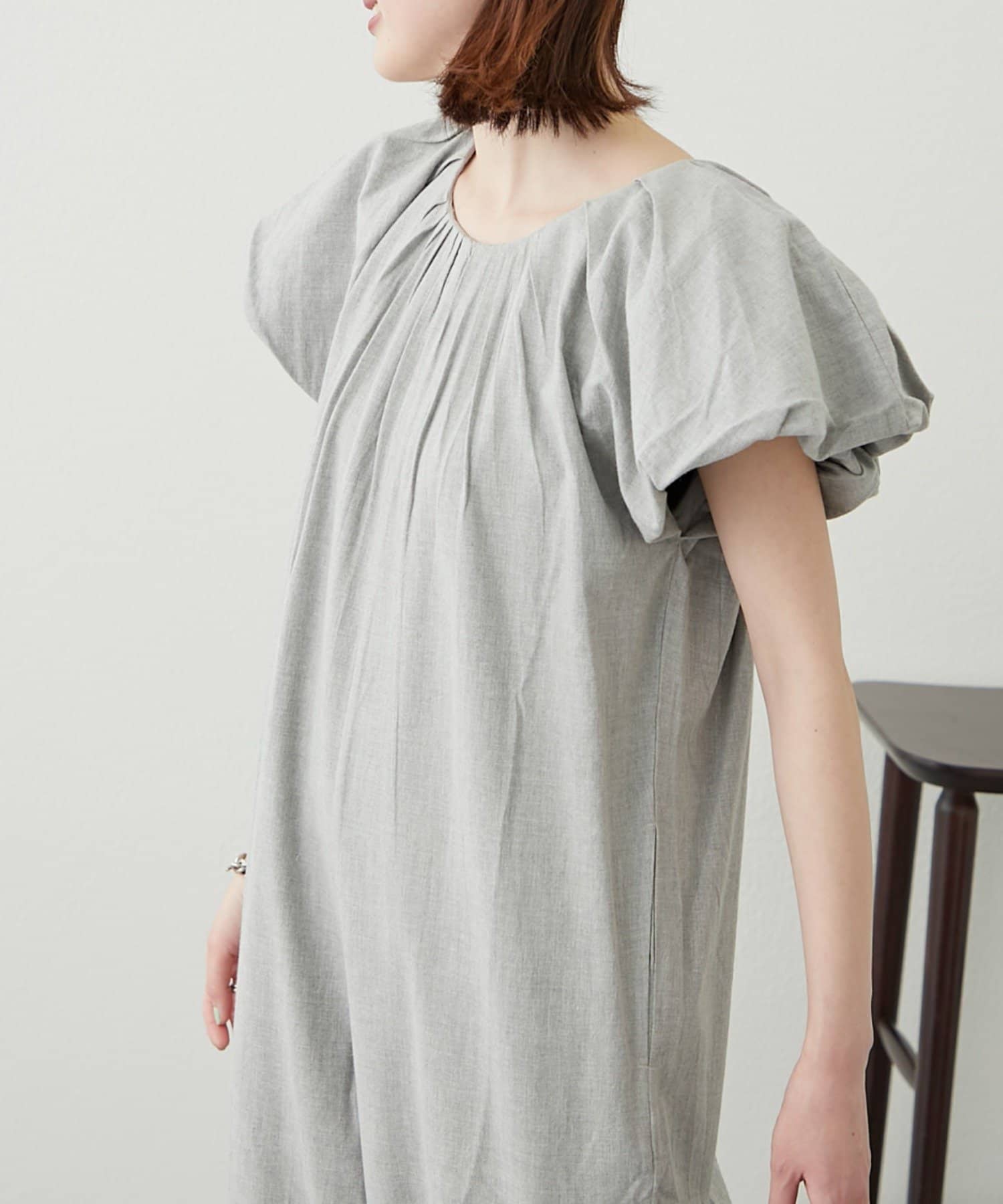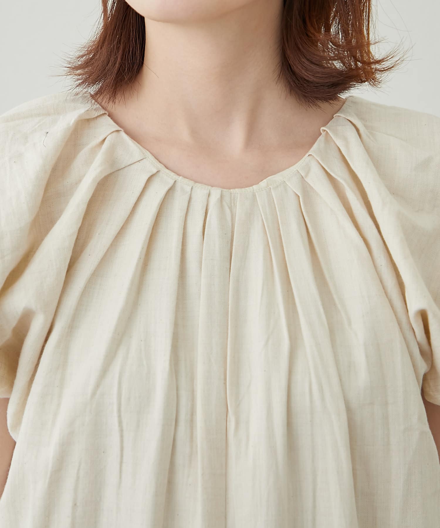 程よいボリュームのバルーンスリーブに、首元のギャザーが可愛い。