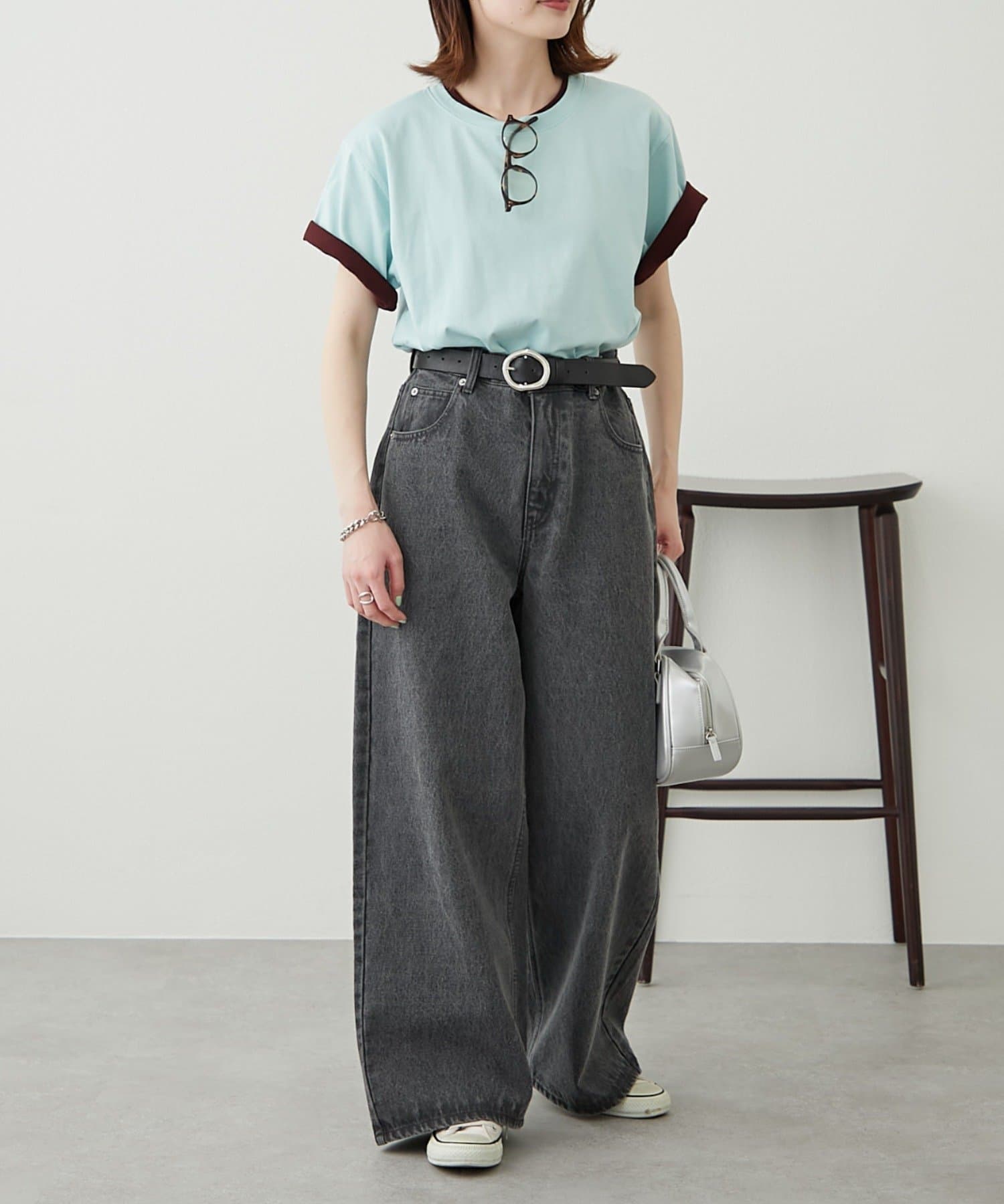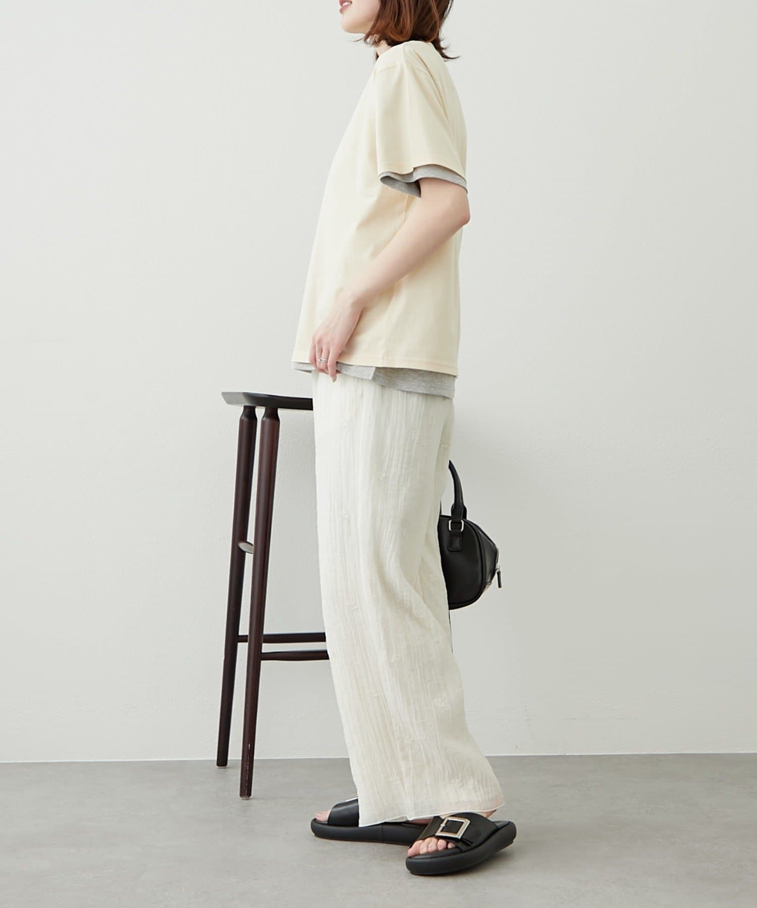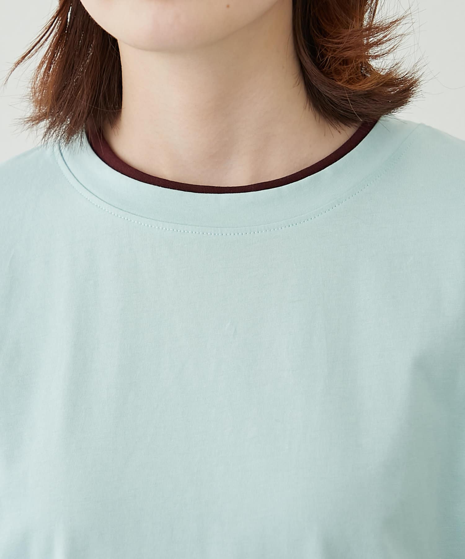 首元や袖からちらっと重ね着を主張。Tシャツなのにお洒落でこなれた雰囲気をつくれます。