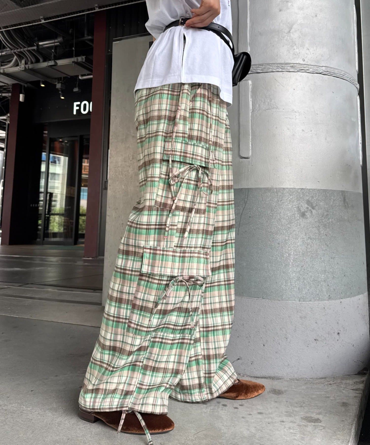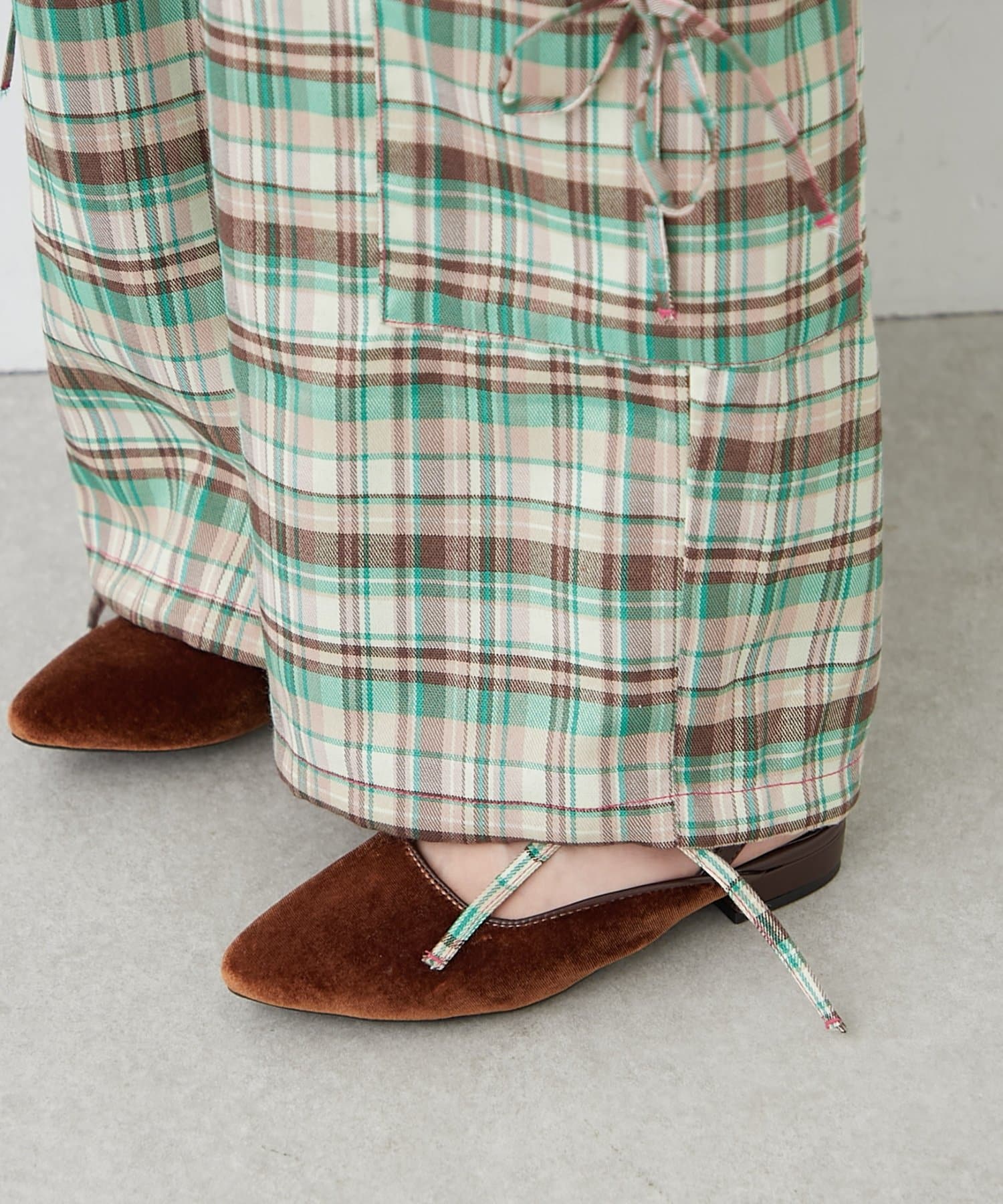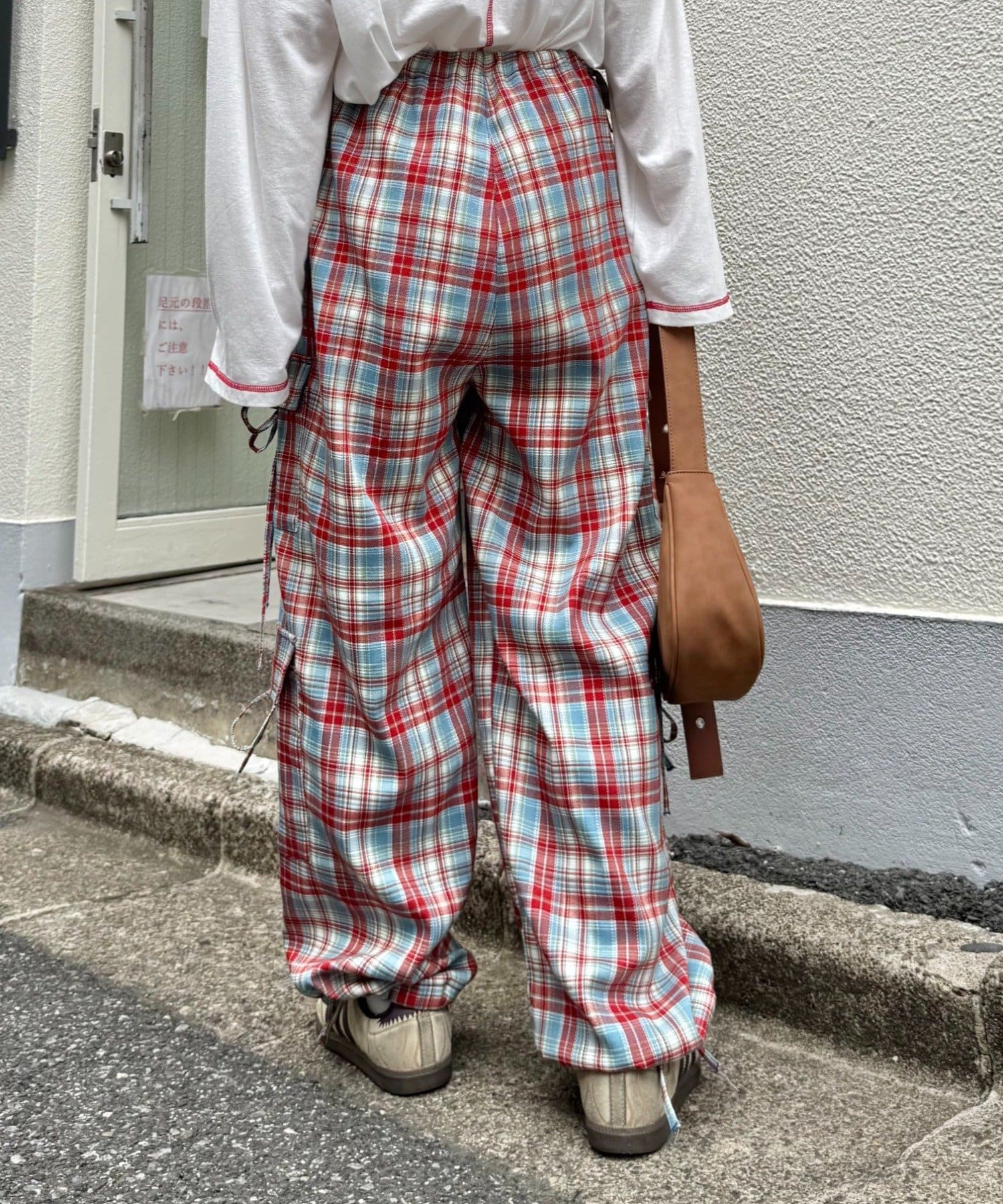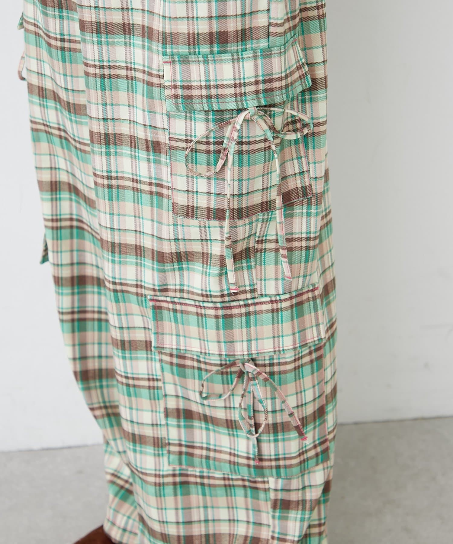 サイドにあしらわれたリボンが目を惹くチェックパンツ。
