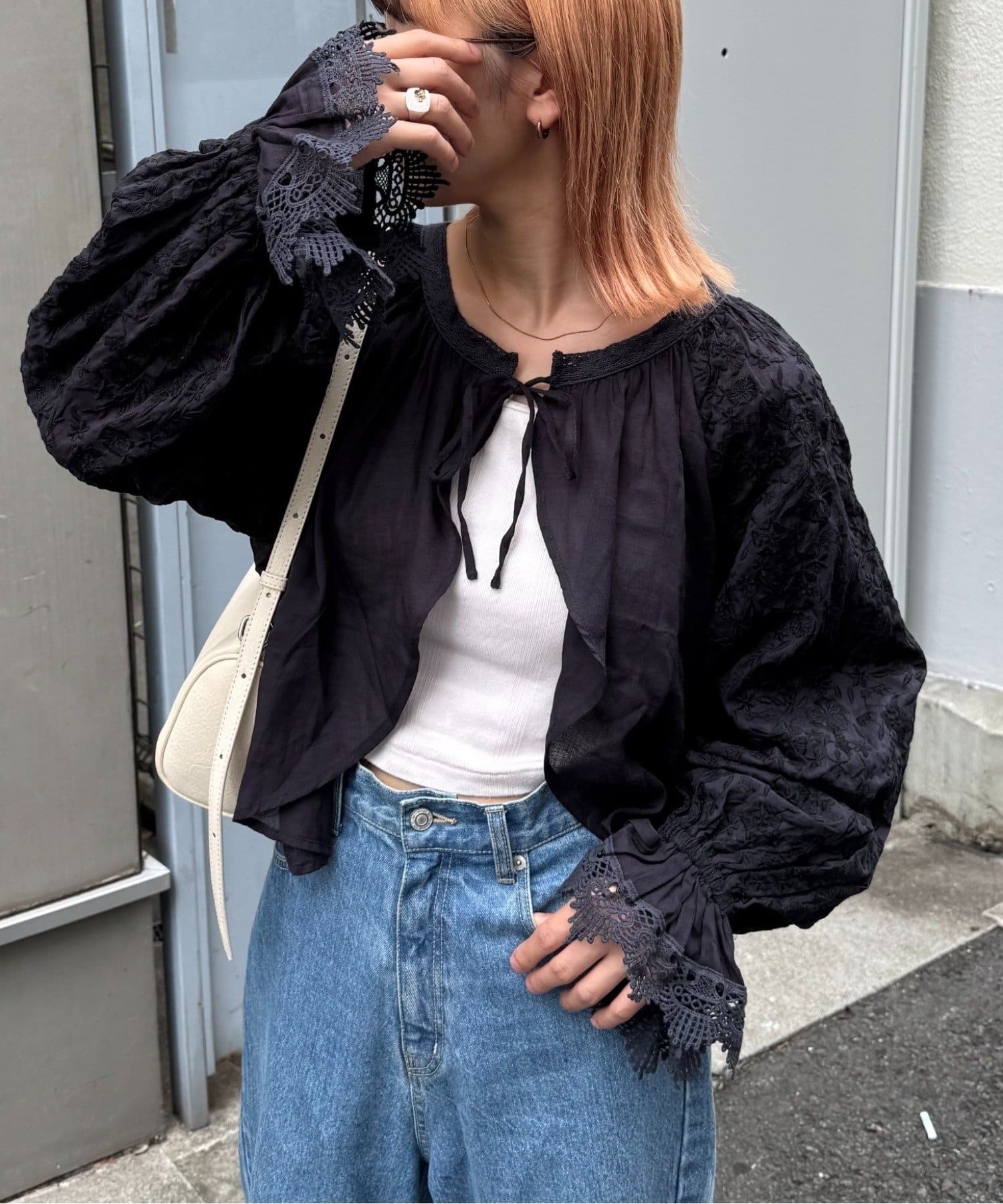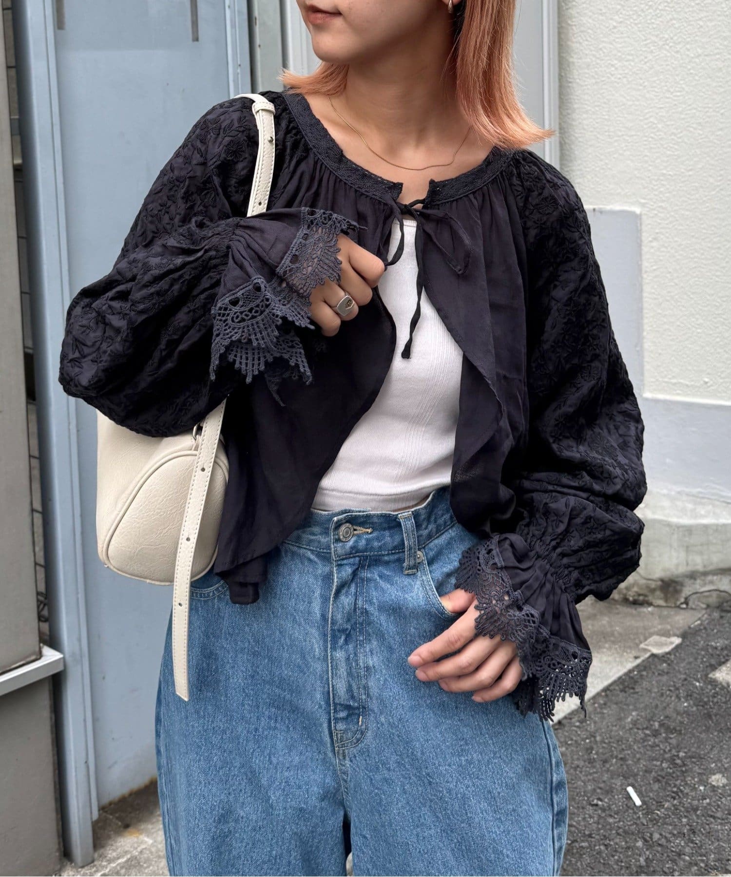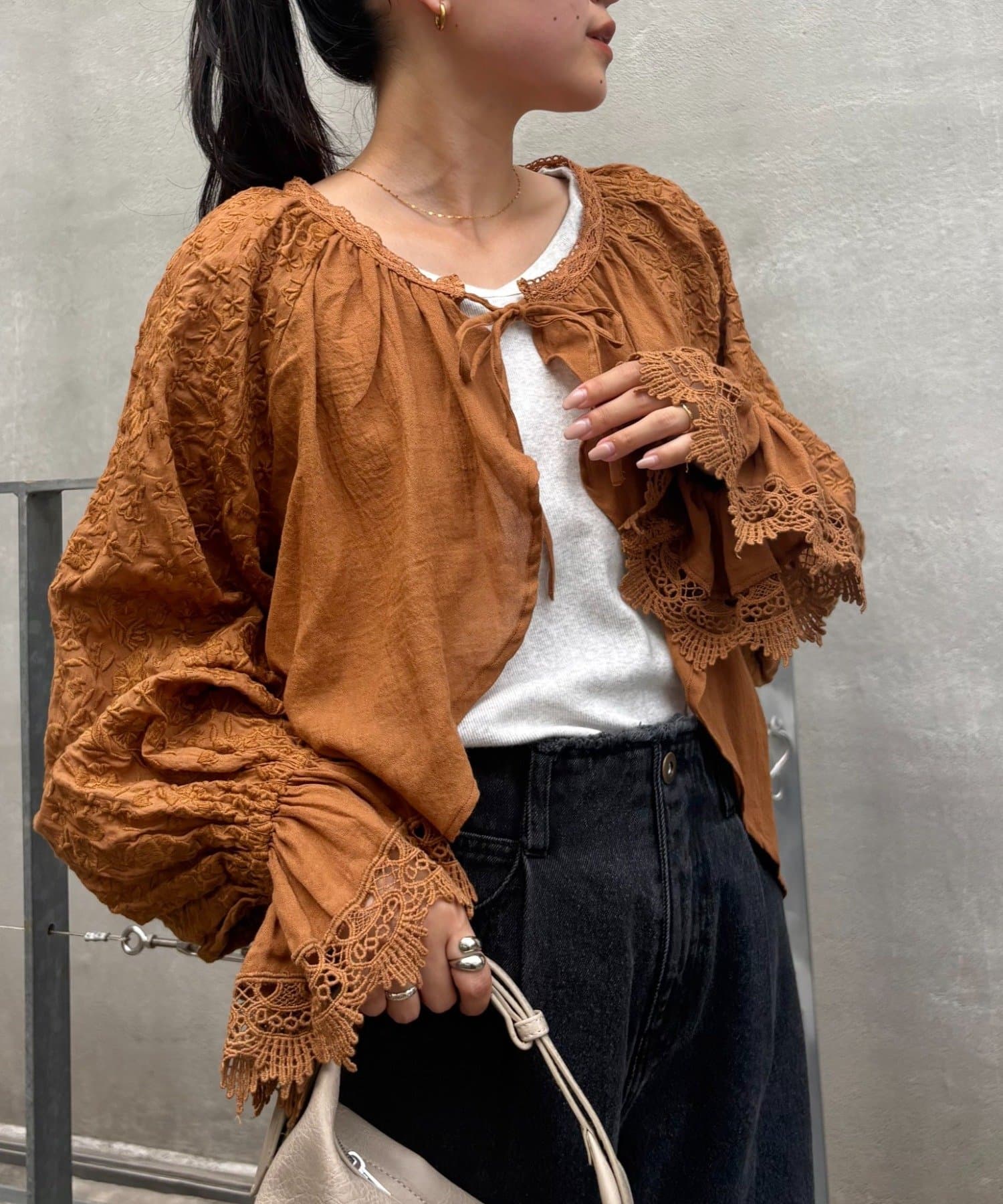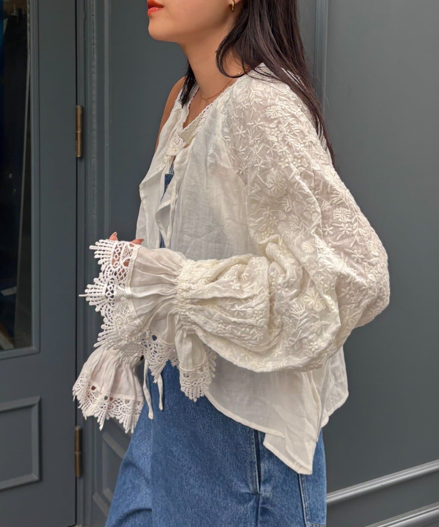 デニムとTシャツにさらっと羽織って、刺繍とレースを主役にしたガーリーなアクセントに♩