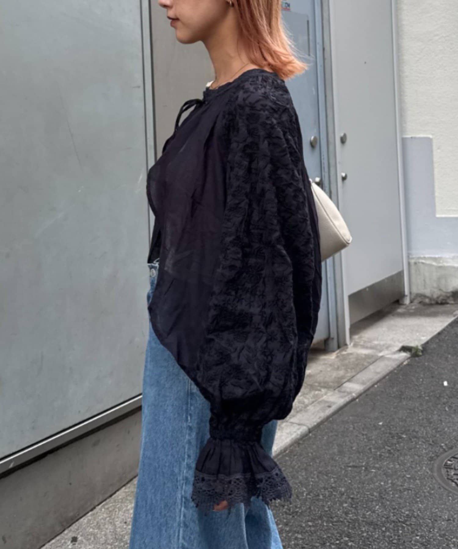 ふわっとボリュームのある袖は、手首できゅっと絞られ、その先にレースが広がる華やかなデザイン。