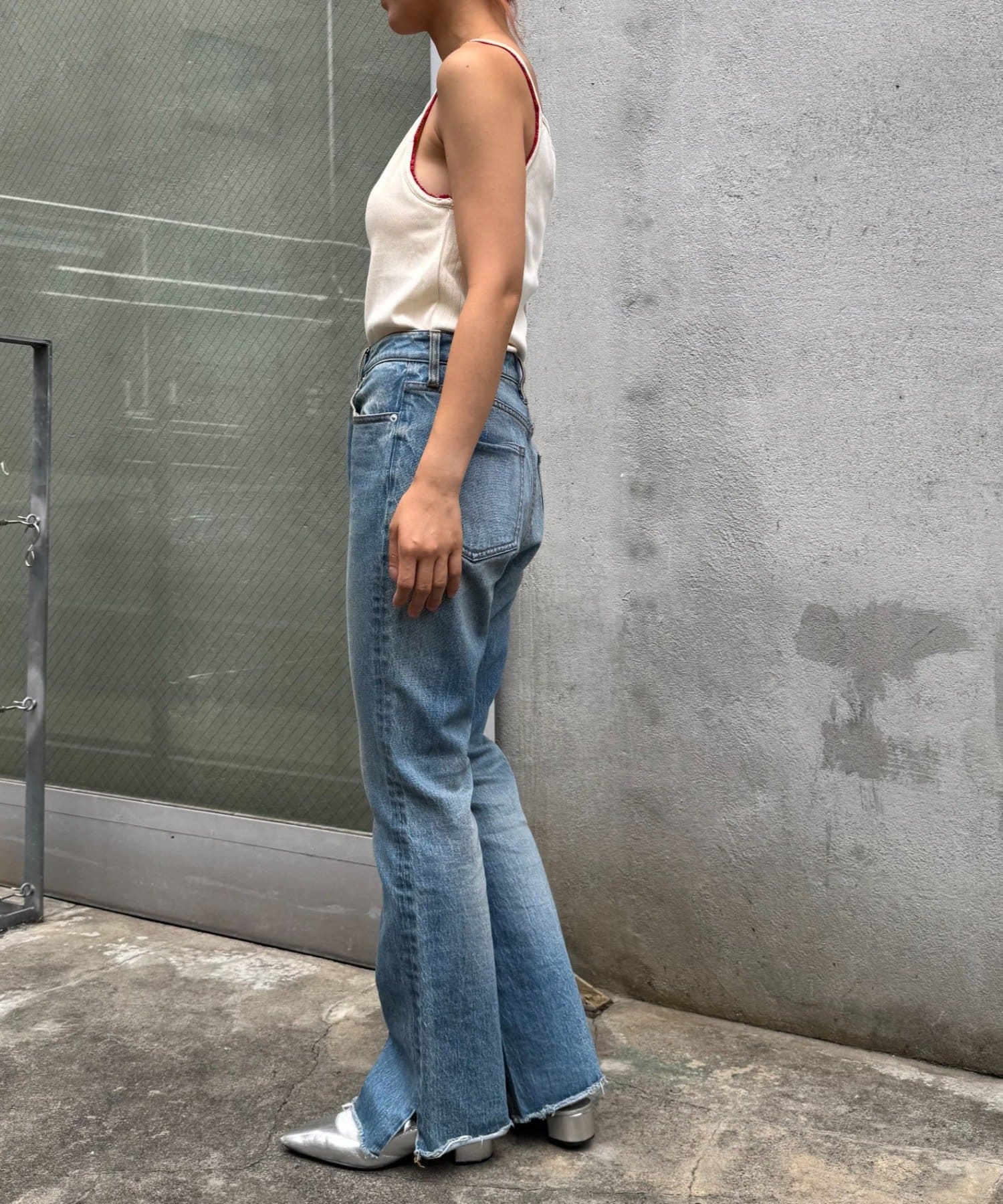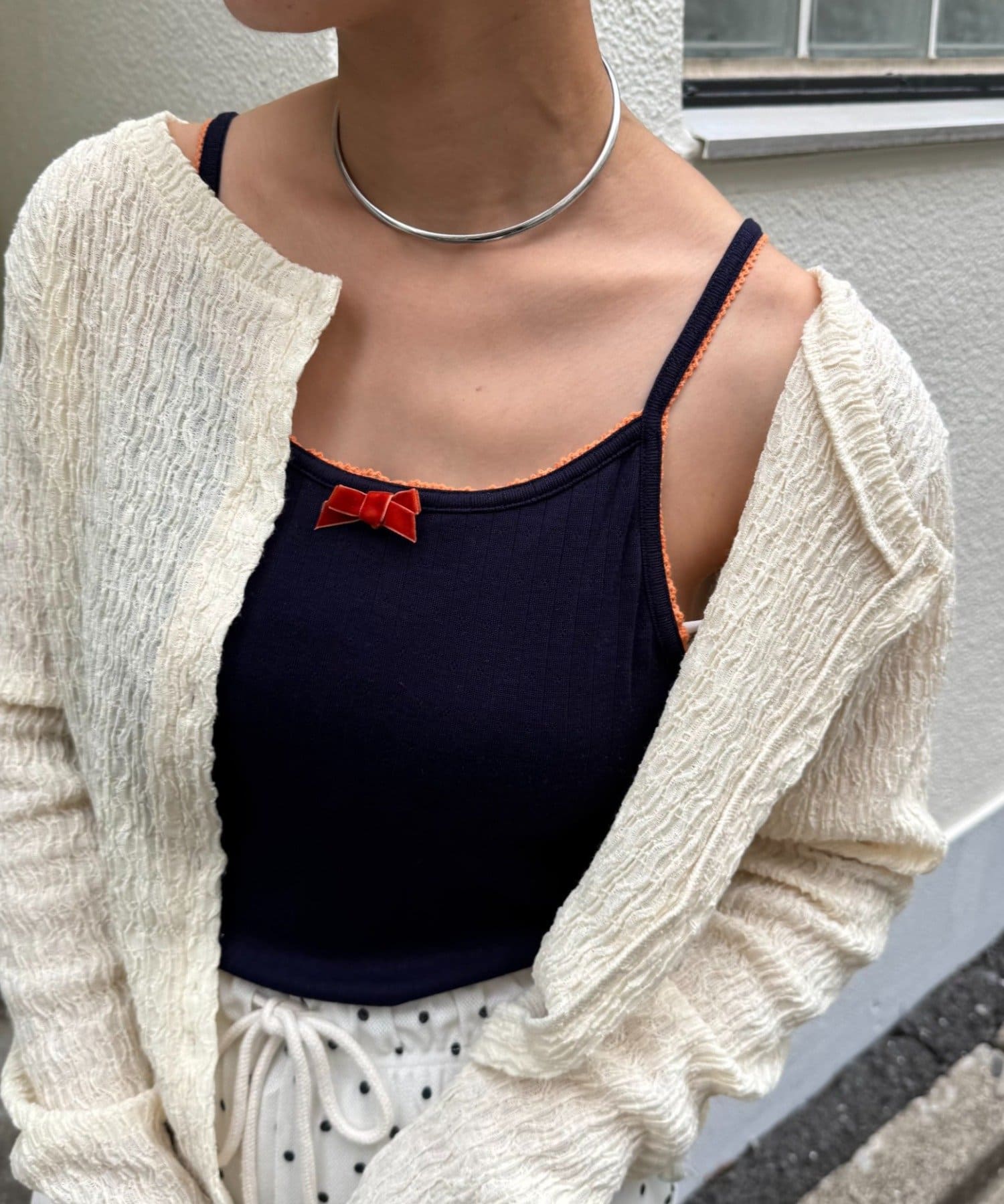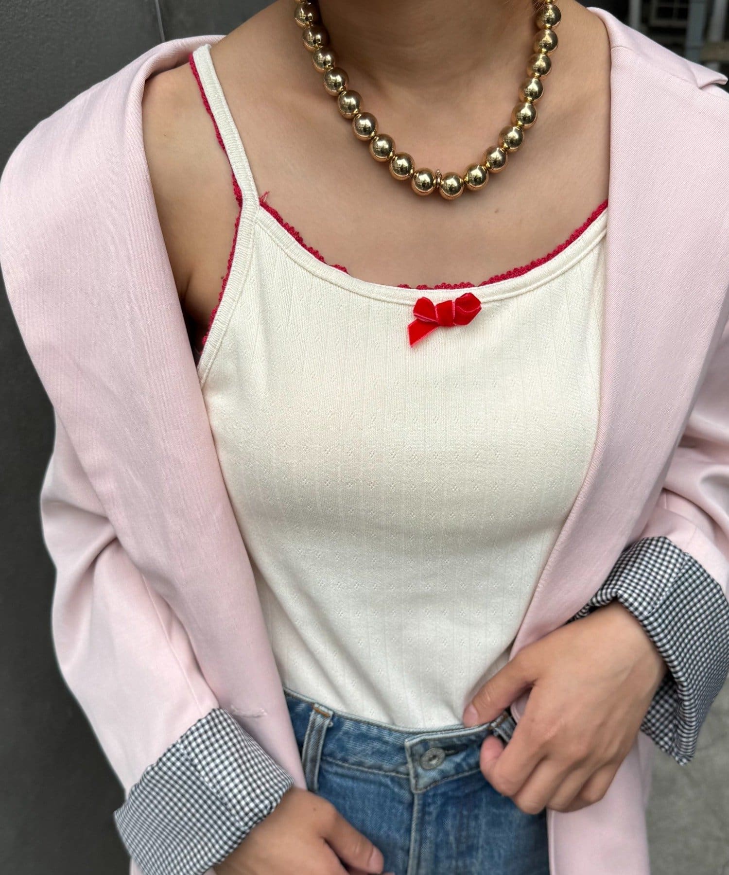 シャツやジャケットのインナーなど、ガーリーなキャミを魅せるレイヤードが今っぽい♩