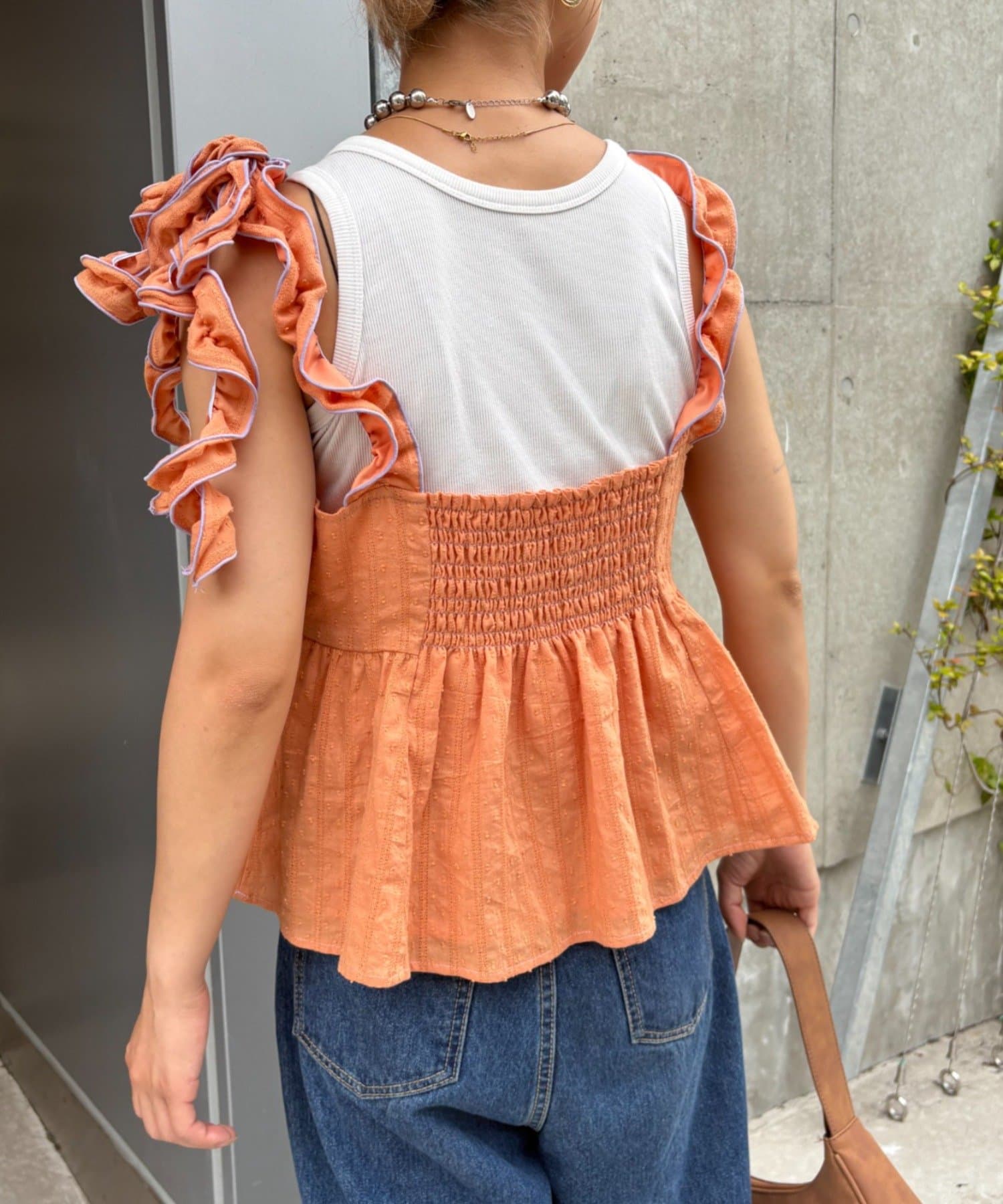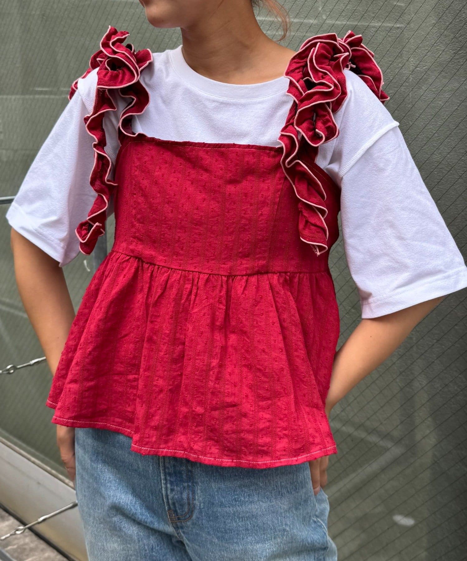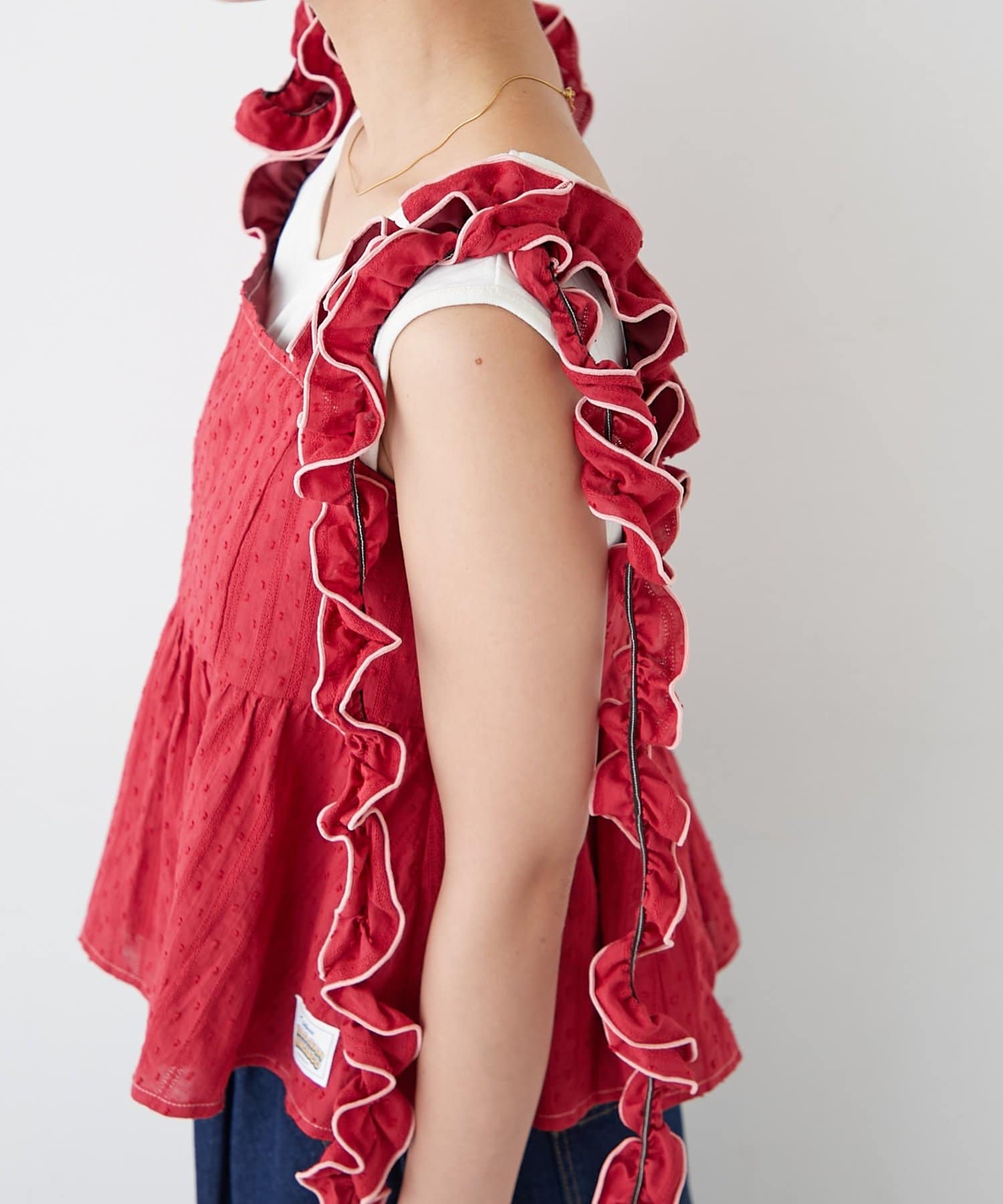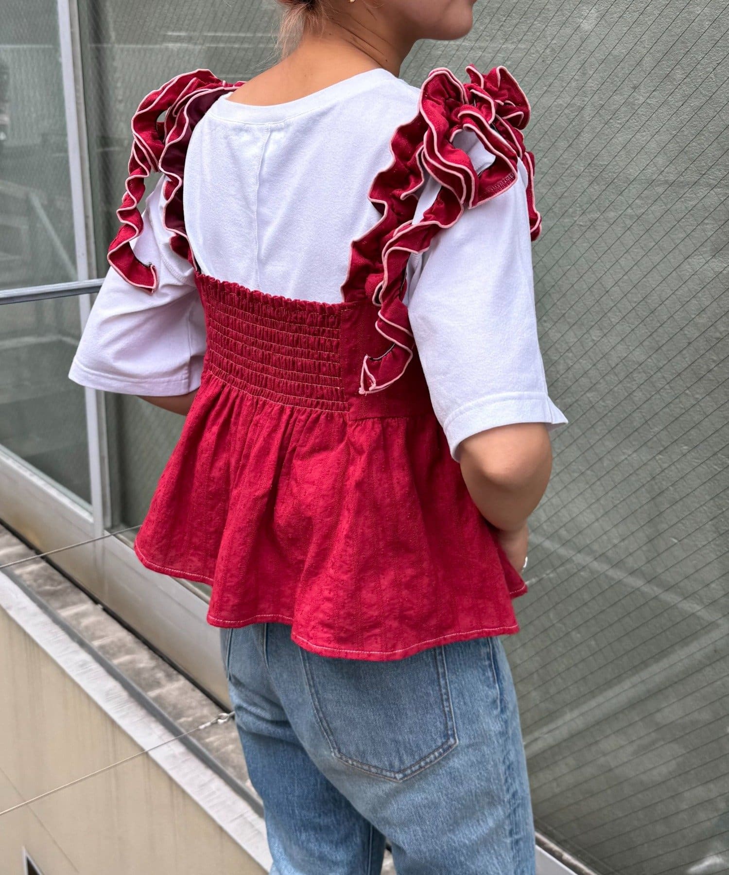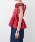 長めのフリルを結ぶことで肩紐にボリュームが出て、顔や肩を華奢に見せてくれます◎