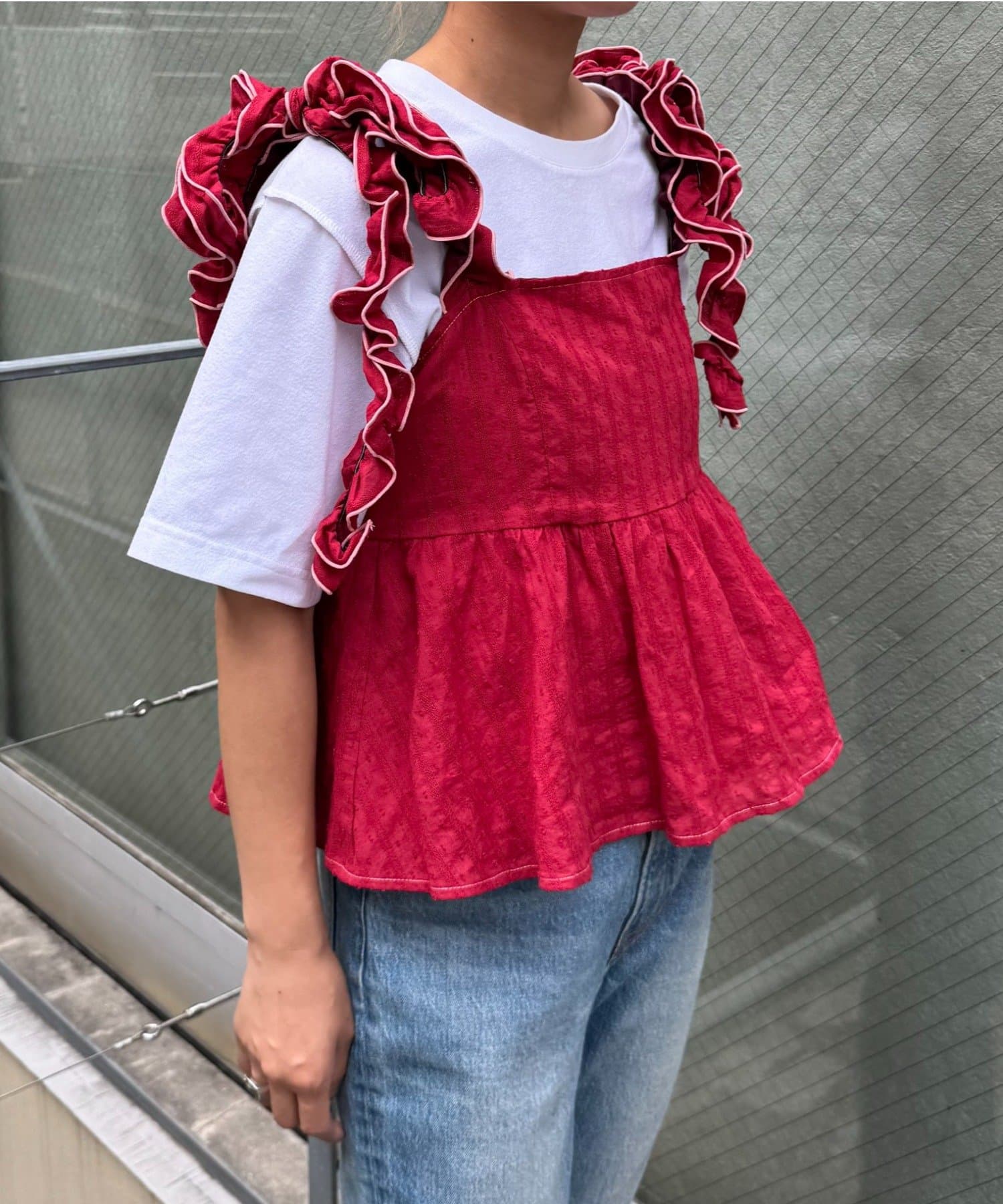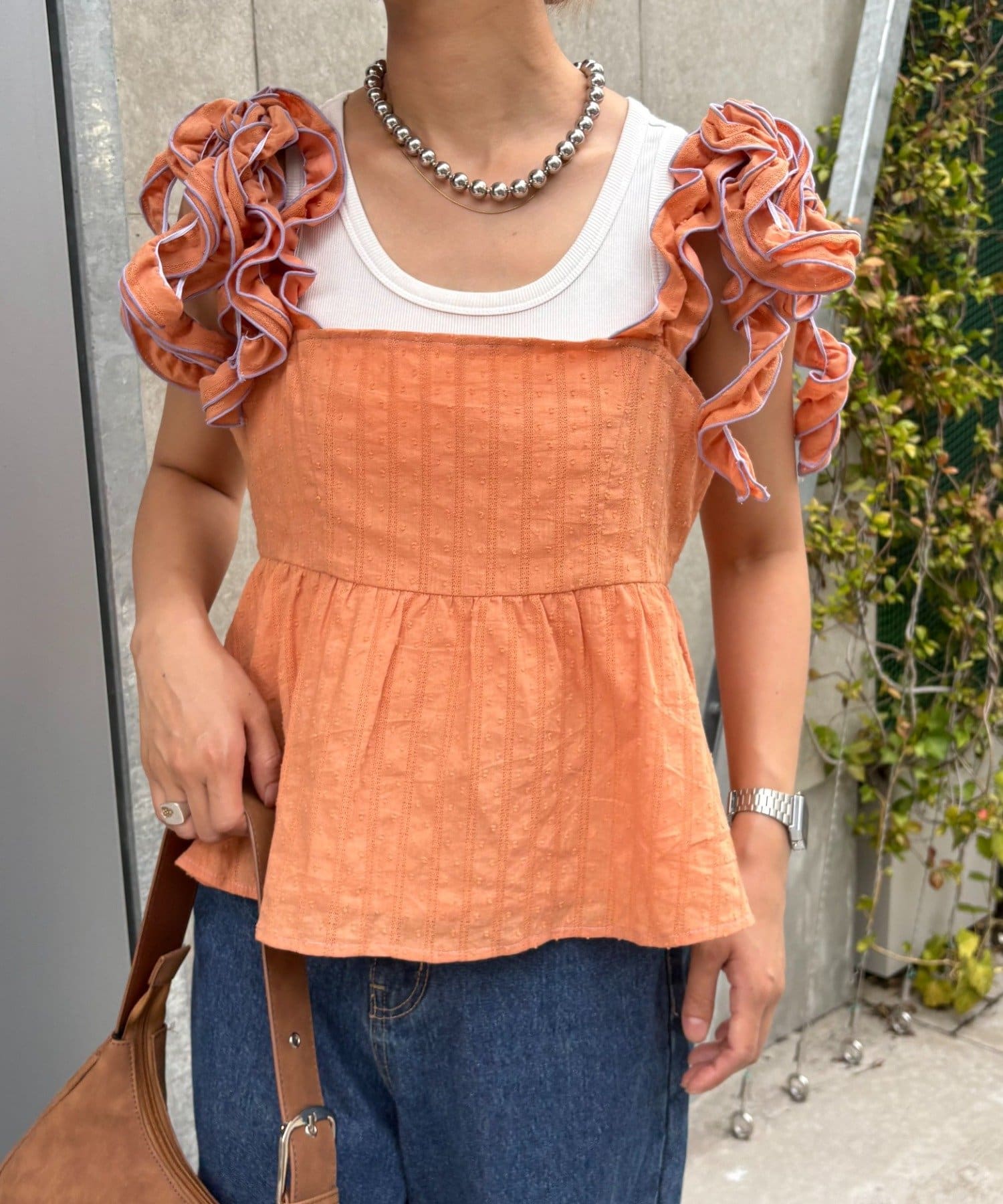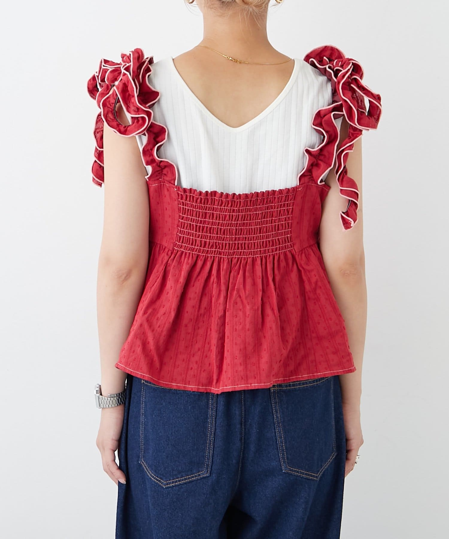 長めのフリルを結ぶことで肩紐にボリュームが出て、顔や肩を華奢に見せてくれます◎