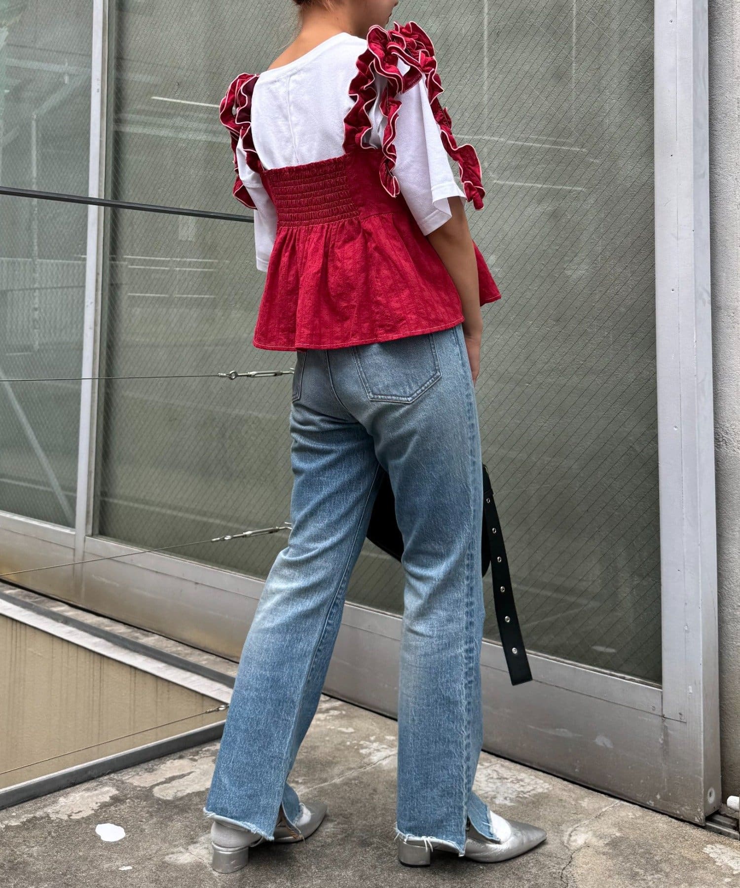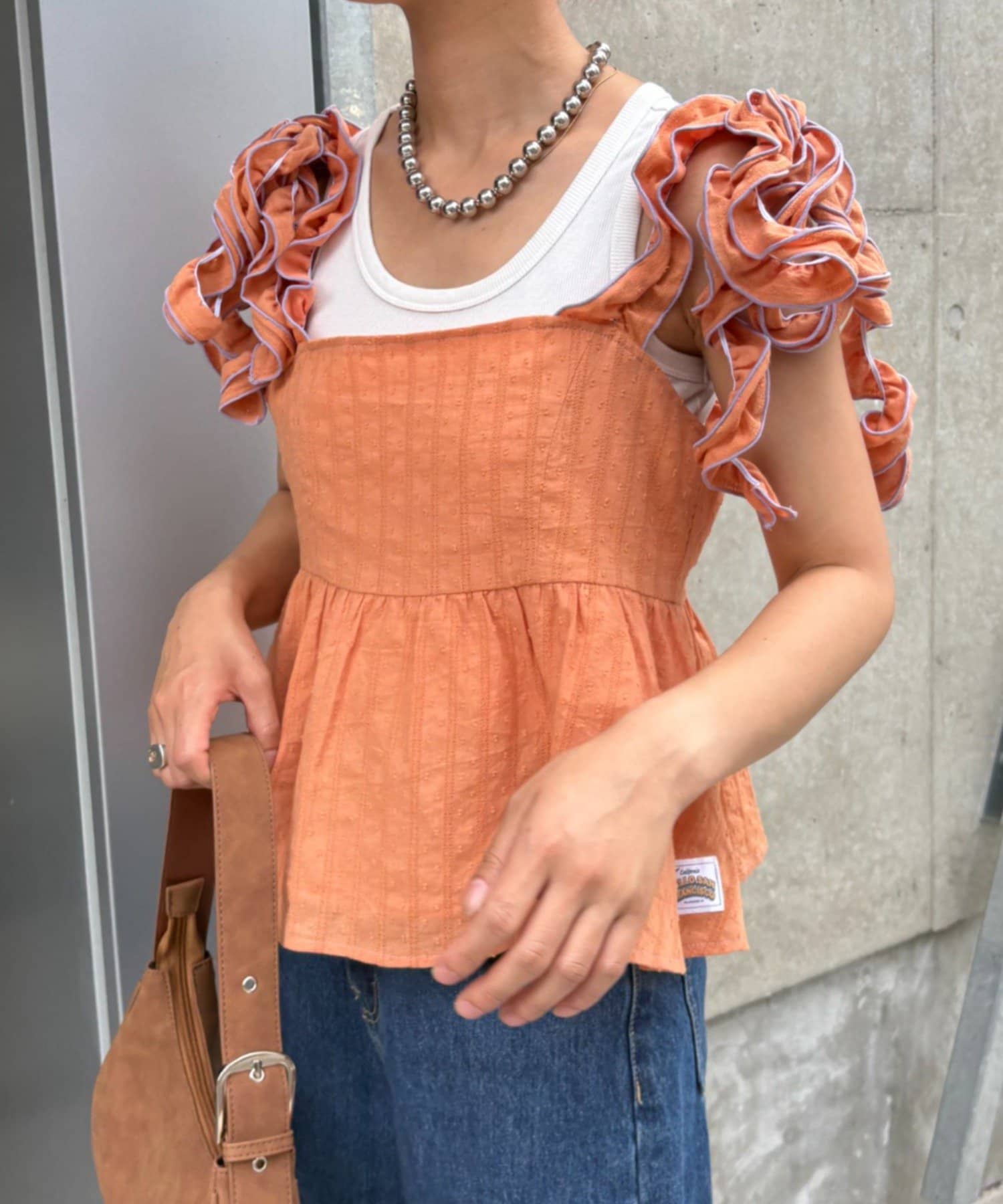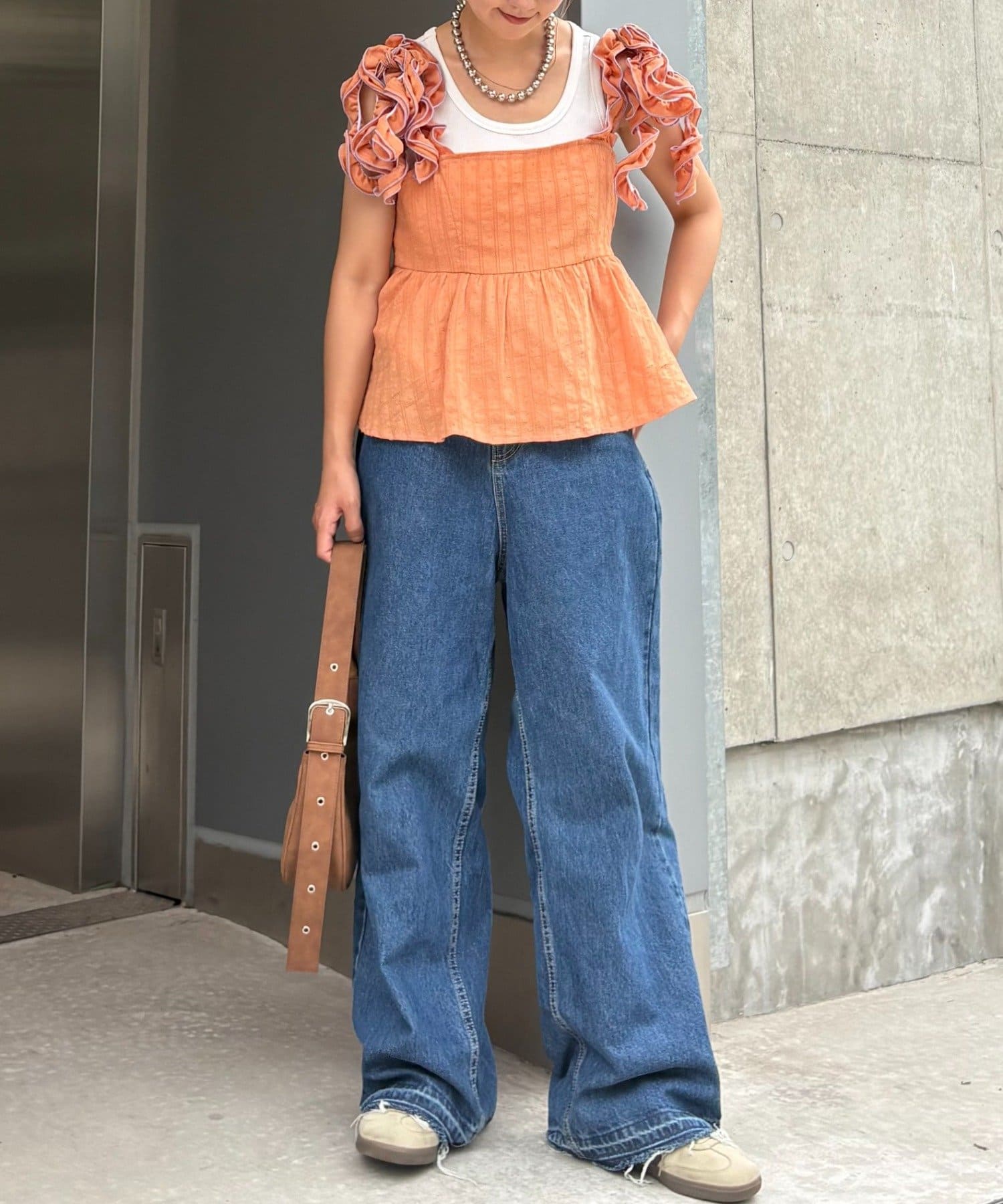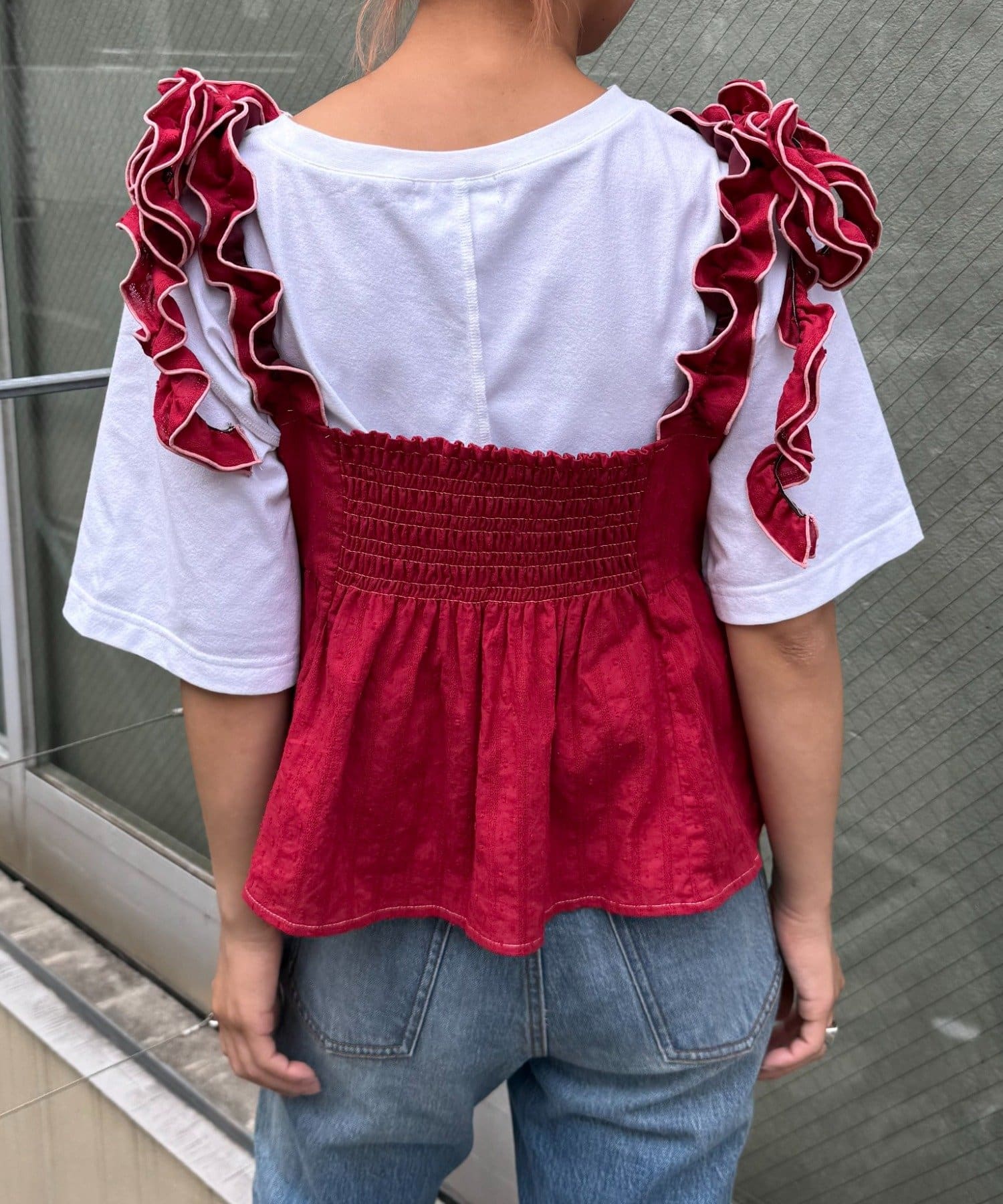 長めのフリルを結ぶことで肩紐にボリュームが出て、顔や肩を華奢に見せてくれます◎