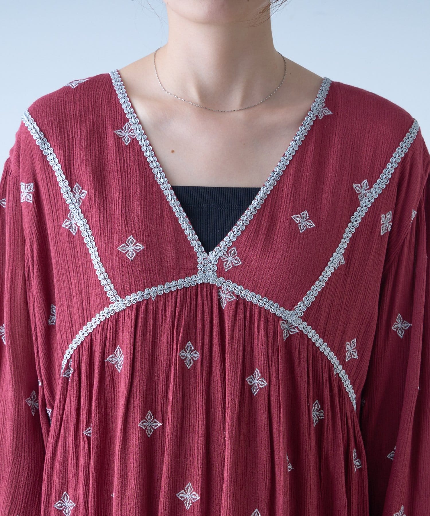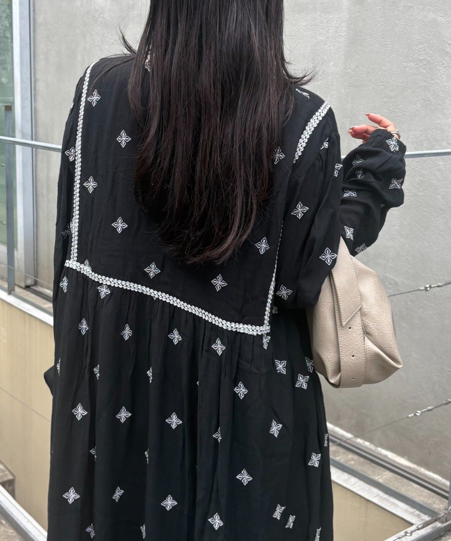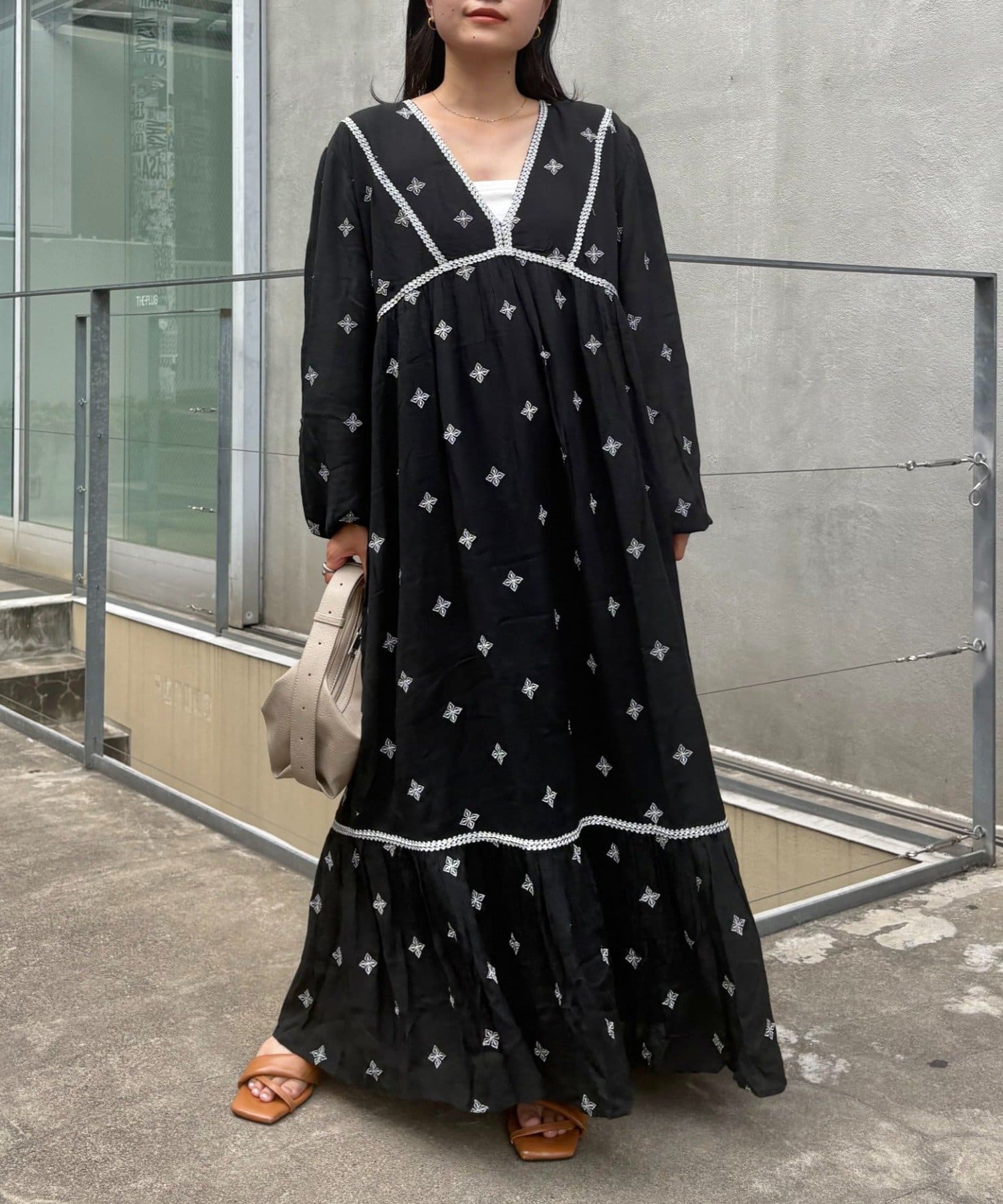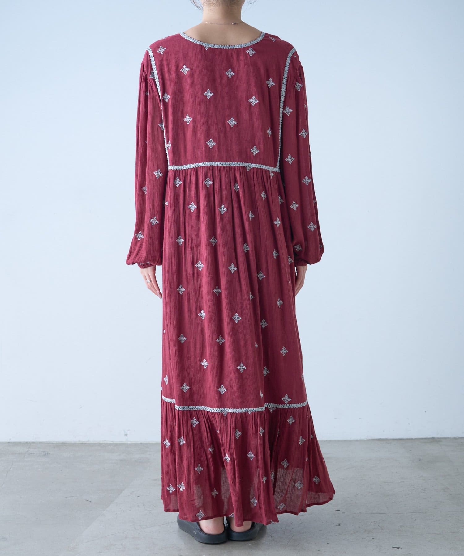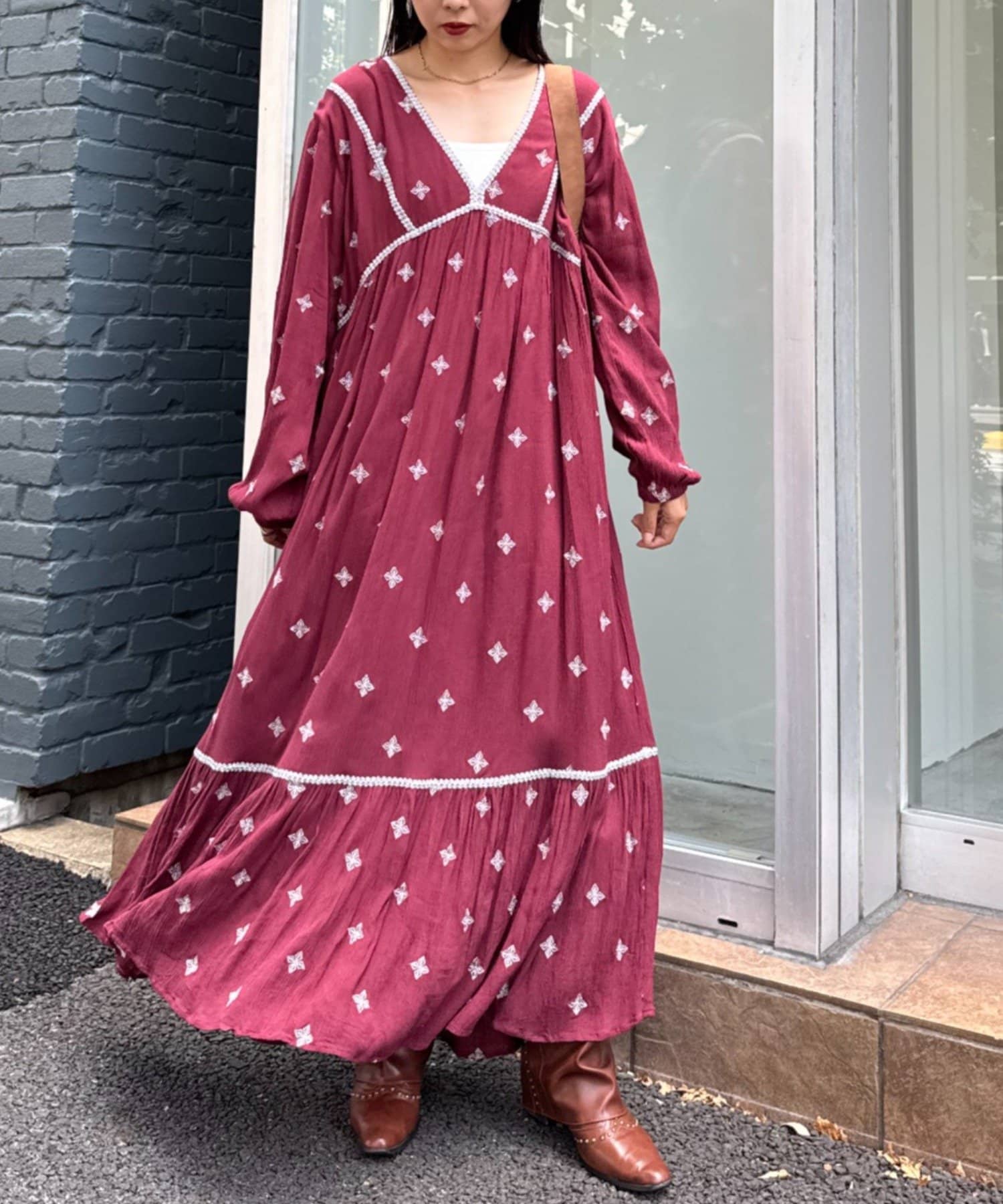 ブラックとボルドーの2色展開で、アクセントの刺繍が華やかな1着です。