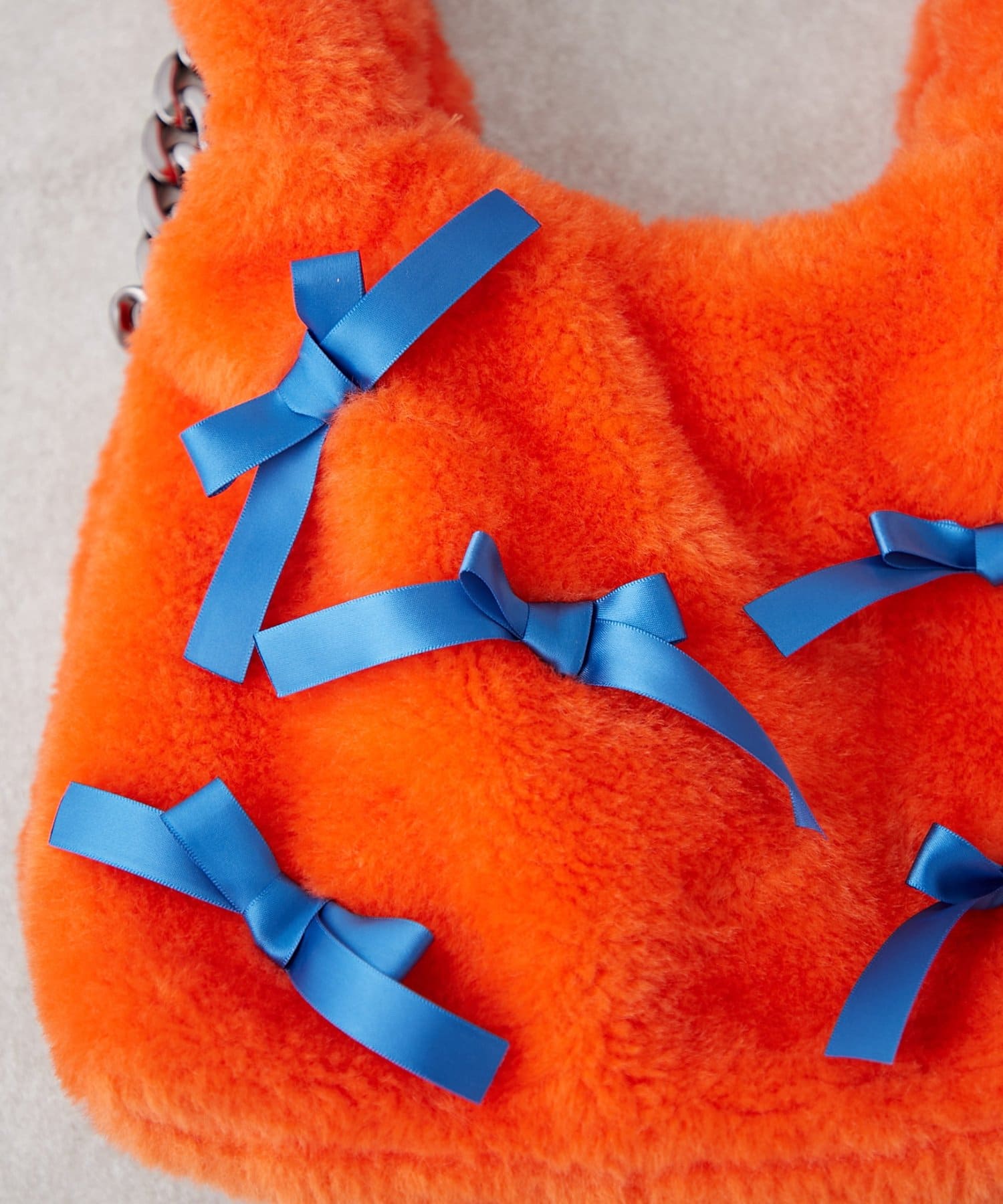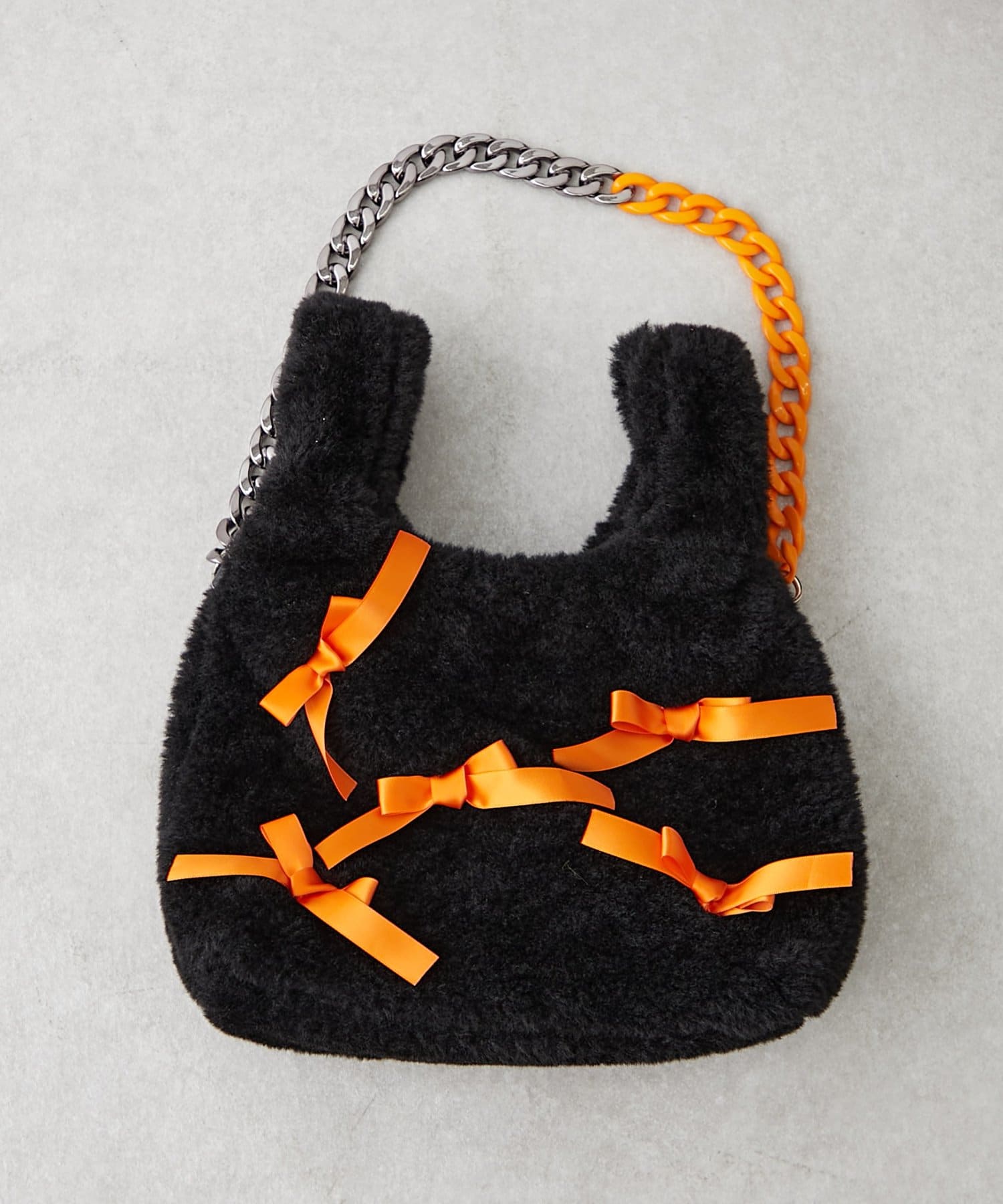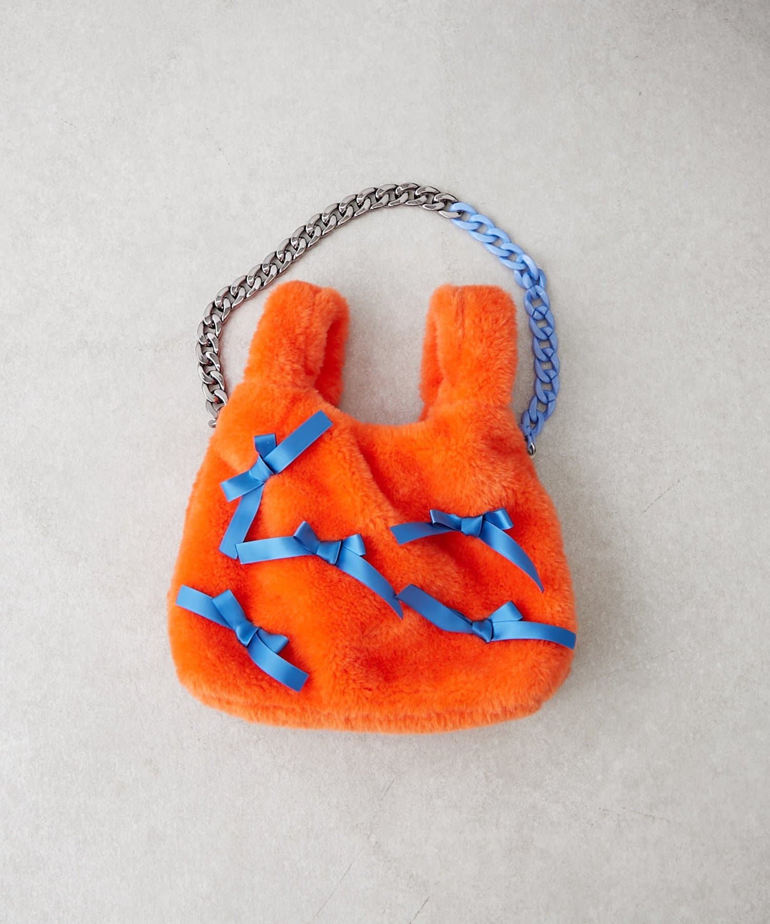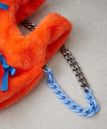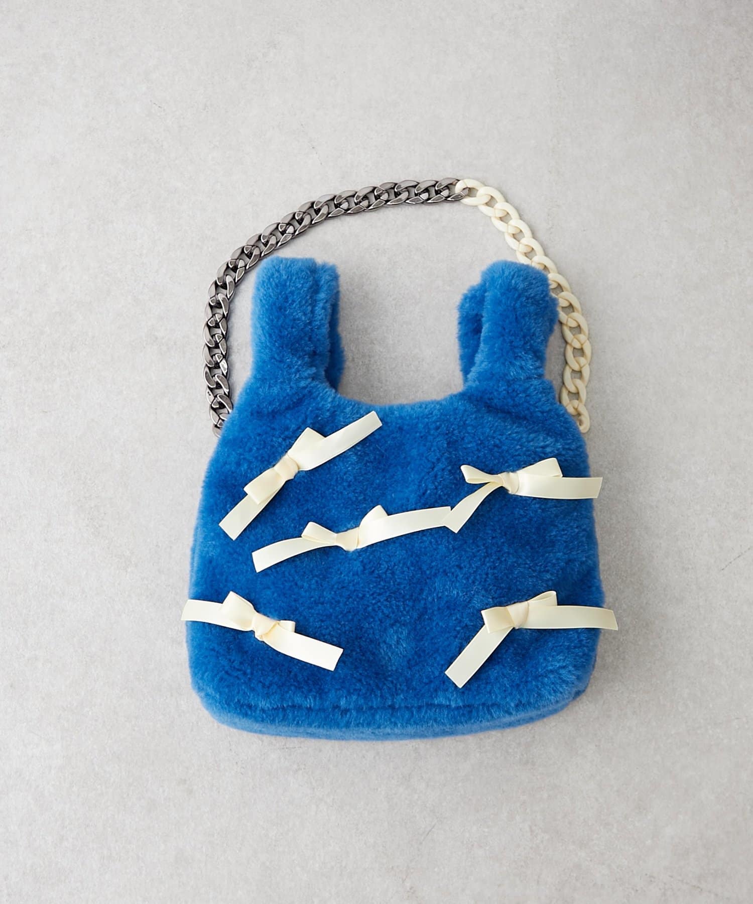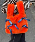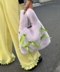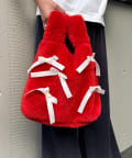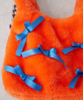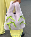 ふんわりフォルムに並べたバイカラーのリボンがキャッチーで可愛い!遊び心満点のファーバッグ。