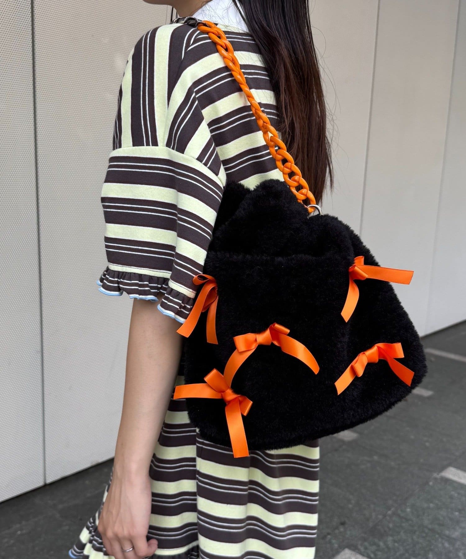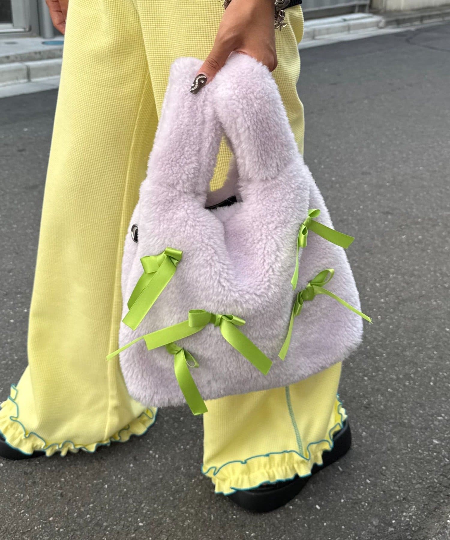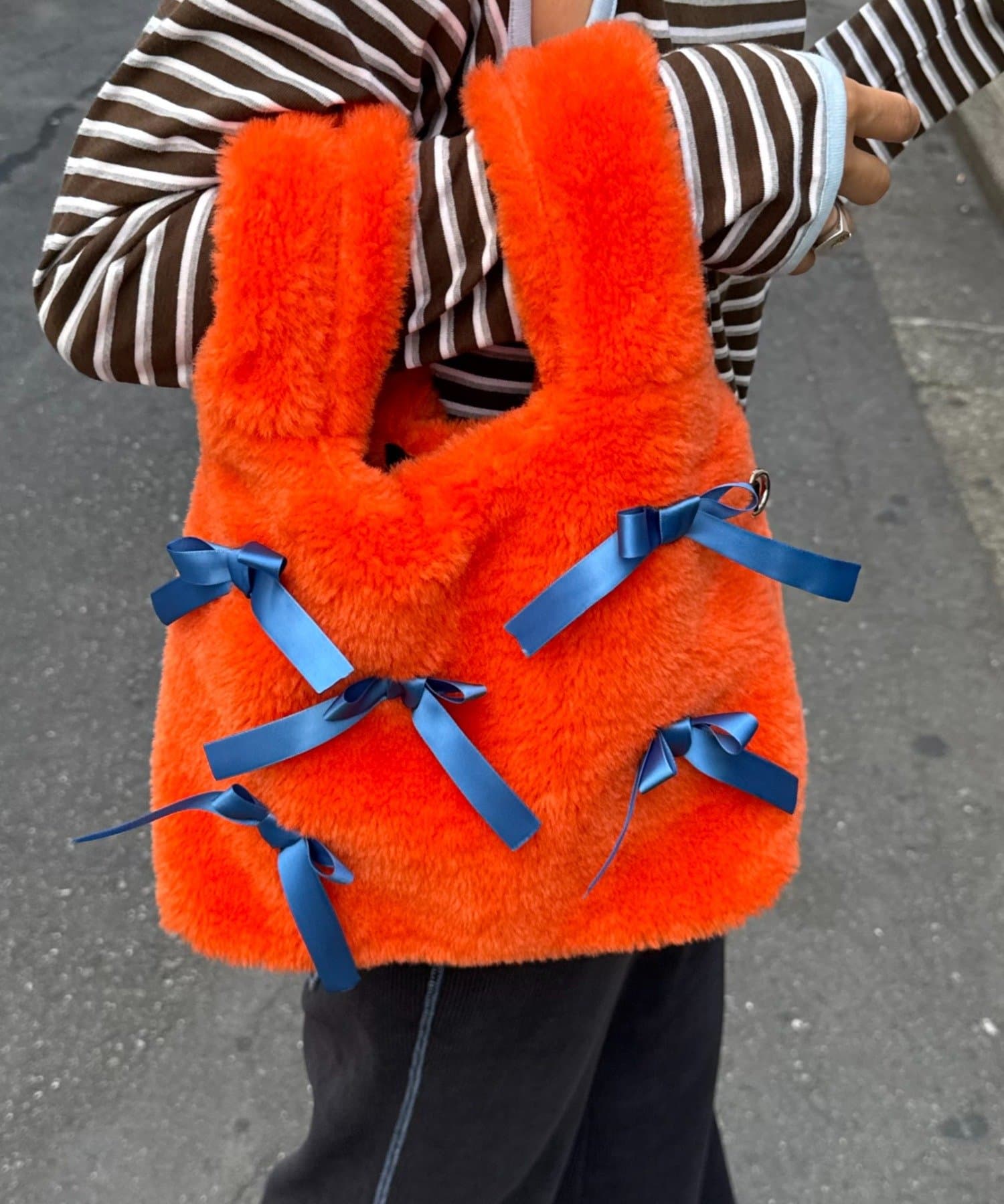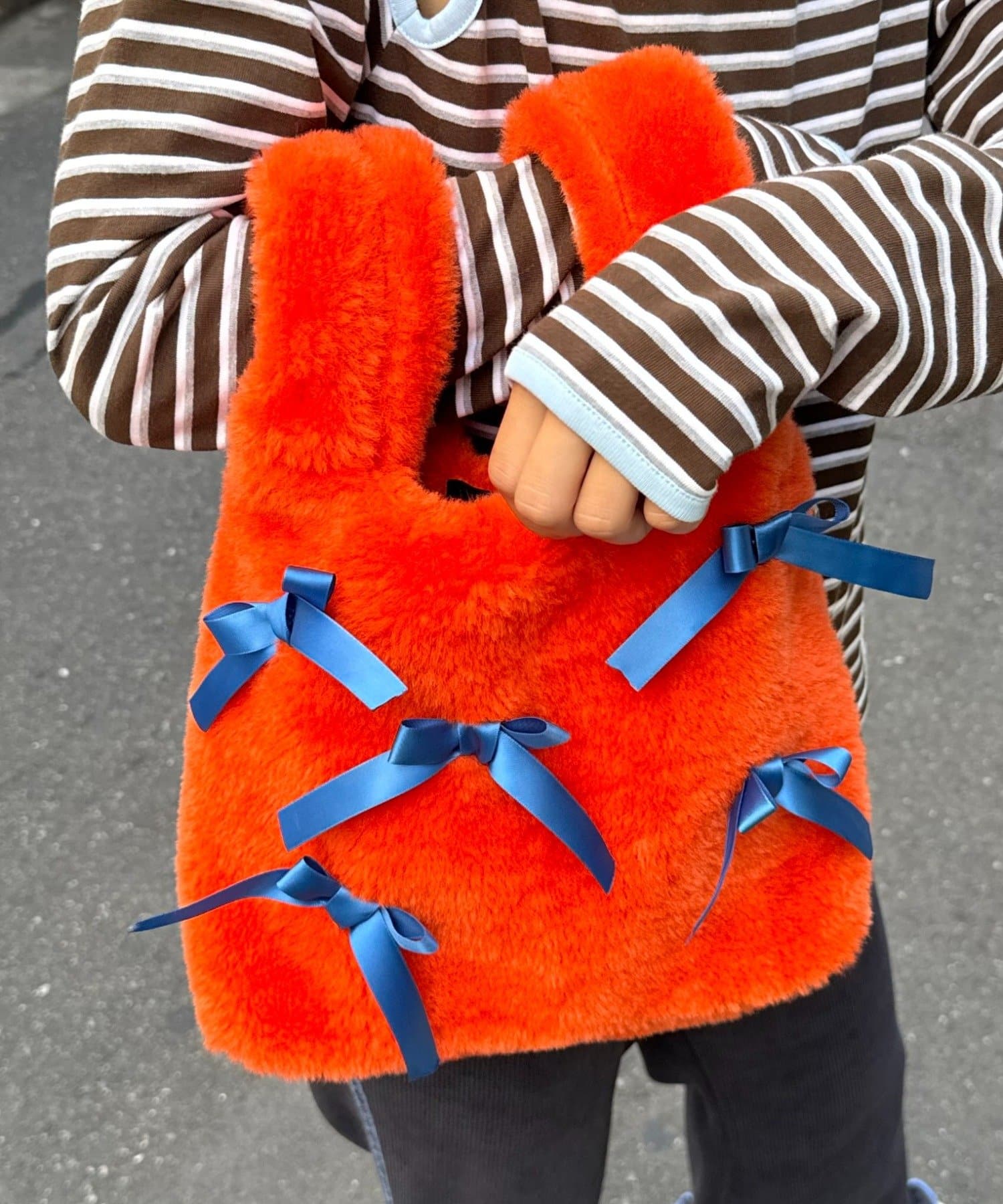 ふんわりフォルムに並べたバイカラーのリボンがキャッチーで可愛い!遊び心満点のファーバッグ。