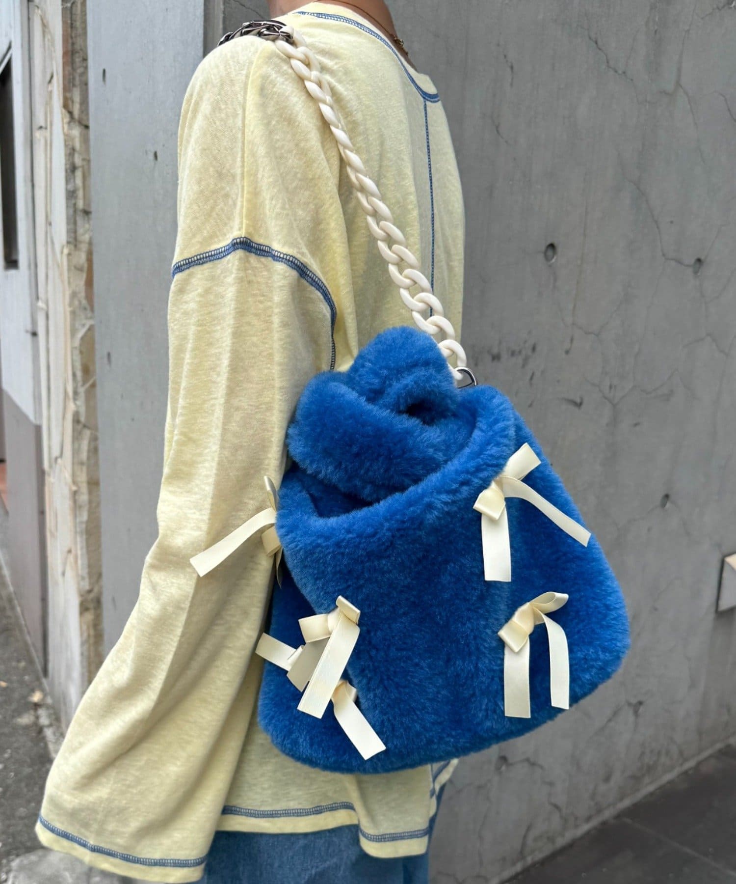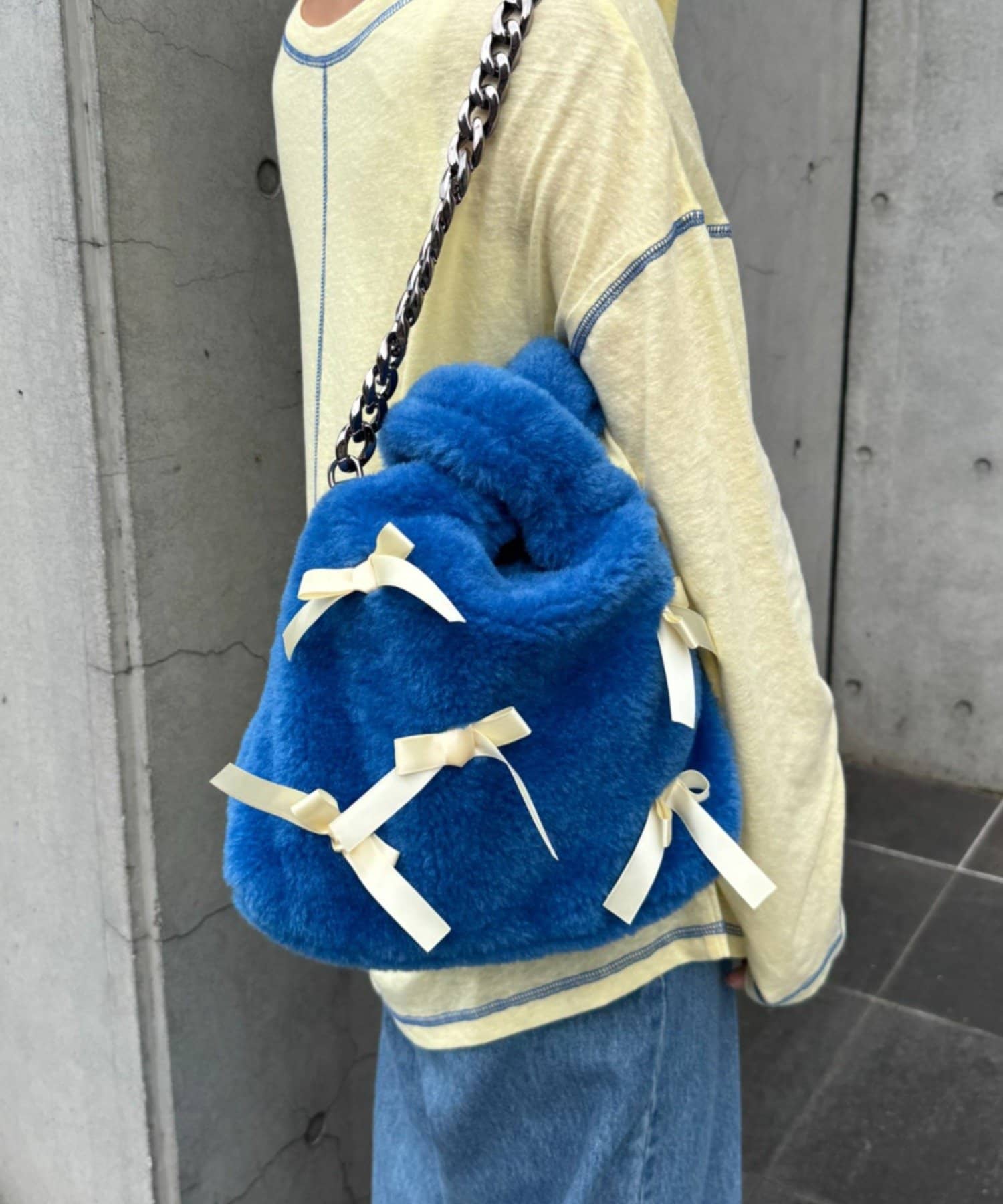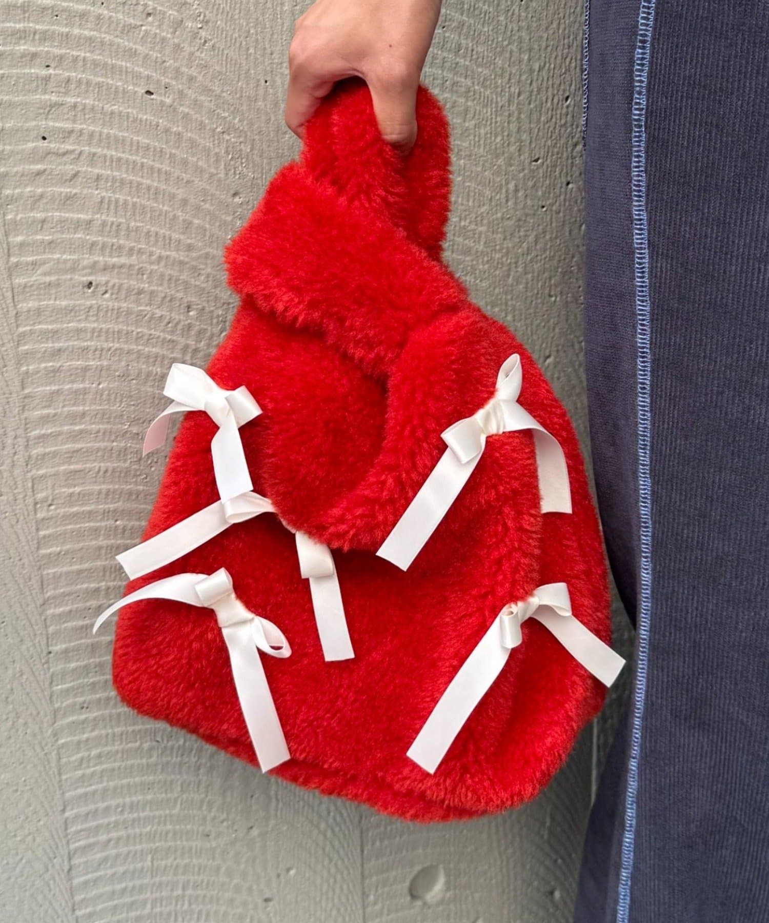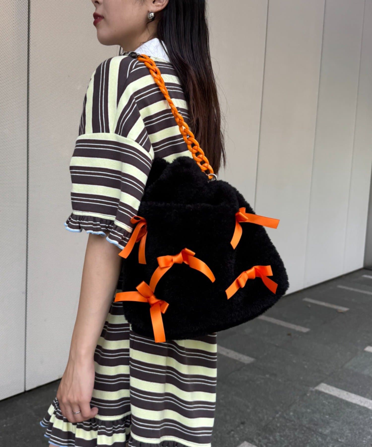 ふんわりフォルムに並べたバイカラーのリボンがキャッチーで可愛い!遊び心満点のファーバッグ。