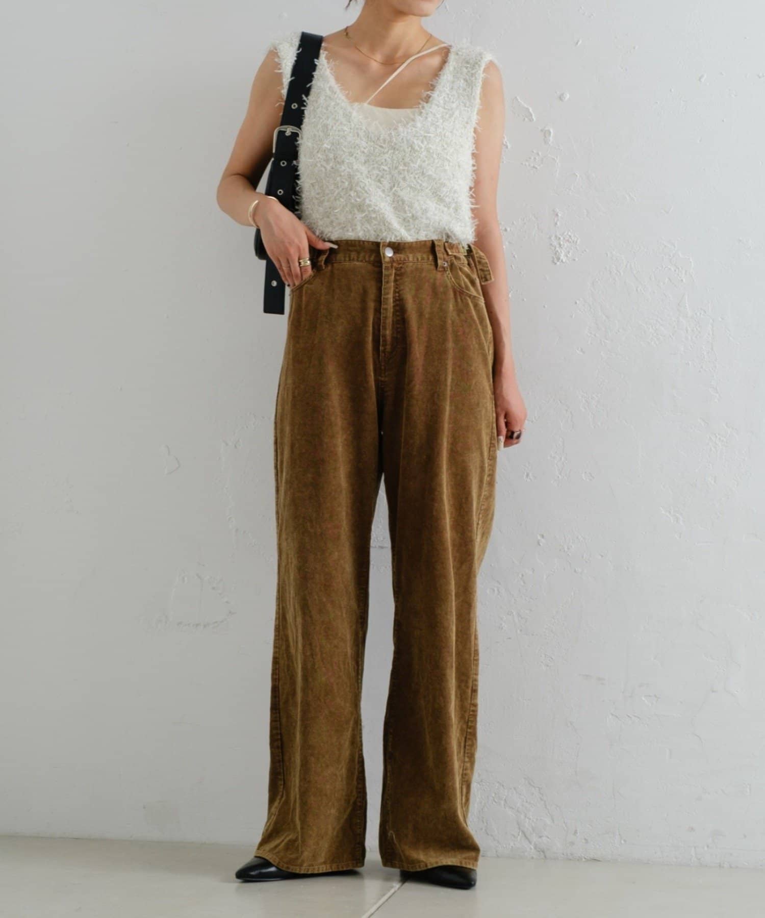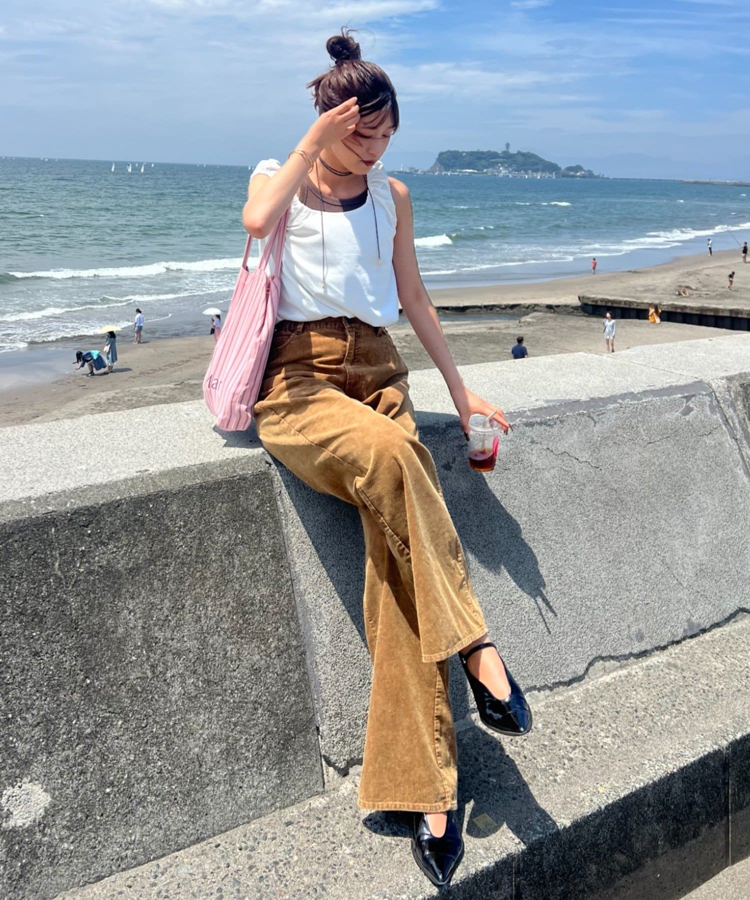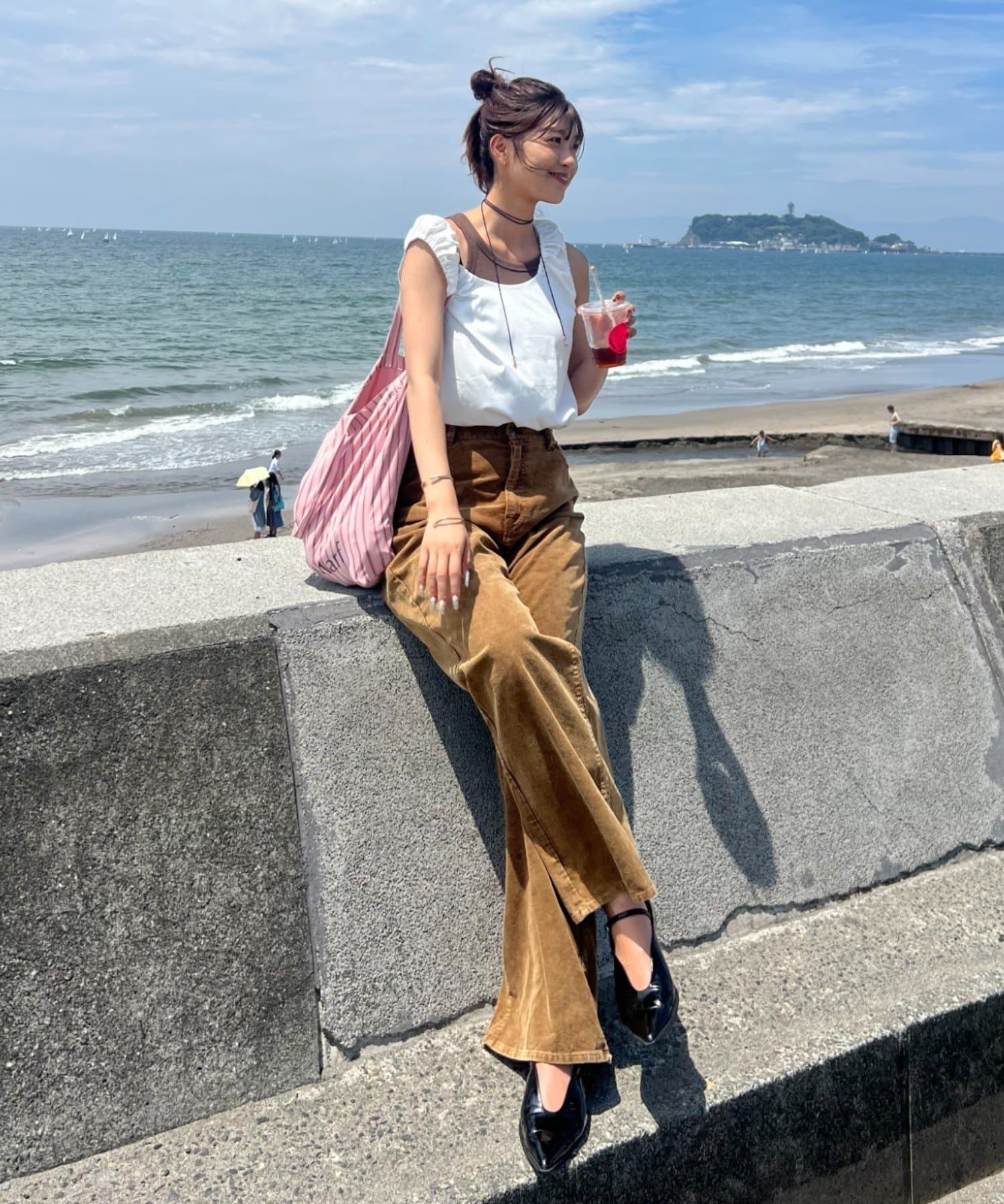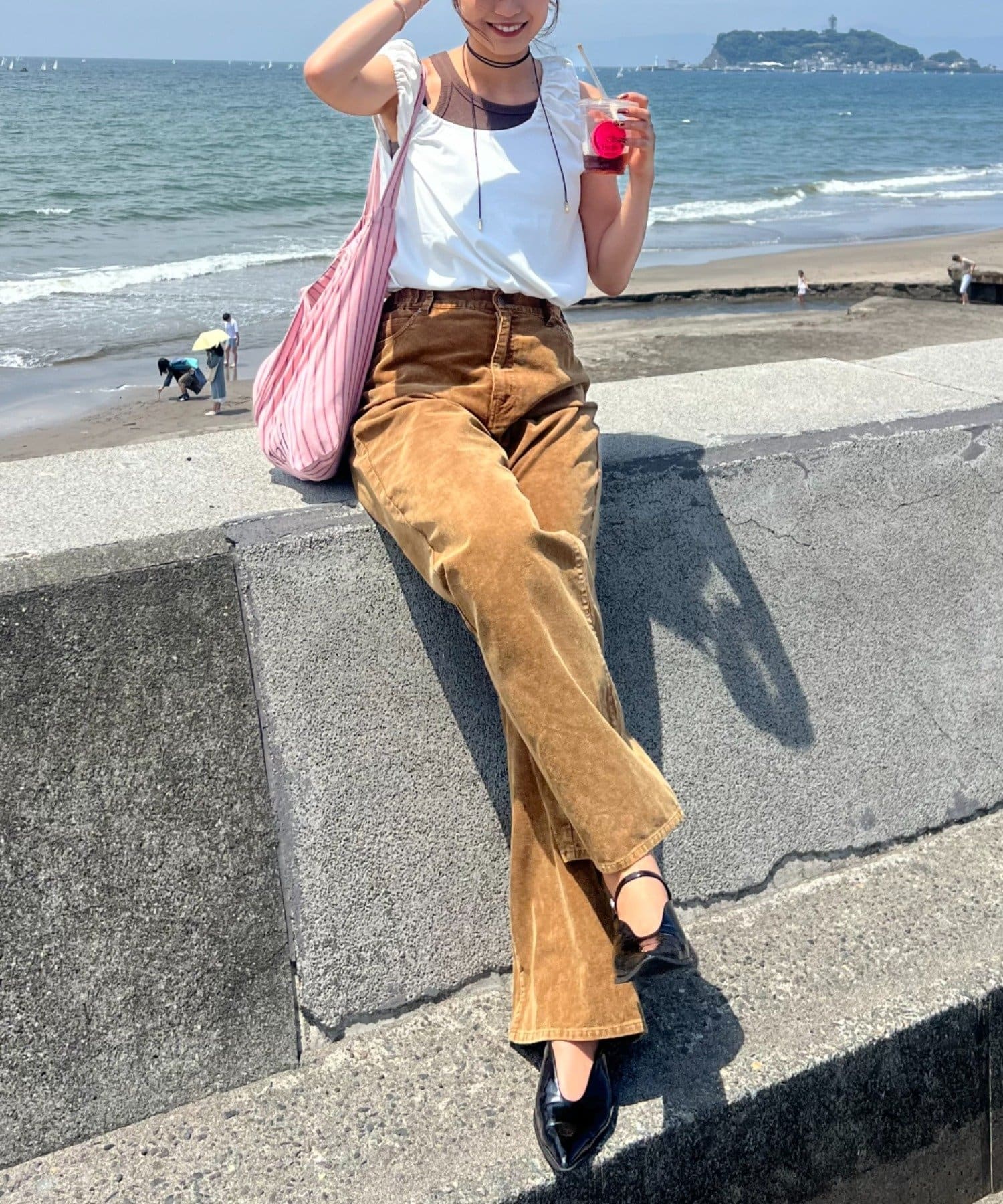 シアートップスやリブカーディガンなどと合わせて女性らしいコーディネートに。