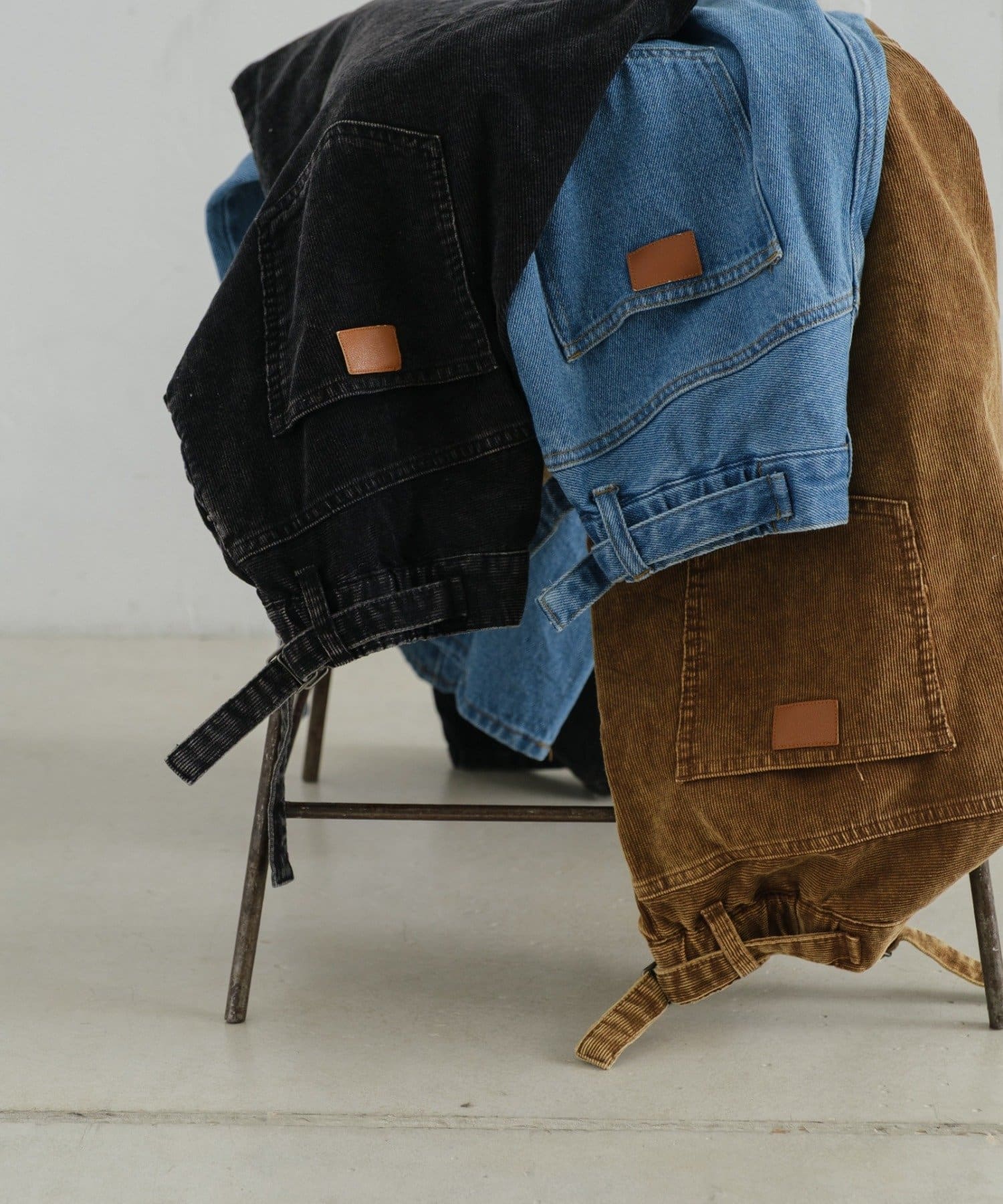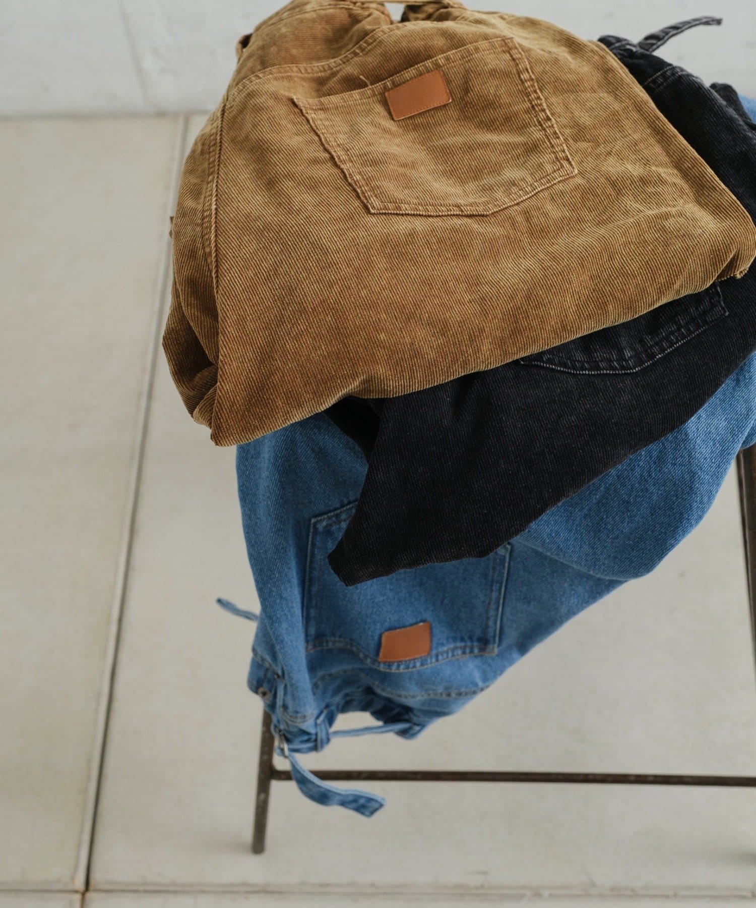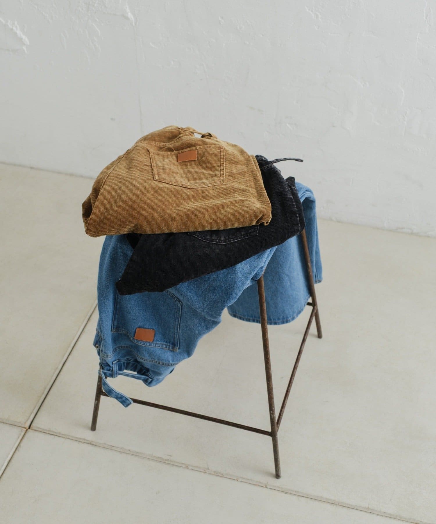 コーデュロイ素材のブラック、キャメルとデニム素材のインディゴブルーの3色展開。
