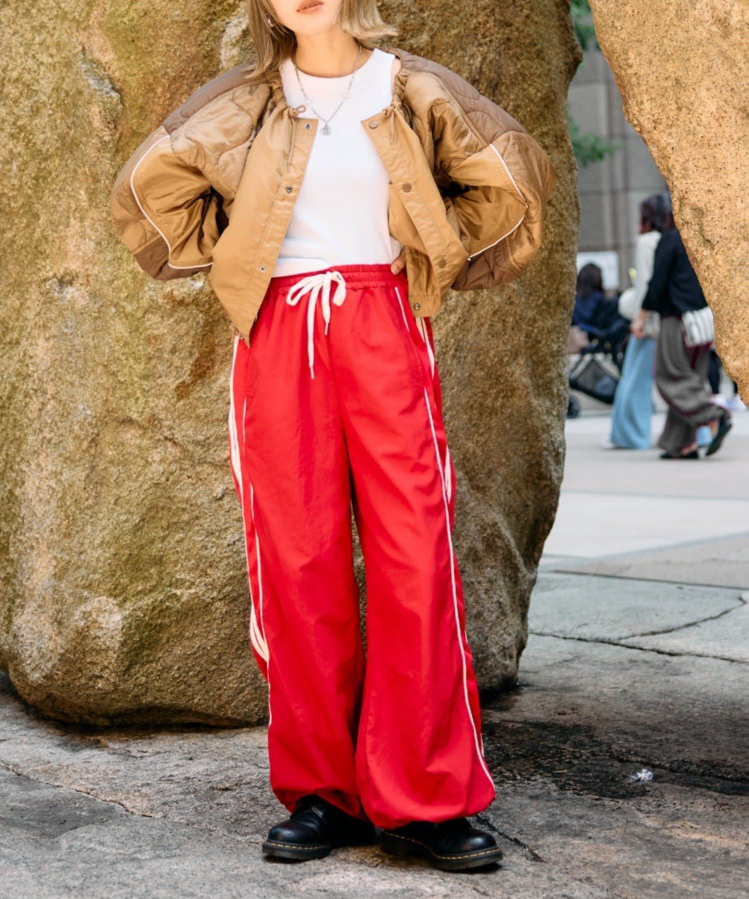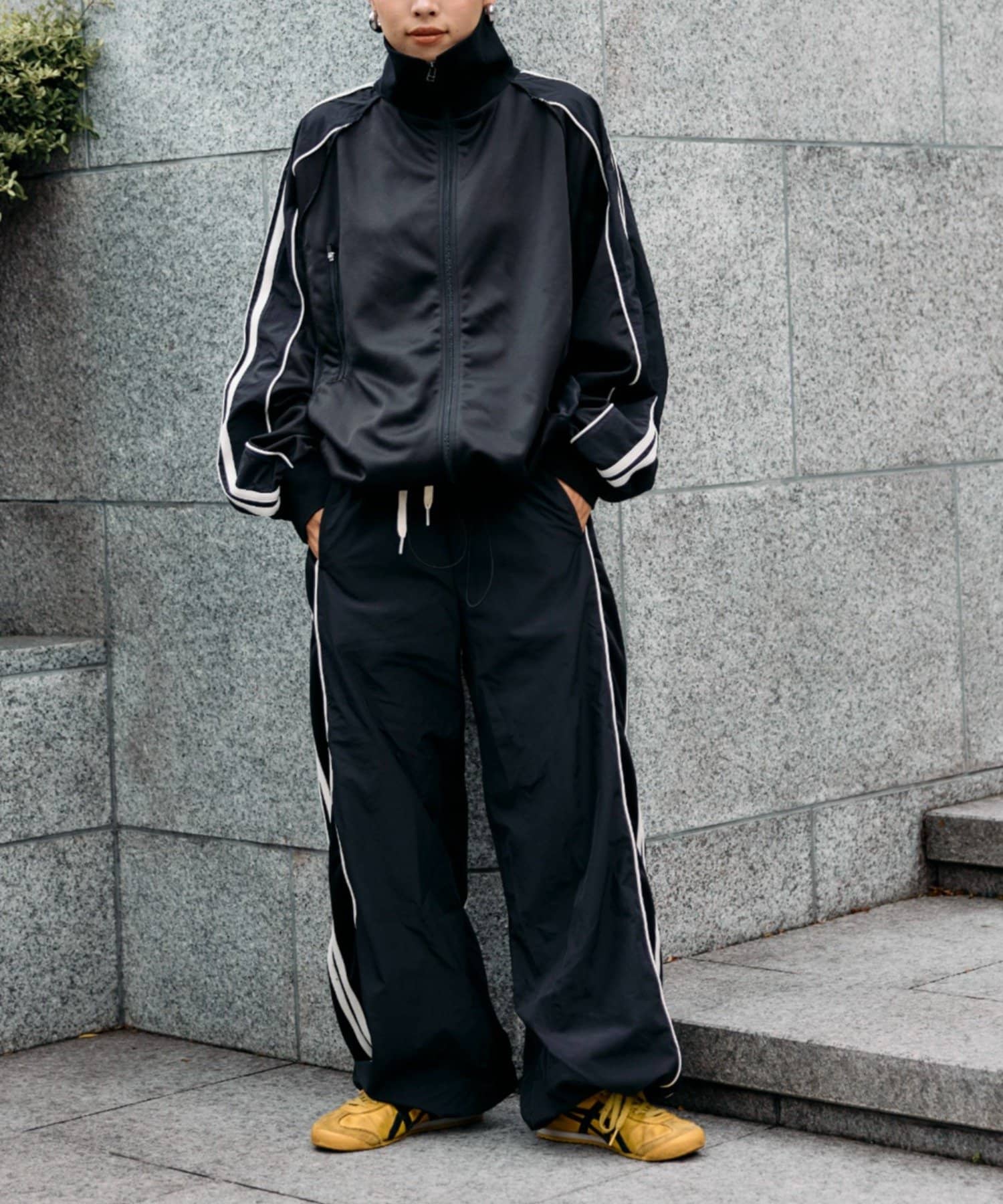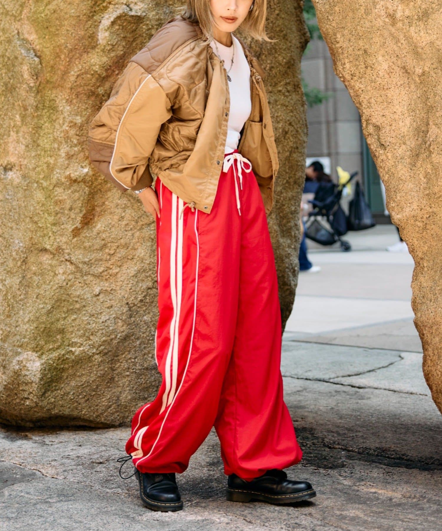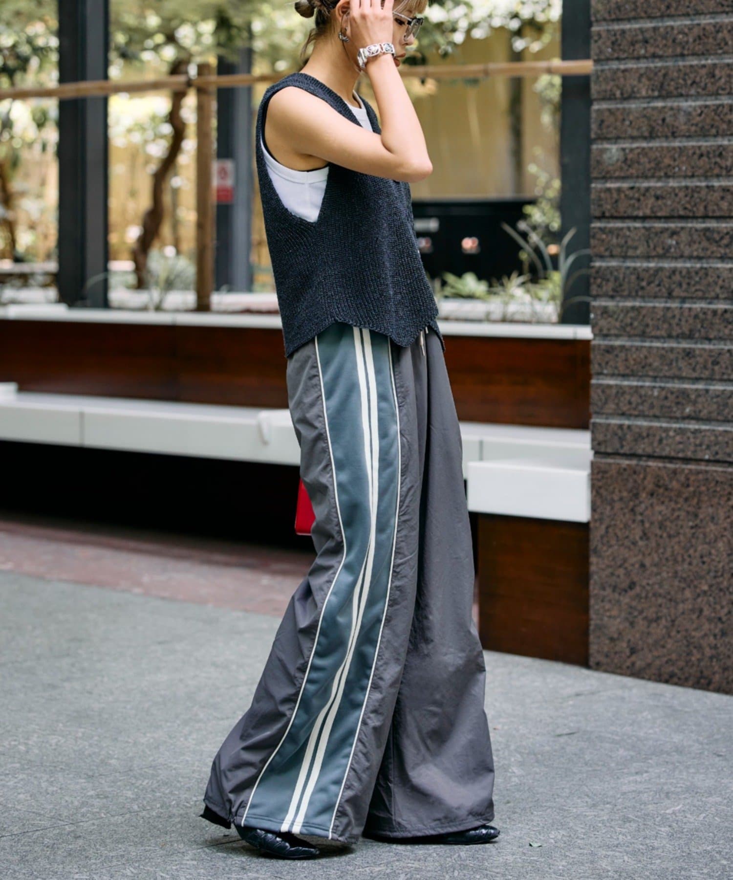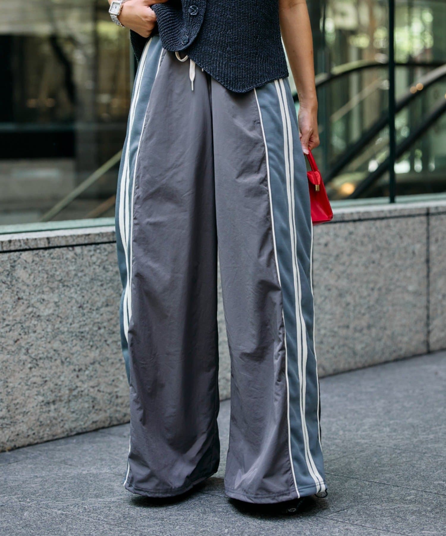 一見スポーティーな印象のサイドラインパンツですが、ワイドなシルエットと落ち着いたカラーリングで、大人の女性に似合う洗練された雰囲気に仕上がっています。