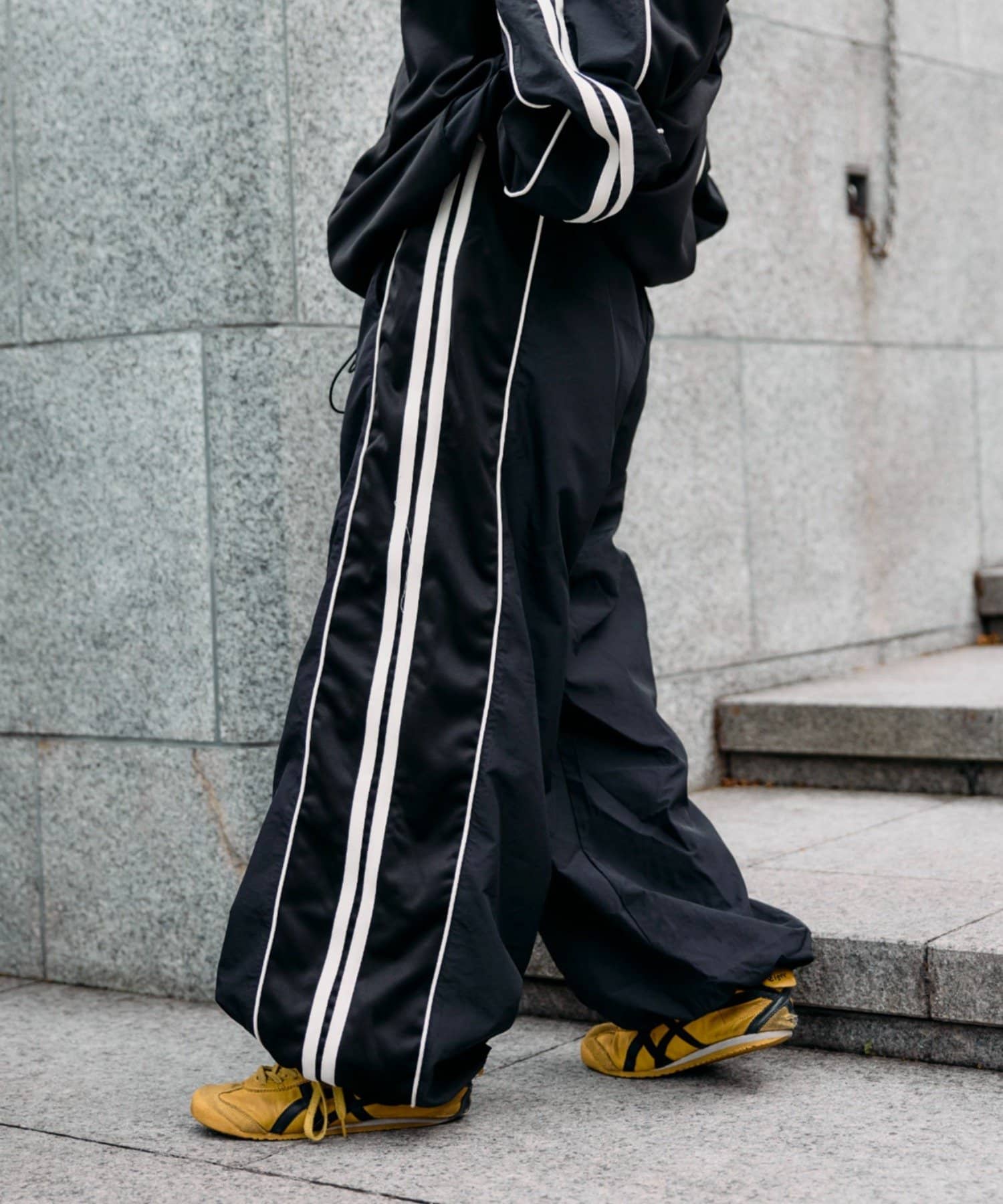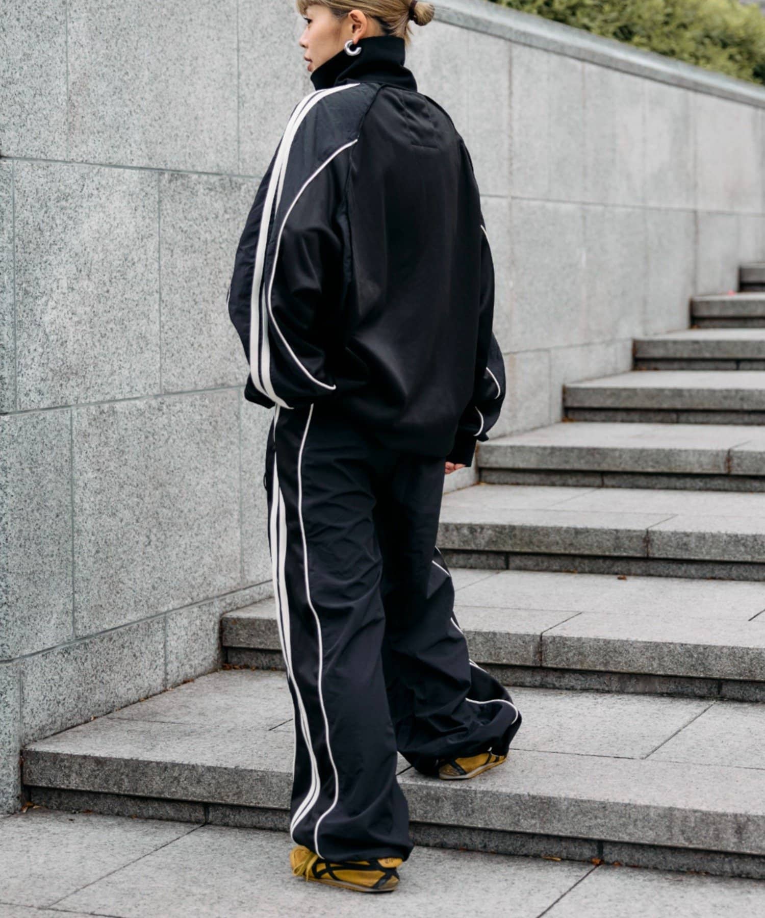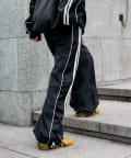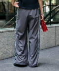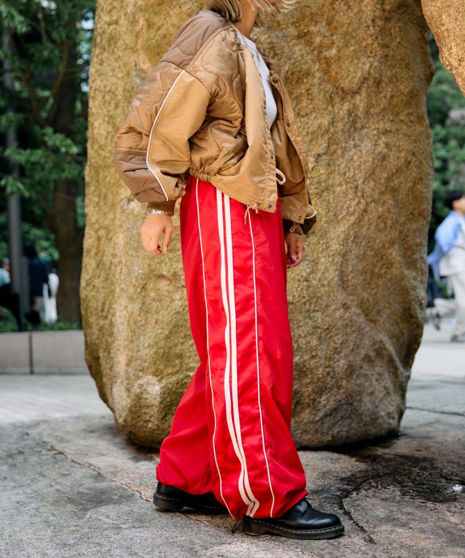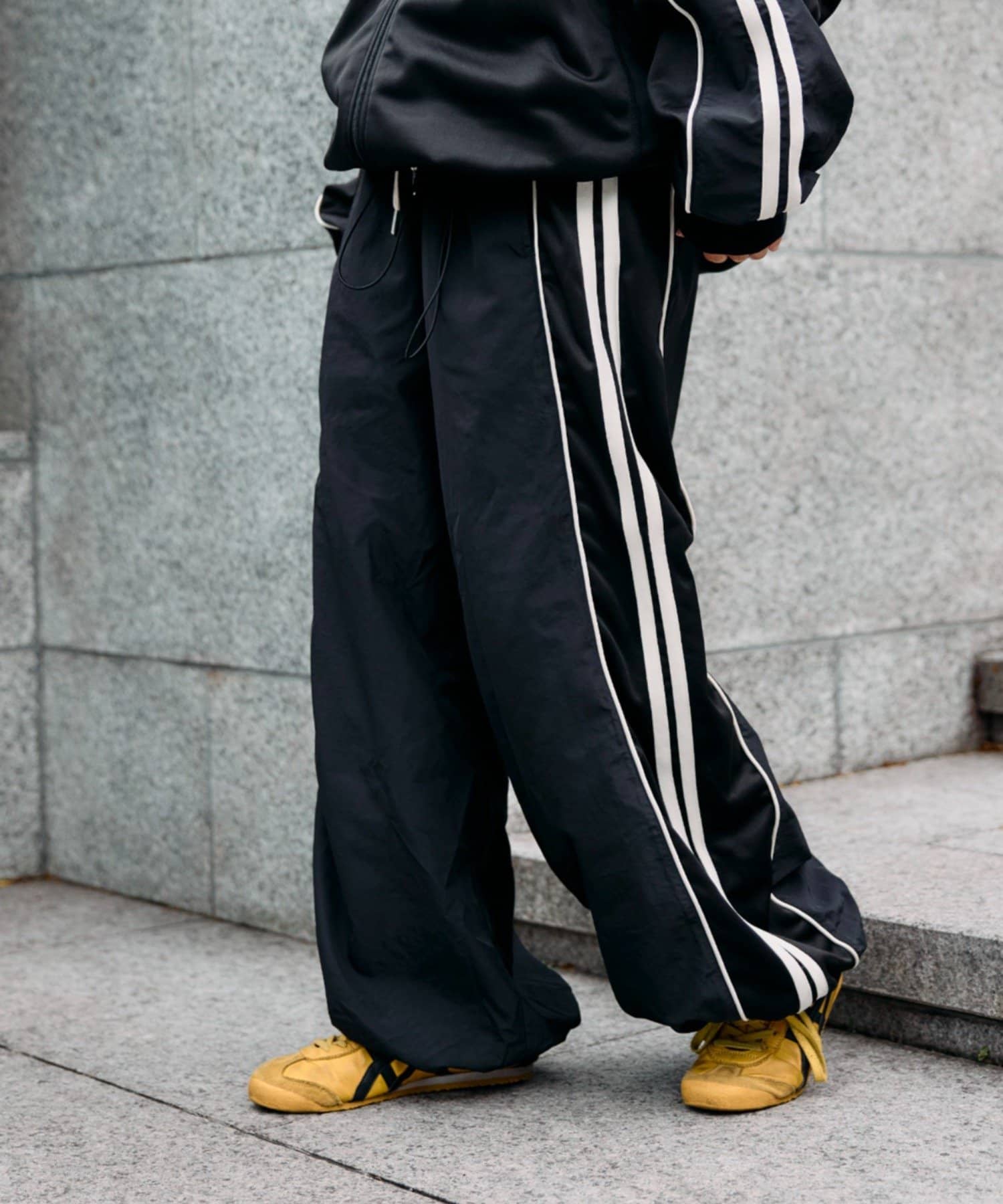一見スポーティーな印象のサイドラインパンツですが、ワイドなシルエットと落ち着いたカラーリングで、大人の女性に似合う洗練された雰囲気に仕上がっています。