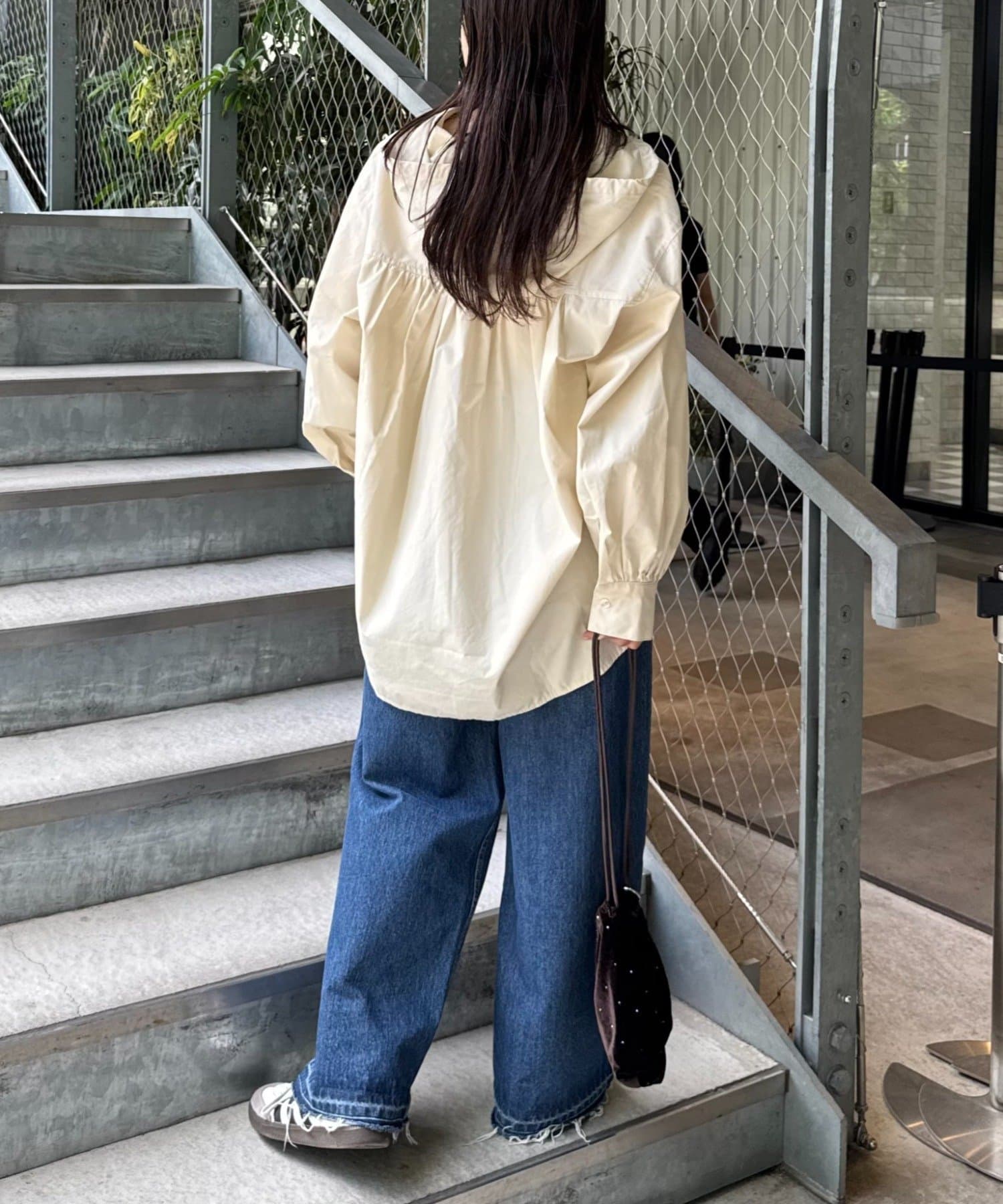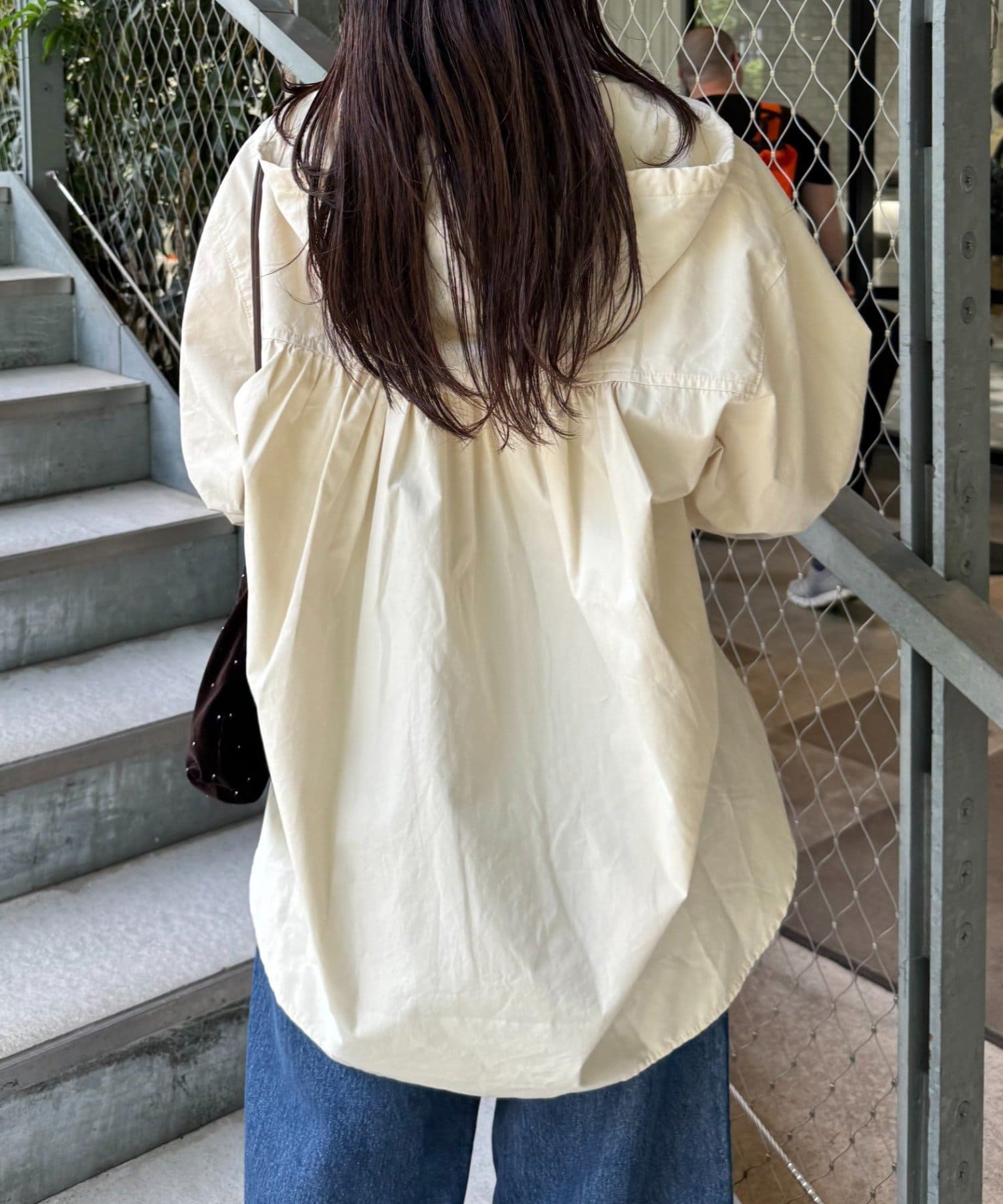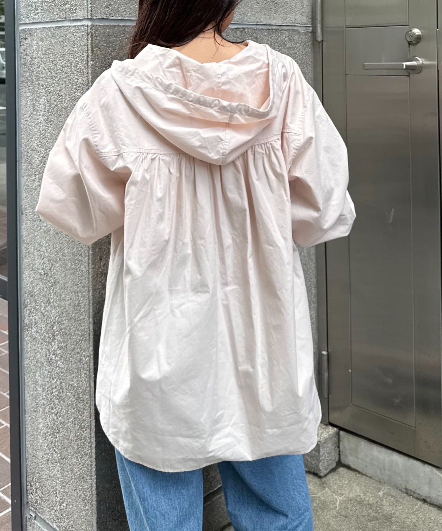 フード付きのデザインは、コーディネートに抜け感を演出し、こなれた印象を与えます。