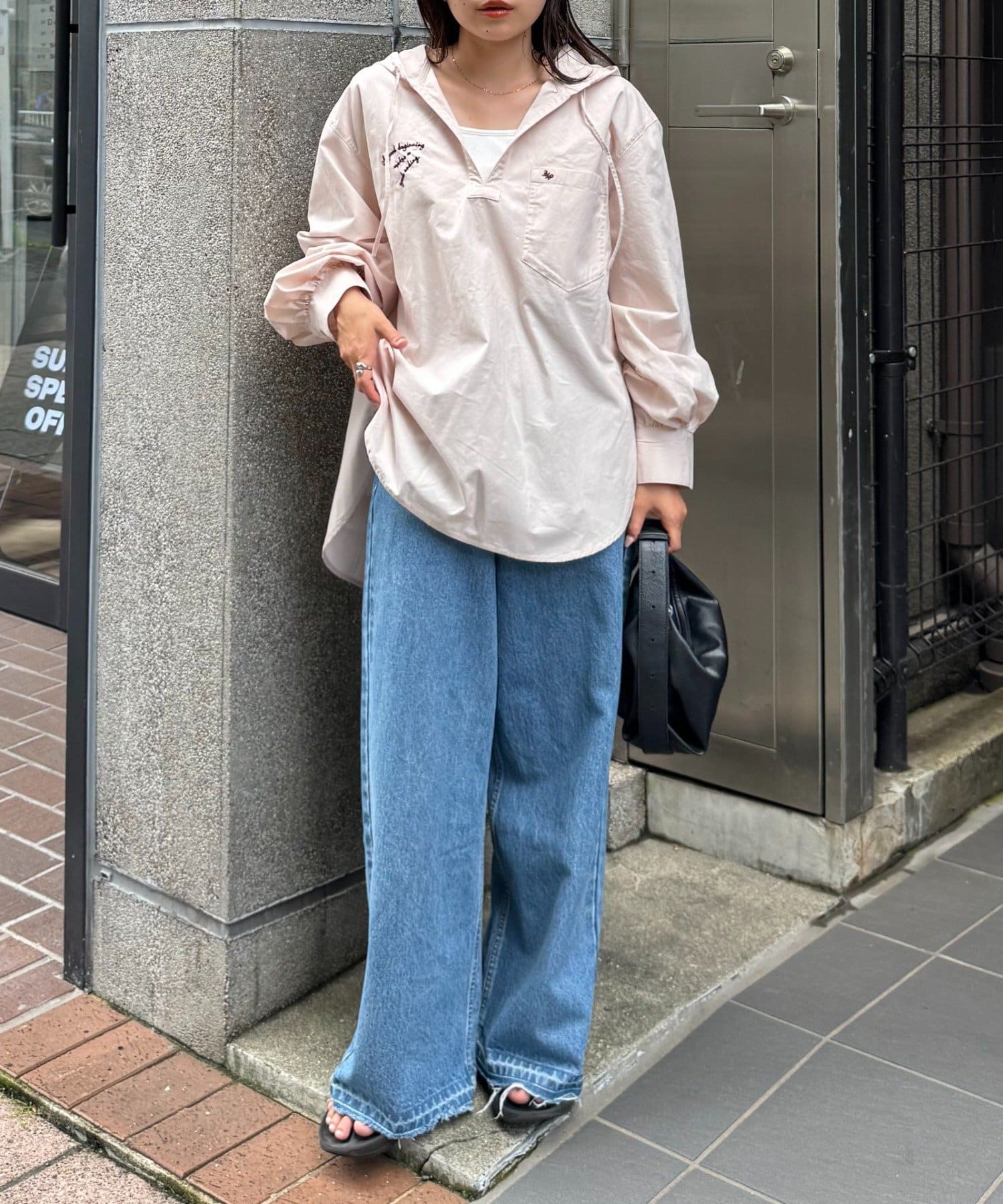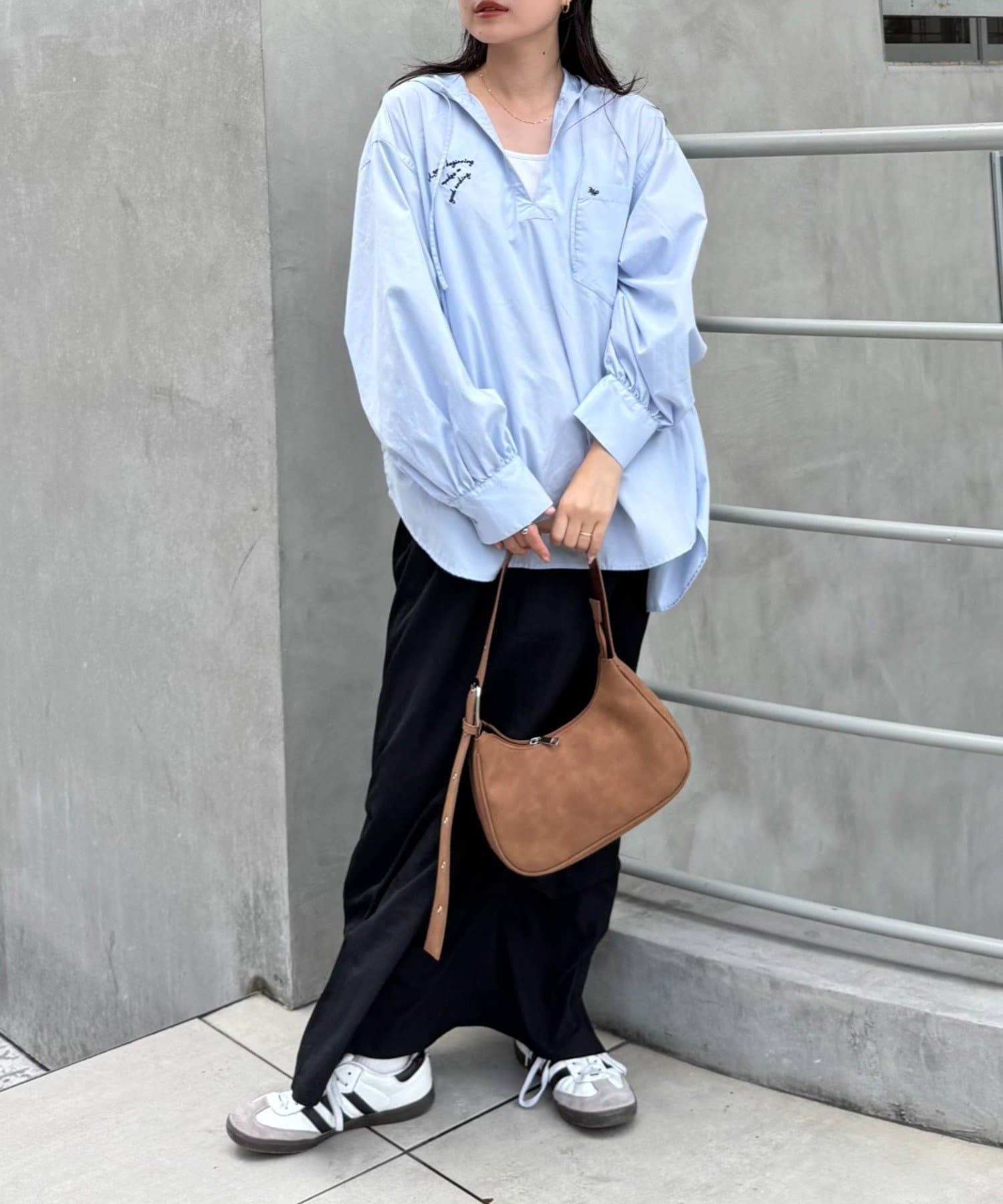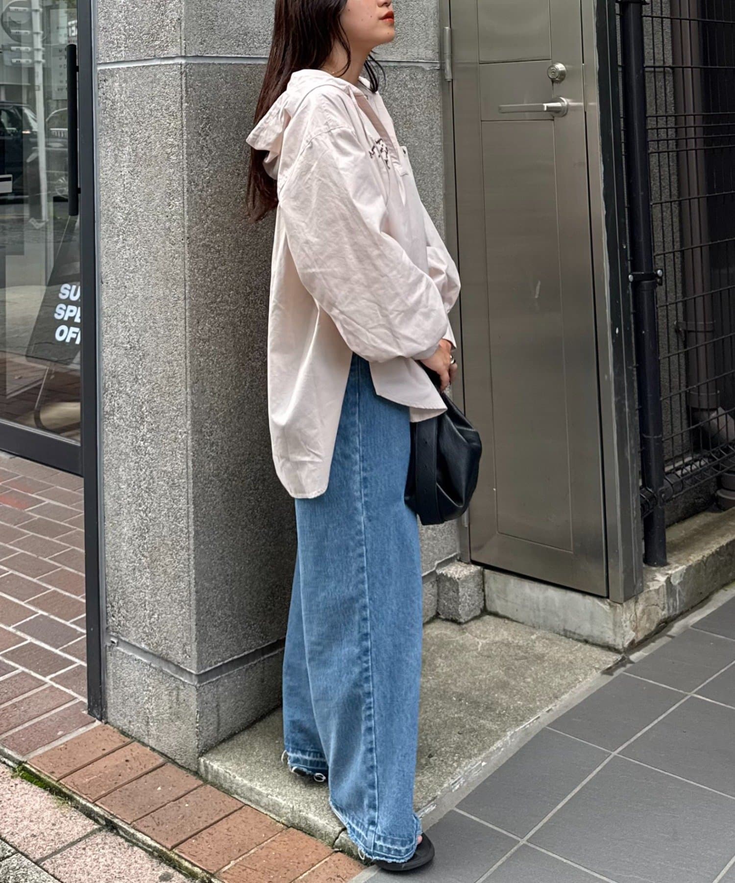 フード付きのデザインは、コーディネートに抜け感を演出し、こなれた印象を与えます。
