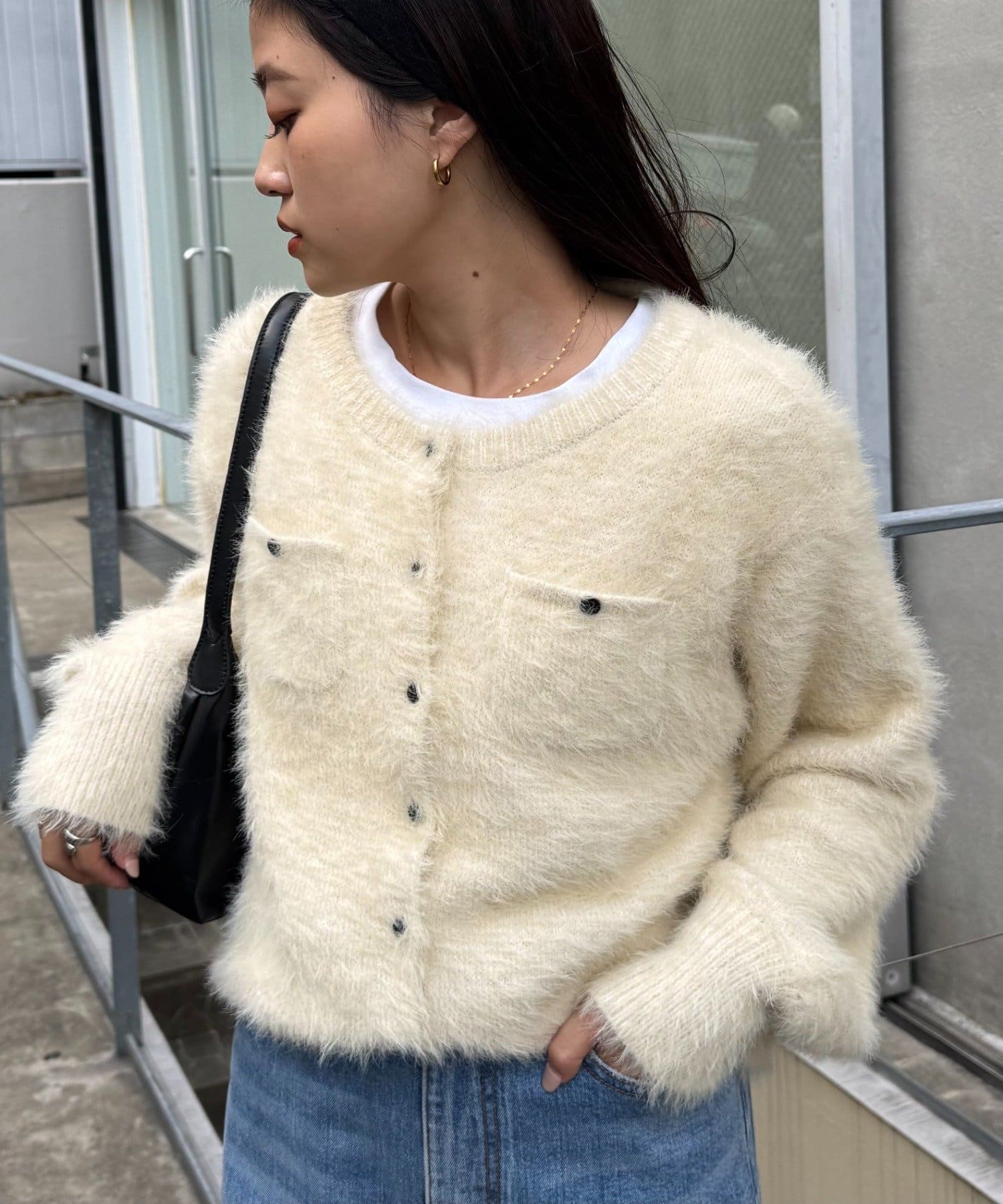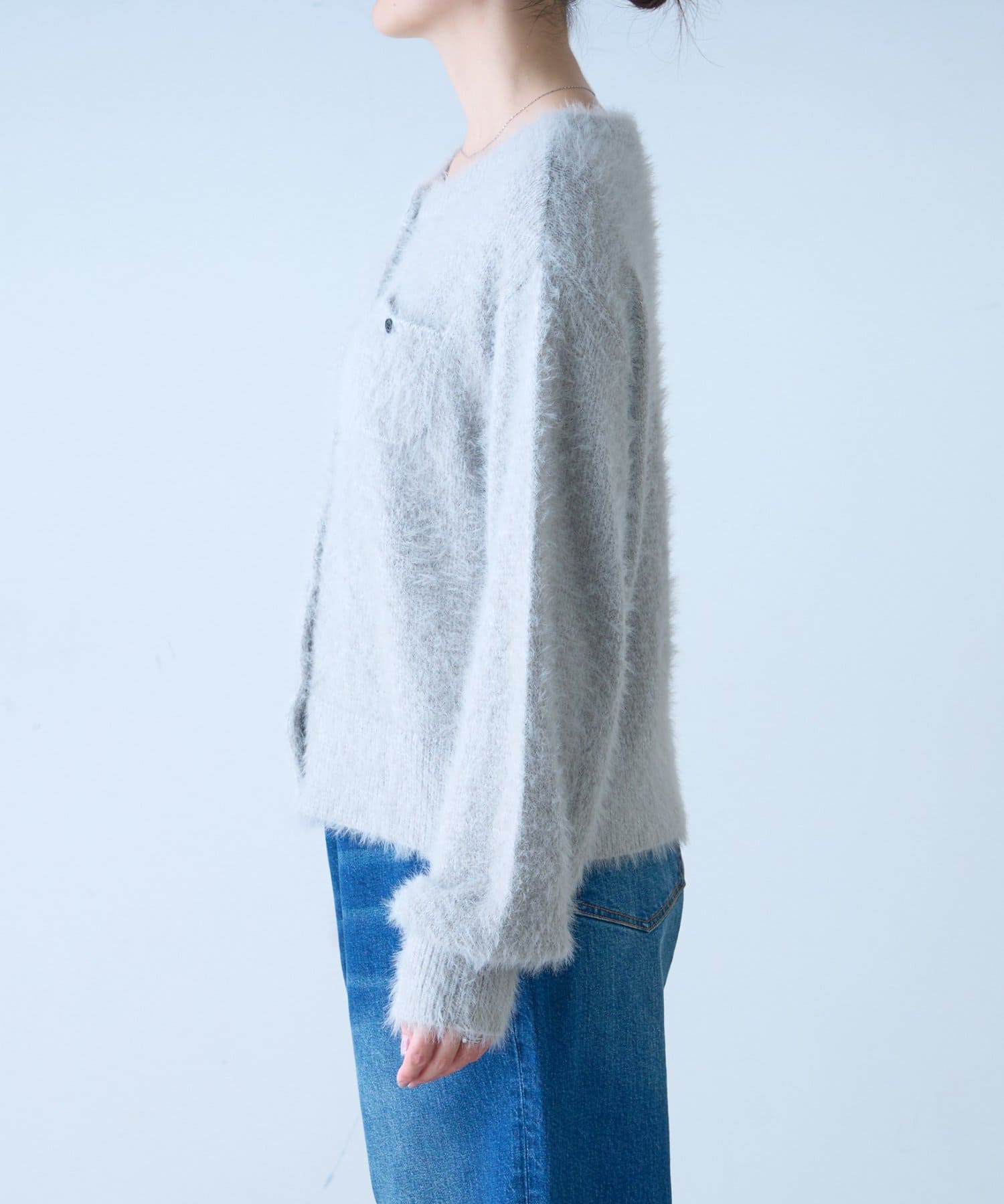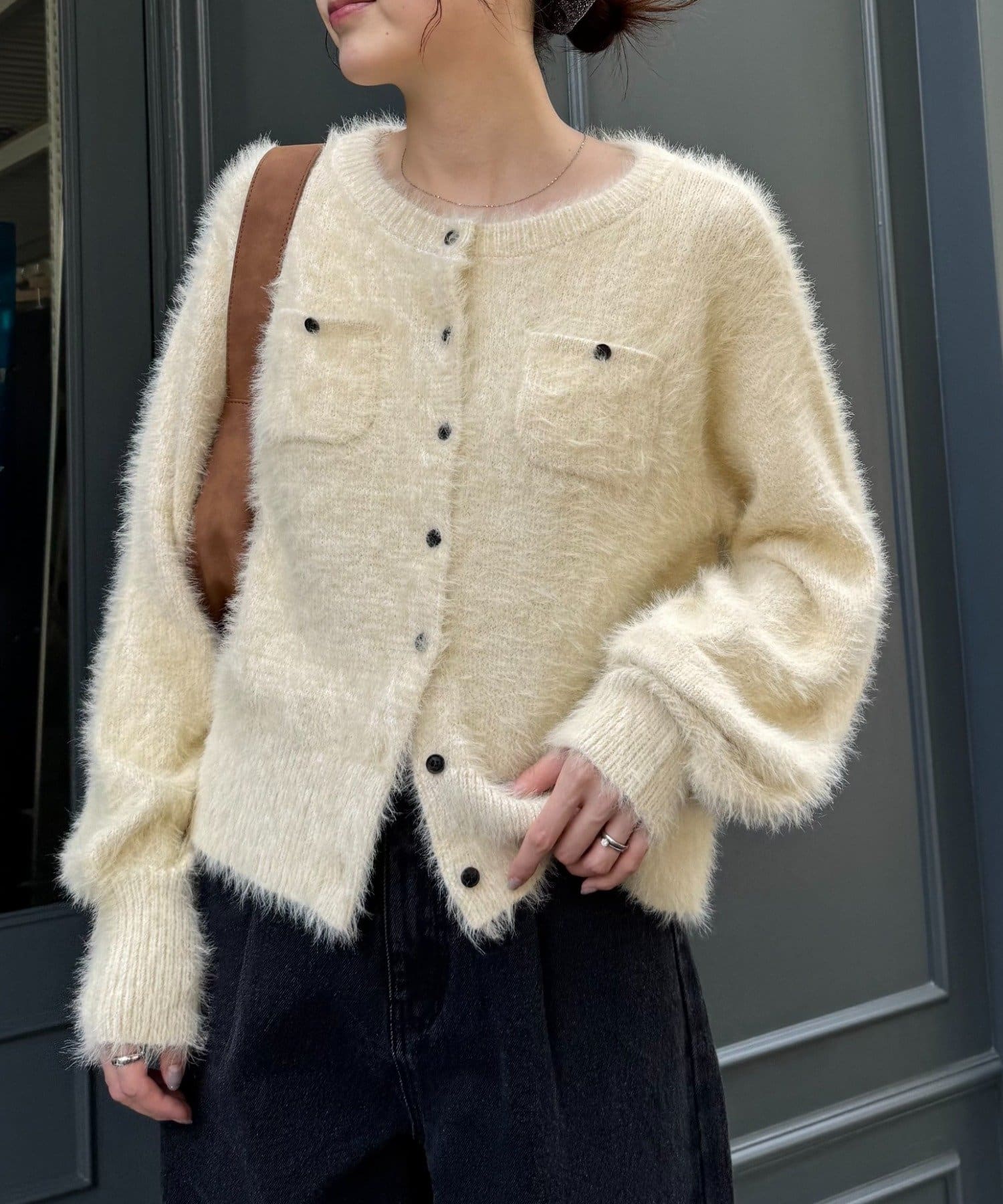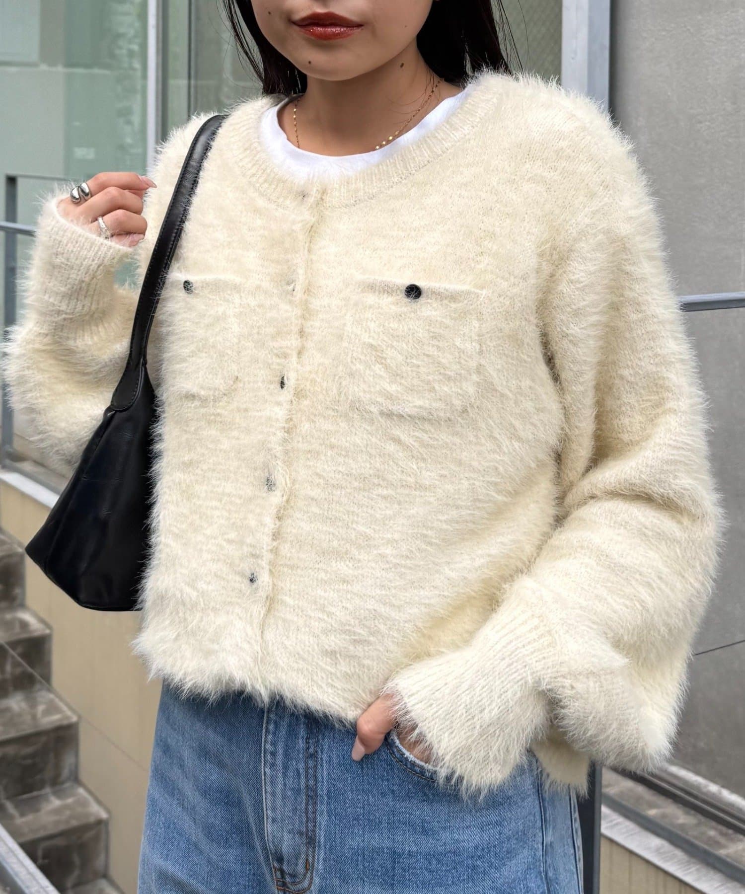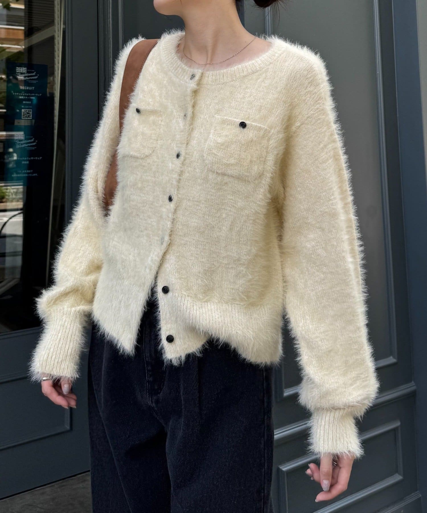 まるでカシミヤのような、ふわふわと柔らかな風合いが魅力のシャギーニットカーディガン。