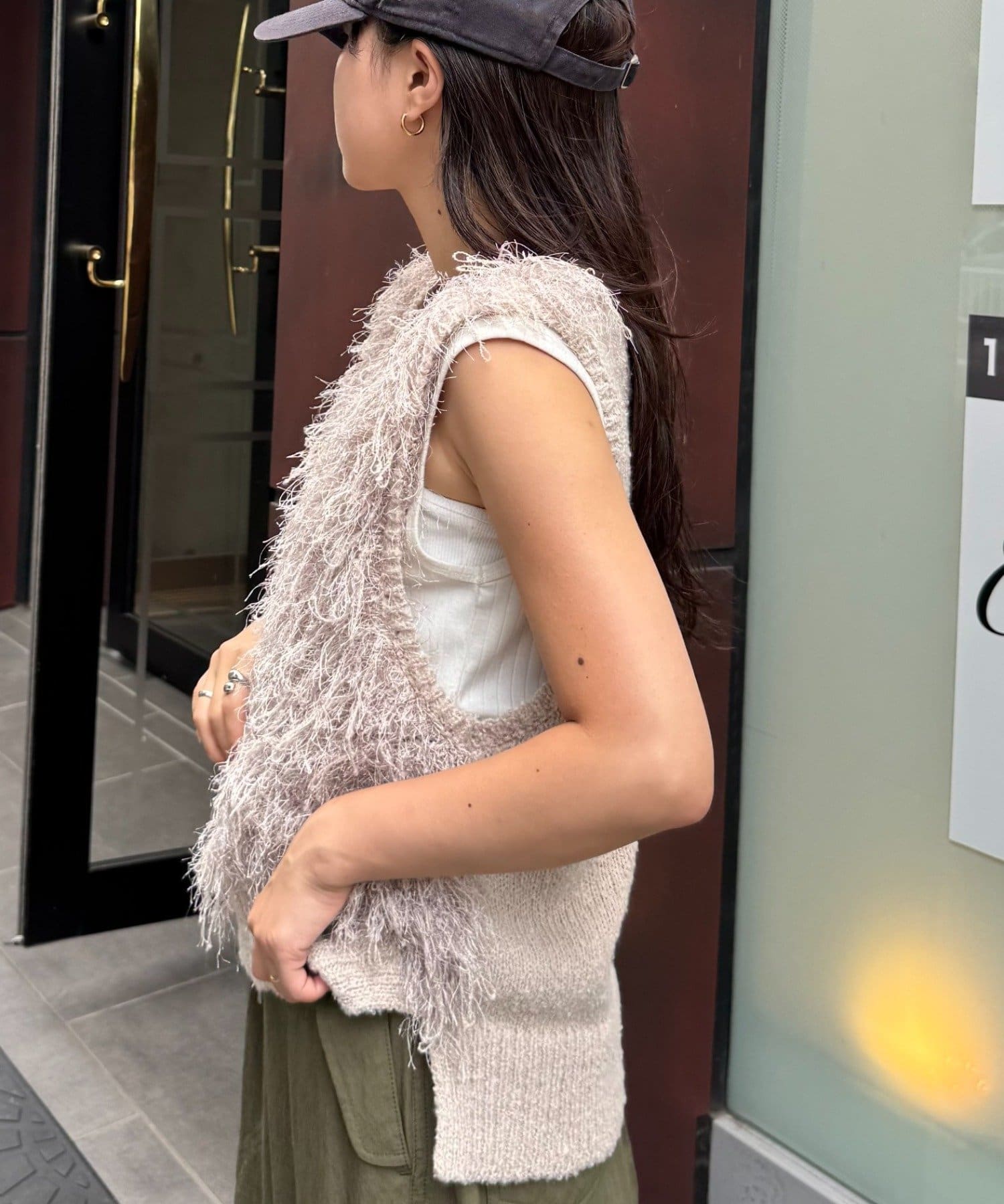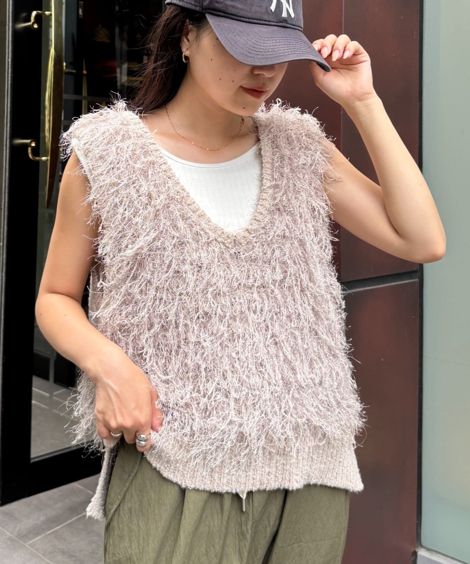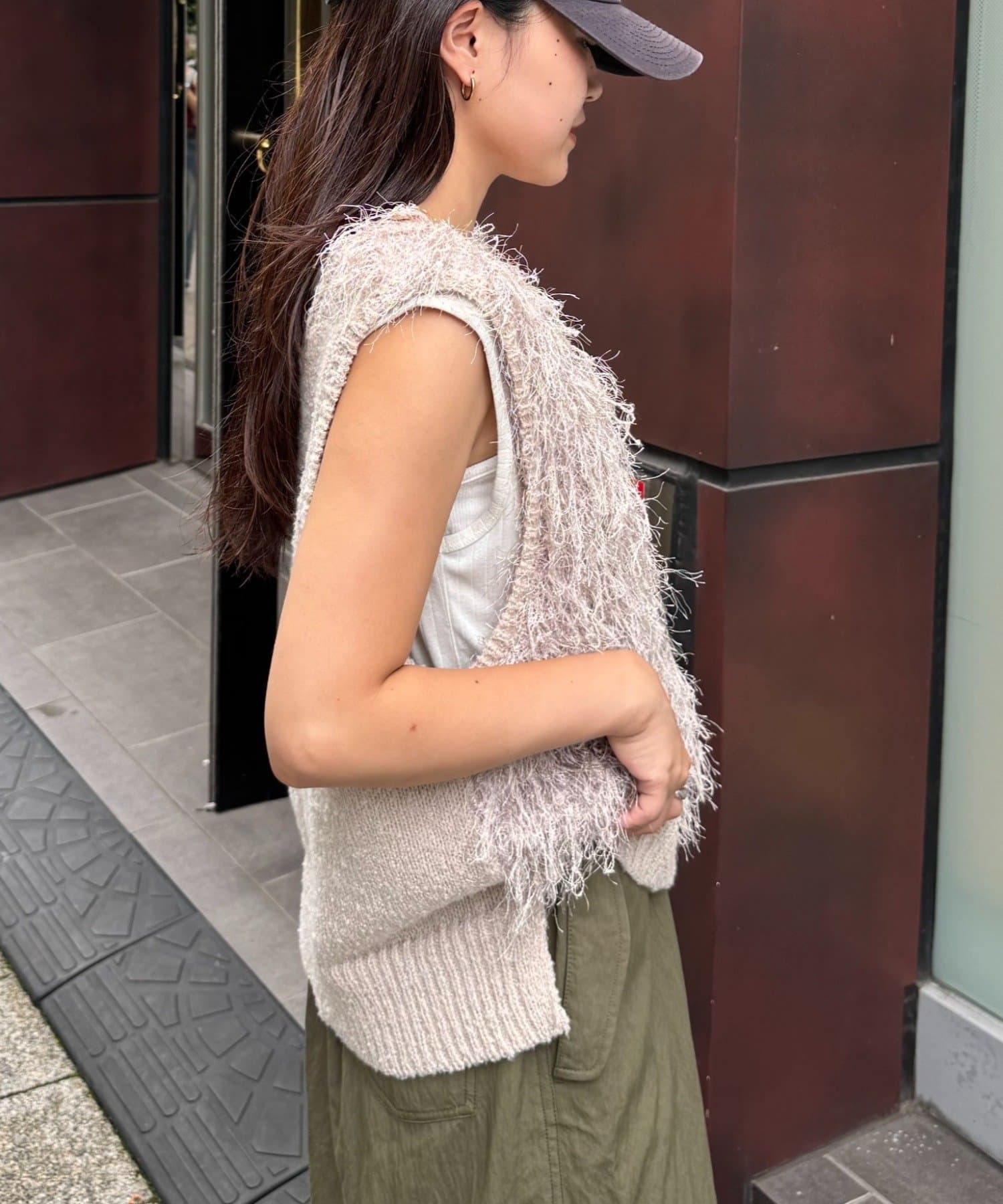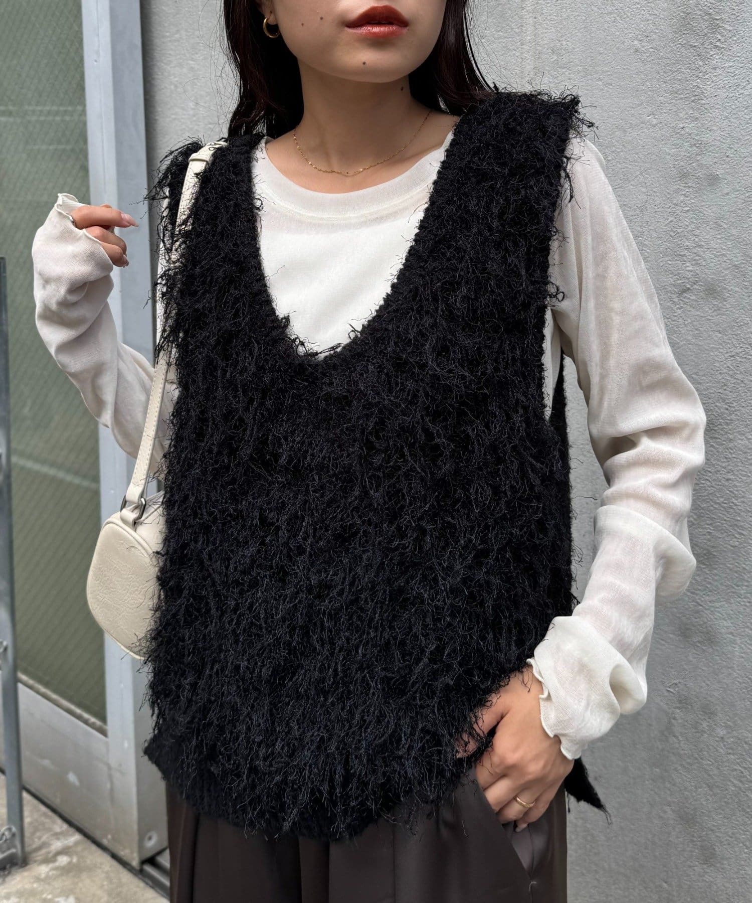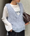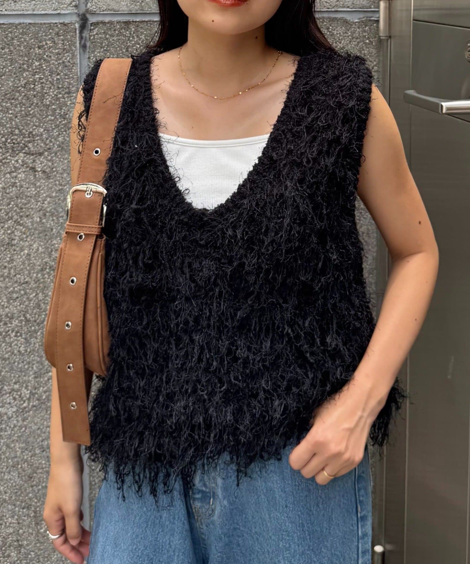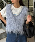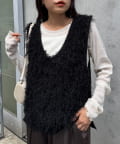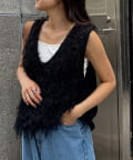 目を引くふわふわとした素材感が特徴的なフリンジベスト。