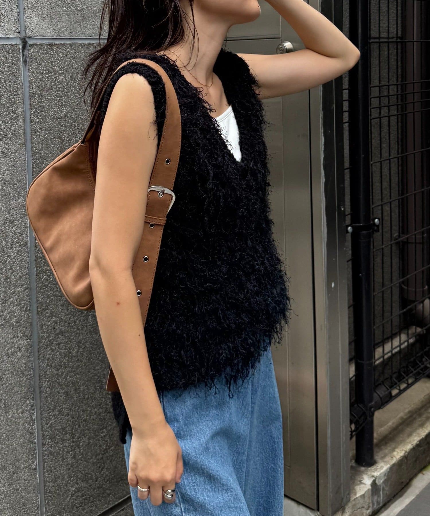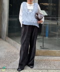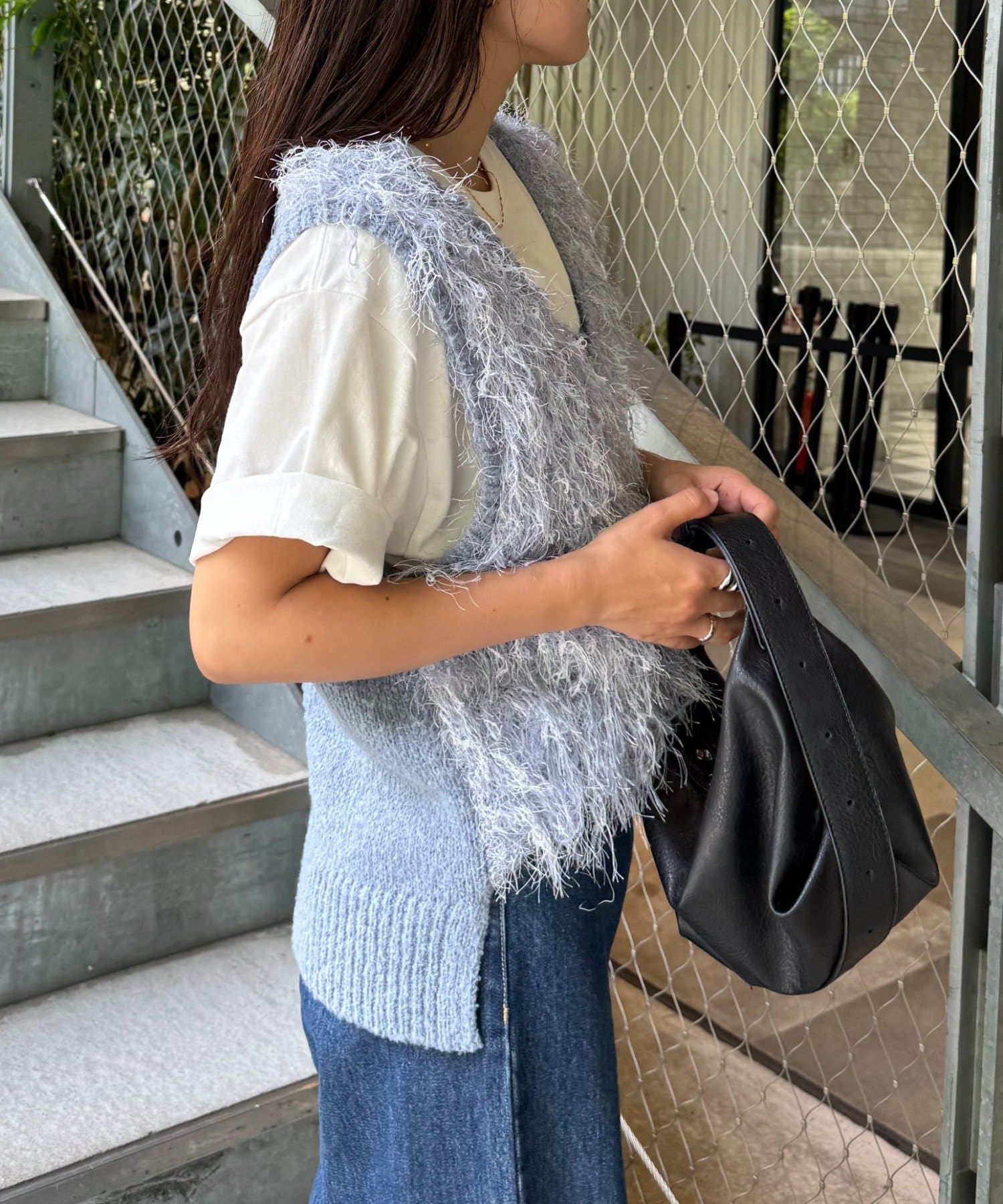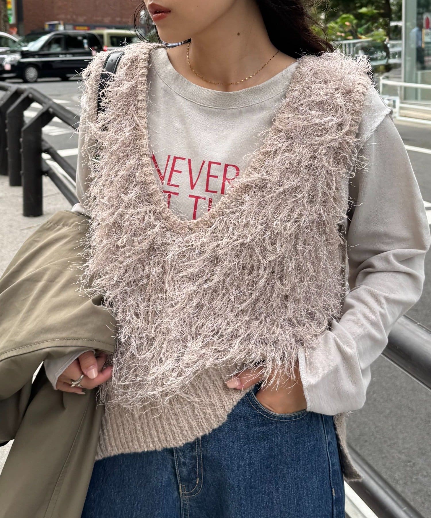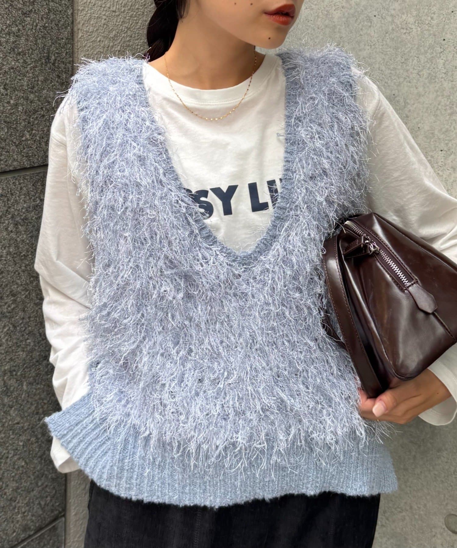 目を引くふわふわとした素材感が特徴的なフリンジベスト。