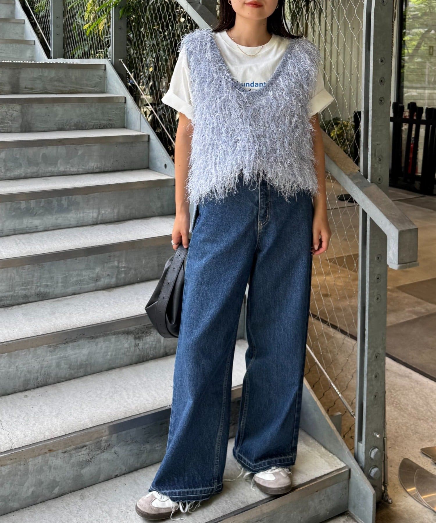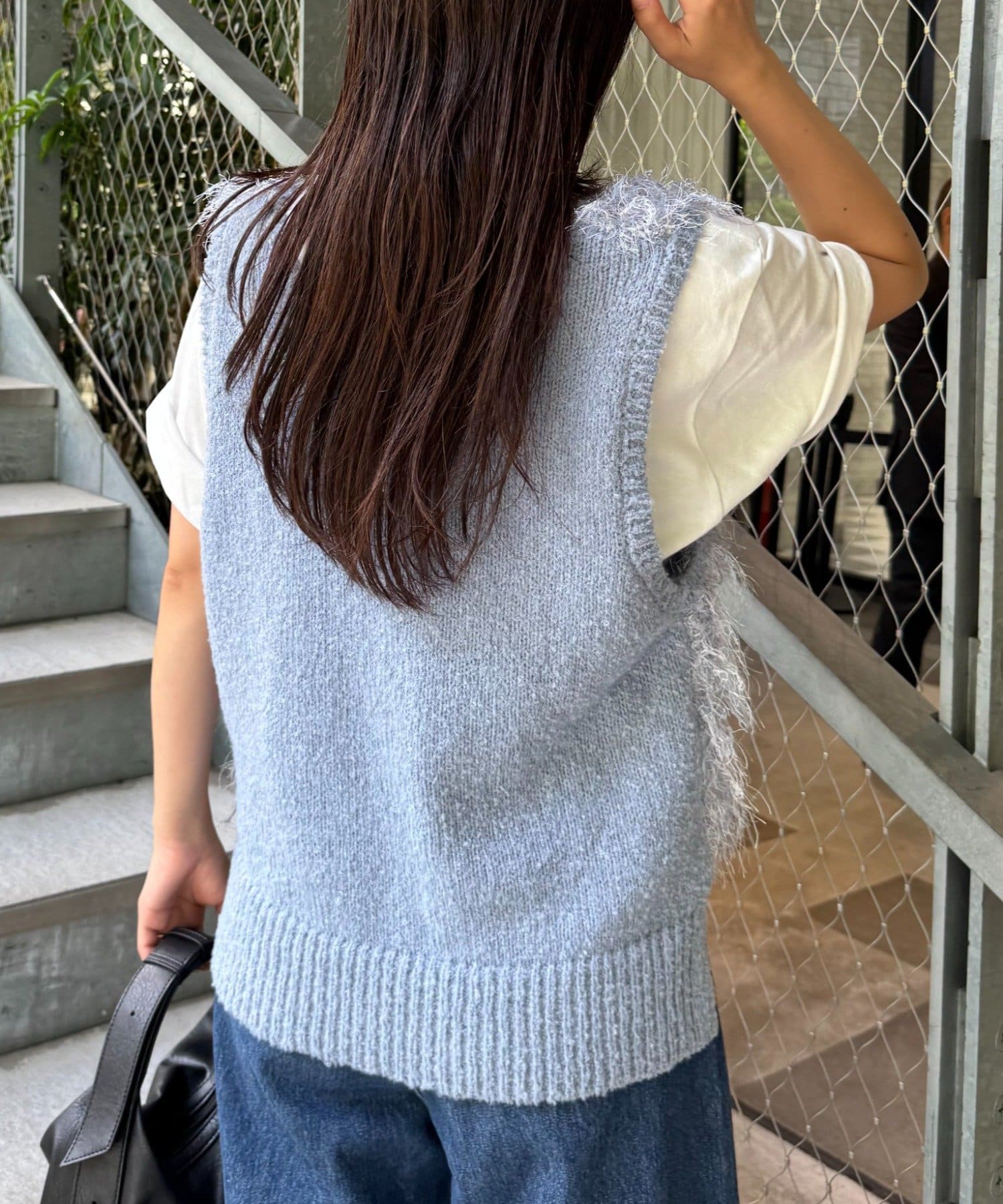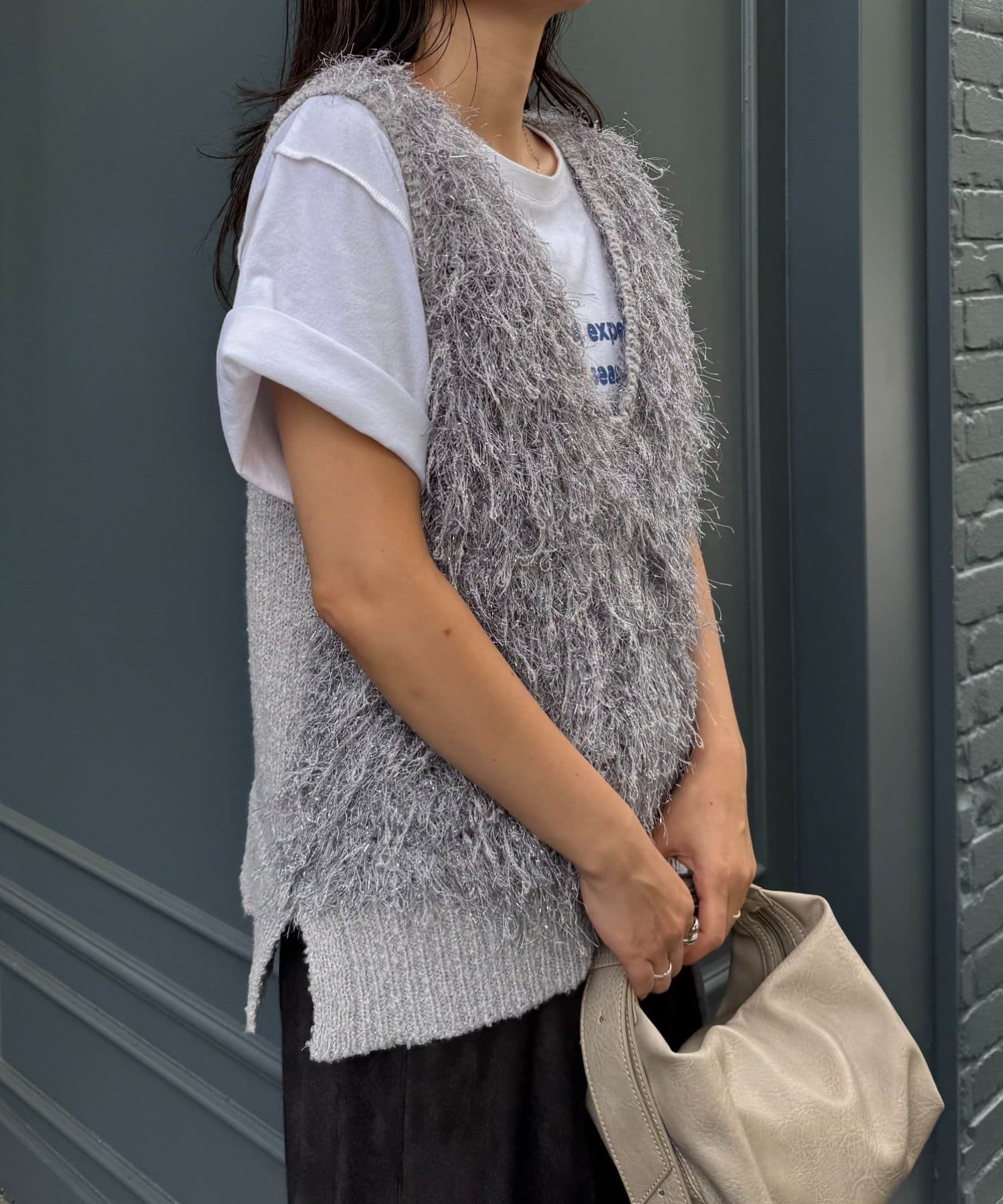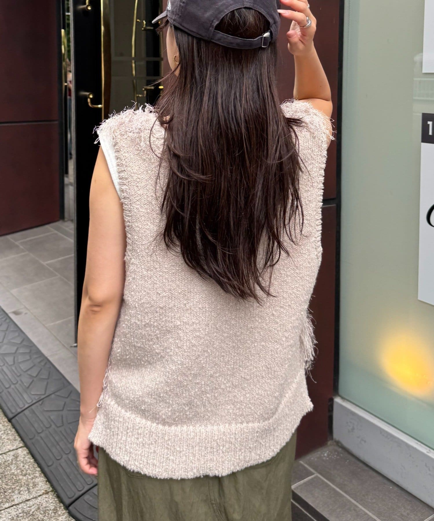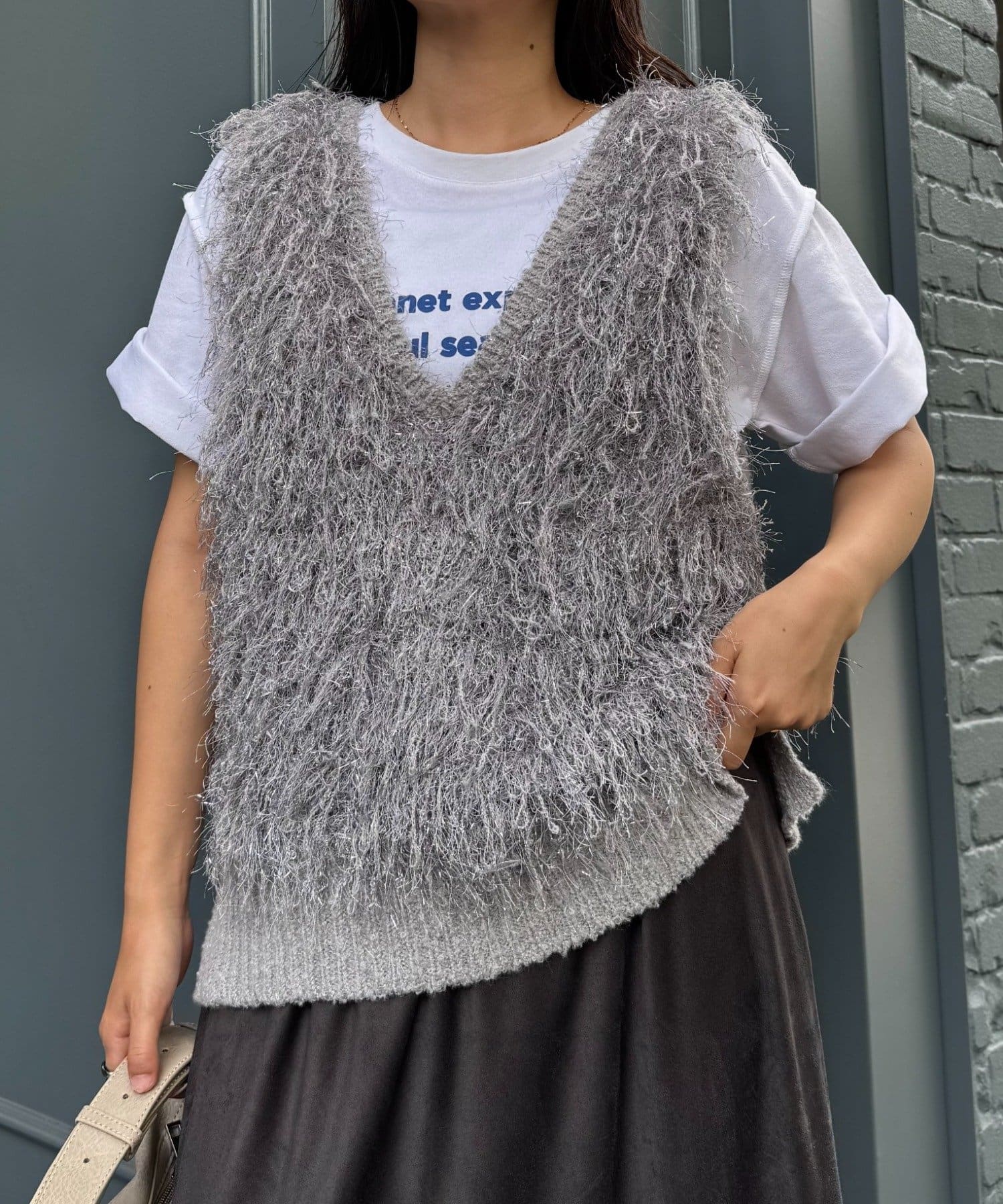 目を引くふわふわとした素材感が特徴的なフリンジベスト。