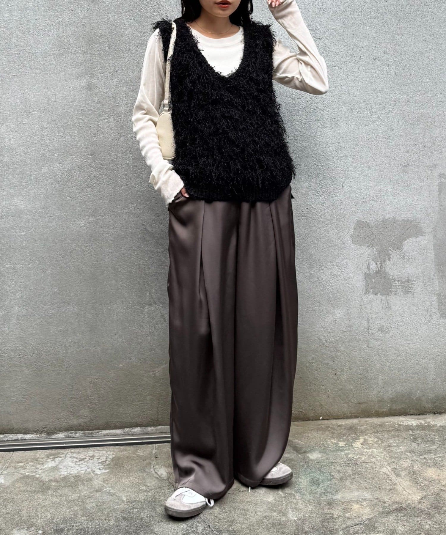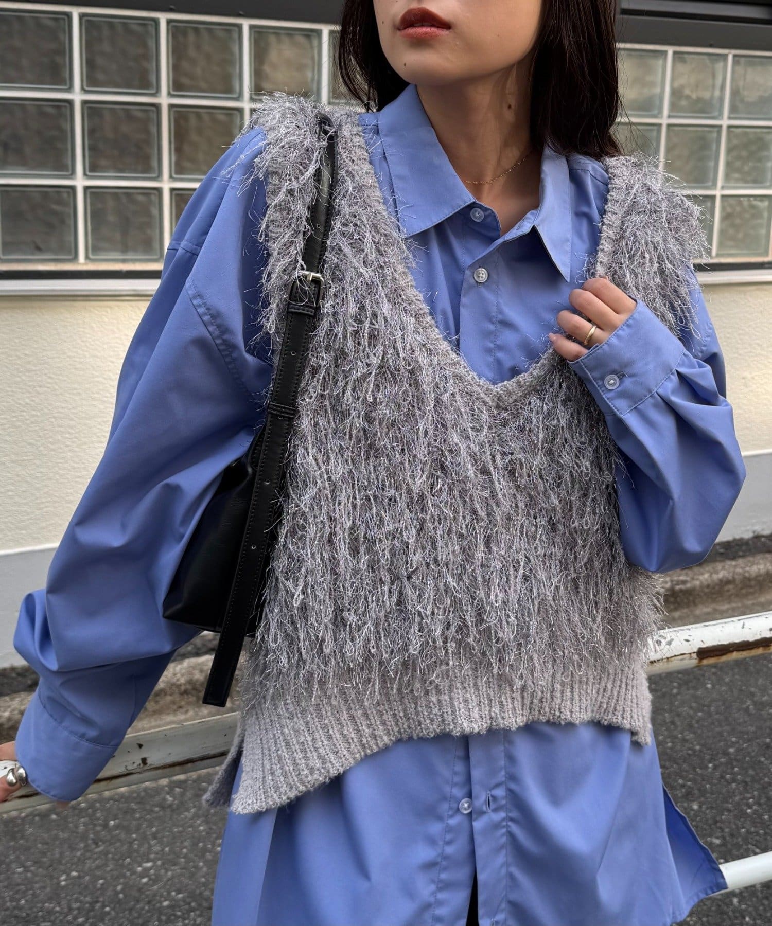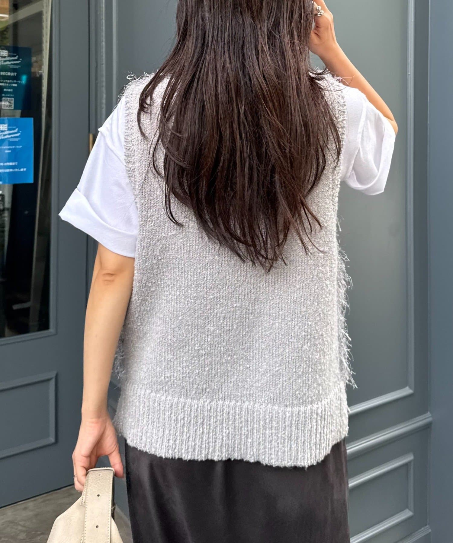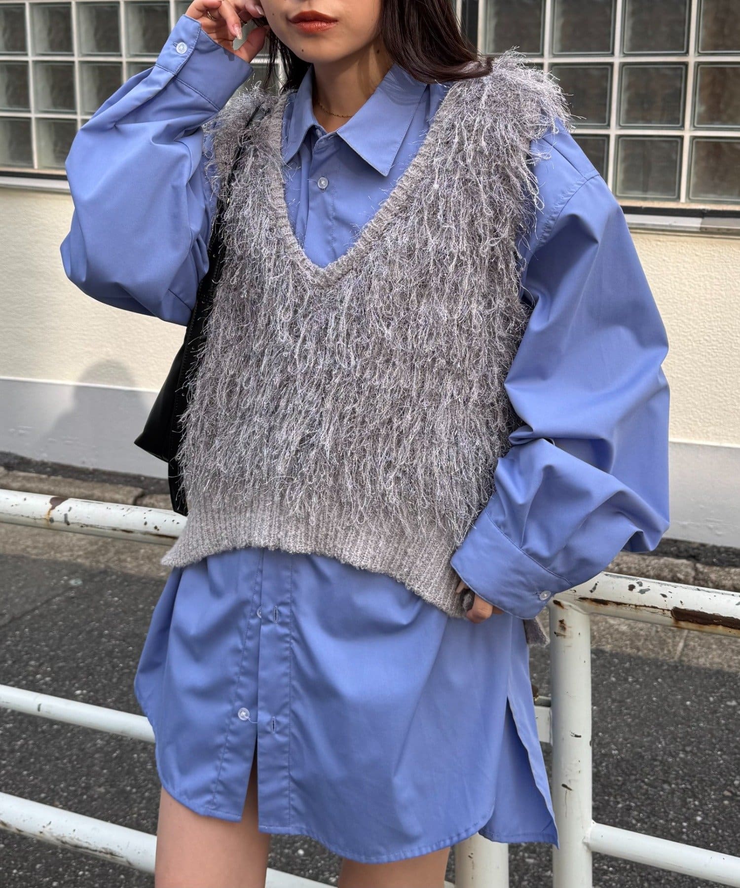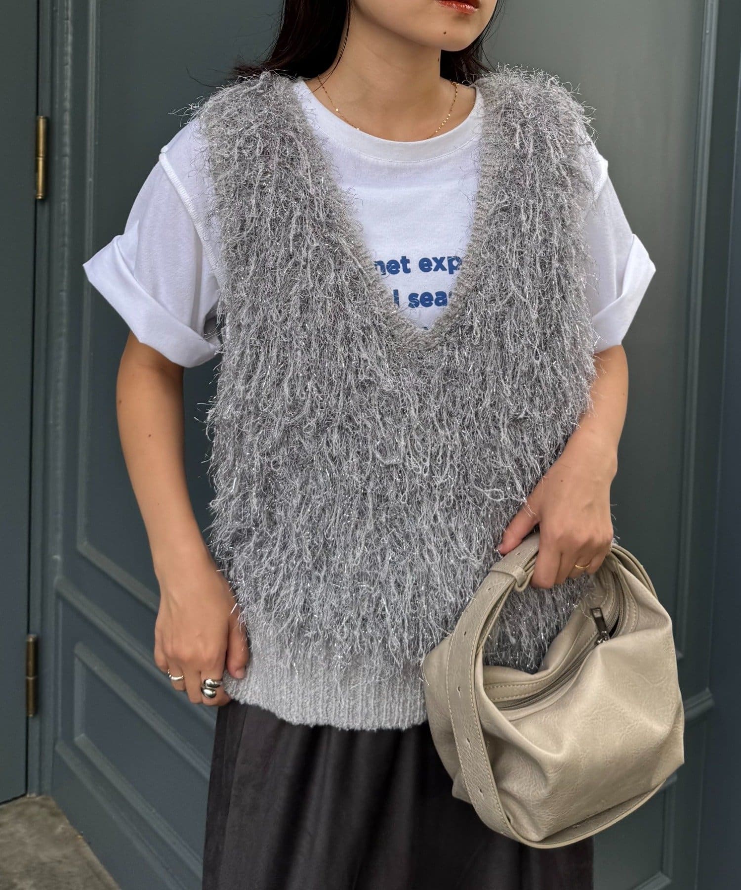 目を引くふわふわとした素材感が特徴的なフリンジベスト。