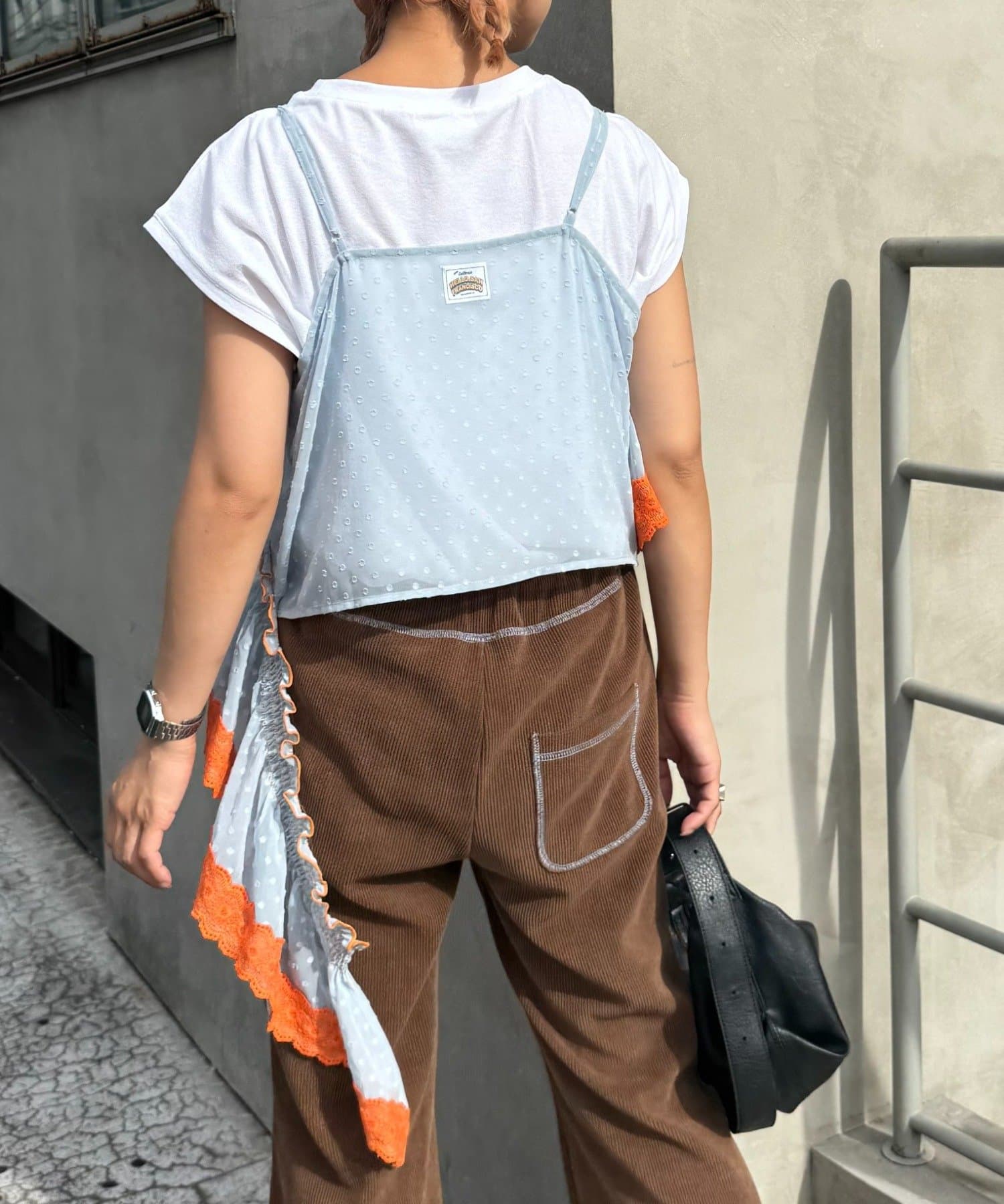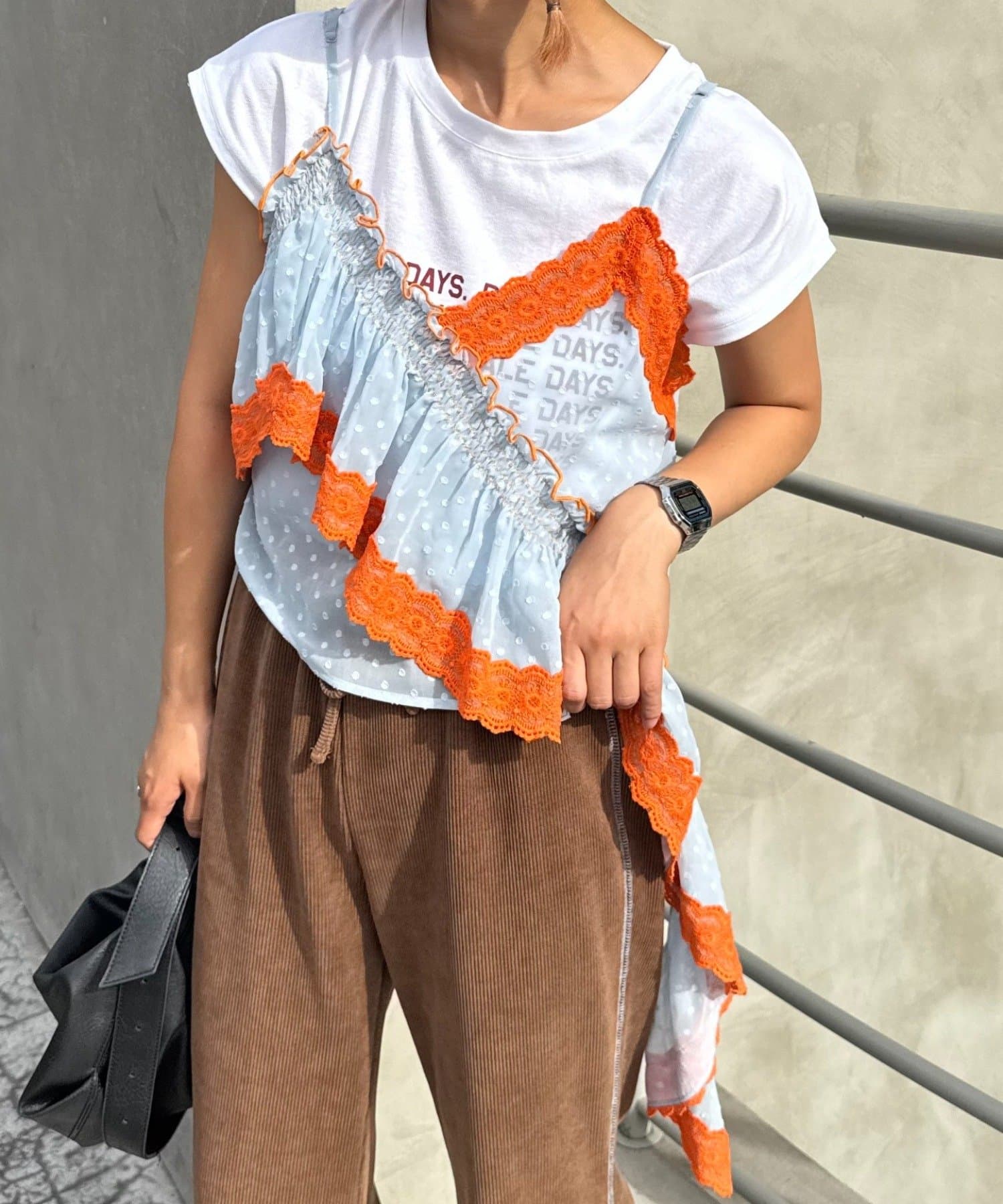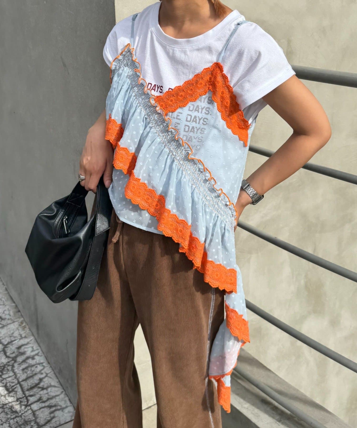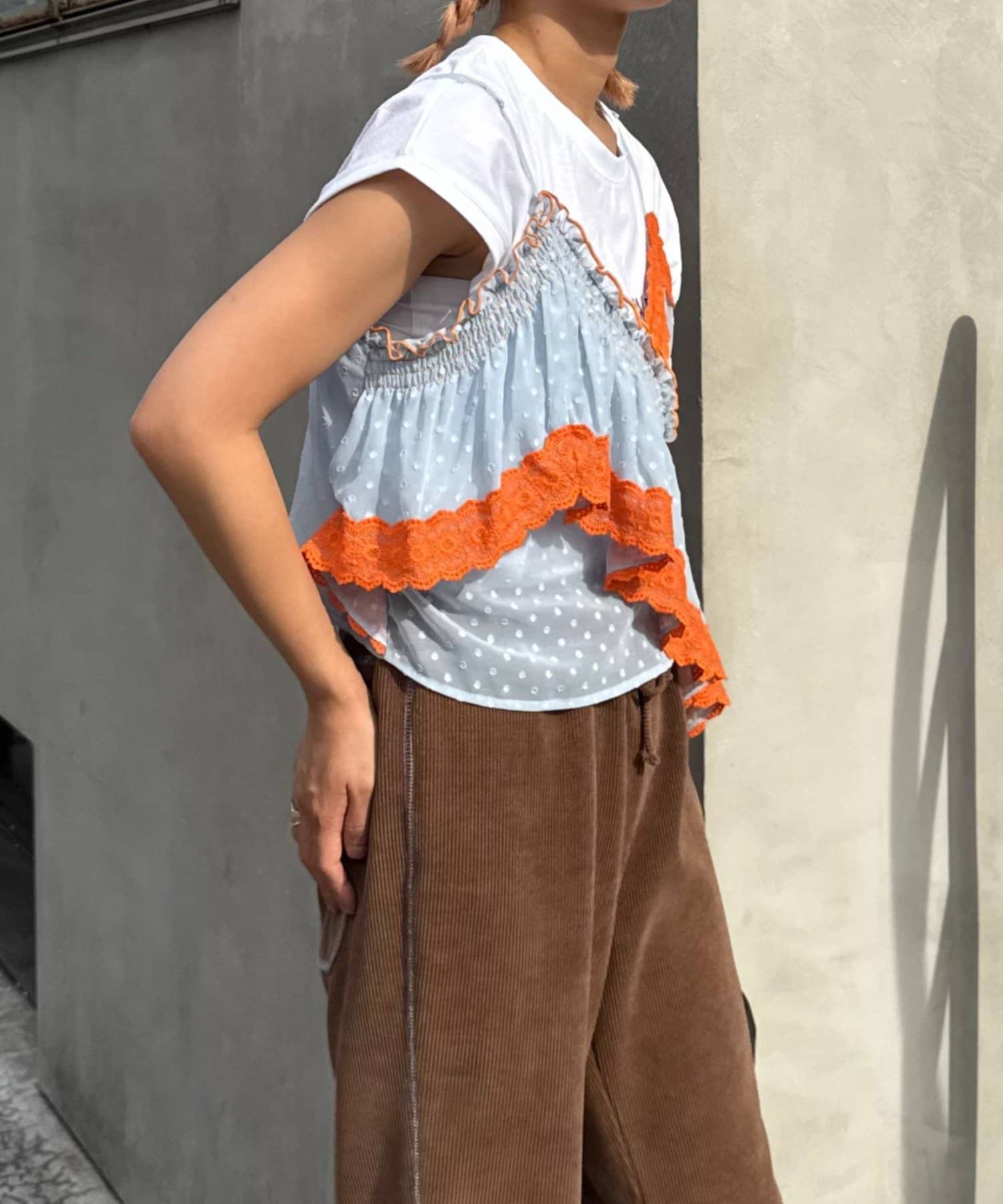 またジャケットのインナーに使っても、アシメのフリルがほどよくアクセントになります。