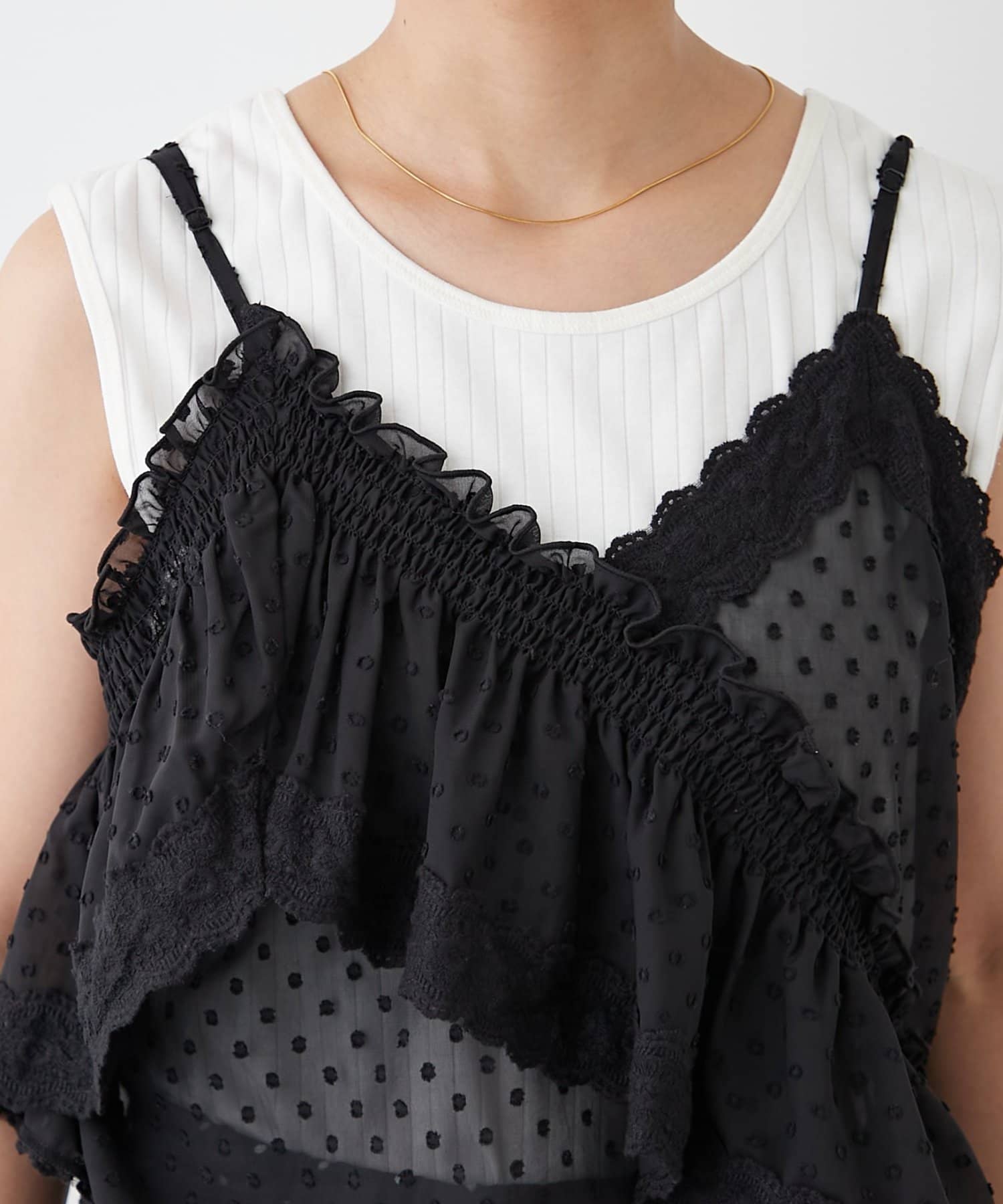 アシンメトリーに重ねたフリルがポイントの、ドットチュールキャミ!