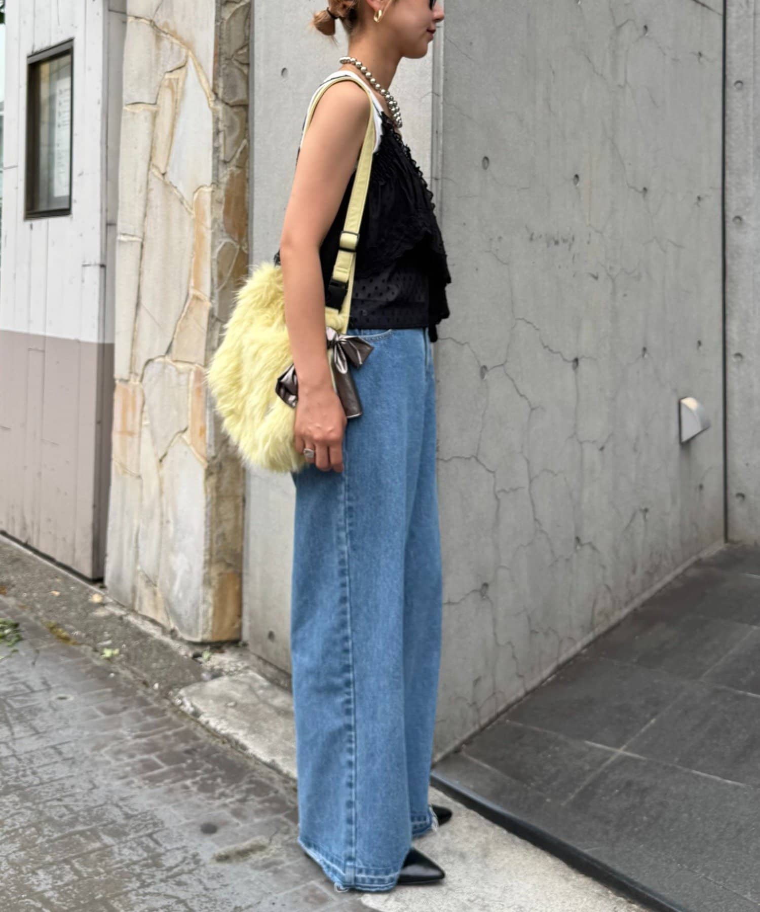 あえてワイドデニムやカーゴパンツなど、メンズライクなアイテムとの甘辛MIXもバランス◎