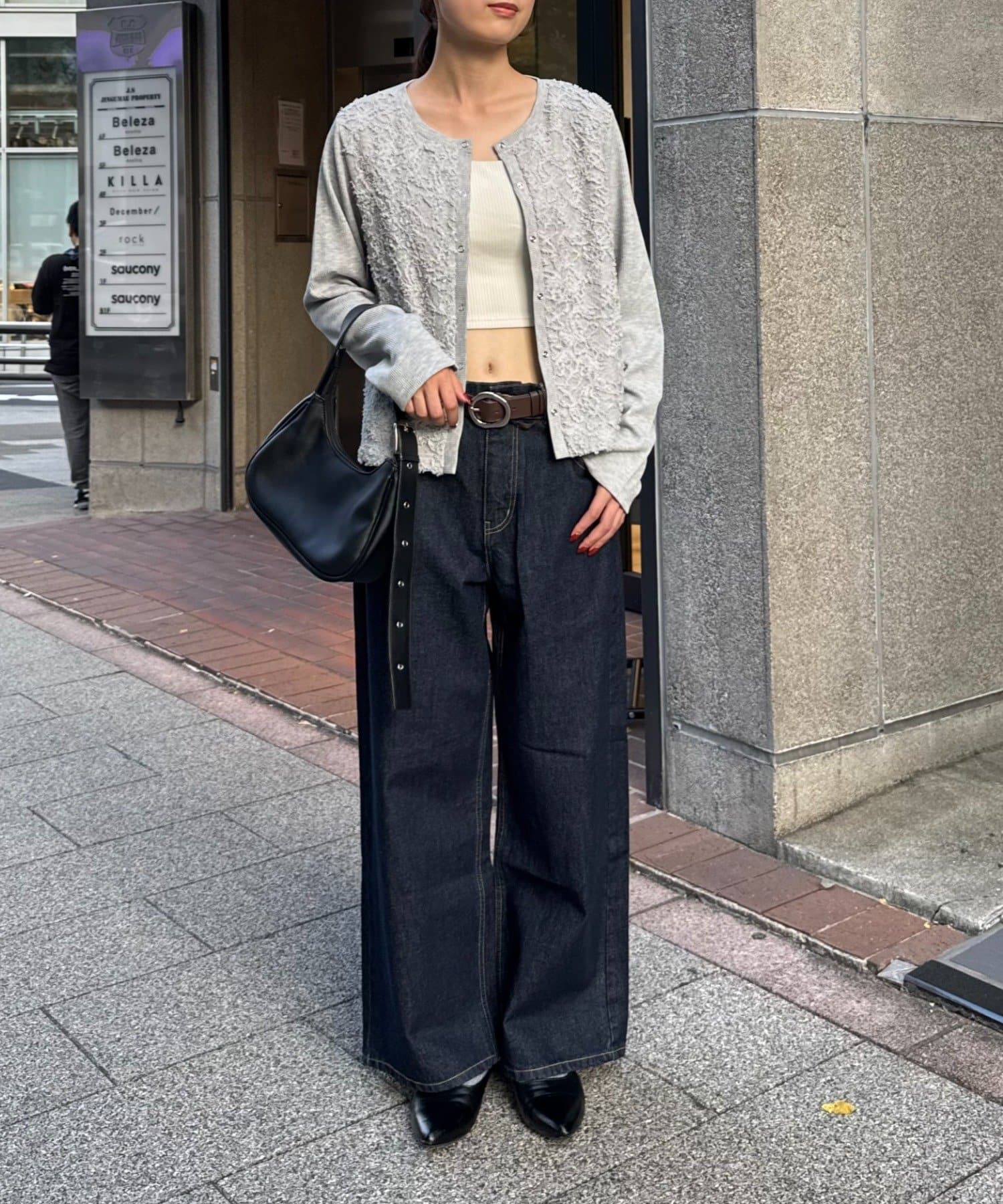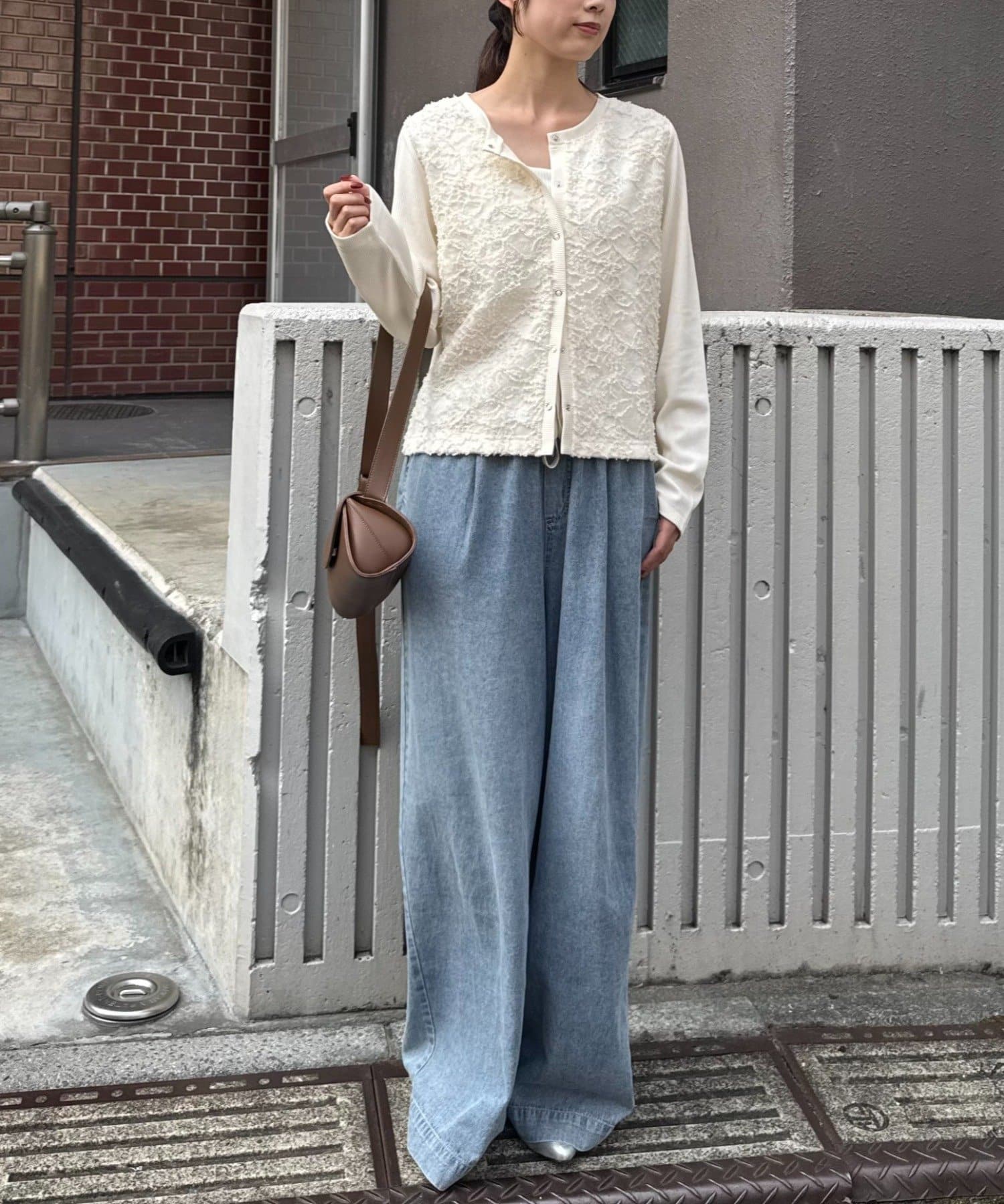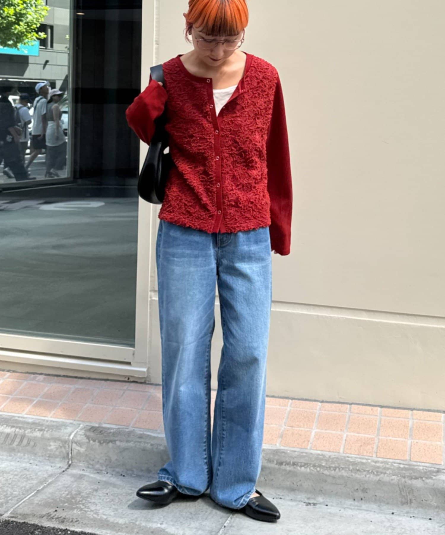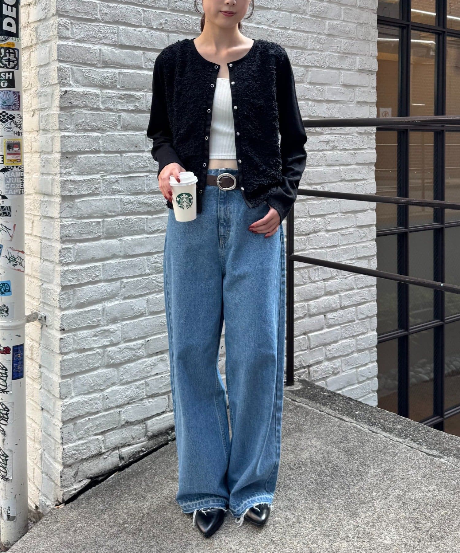 前を閉めてデニムと合わせれば、カジュアルと甘さのバランスがとれたトレンドコーデが完成♩