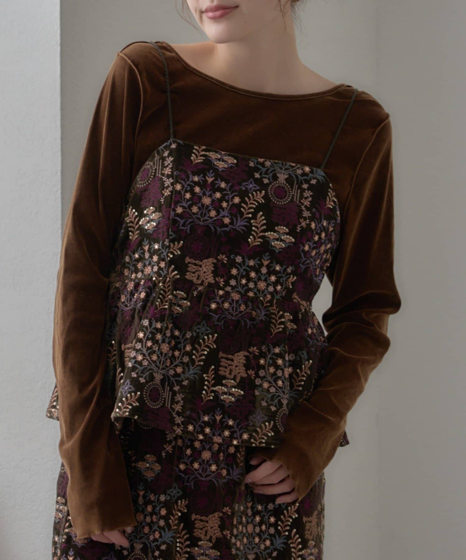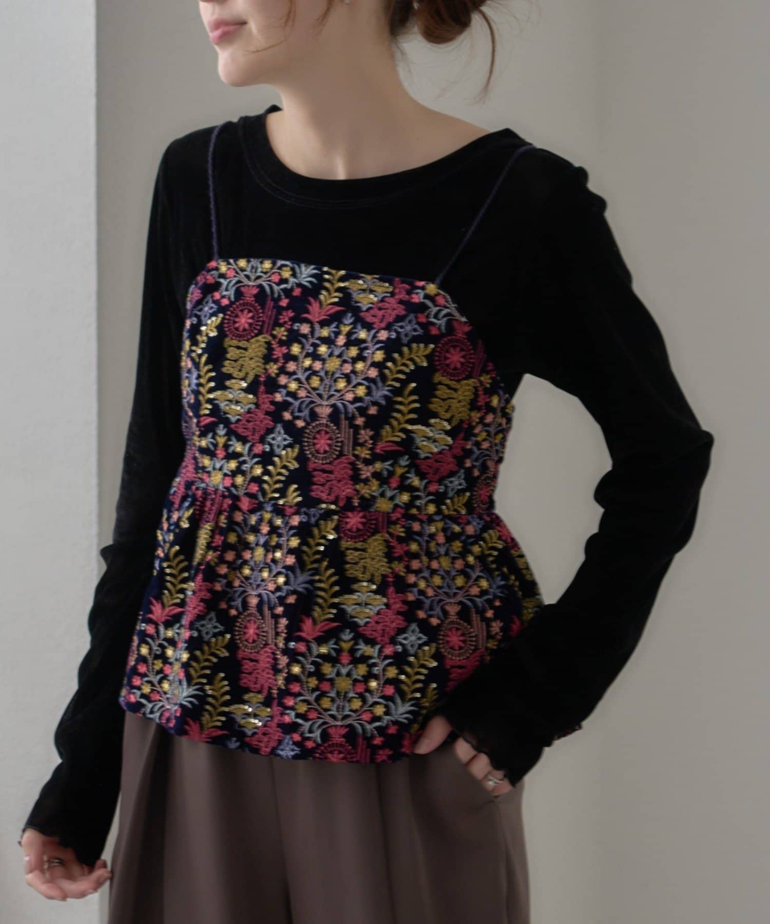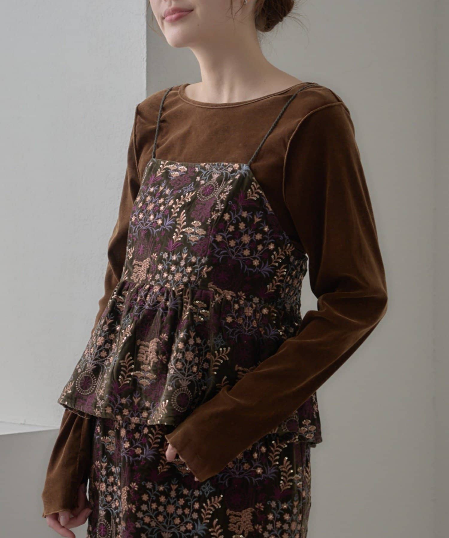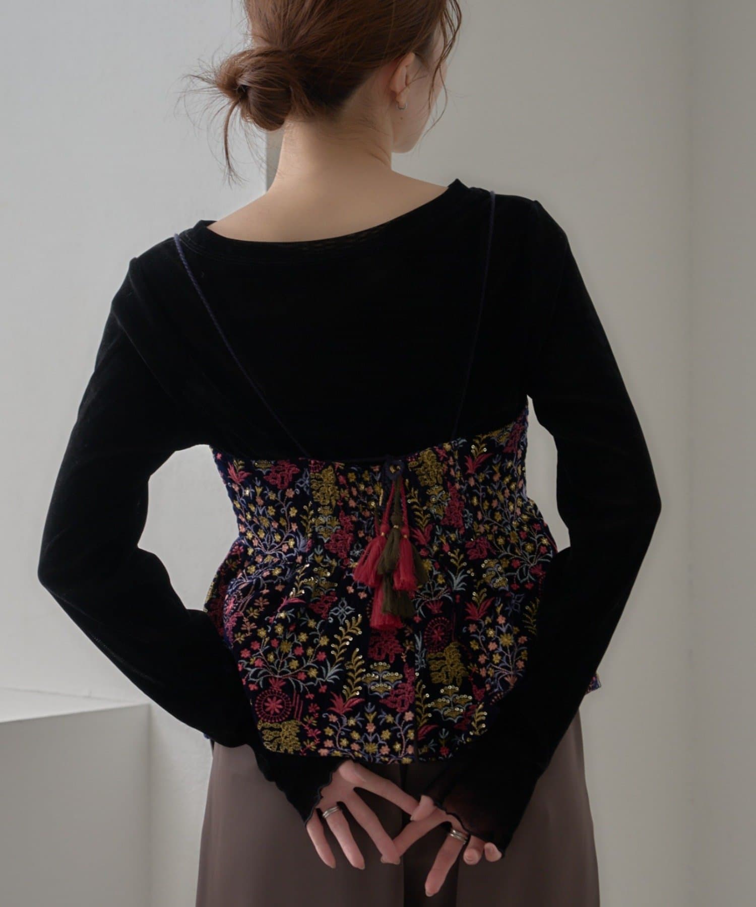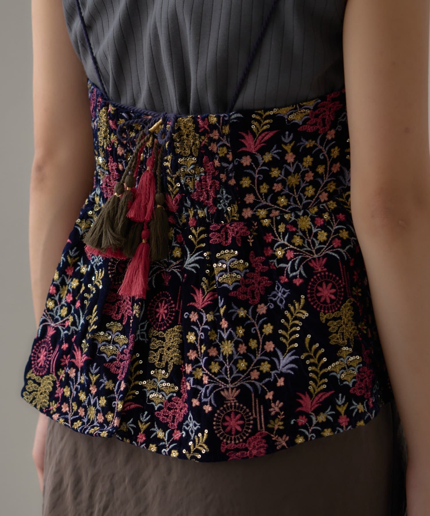ヴィンテージライクな刺繍をあしらったベロア素材が目を惹く、存在感たっぷりのキャミビスチェ。