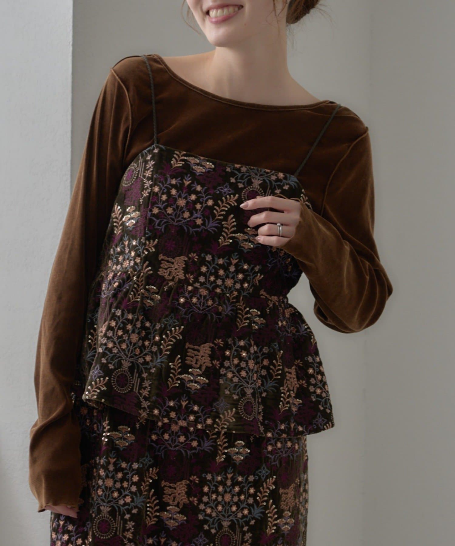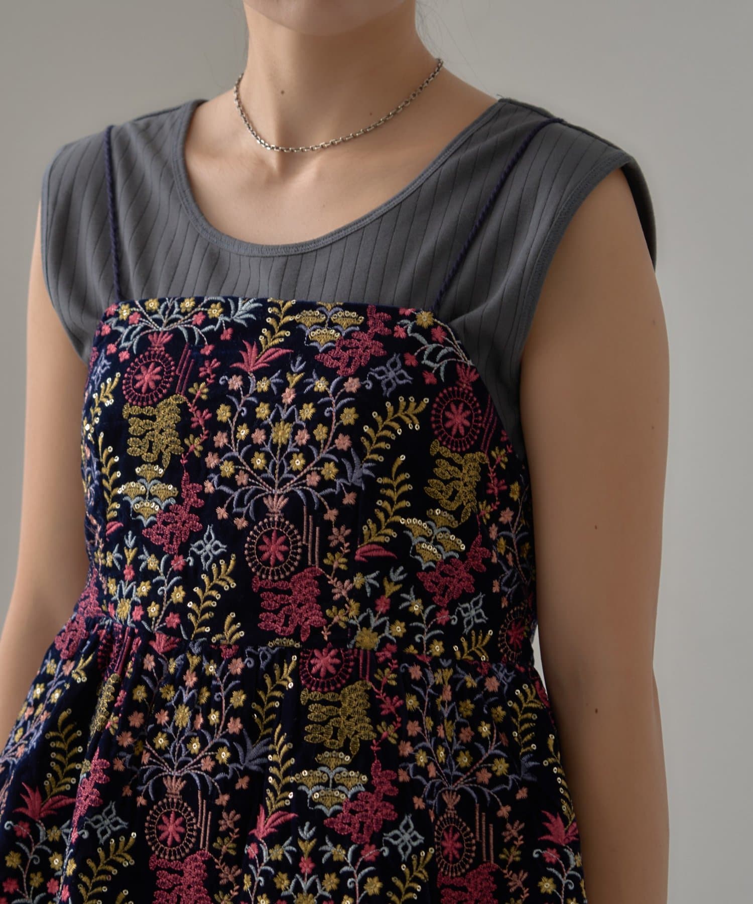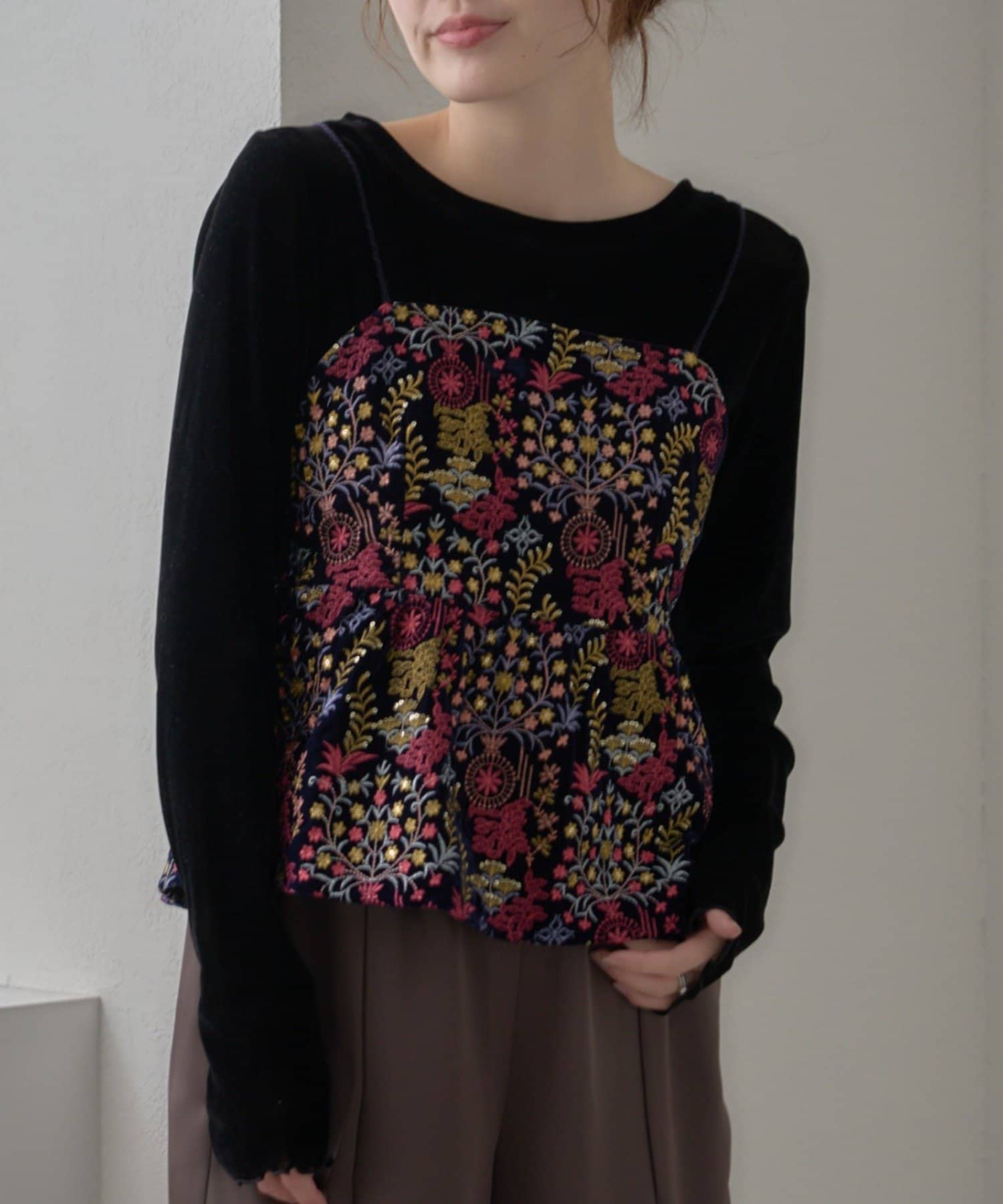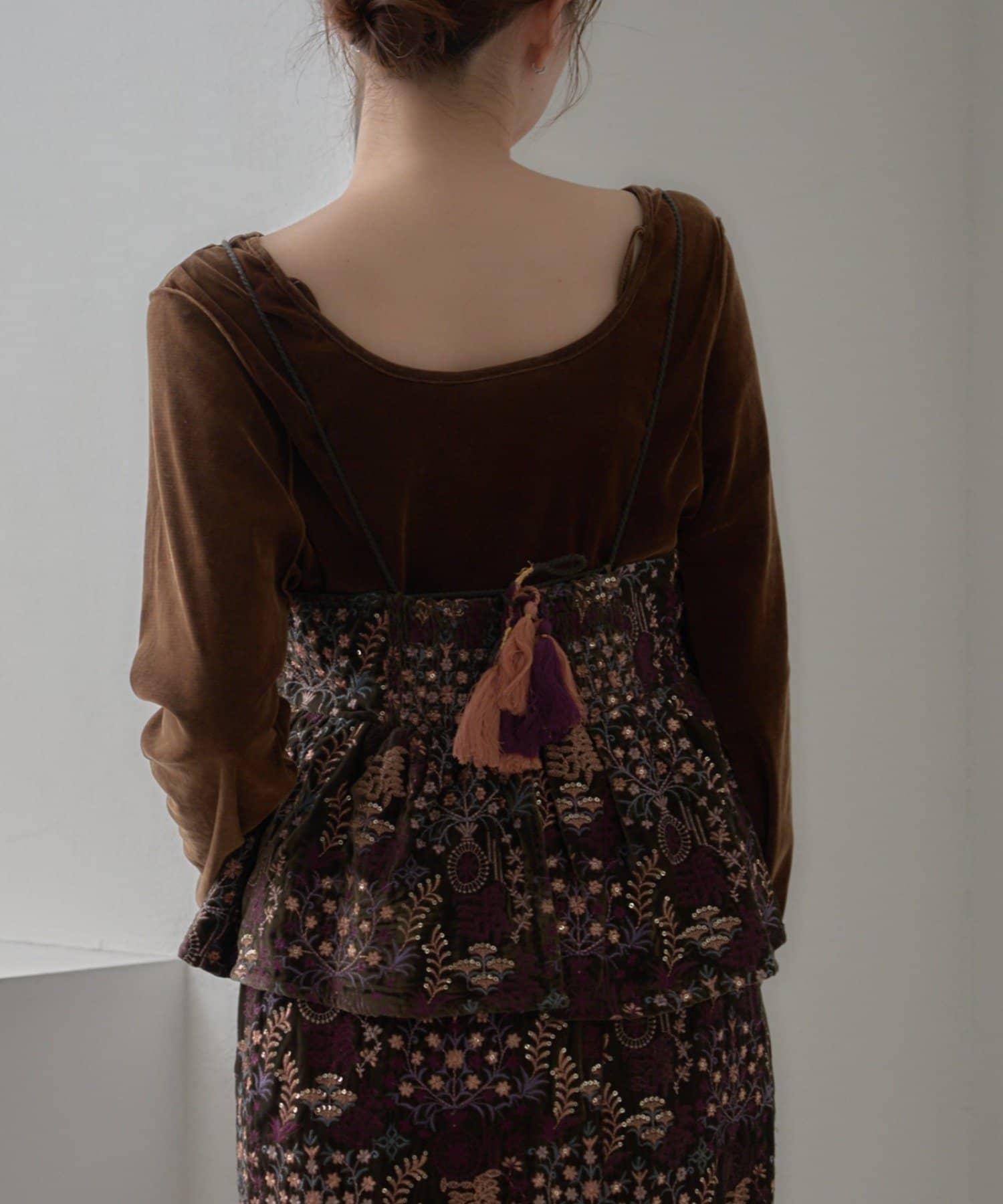 ヴィンテージライクな刺繍をあしらったベロア素材が目を惹く、存在感たっぷりのキャミビスチェ。