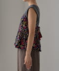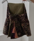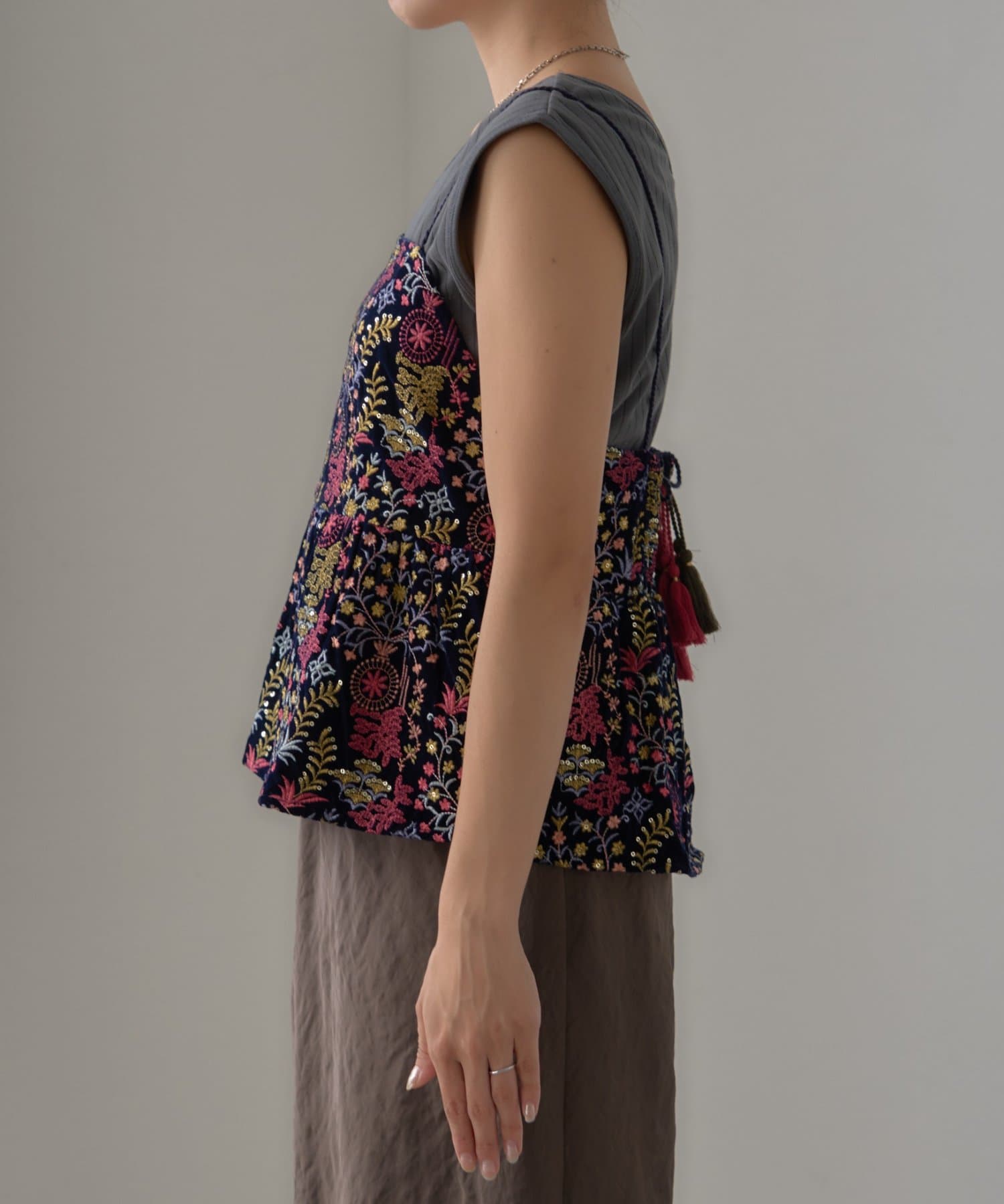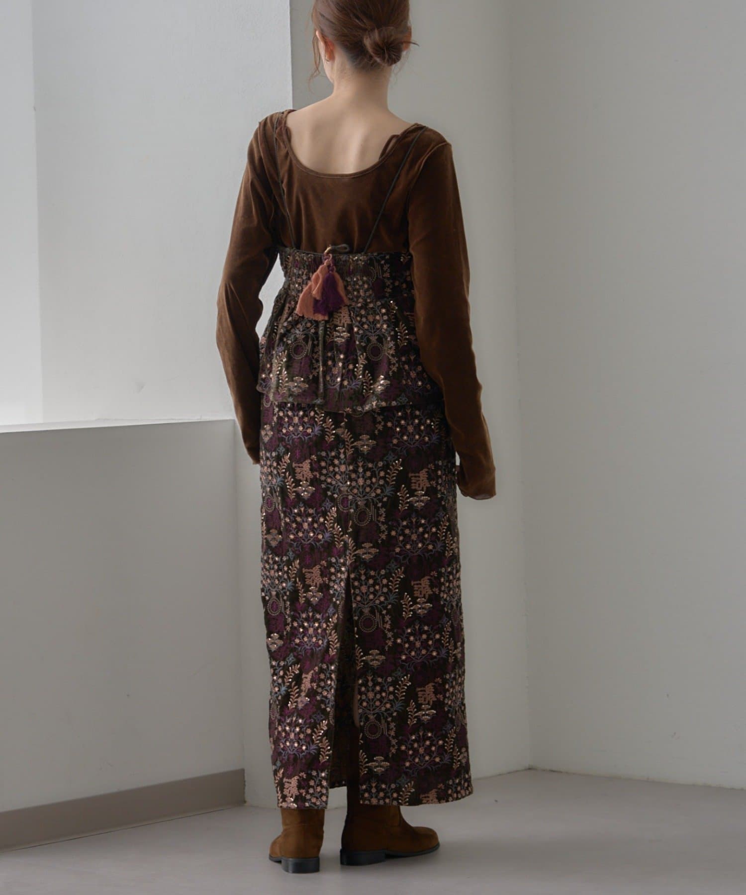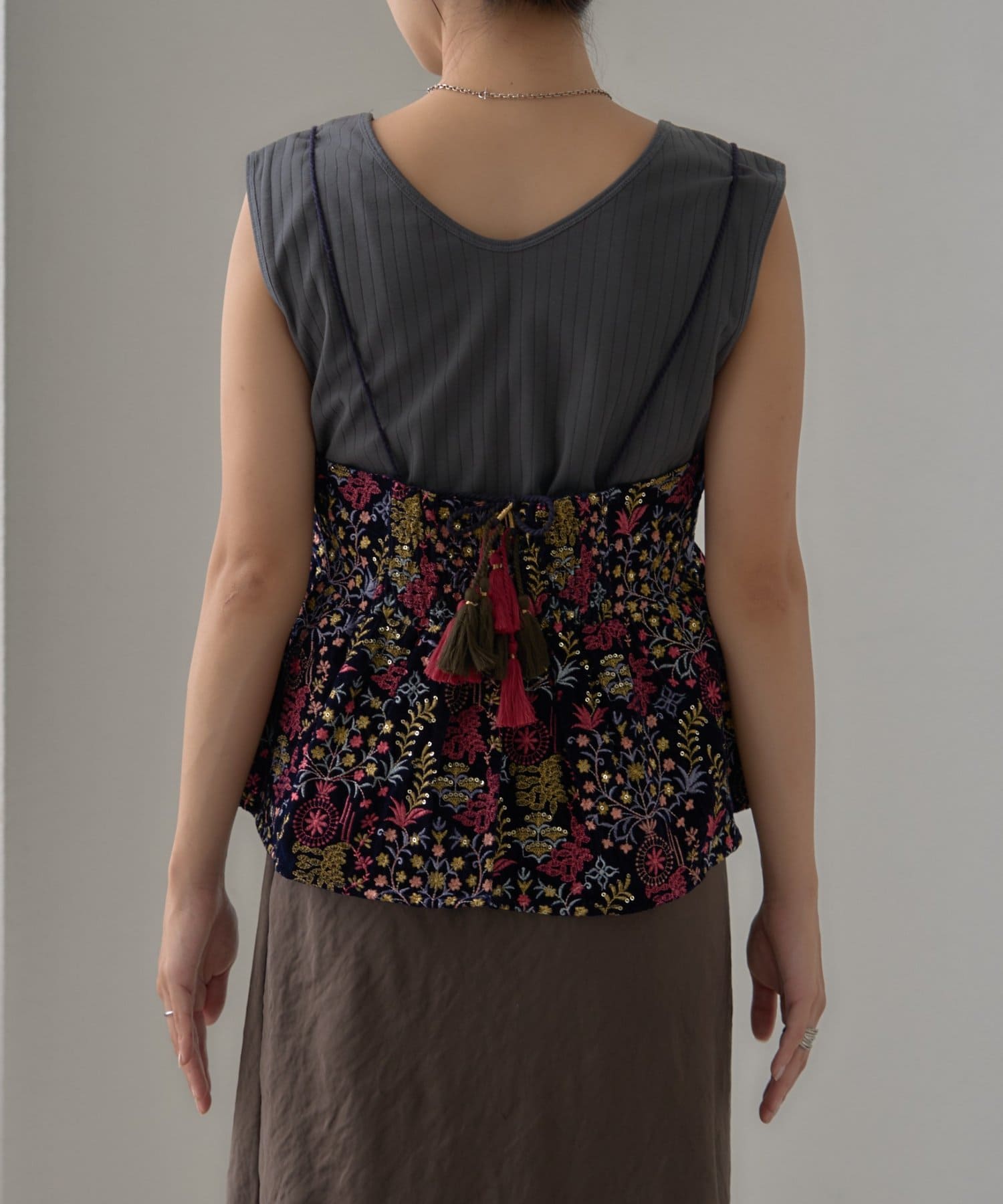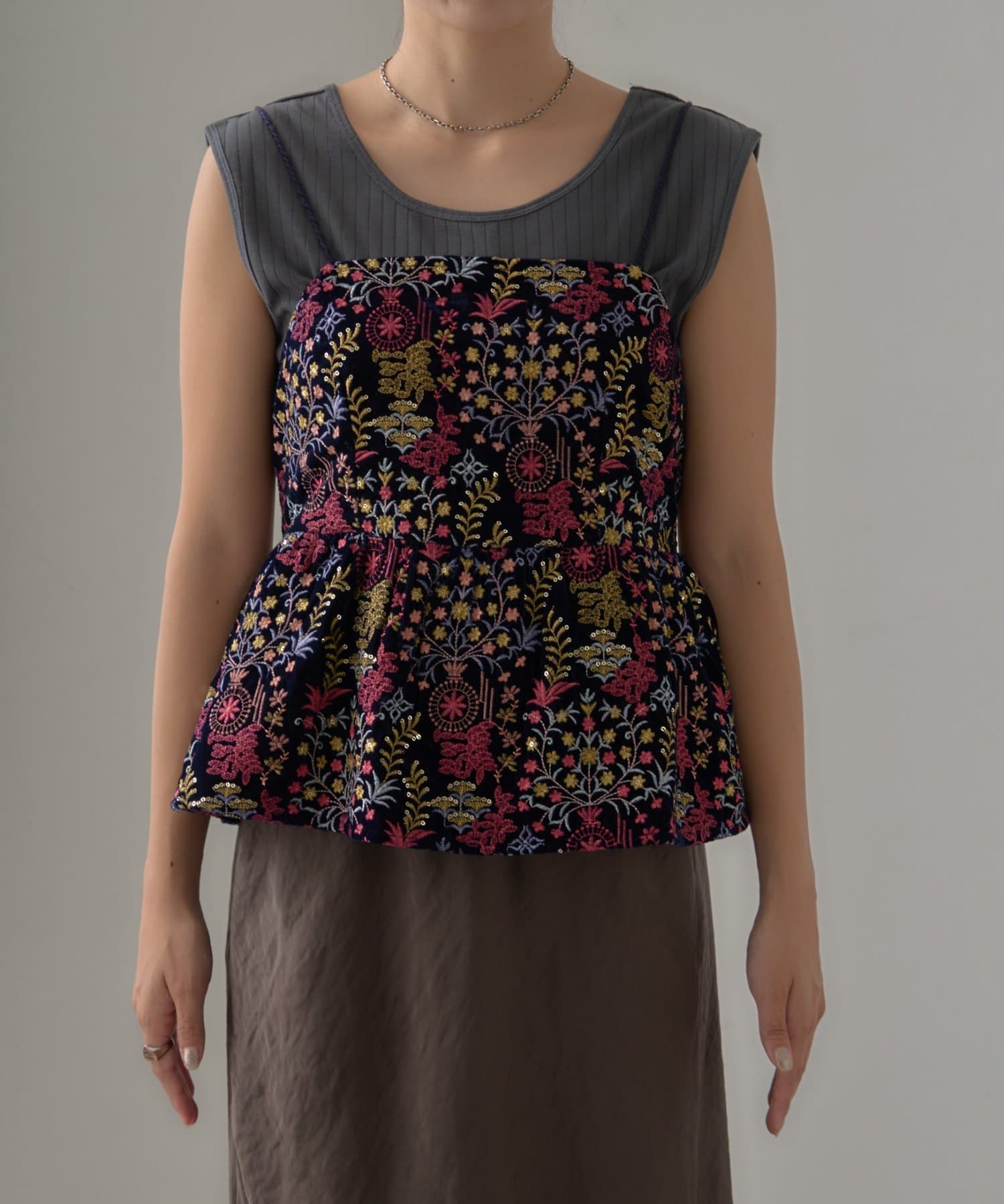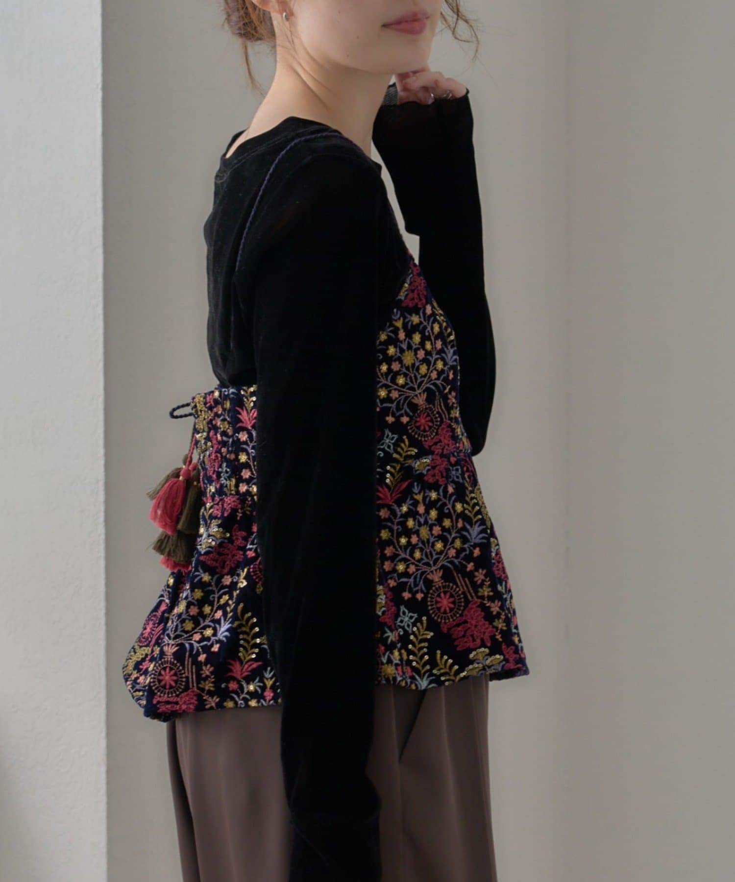 ヴィンテージライクな刺繍をあしらったベロア素材が目を惹く、存在感たっぷりのキャミビスチェ。