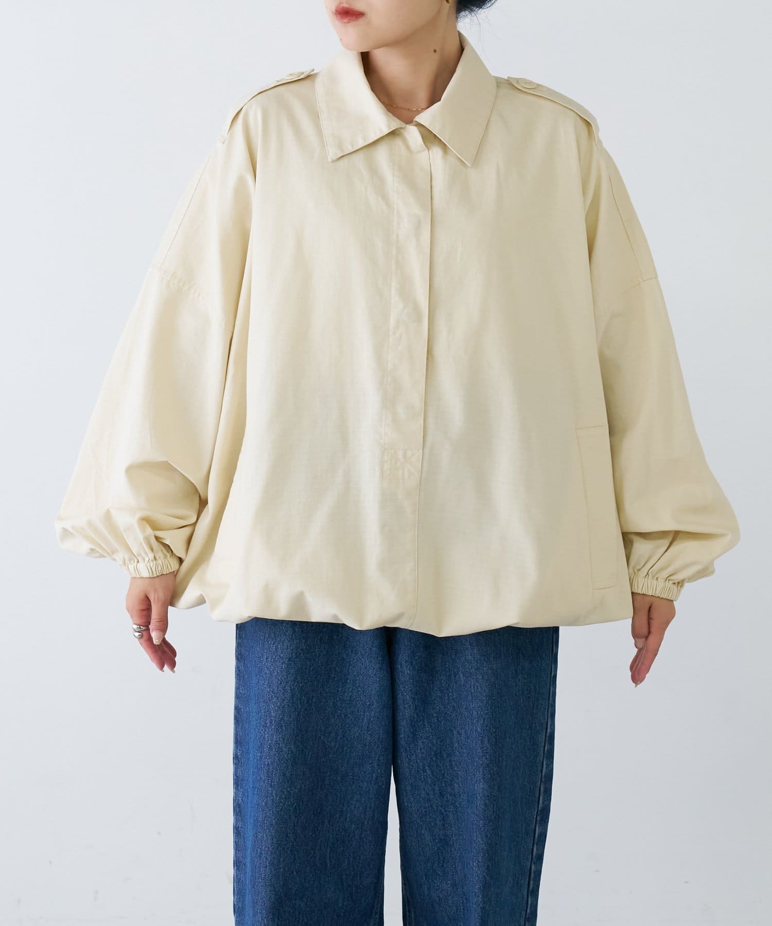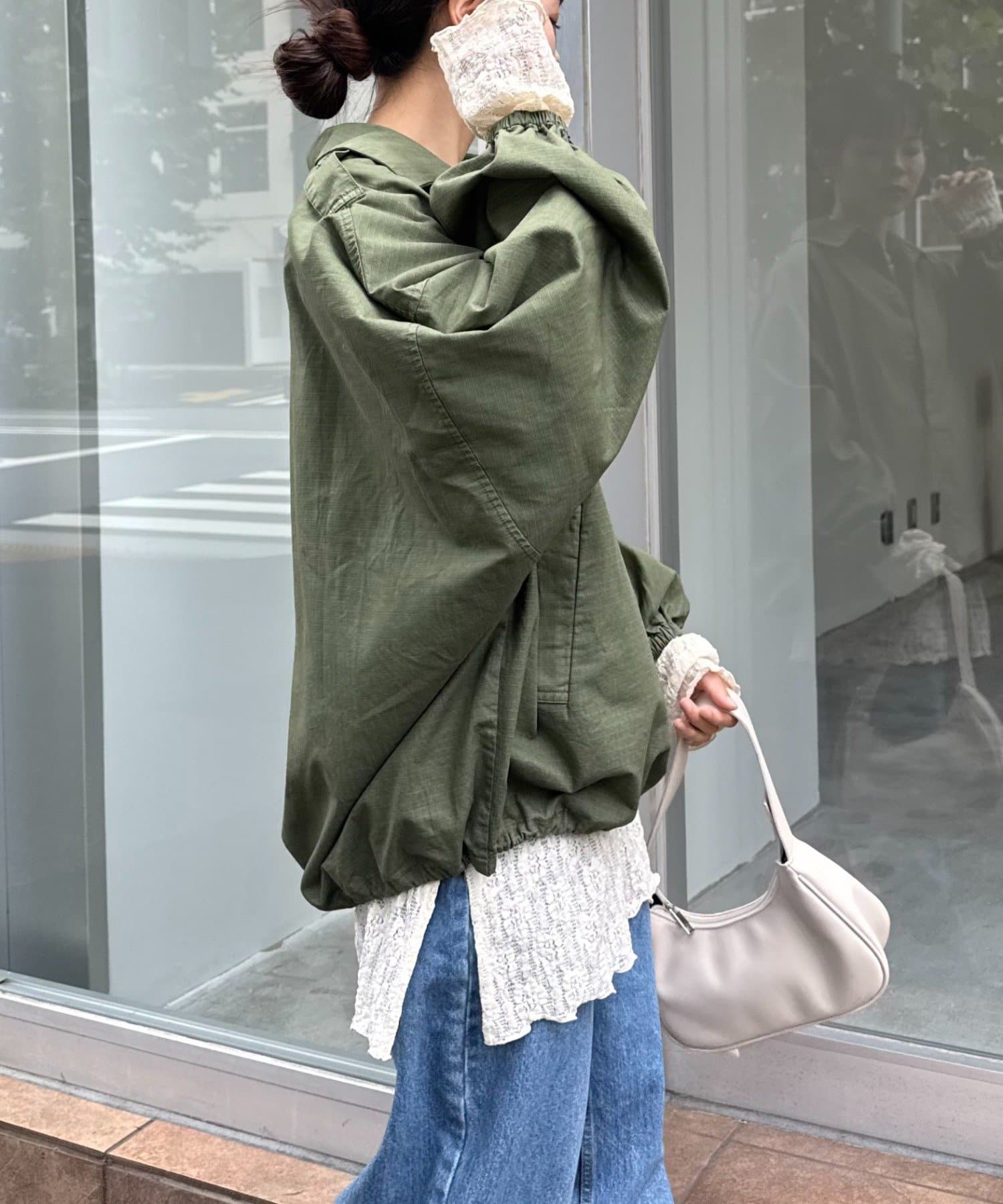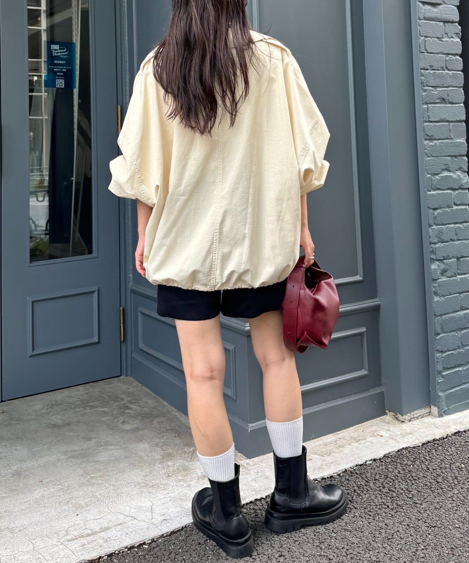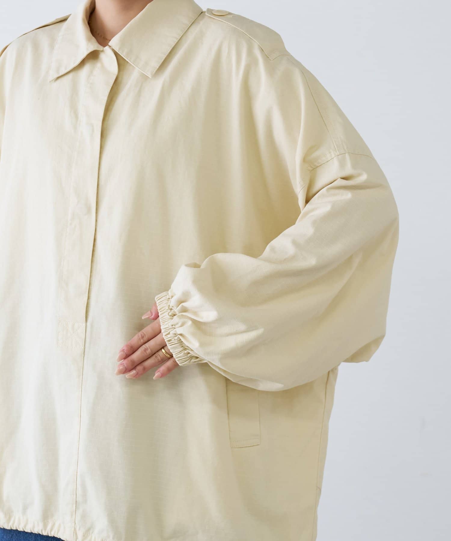 ゆったりとしたシルエットと、絞られた袖口のギャザーが、ふんわりとしたボリューム感を生み出し、こなれた雰囲気を演出します。
