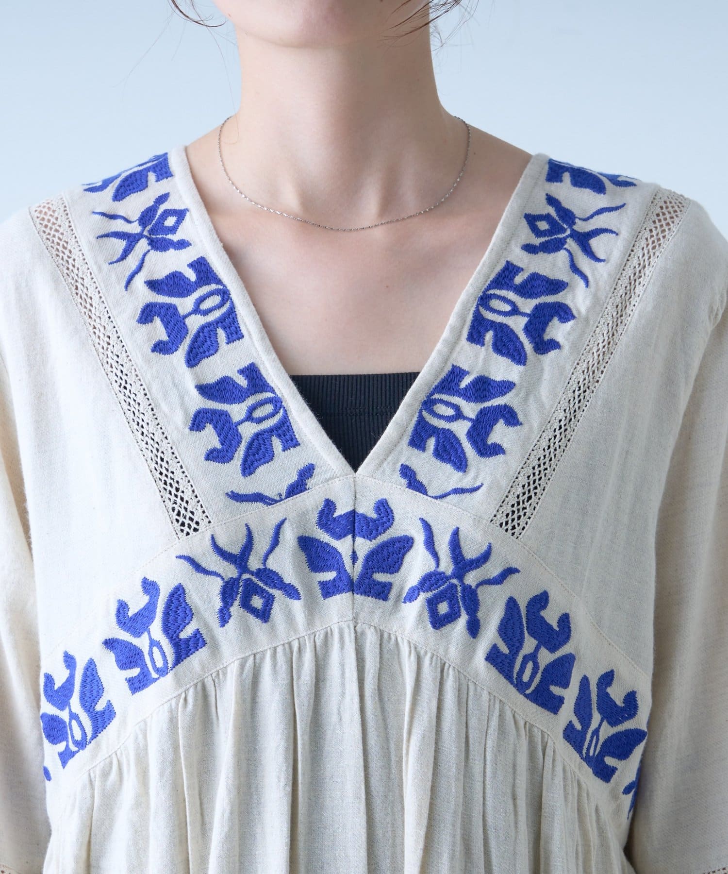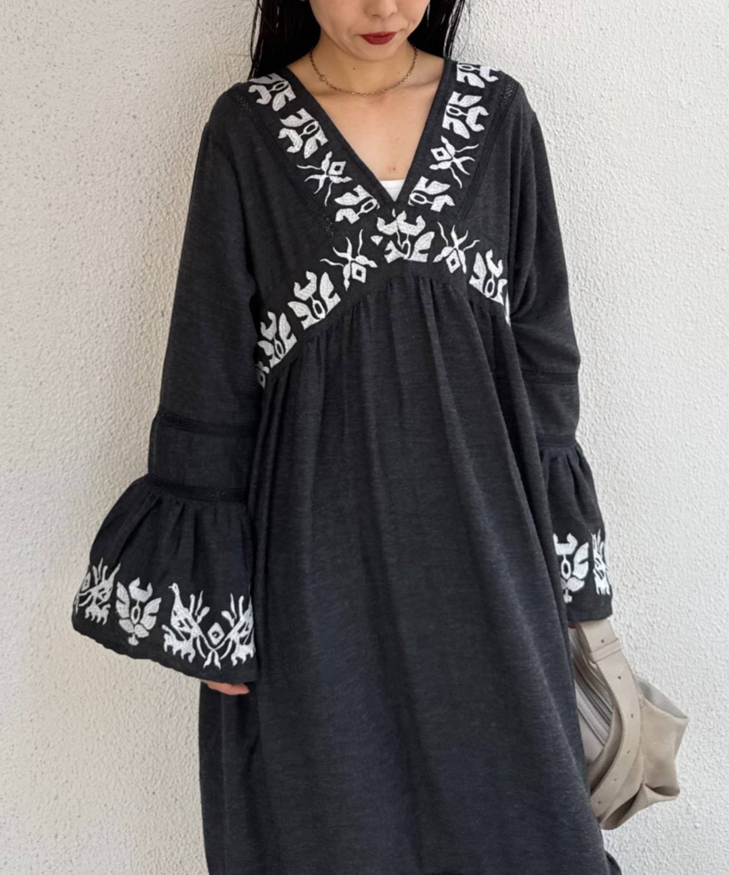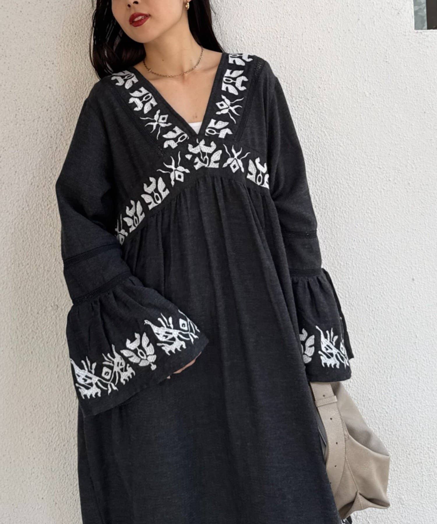 【aguni】刺繍Vネックフレアスリーブワンピ
