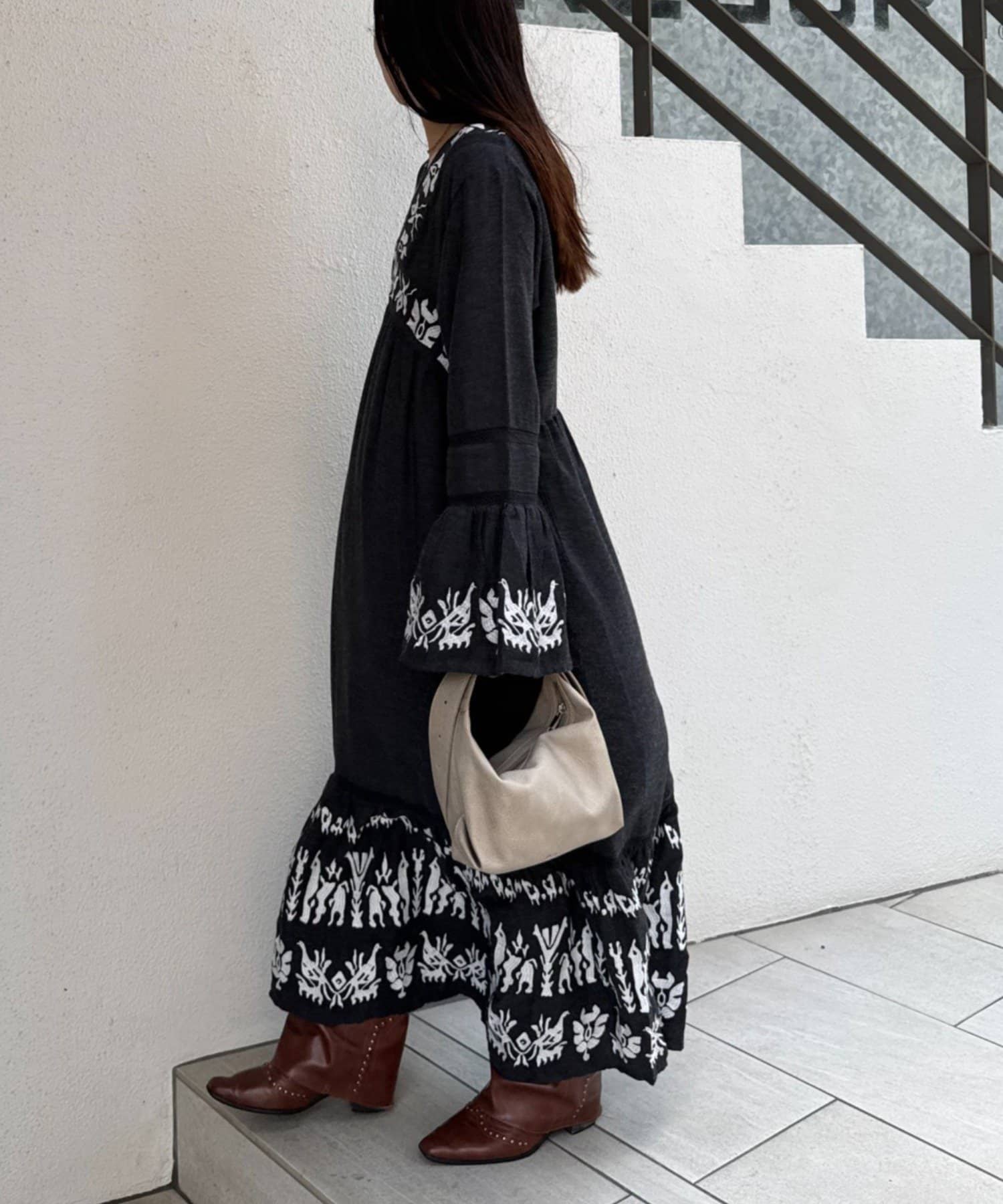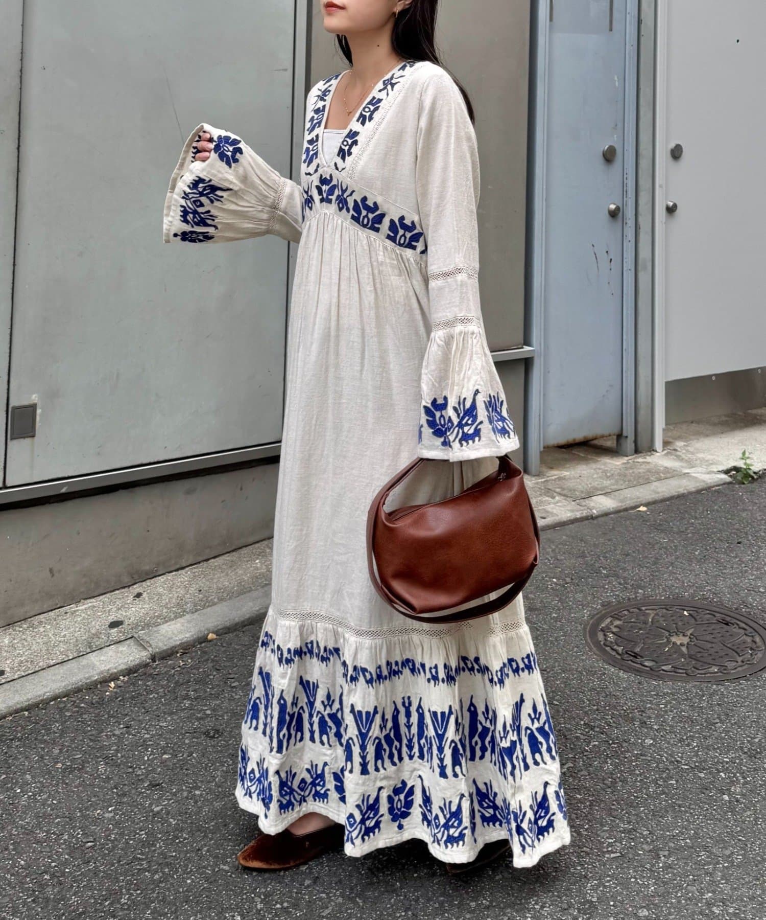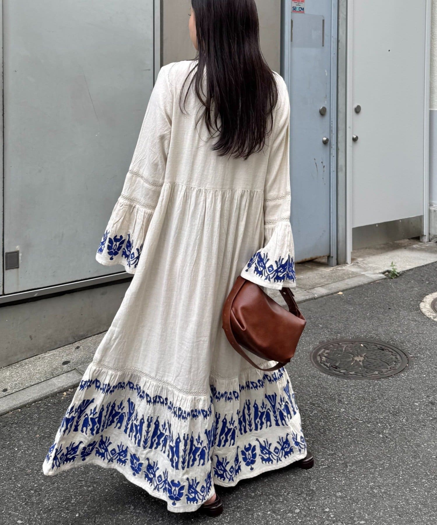 ウエストの刺繍が自然にスタイルを引き締め、女性らしいバランスを演出してくれます♩