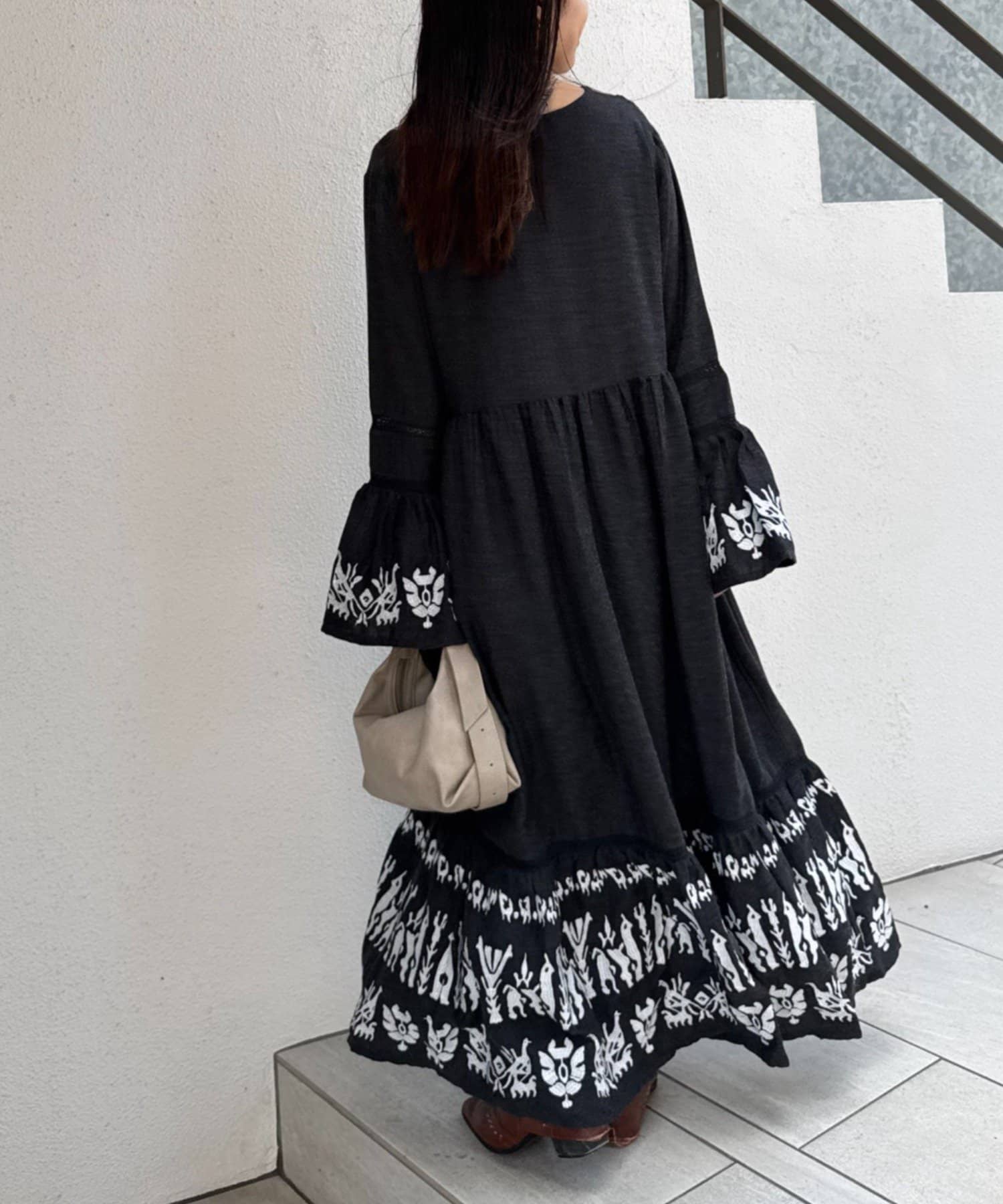繊細な刺繍とフレアスリーブが華やかな印象を与える、存在感抜群のワンピースが登場。