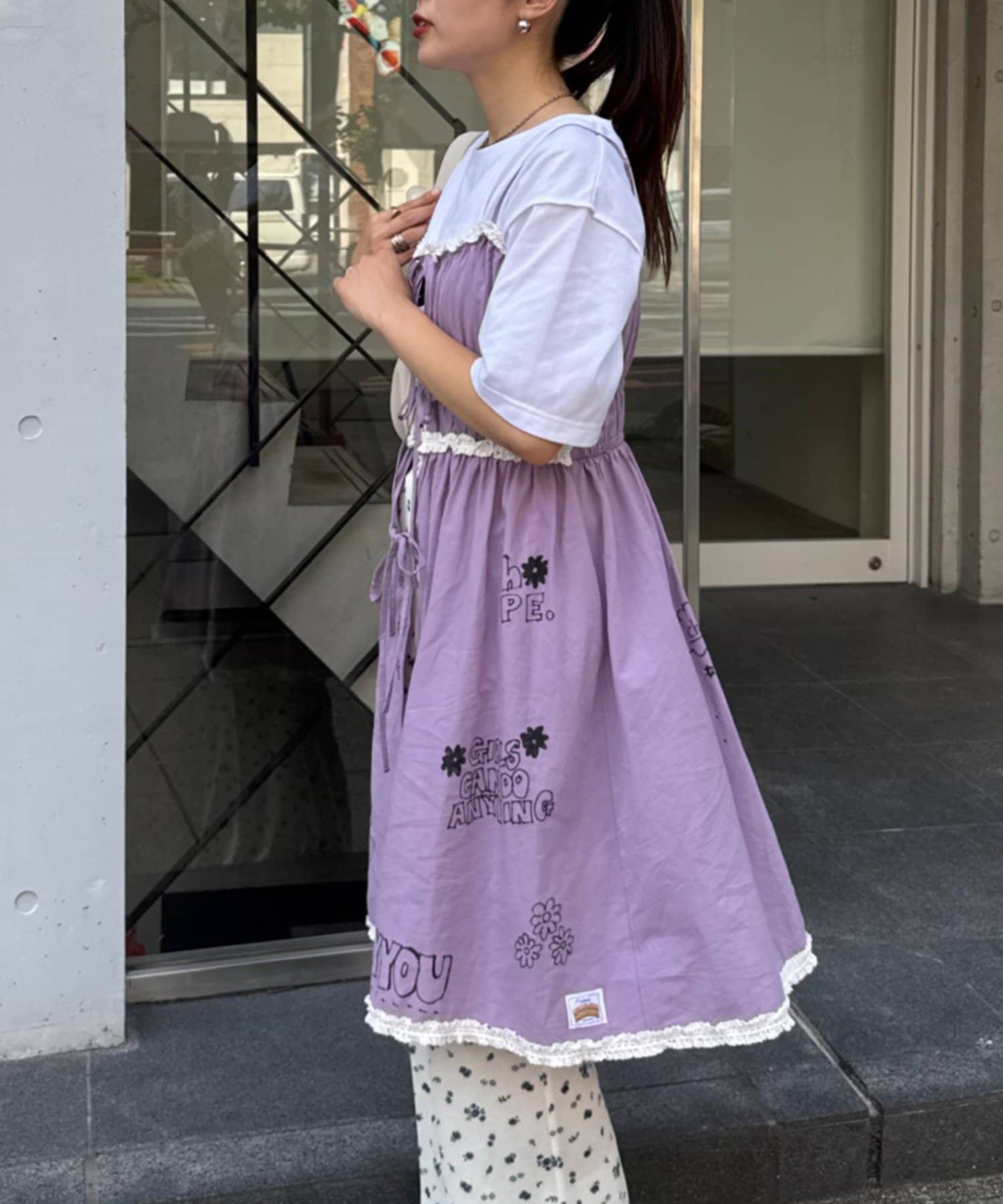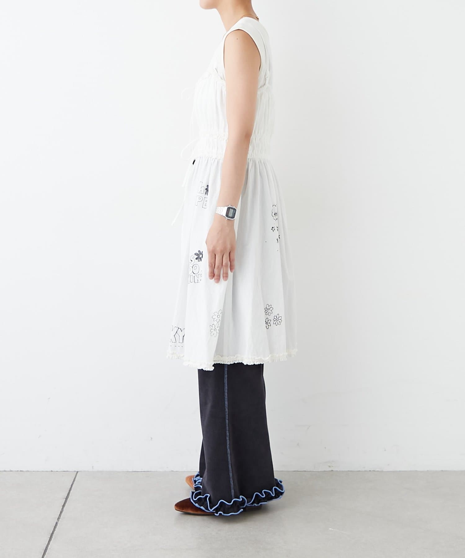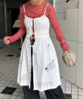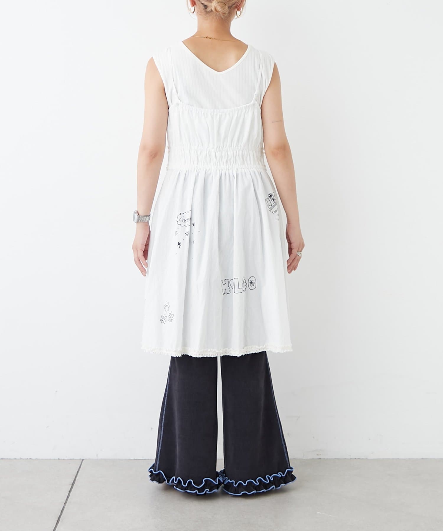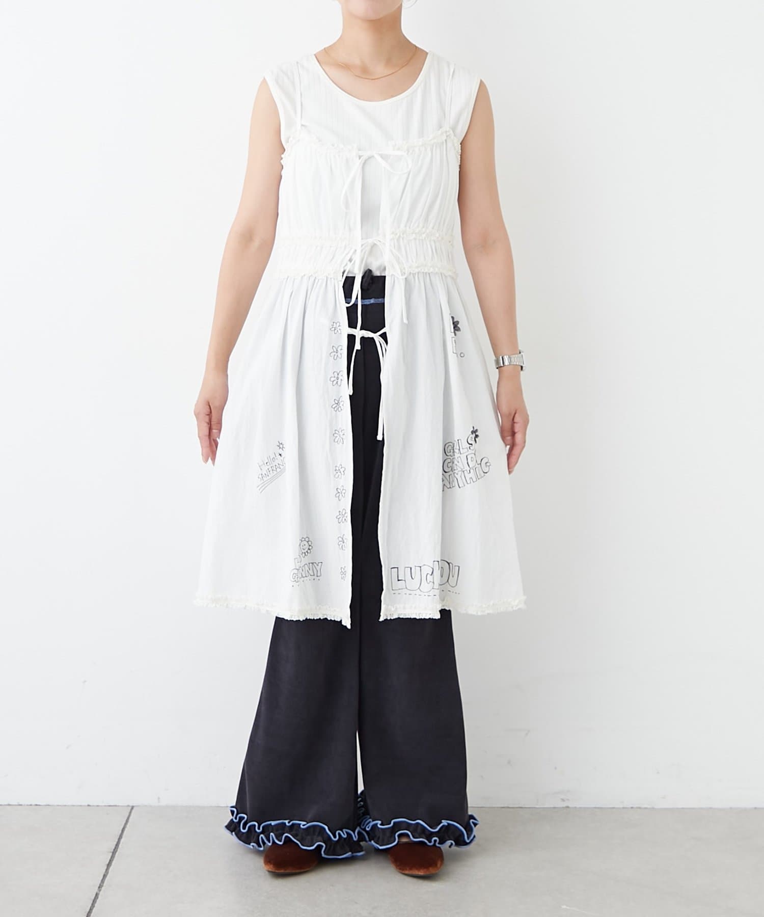 裾にもさりげなくあしらわれたフリルが甘すぎず、ちょっぴりクセのある仕上がりに。