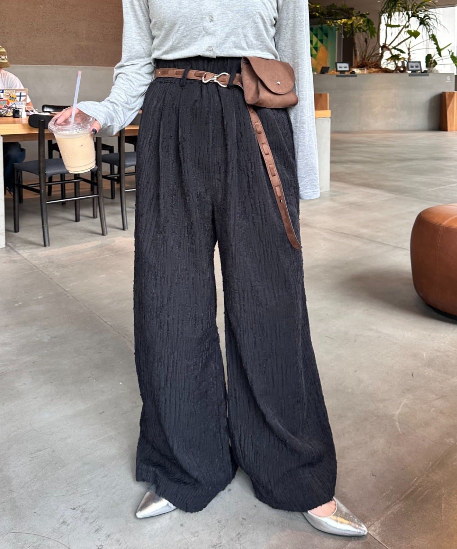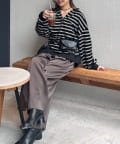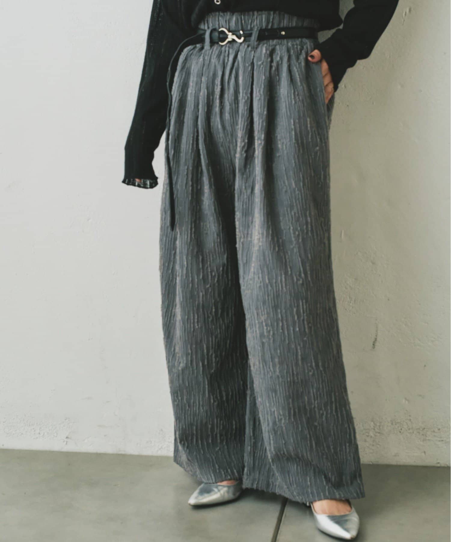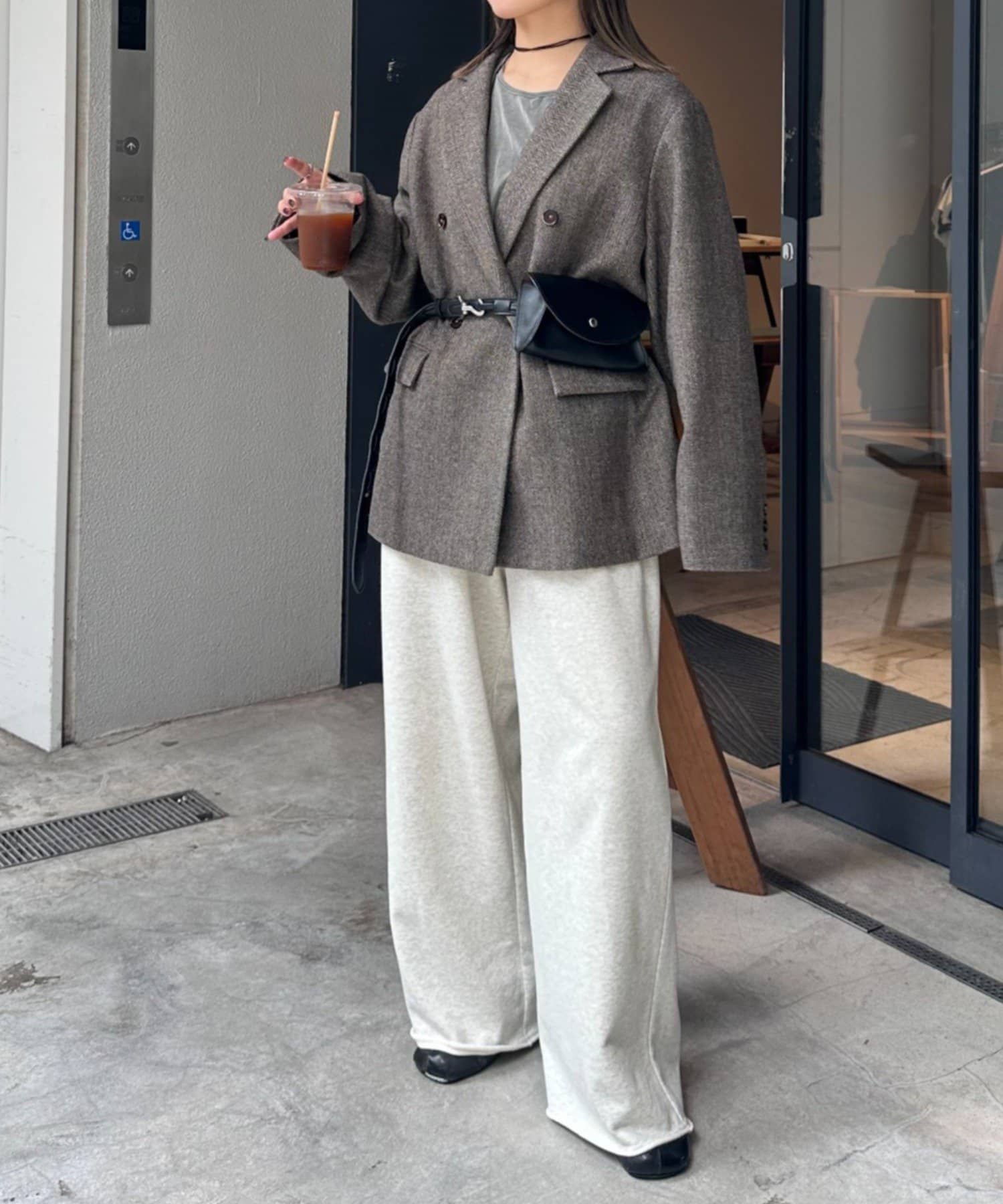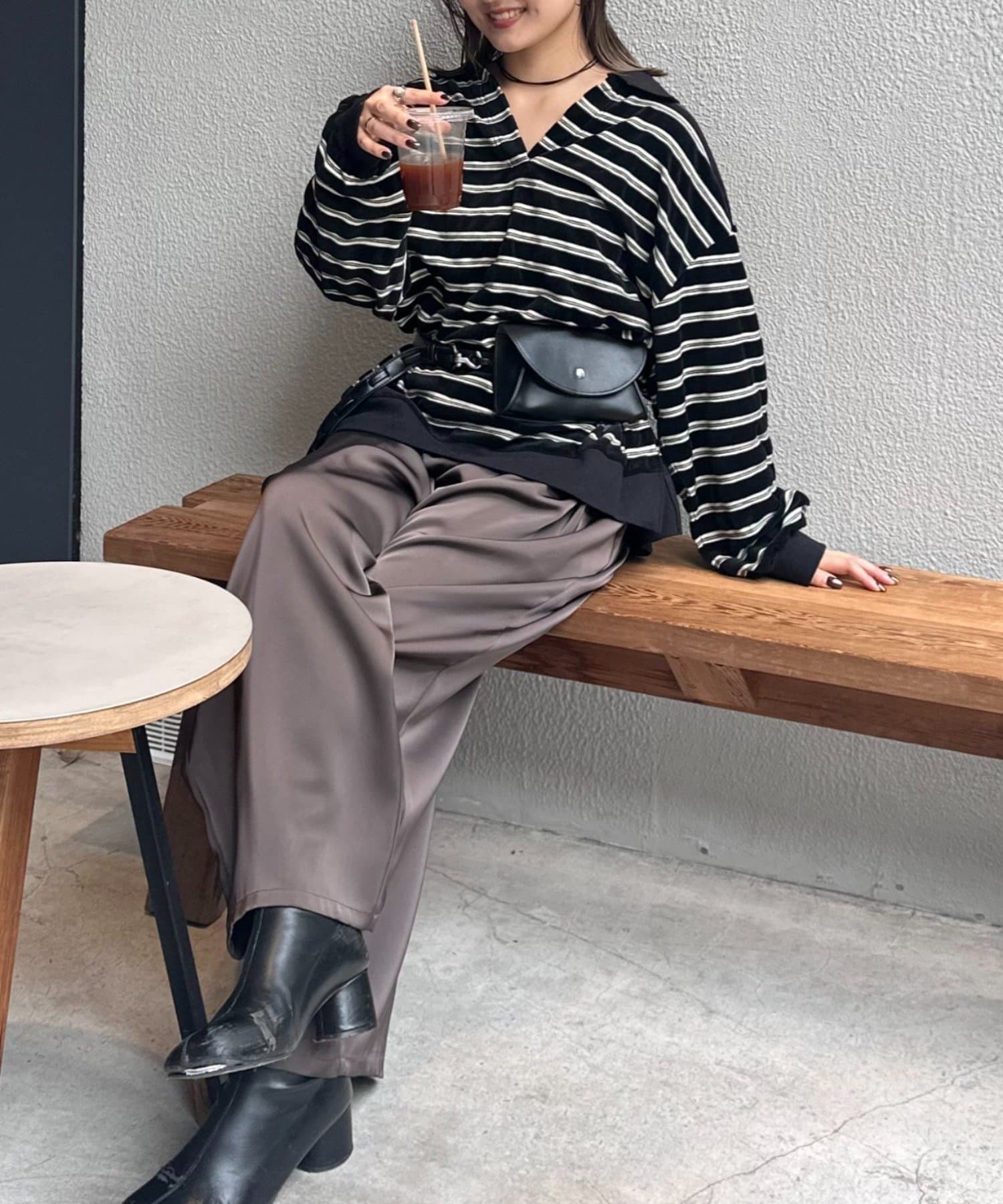 デニムやスラックスのパンツスタイルにプラスして、トレンドススタイルの完成。