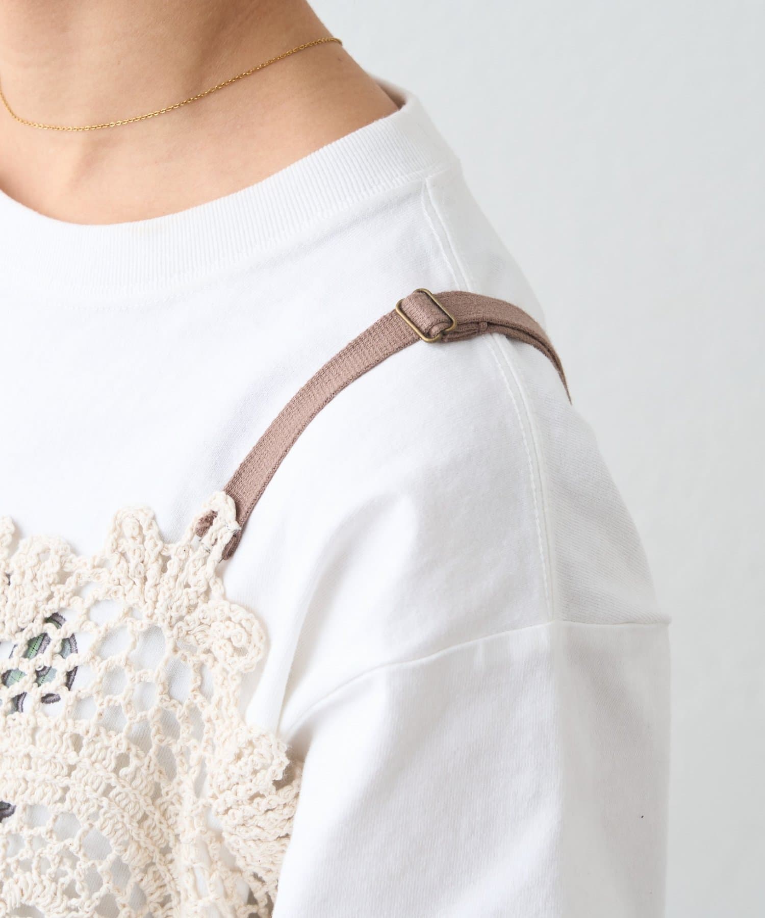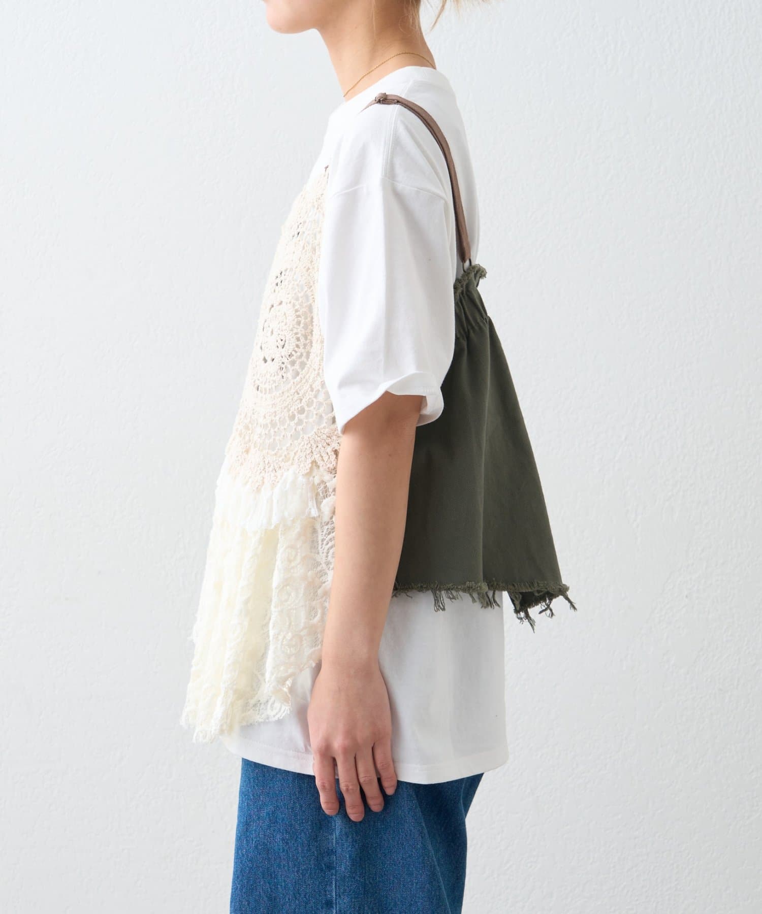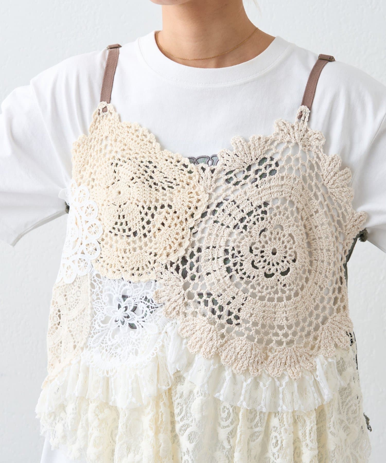 品番 TYZ1061104A0002 素材 【前見頃】ベージュ濃淡サークルレース:綿100%白サークルレース:ポリエステル100%白フリルレース:ナイロン100%白フレアレース:ナイロン60%綿40%