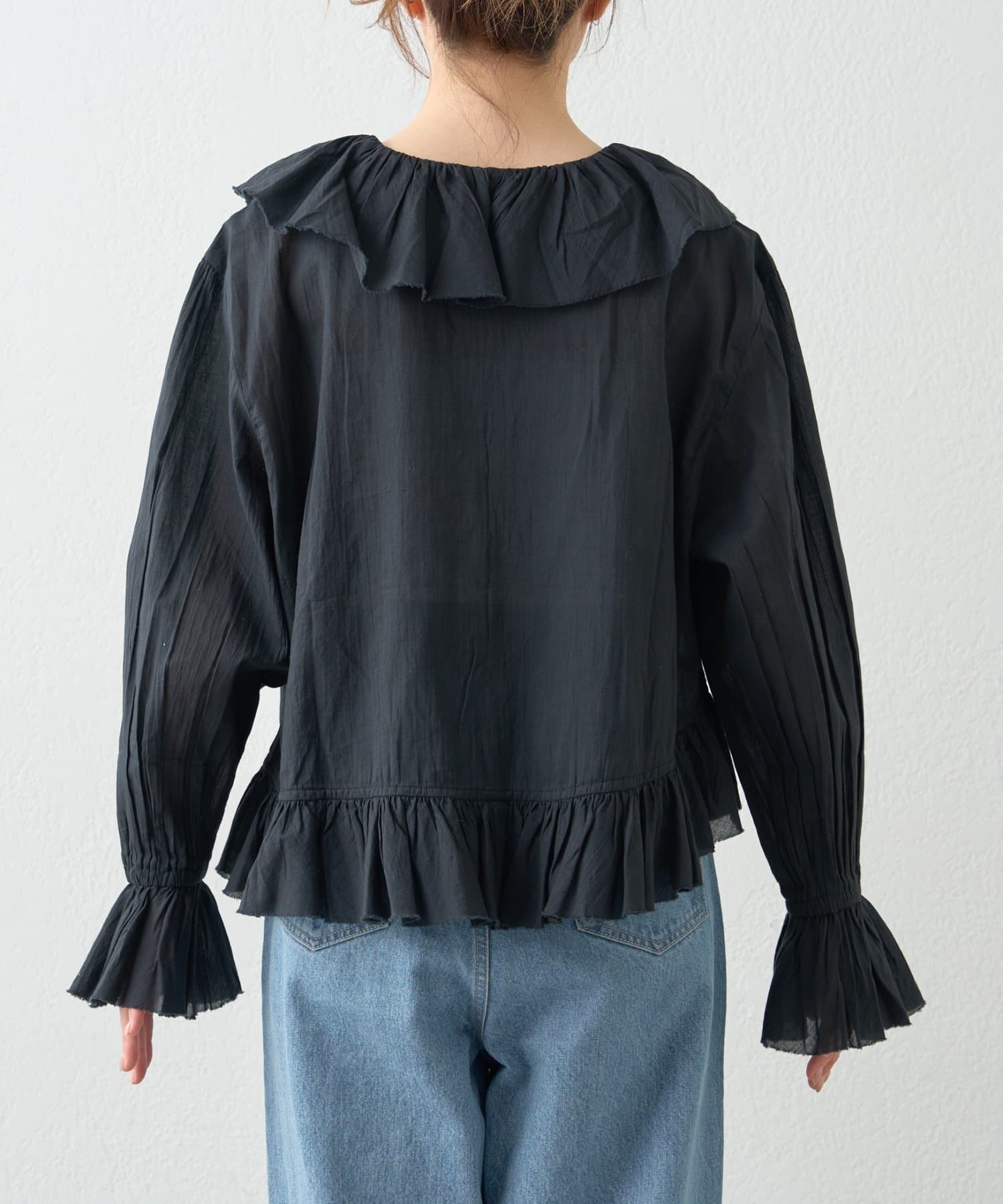 肩から袖、裾まで広めにフリルを施したデザインで、着るだけで華やかな印象に仕上がります。袖の付け根にはやわらかなギャザーを寄せ、ふんわり丸みのあるラインを形成。動くたび軽やかに揺れ、日常のコーデに立体感をプラスします。